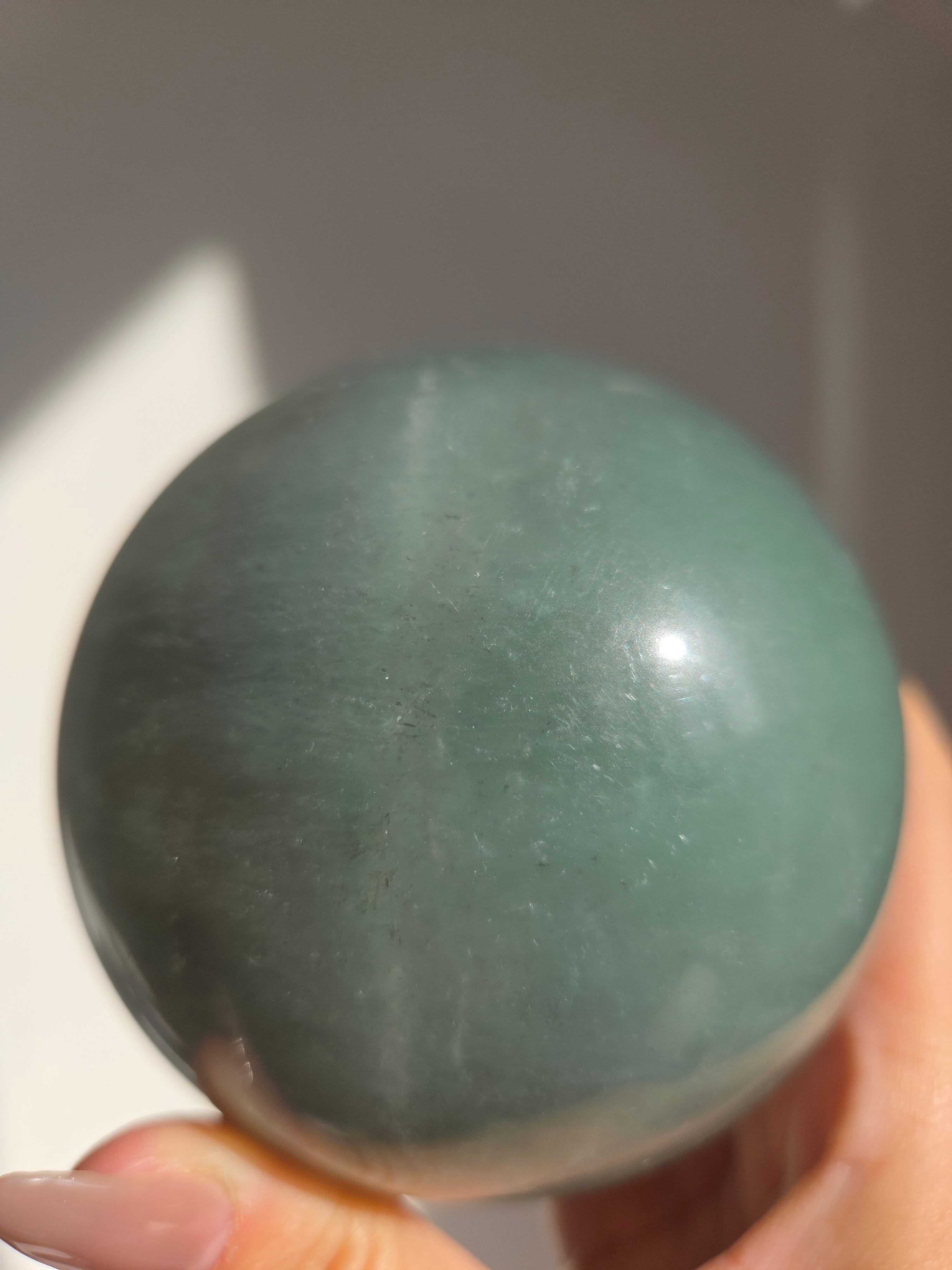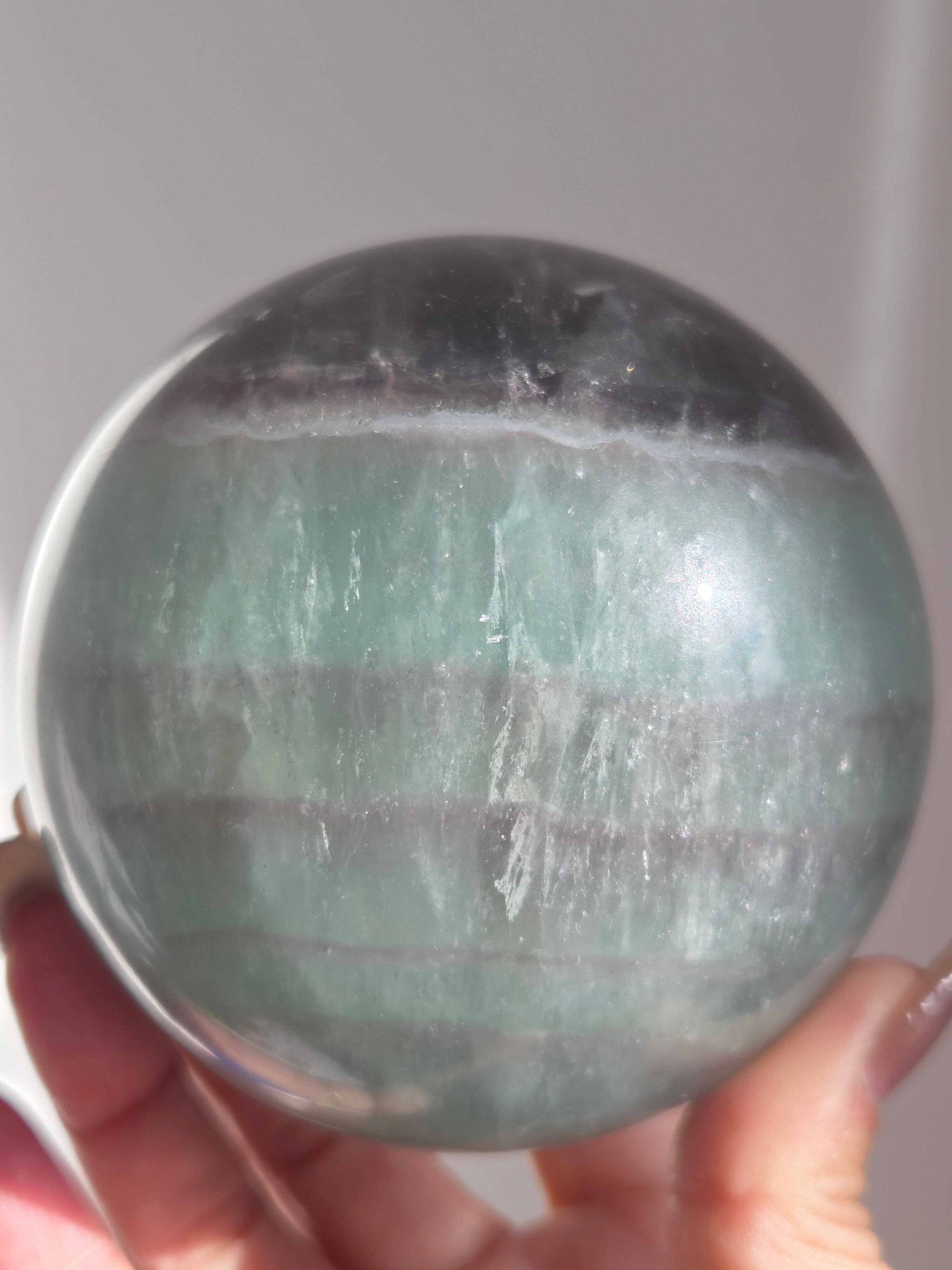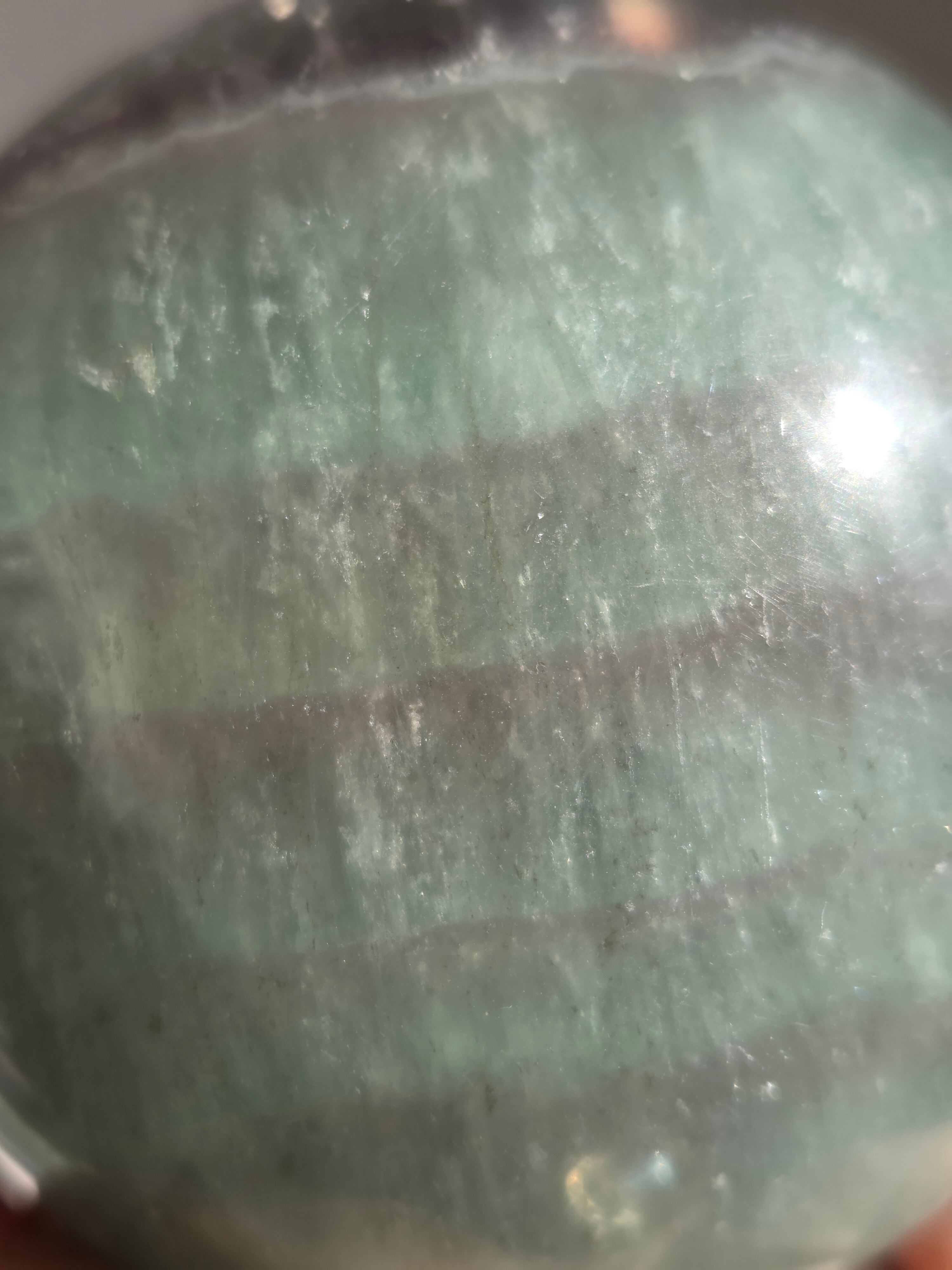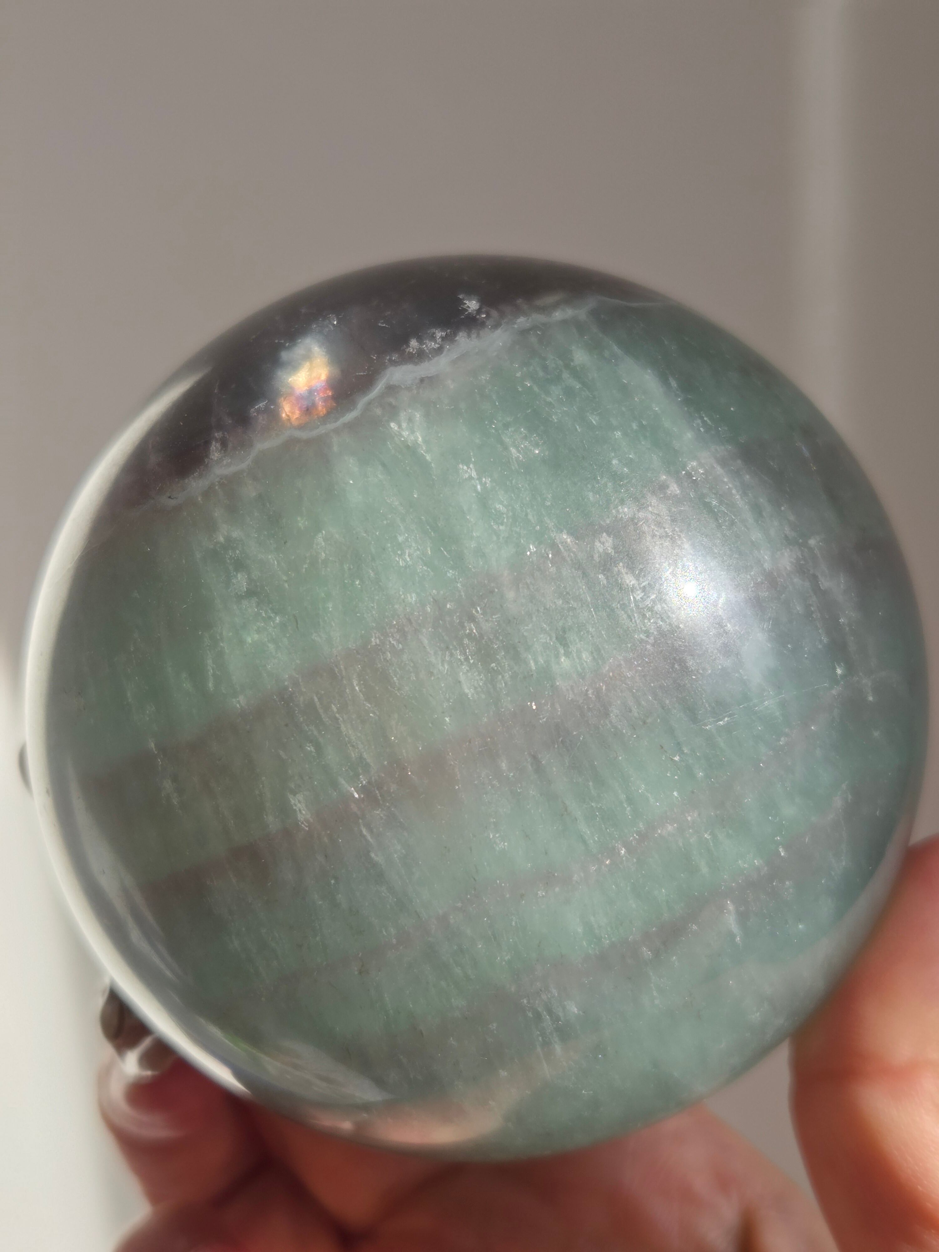 マイカの煌めきや、グリーンフローライトの層も美しいです。所々入り込んだデンドリも可愛いらしいビックサイズの迫力あるスフィアです。