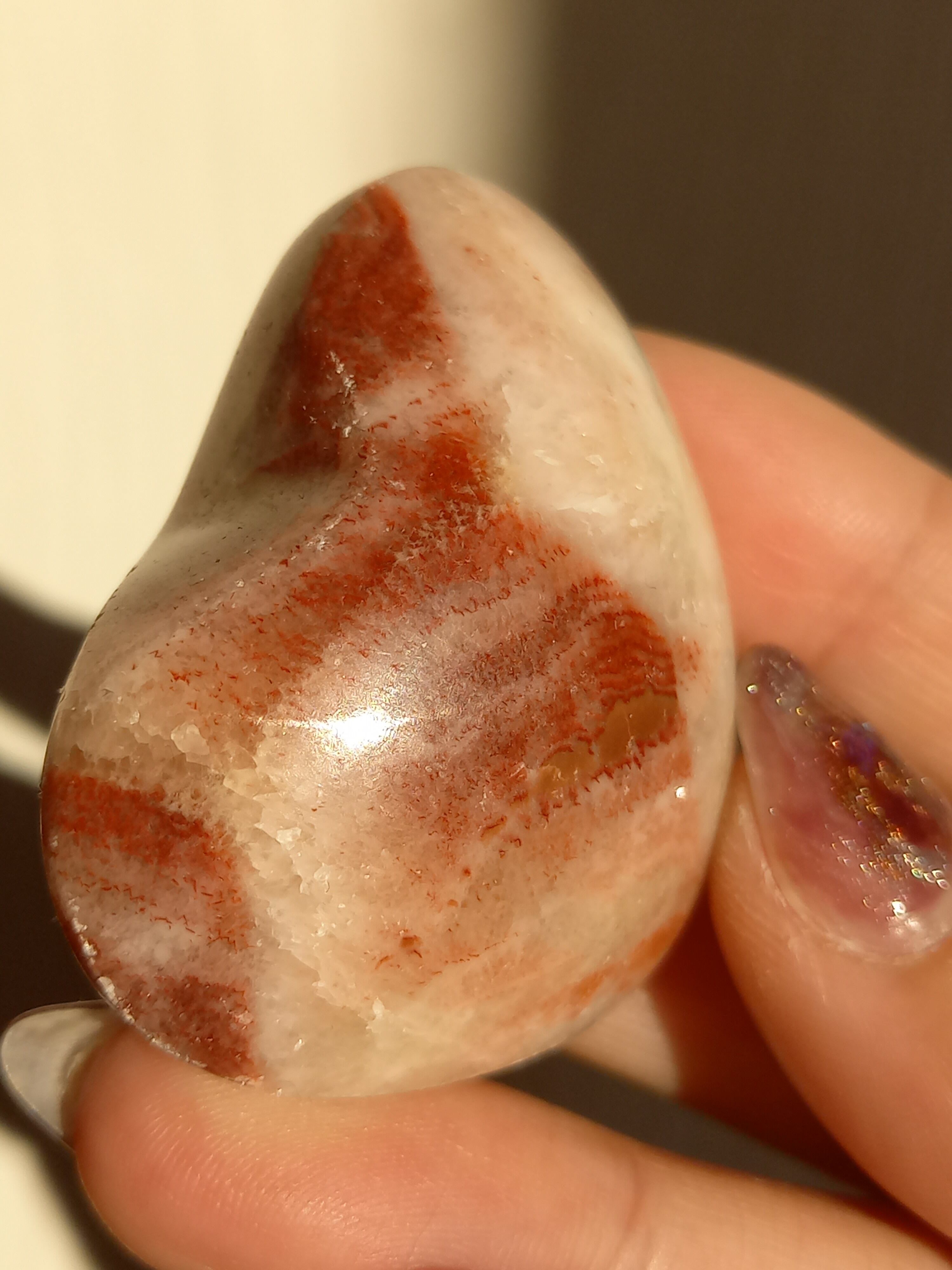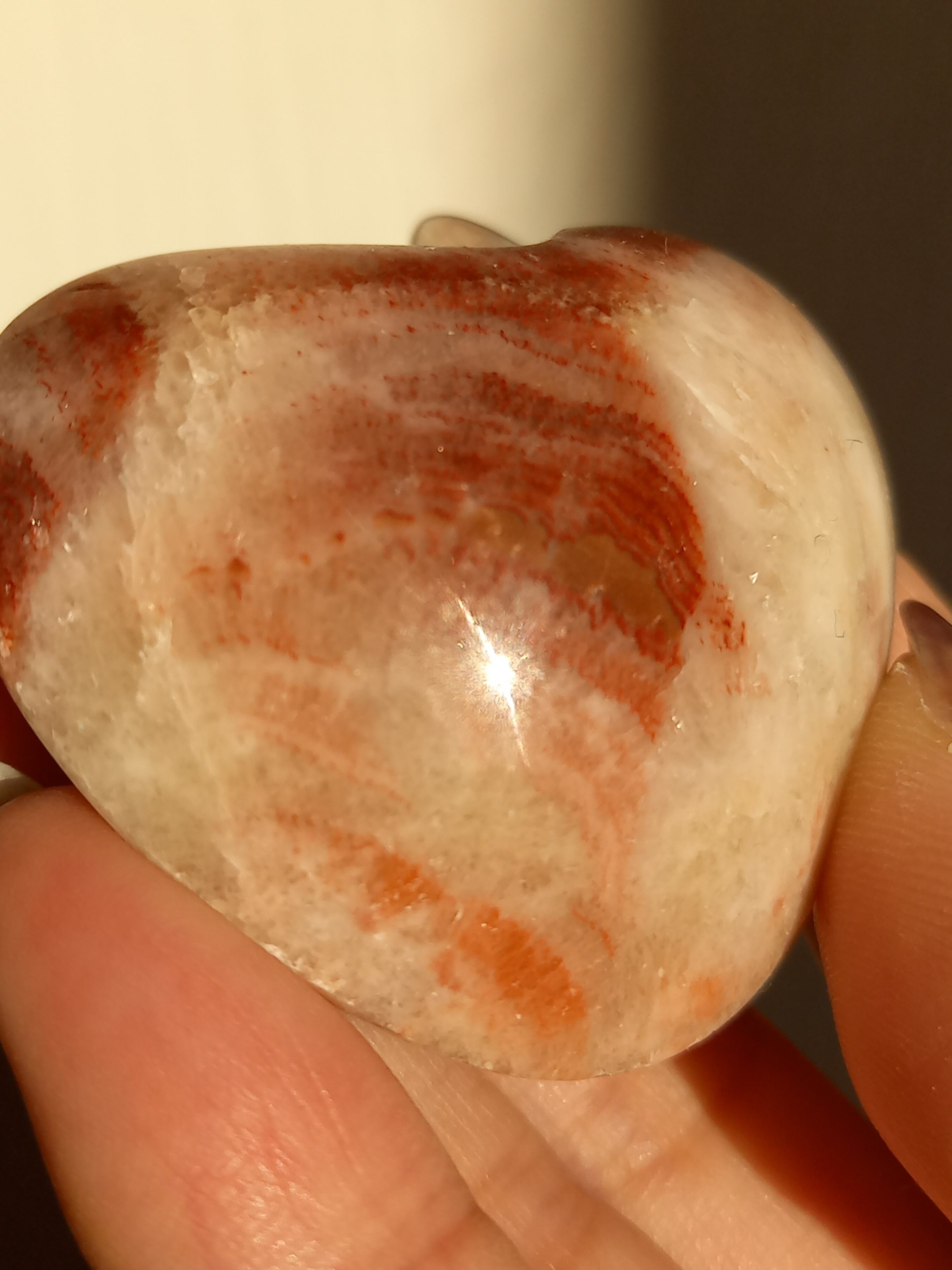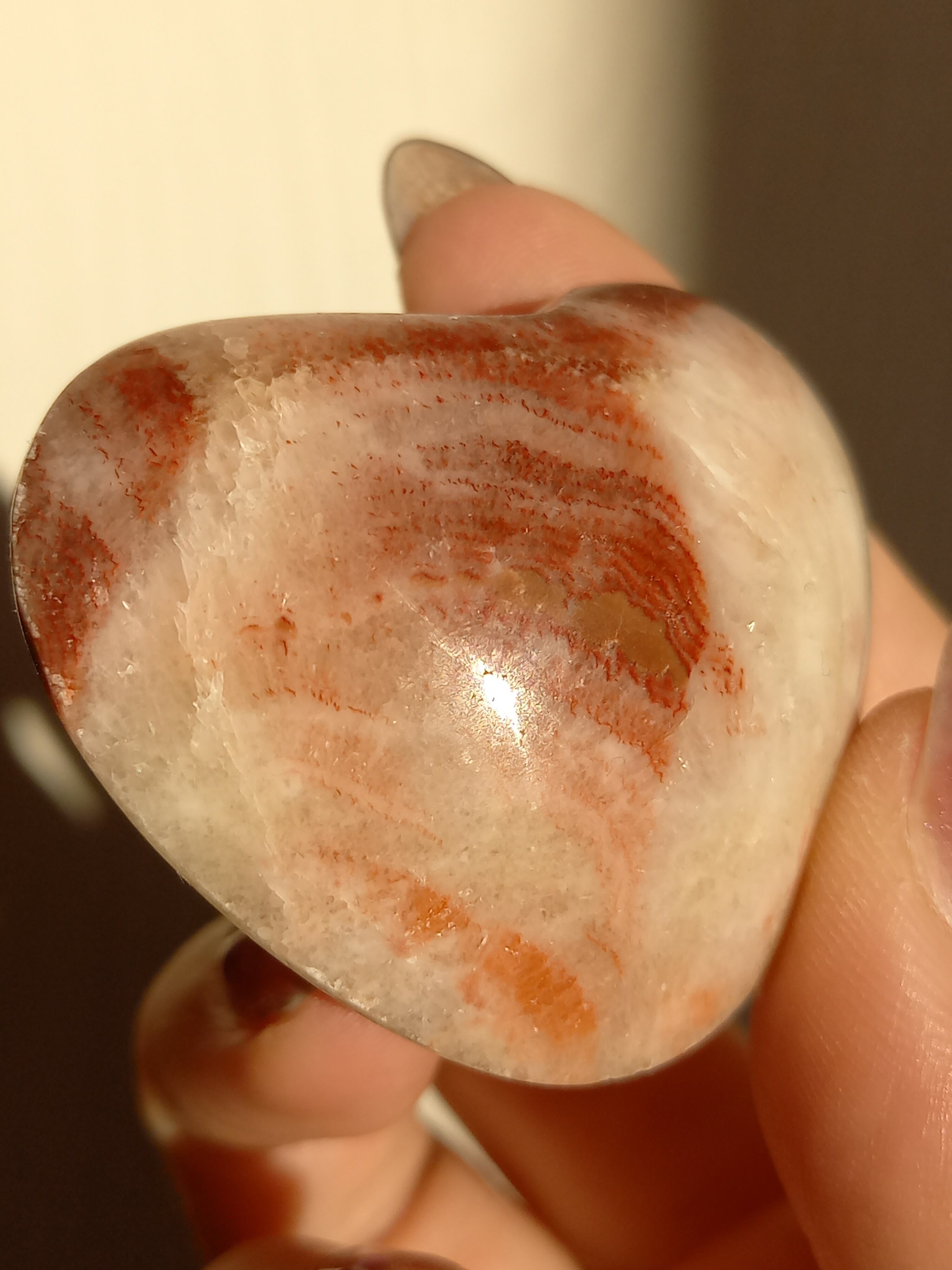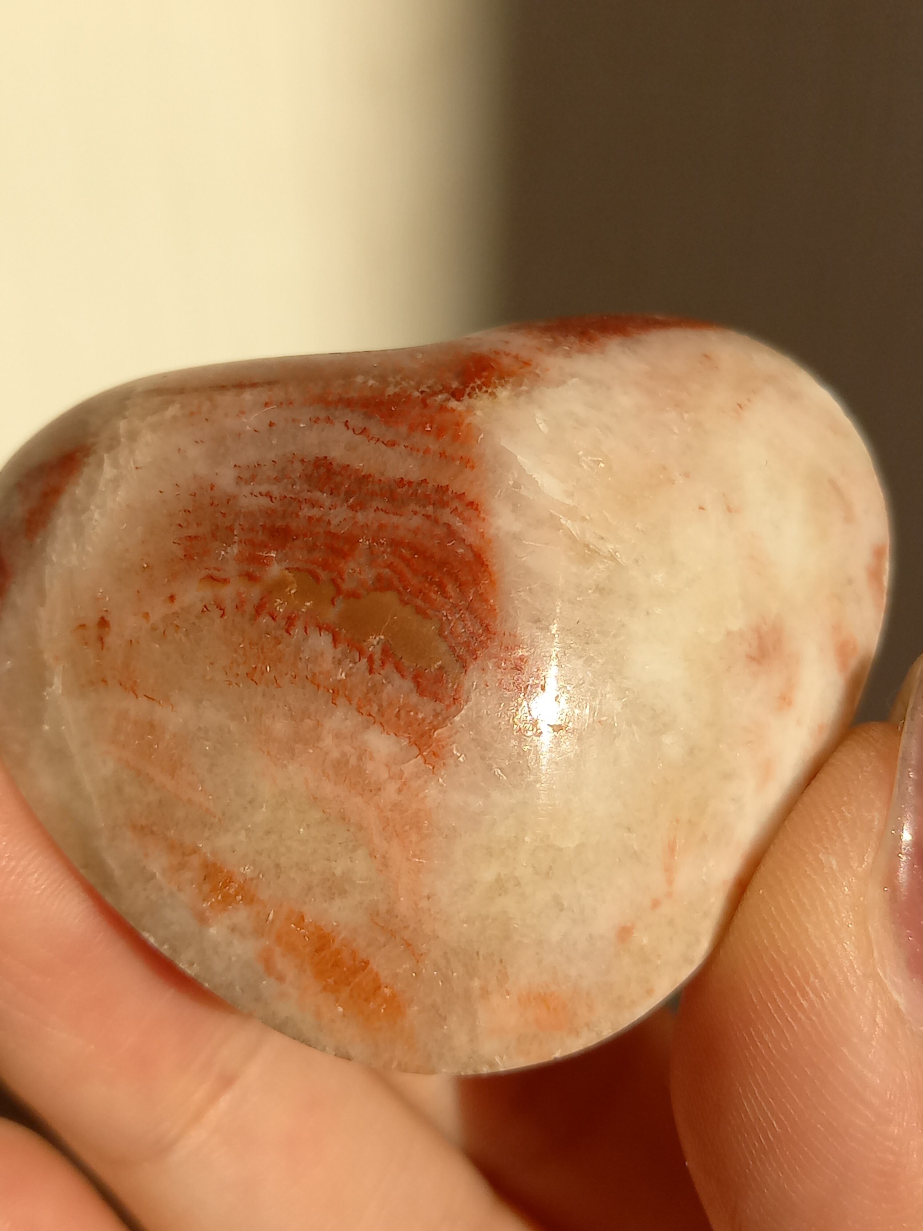 ポークストーンとは、カルサイトの一種で、赤色の部分は酸化鉄の影響で色づいており、アラゴナイト化していると言われてます。