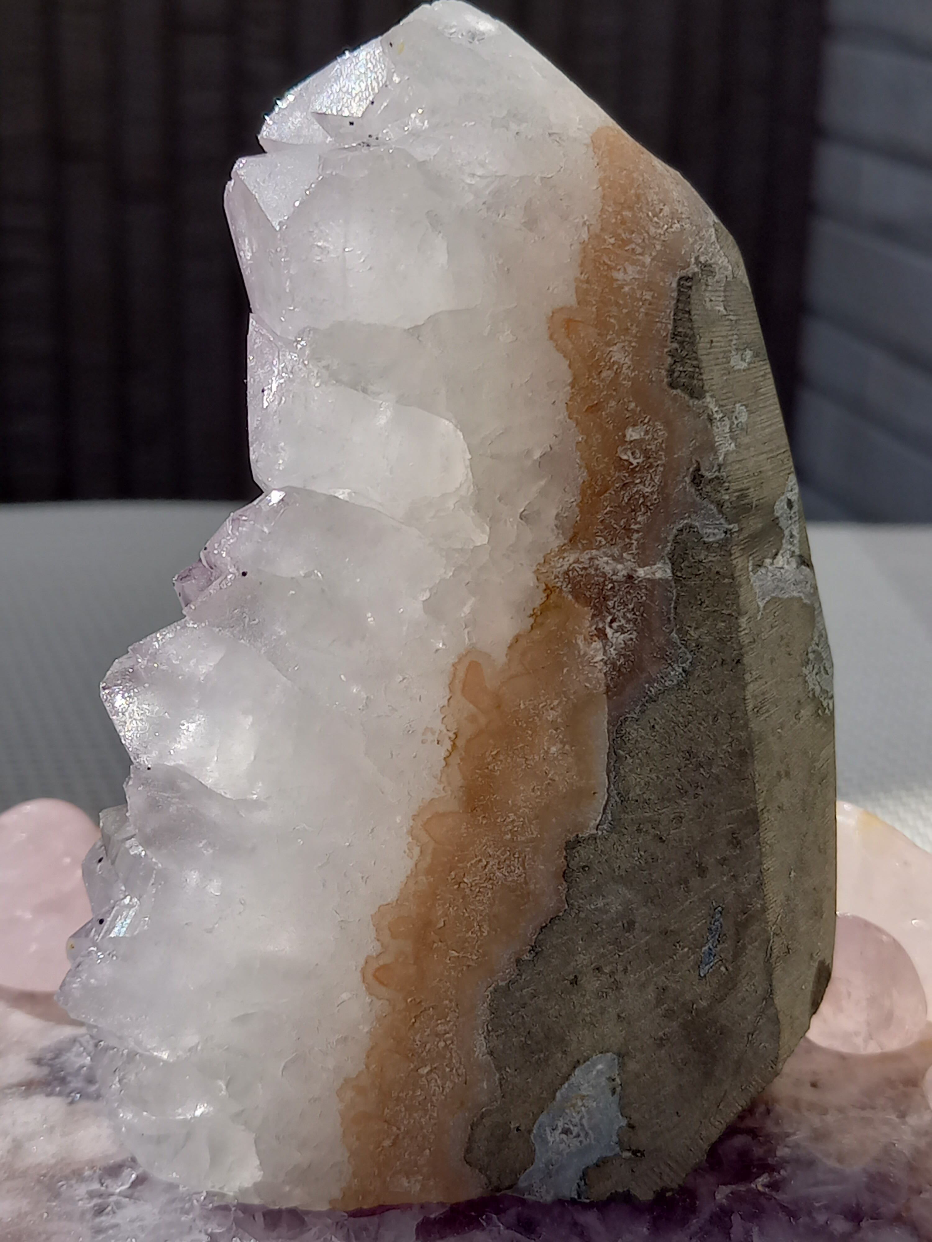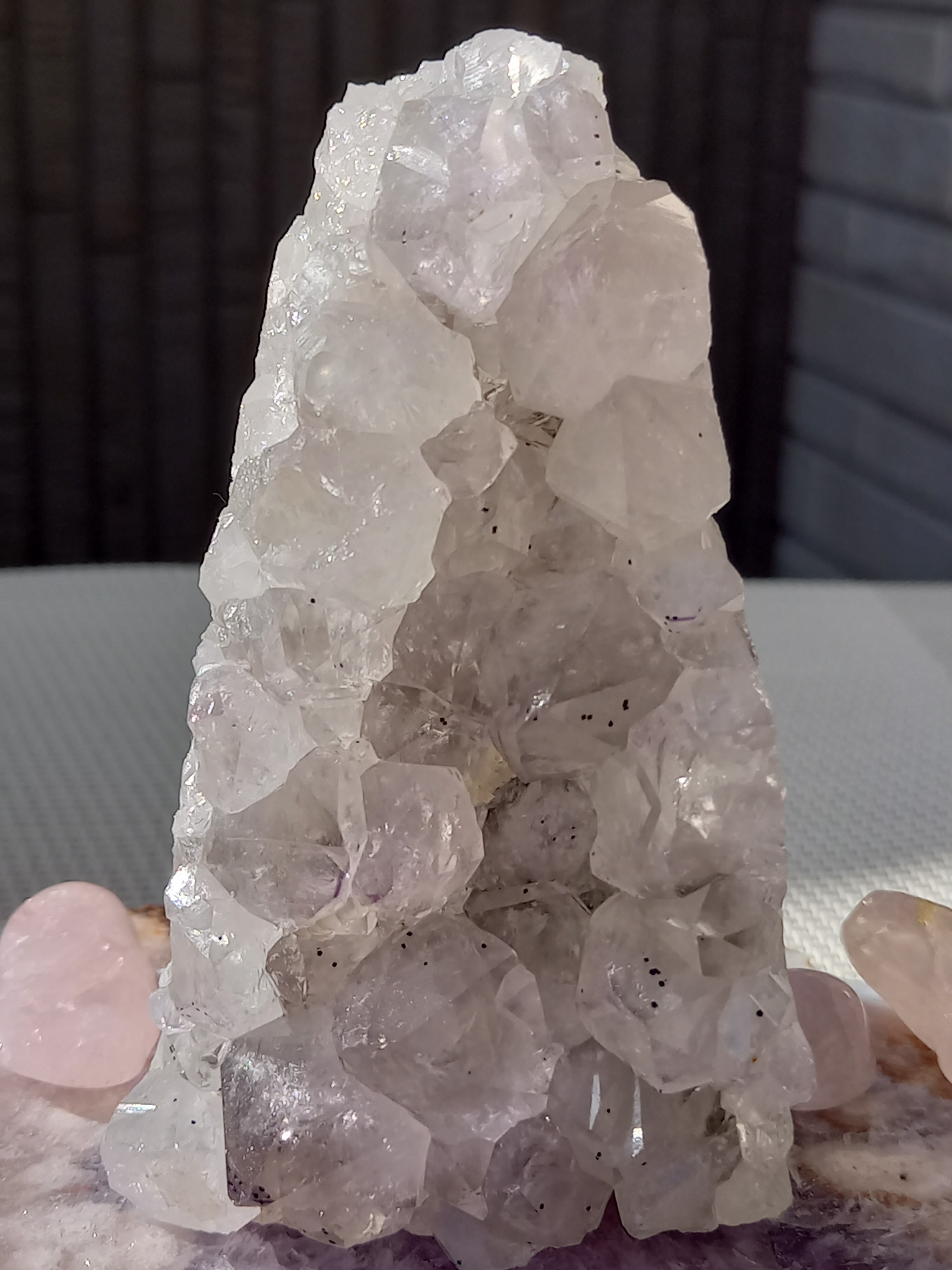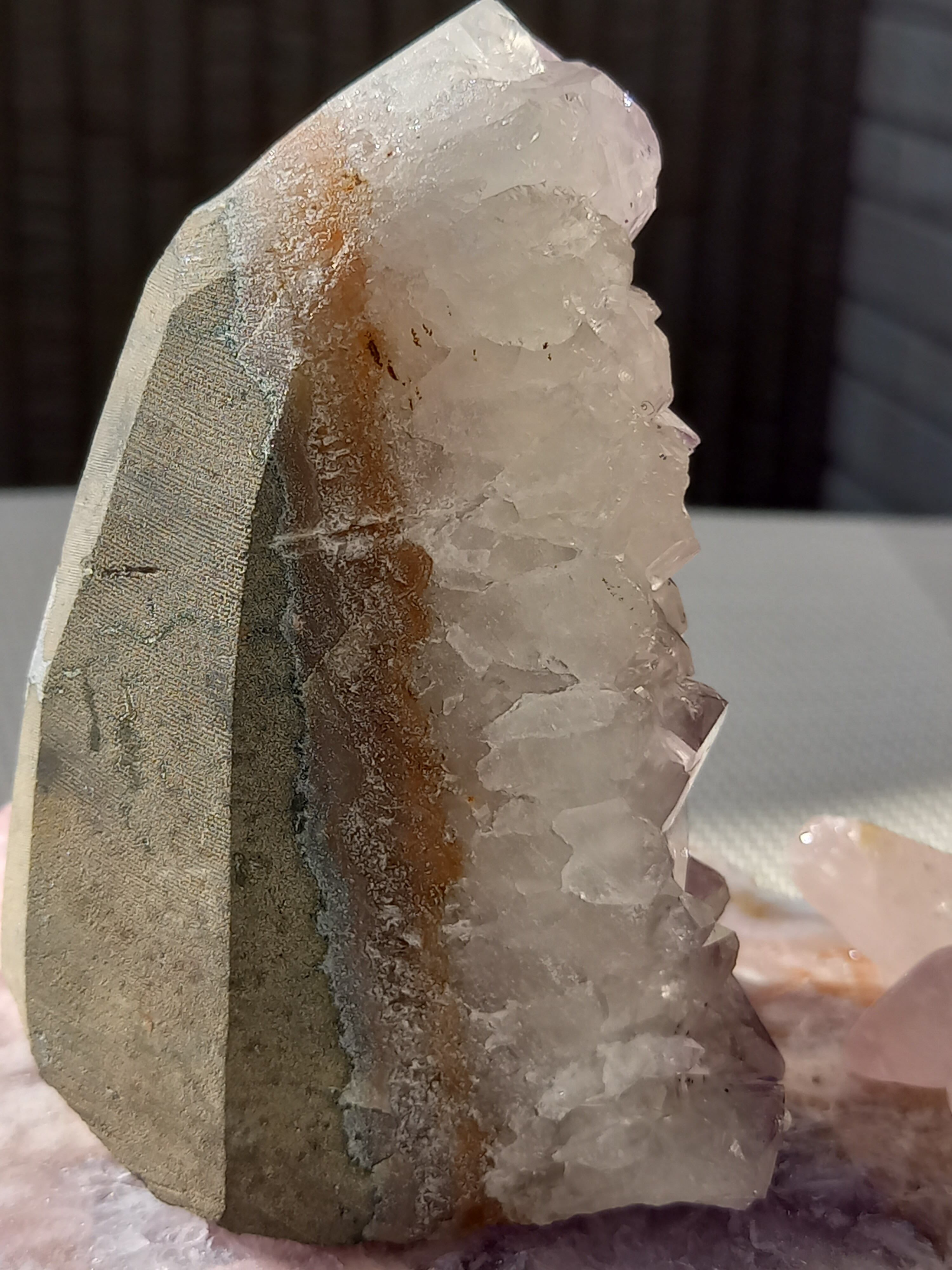 透明感あるクォーツに、ラベンダーカラーのアメジストと、ロマネサイトがインした子です。