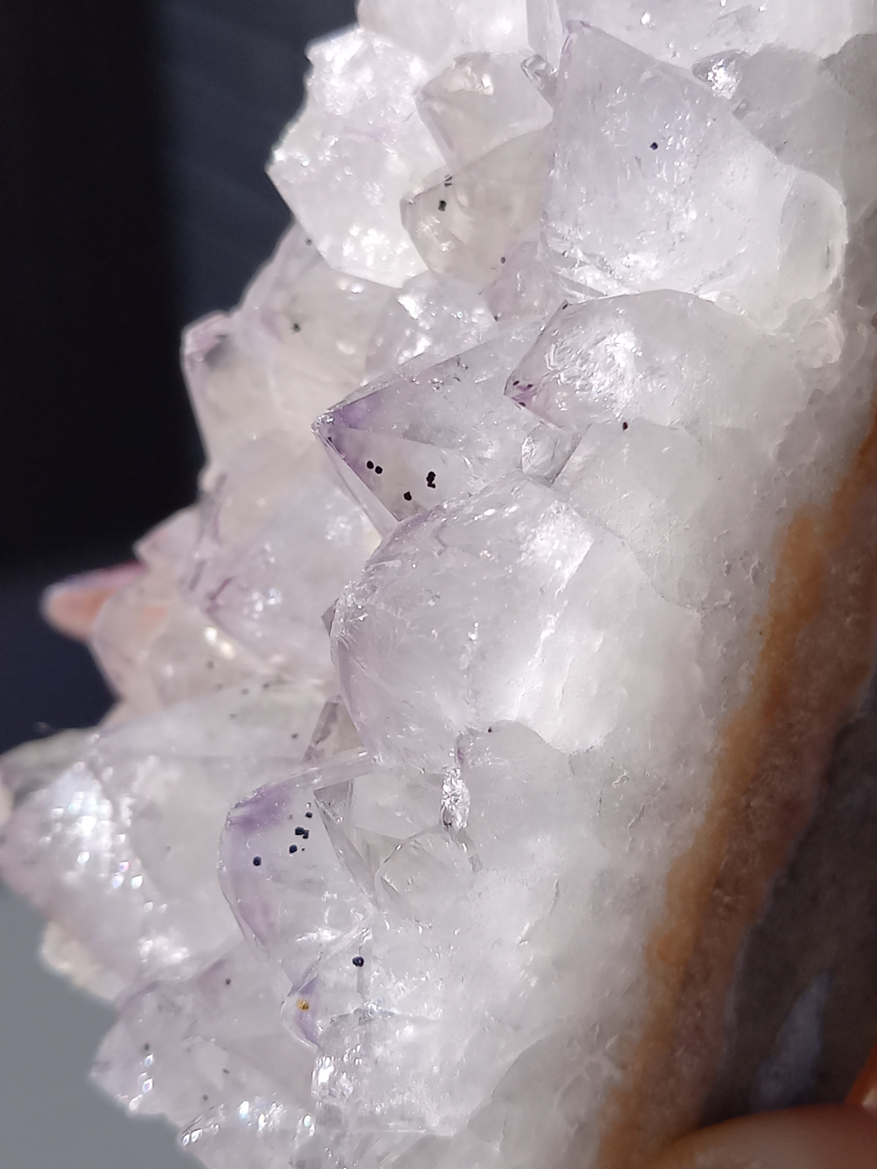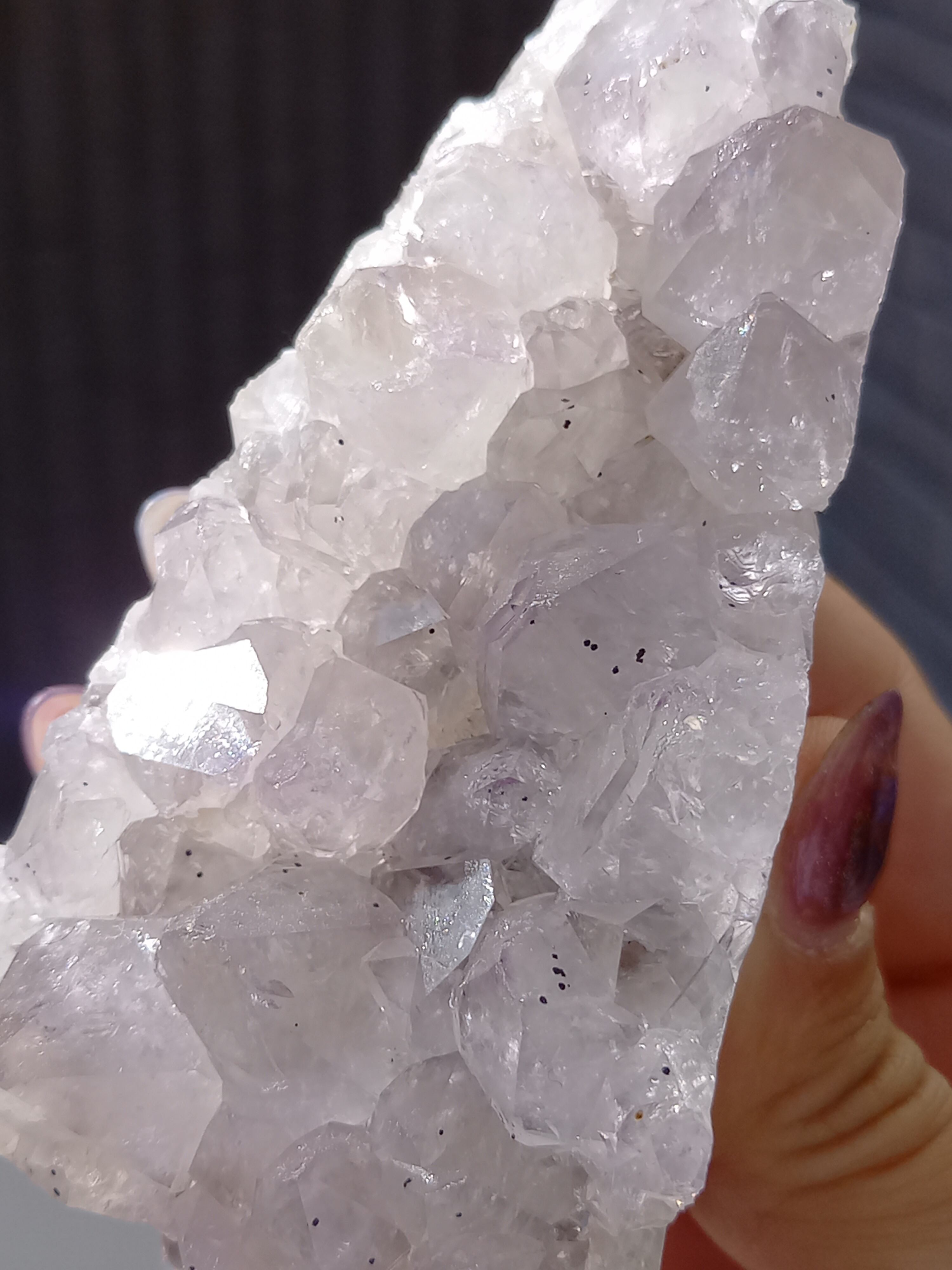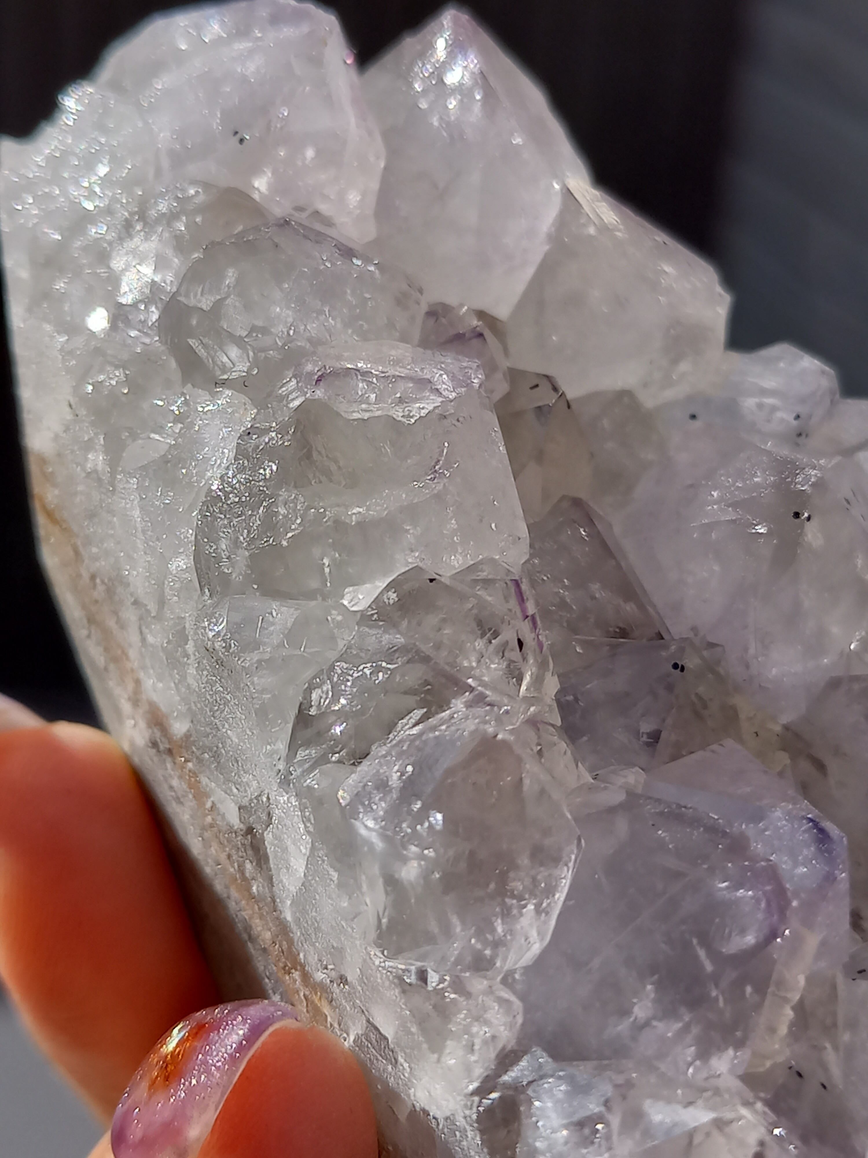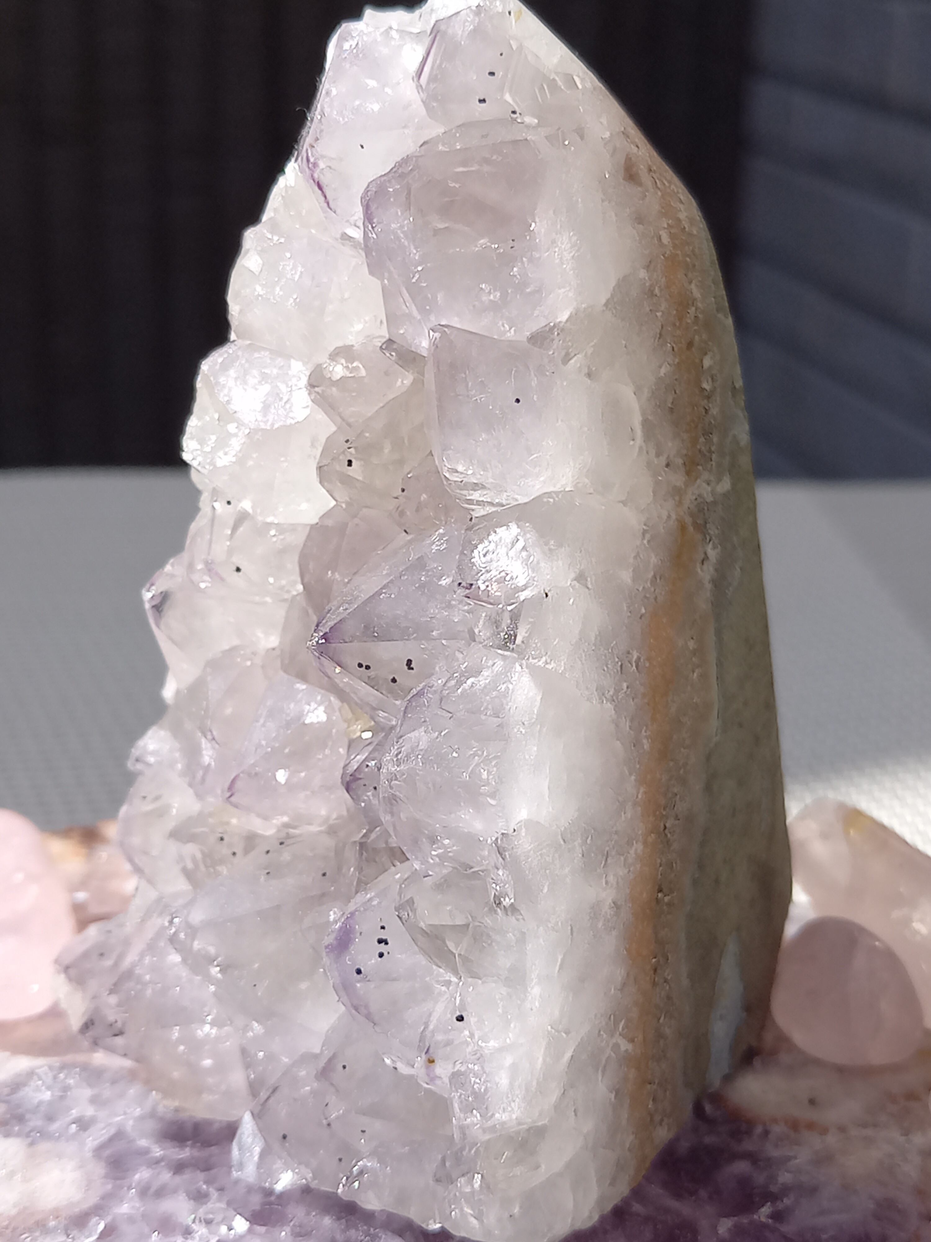 透明感あるクォーツに、ラベンダーカラーのアメジストと、ロマネサイトがインした子です。