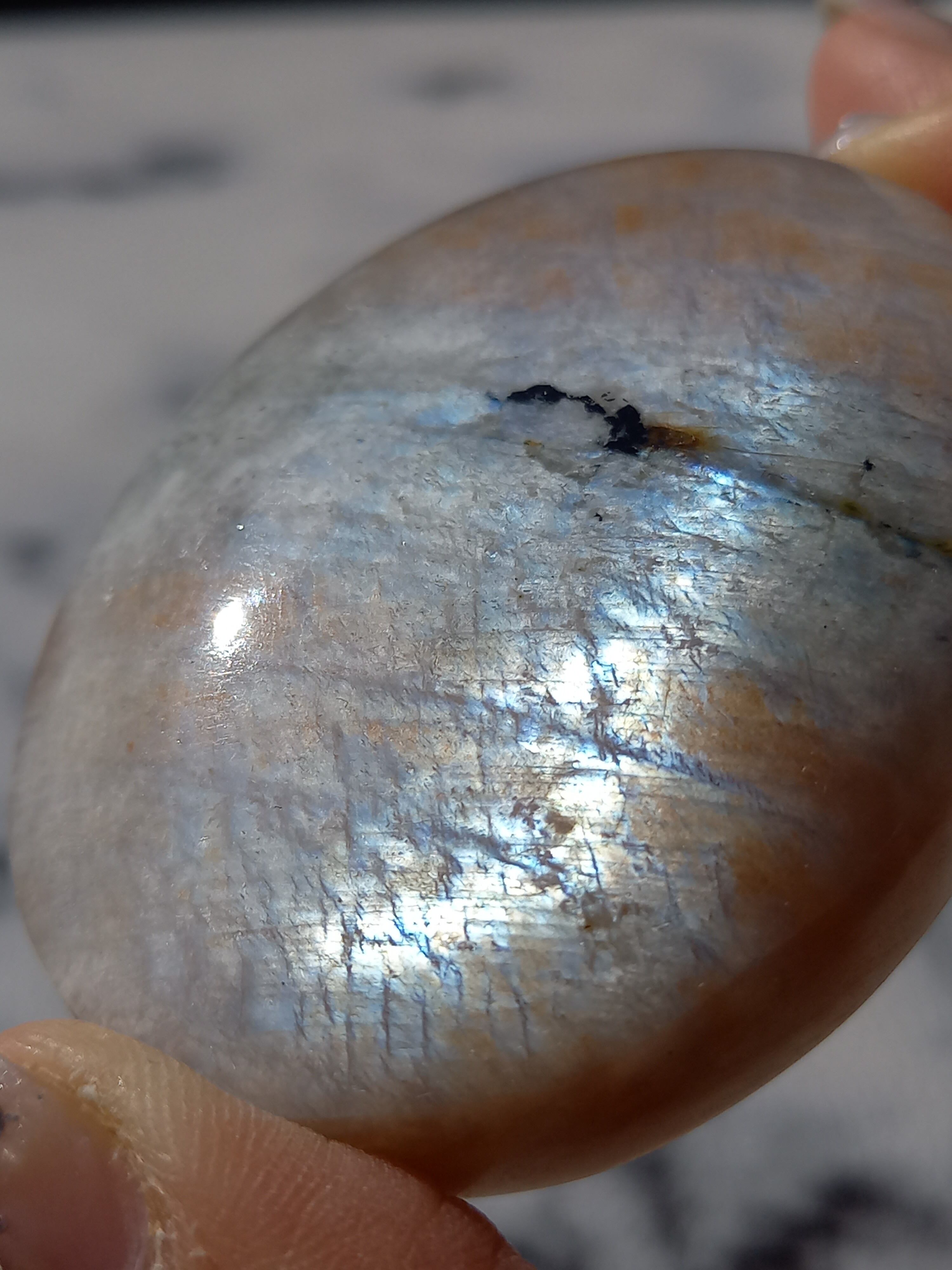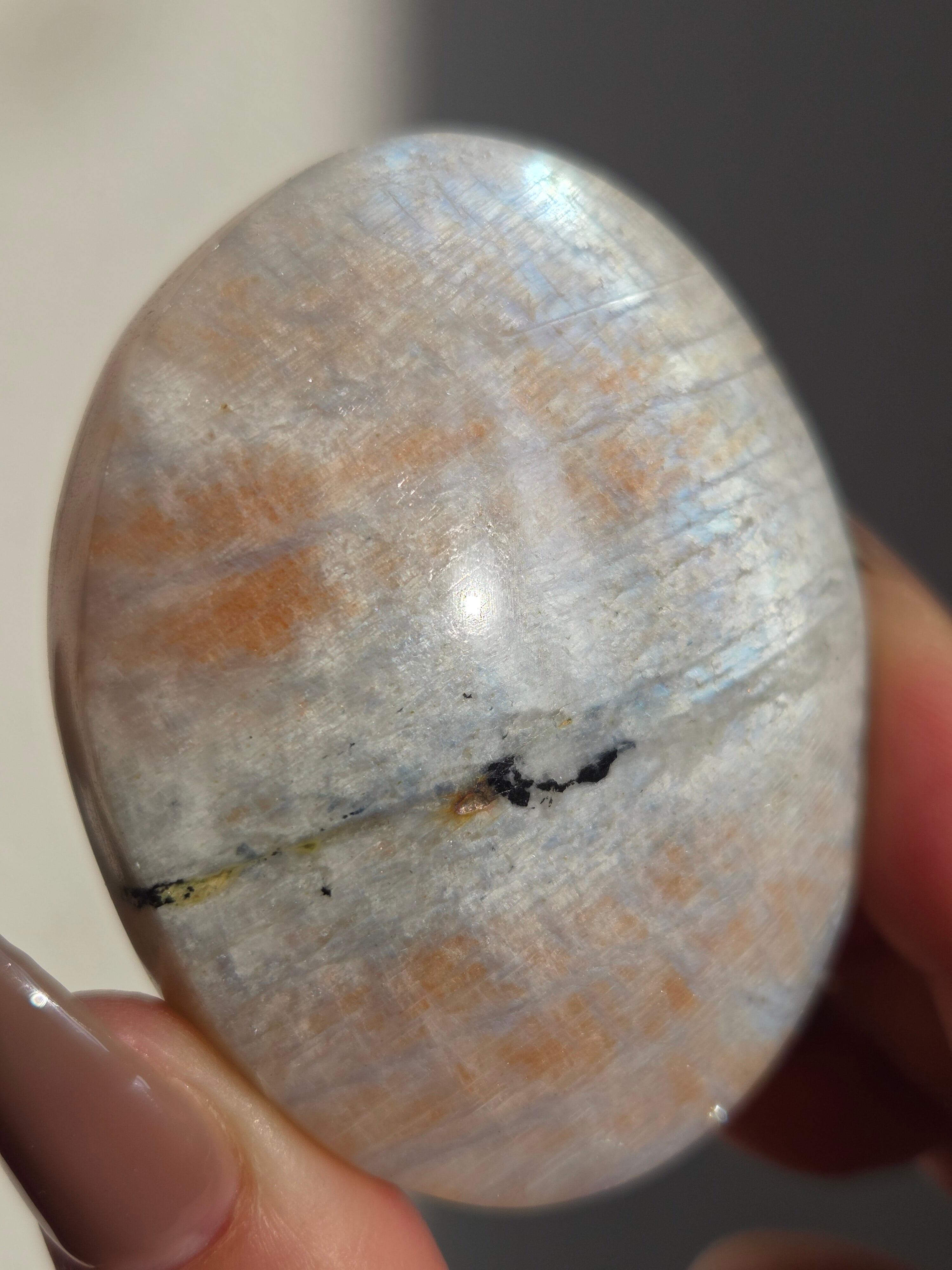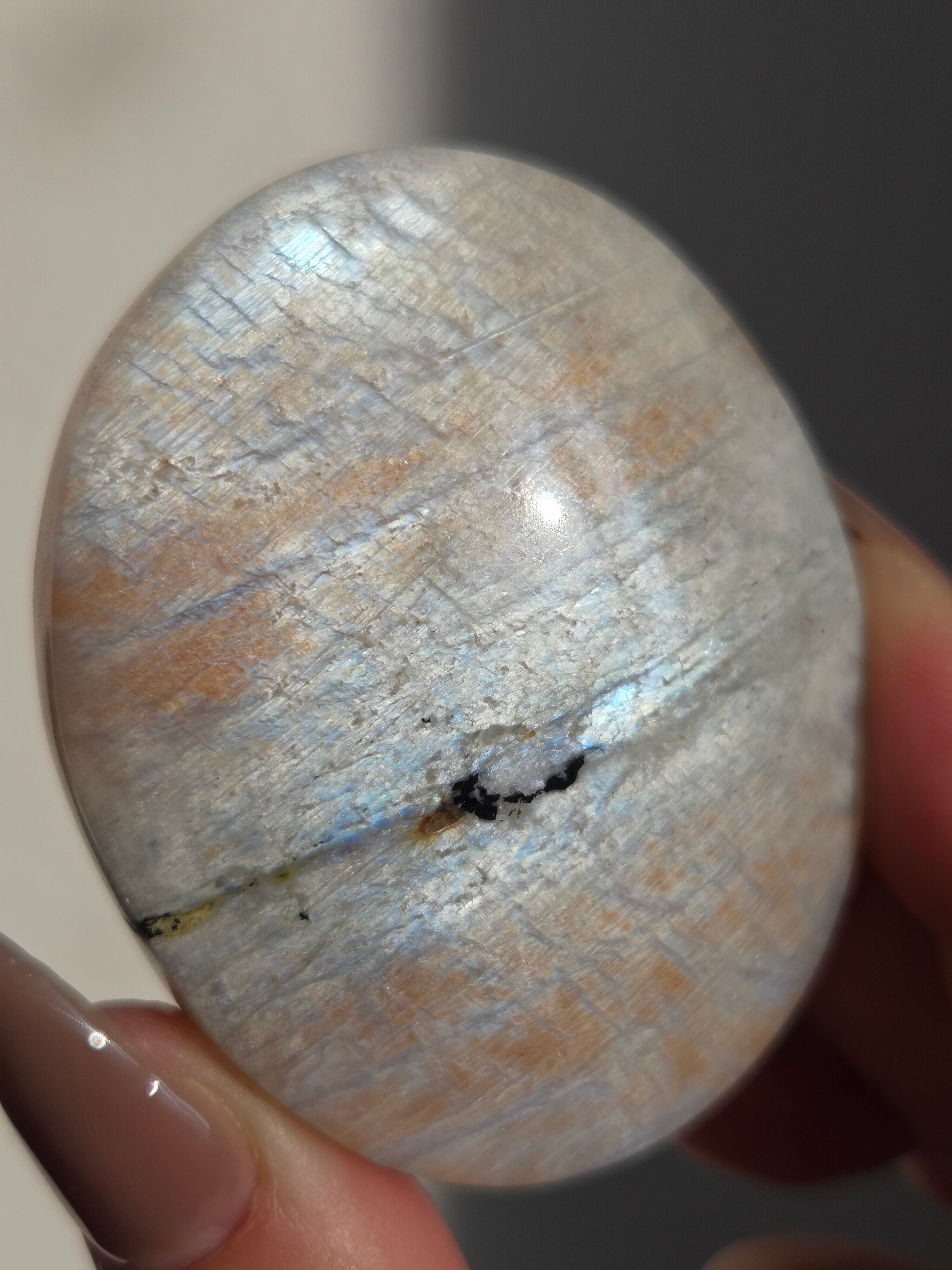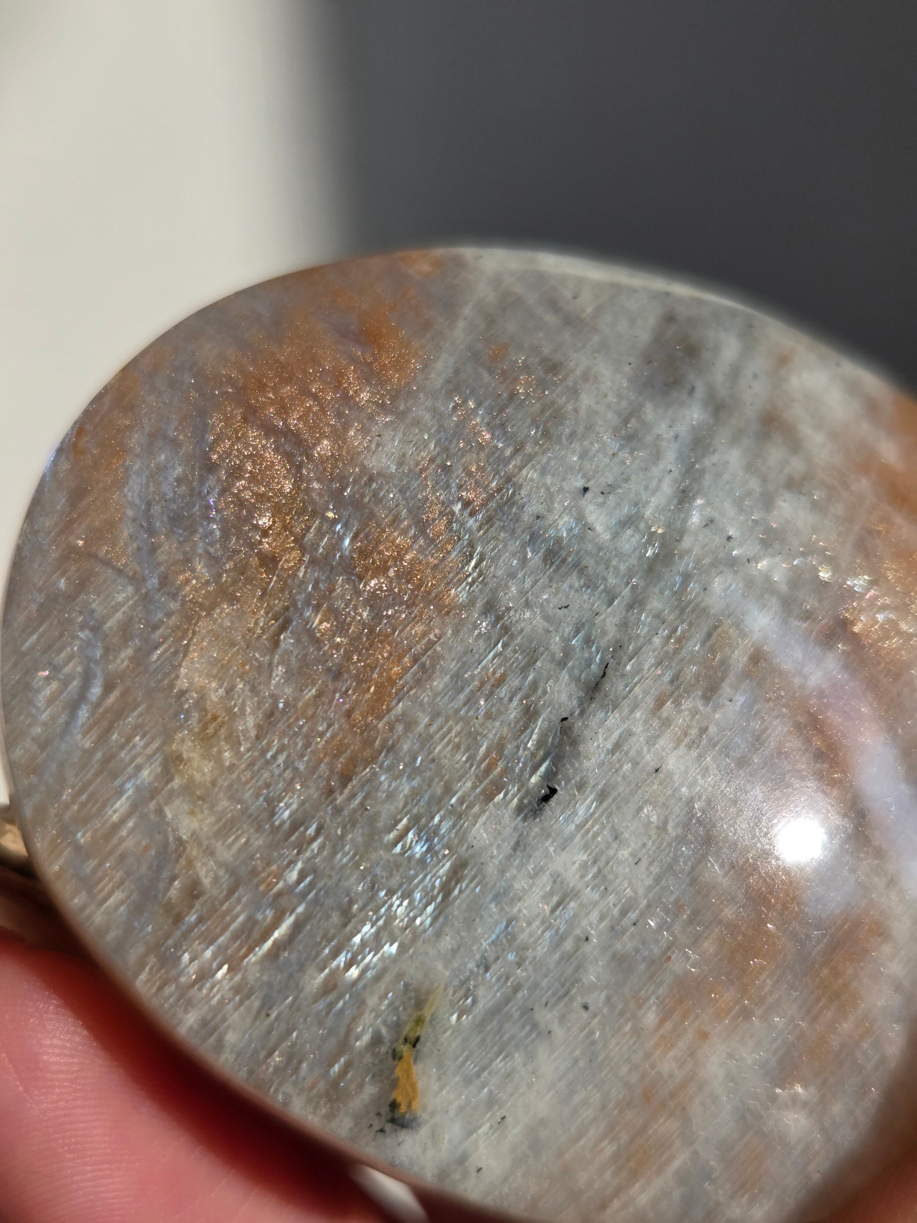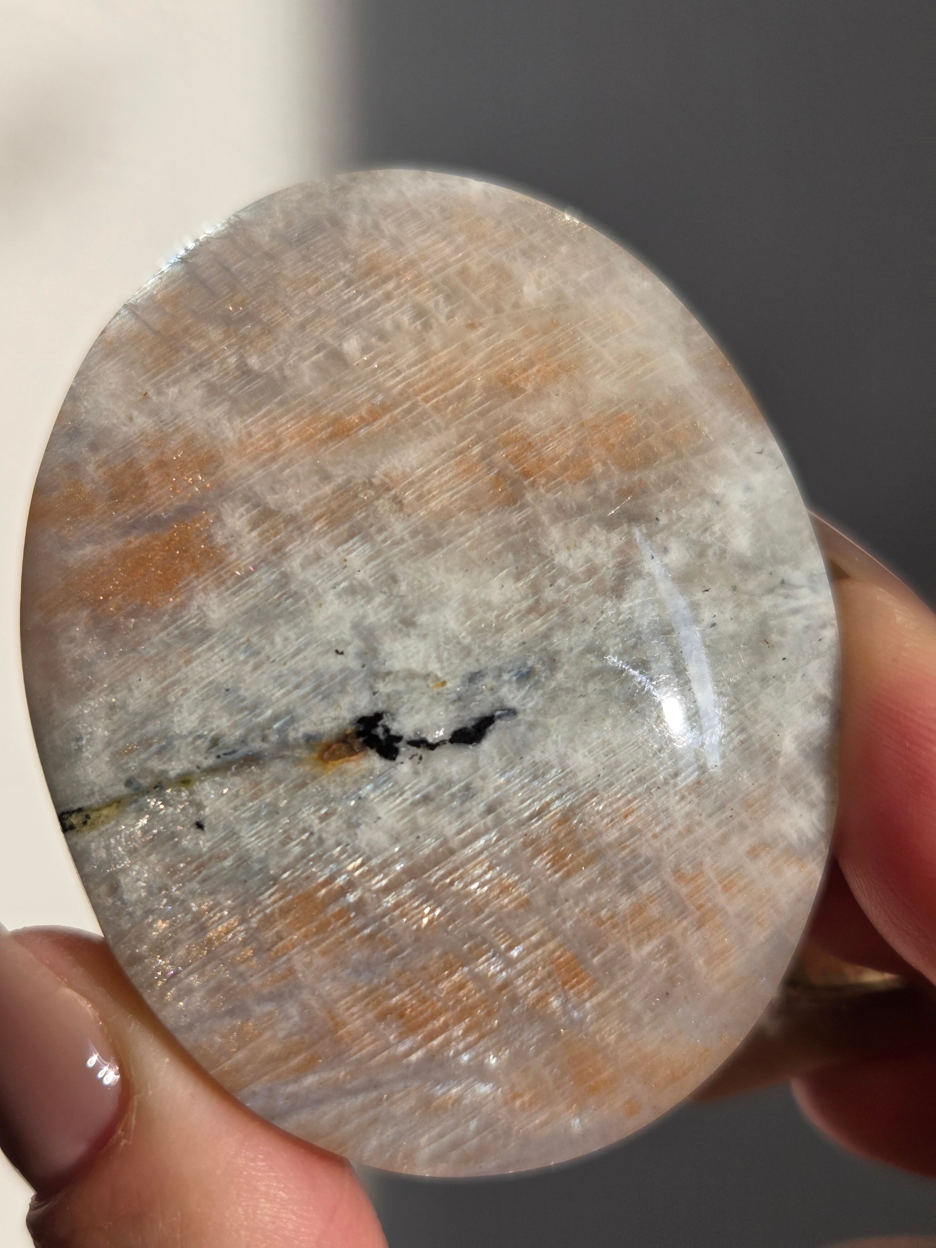 傾きによって、ムーンストーンの美しいブルーシラーが見えたり、ゴールドサンストーンの煌めきが見えたりと、1つのパームでサンムーンストーンの異なる美しさを堪能できる贅沢な子です。