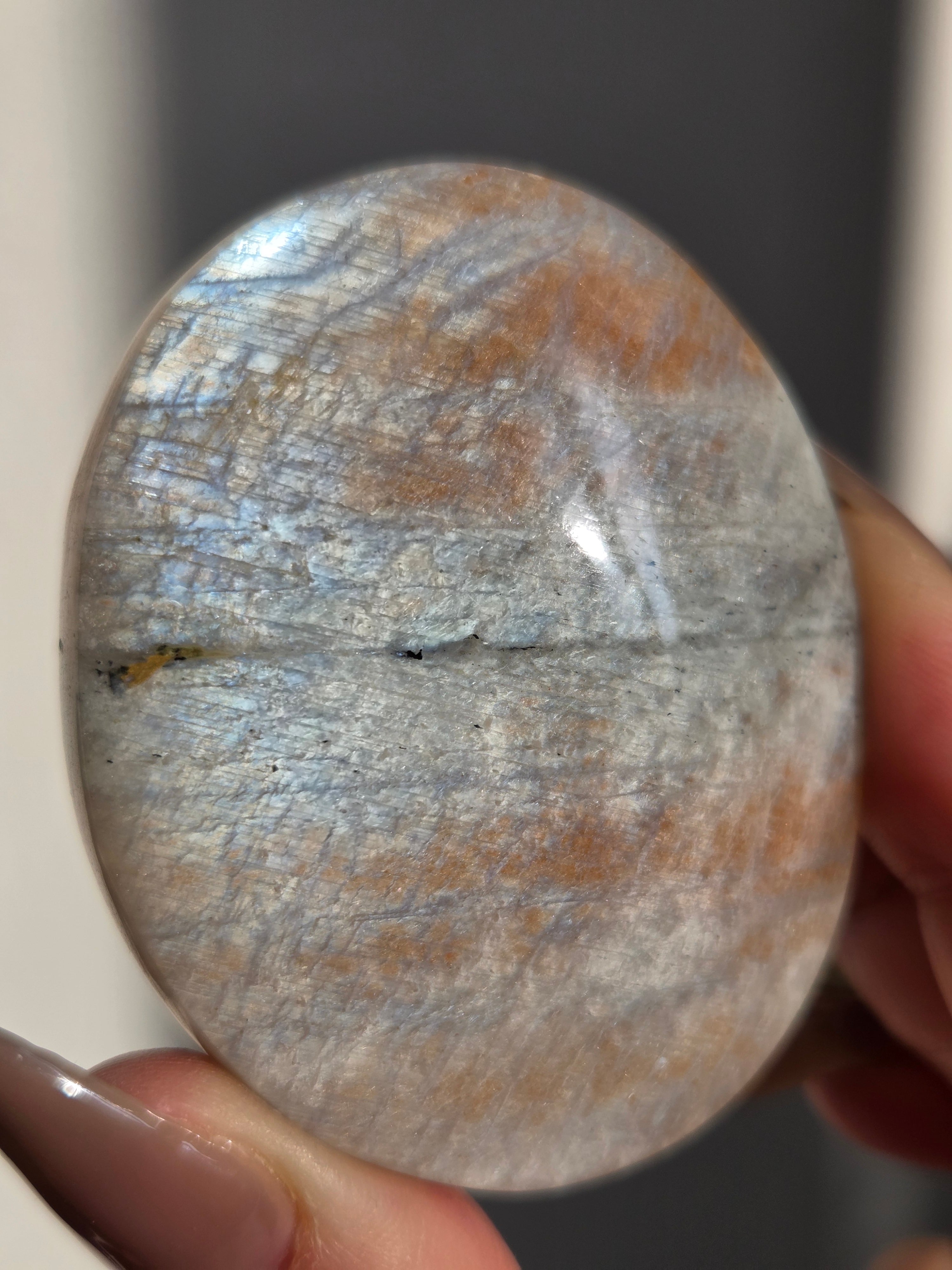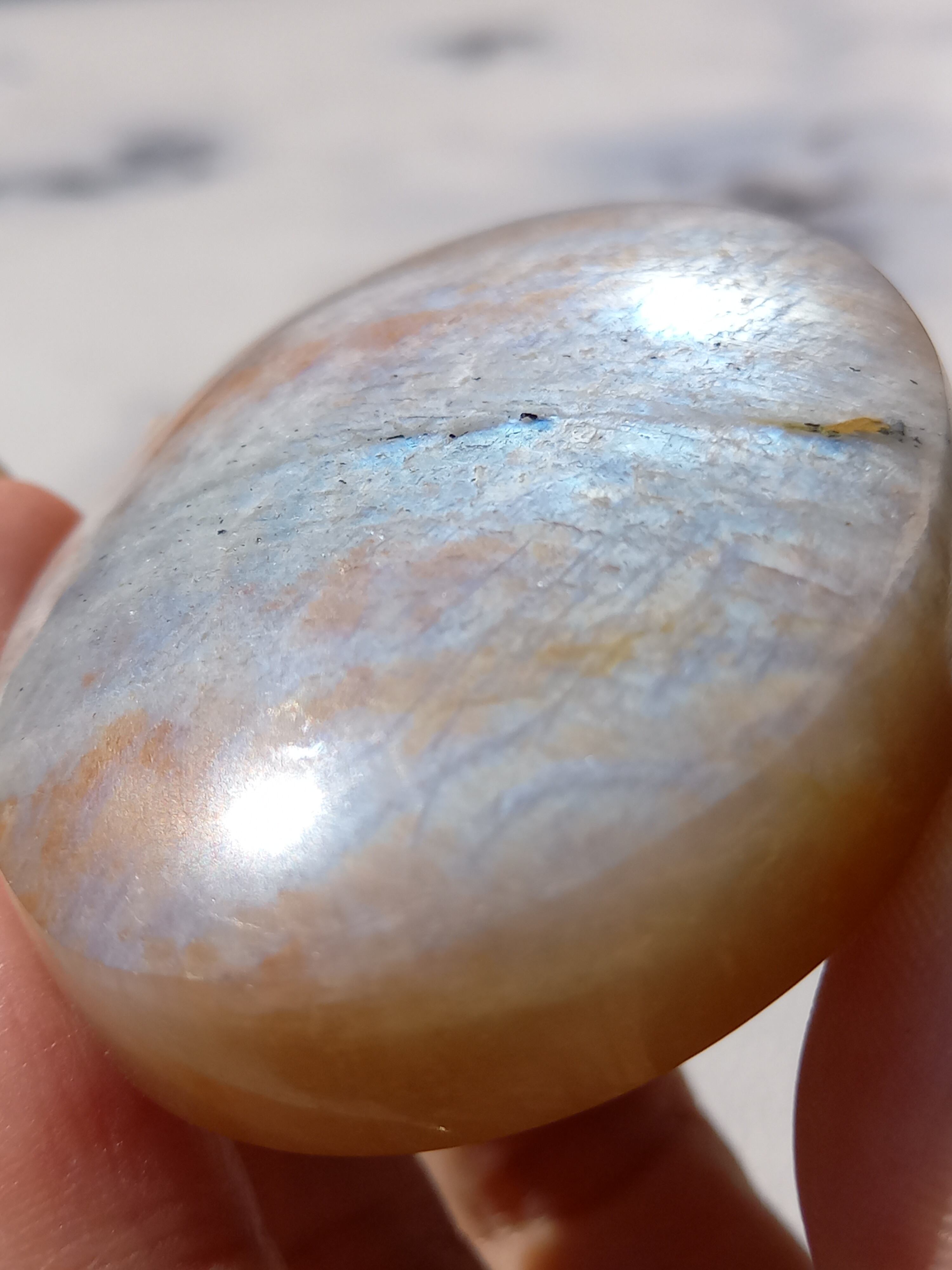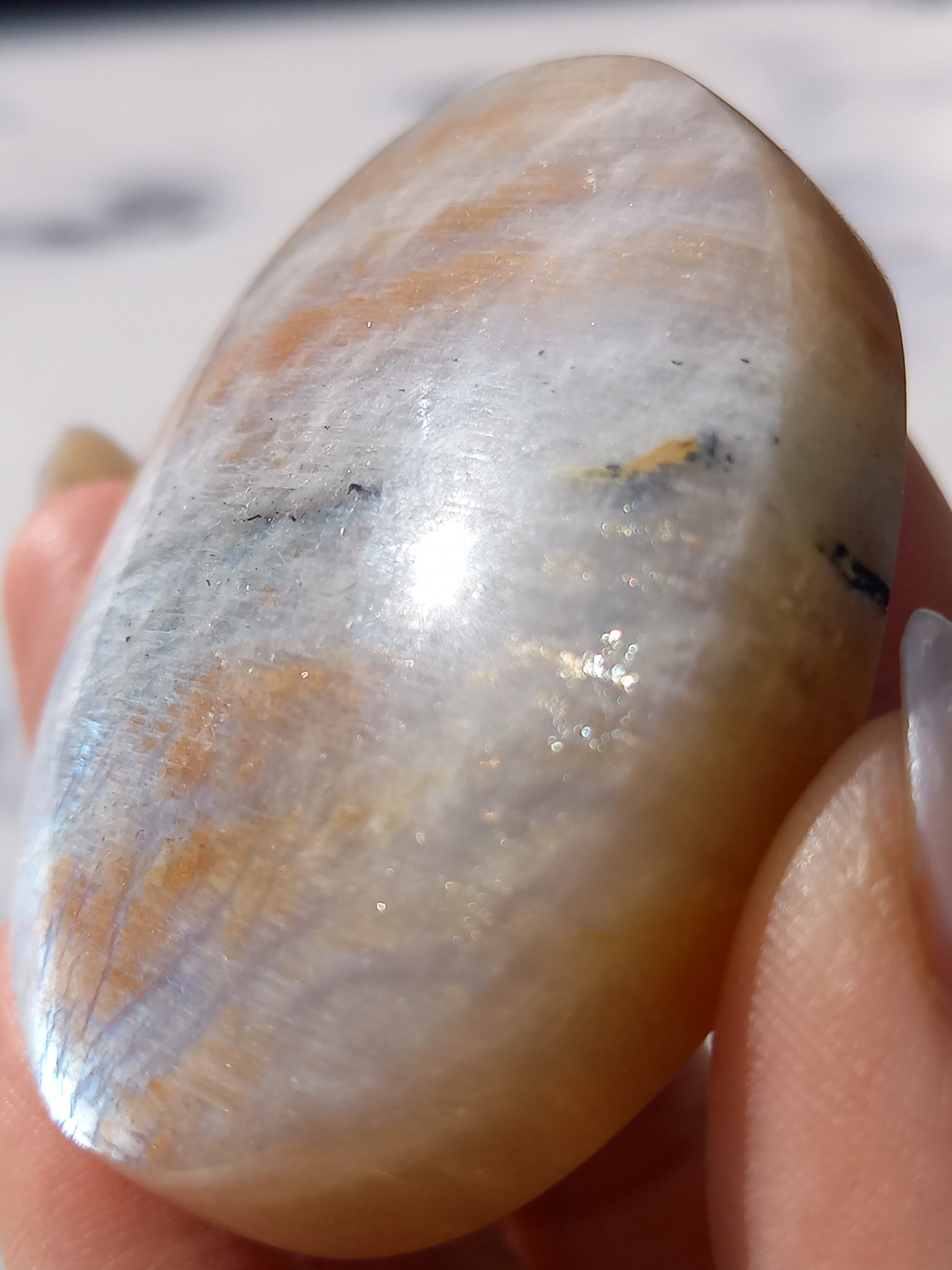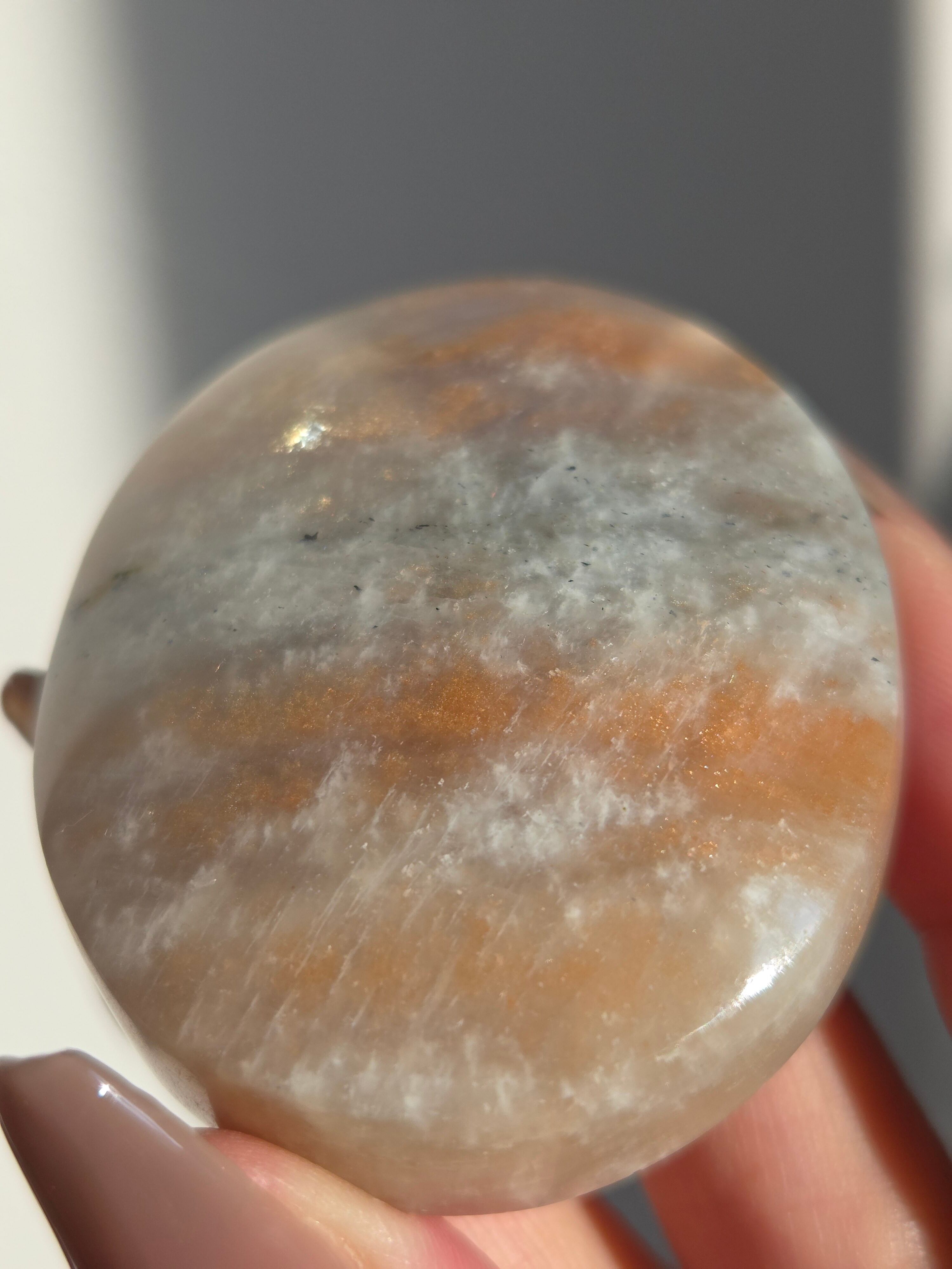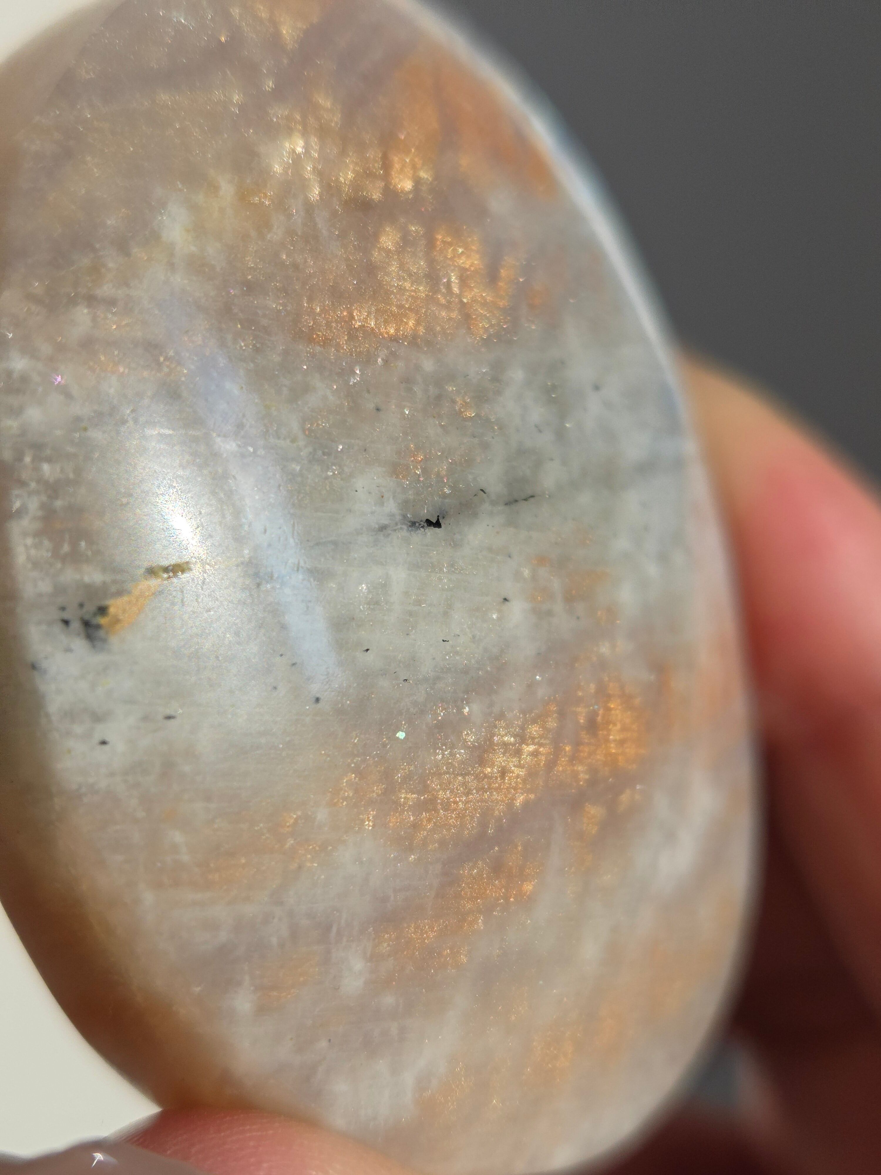 傾きによって、ムーンストーンの美しいブルーシラーが見えたり、ゴールドサンストーンの煌めきが見えたりと、1つのパームでサンムーンストーンの異なる美しさを堪能できる贅沢な子です。