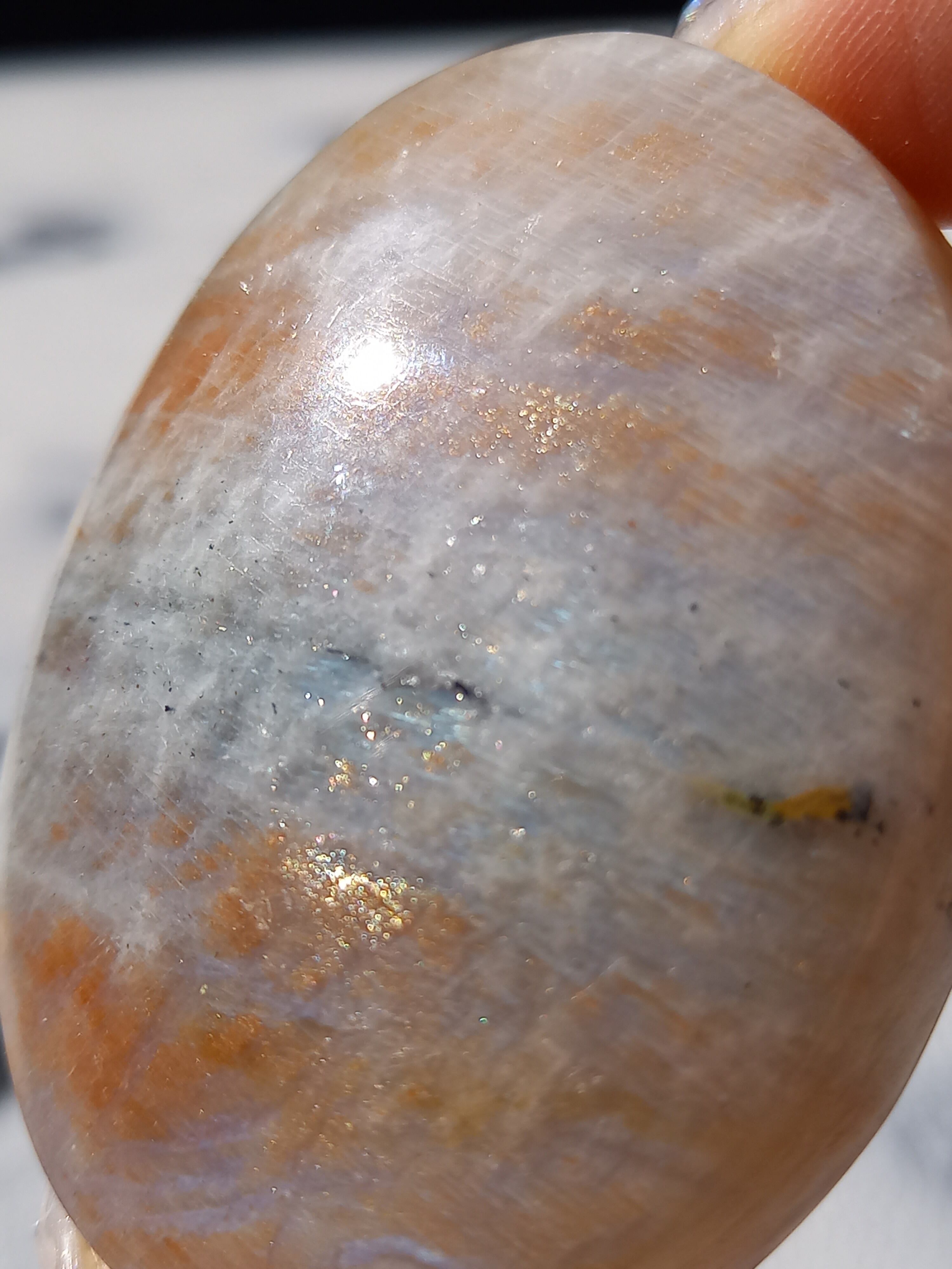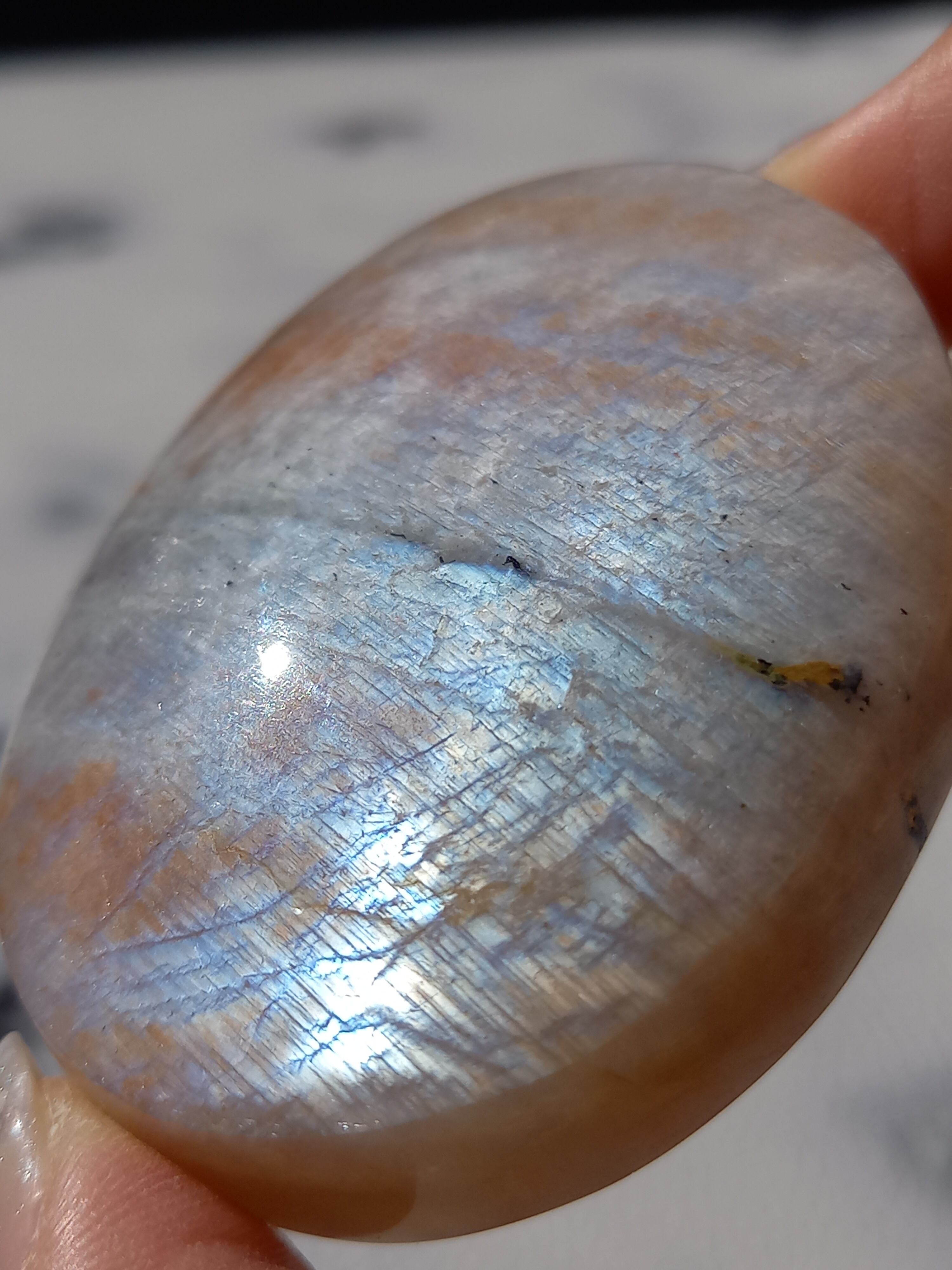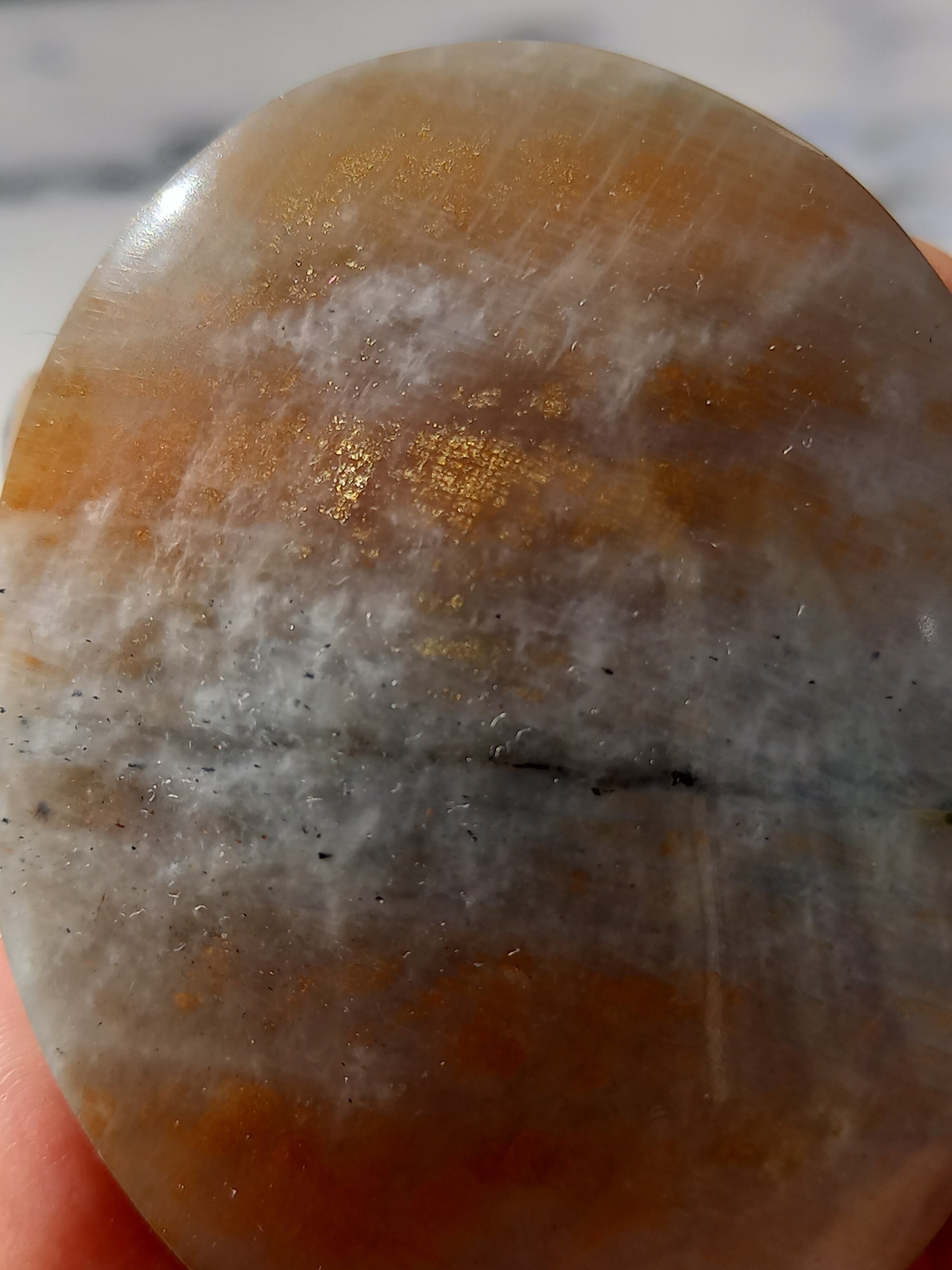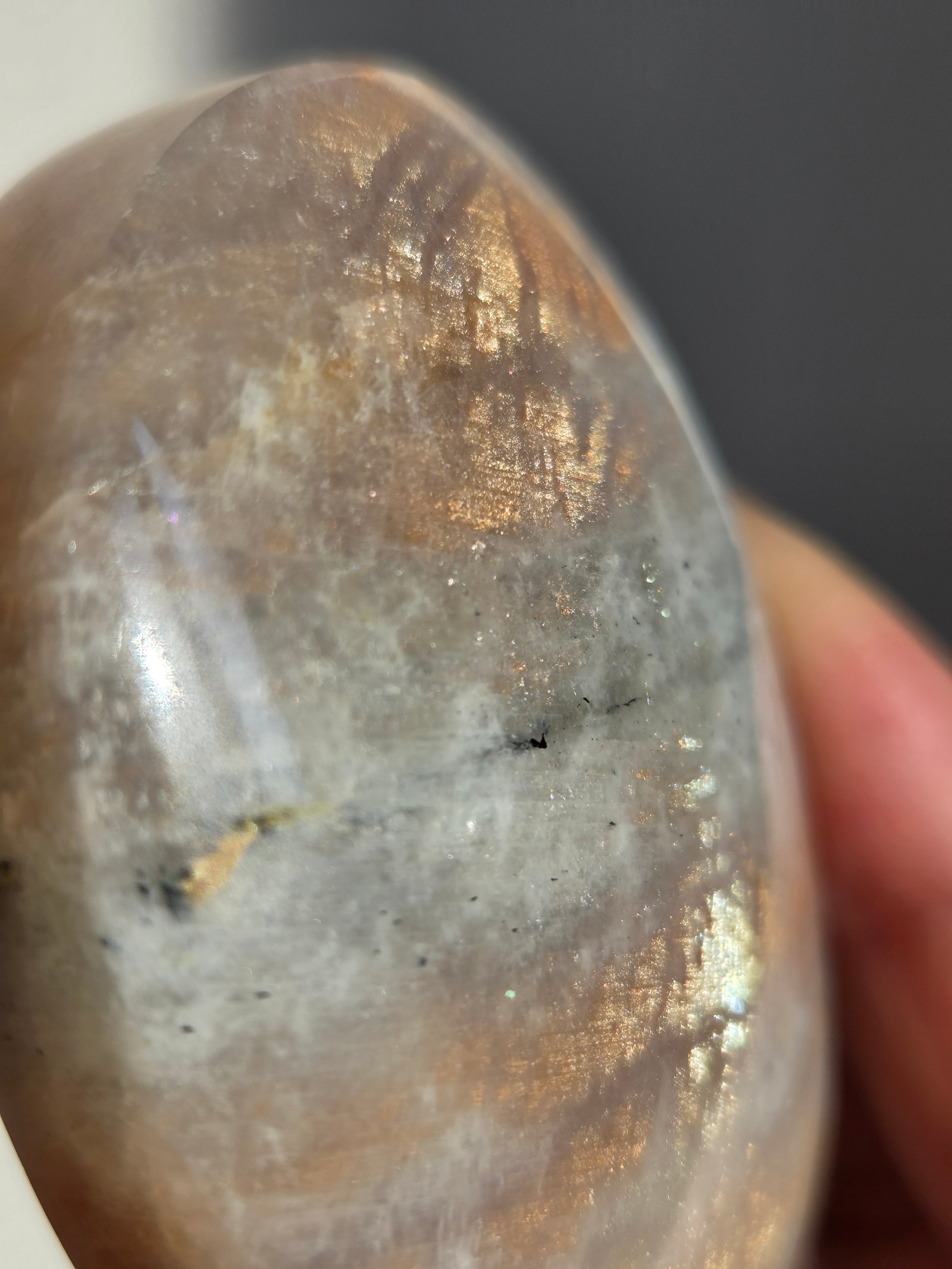 傾きによって、ムーンストーンの美しいブルーシラーが見えたり、ゴールドサンストーンの煌めきが見えたりと、1つのパームでサンムーンストーンの異なる美しさを堪能できる贅沢な子です。