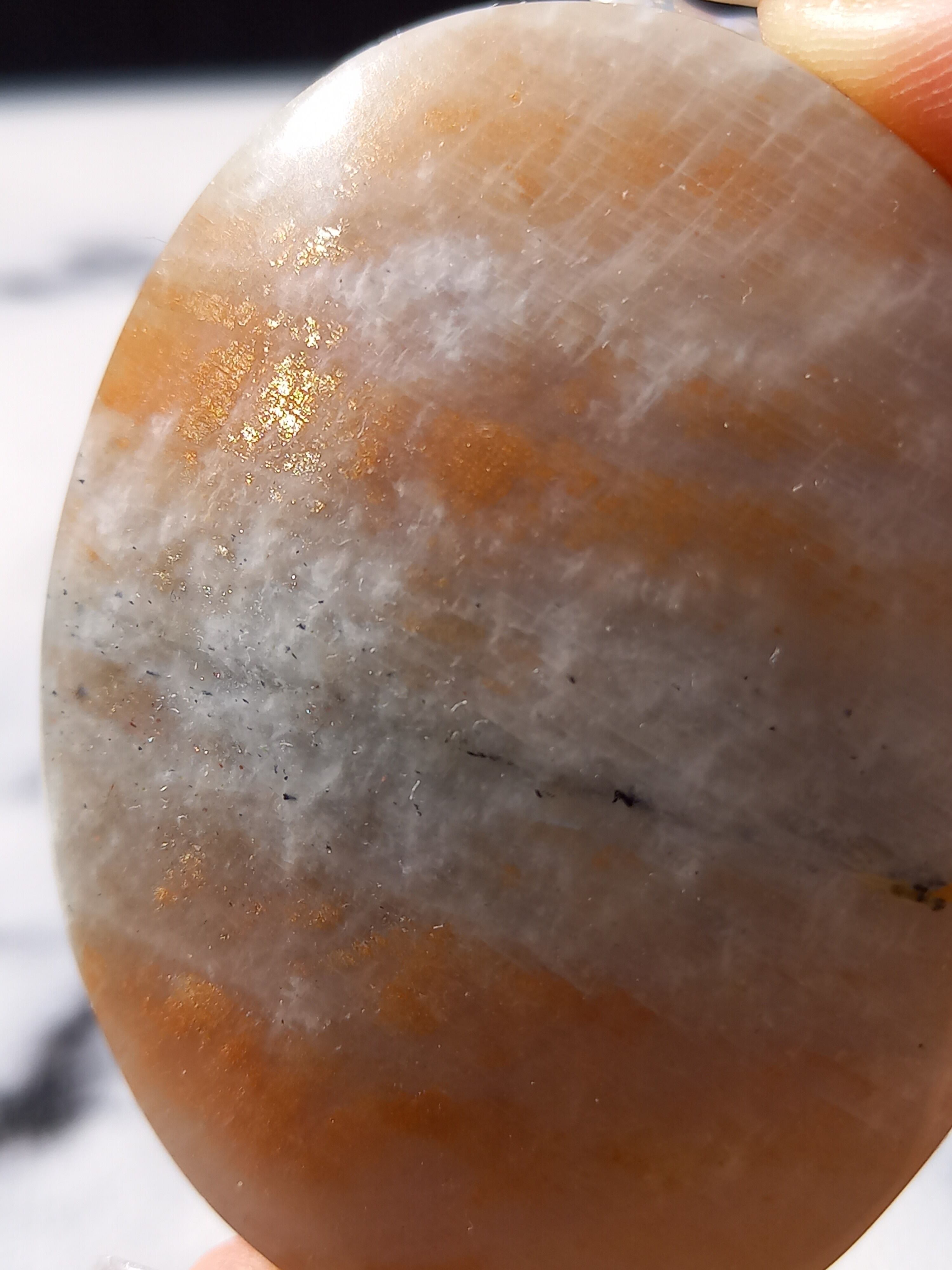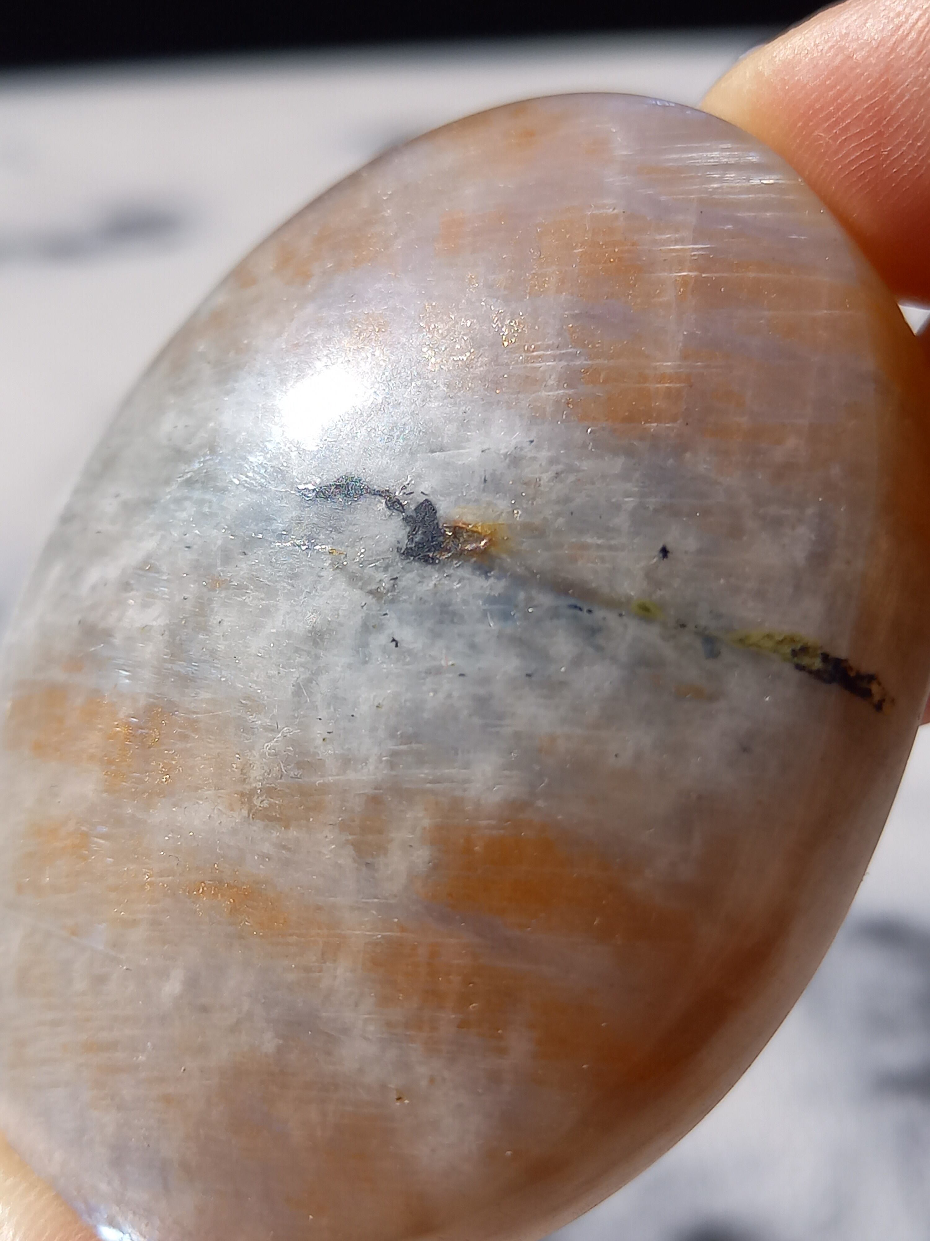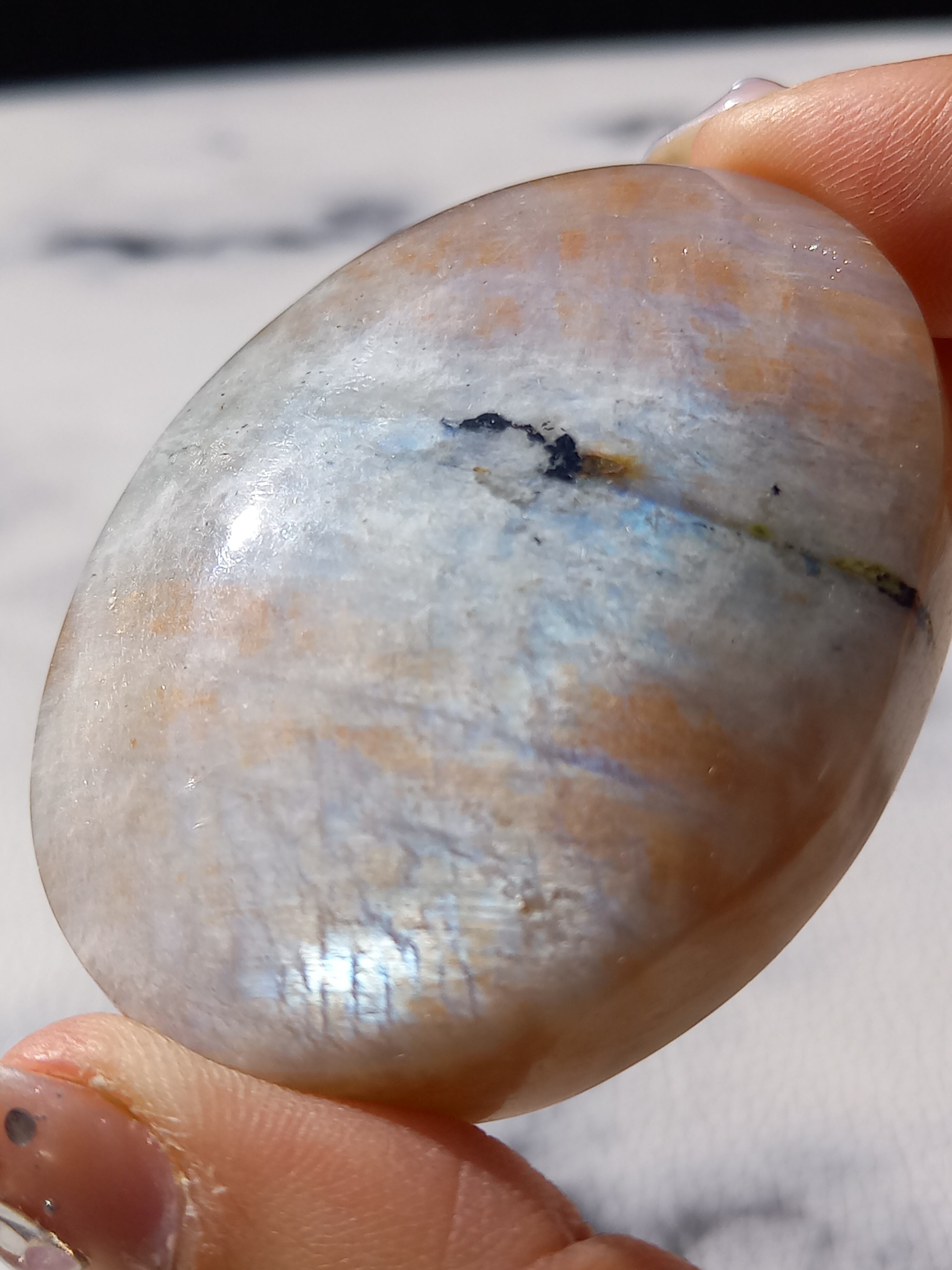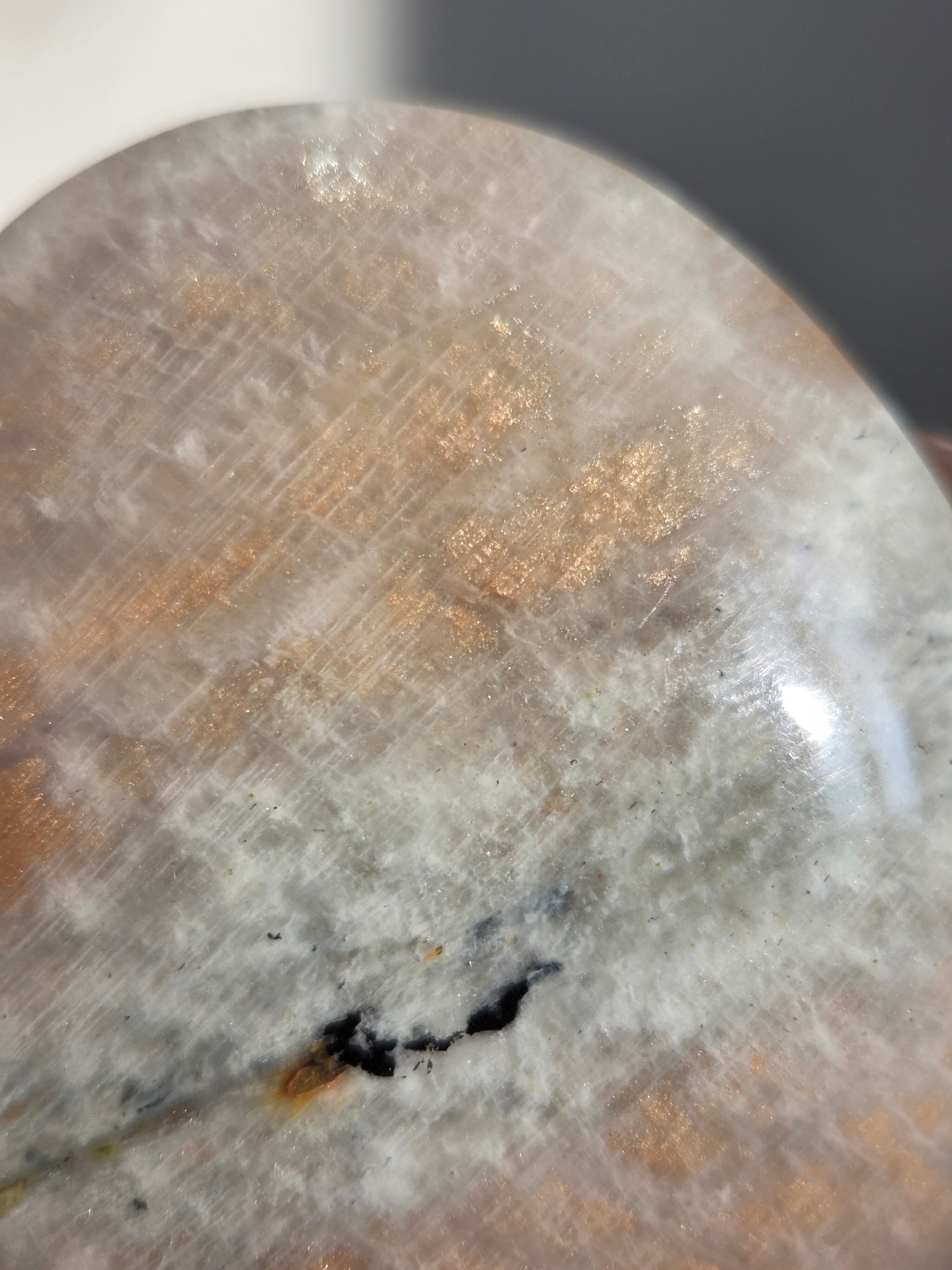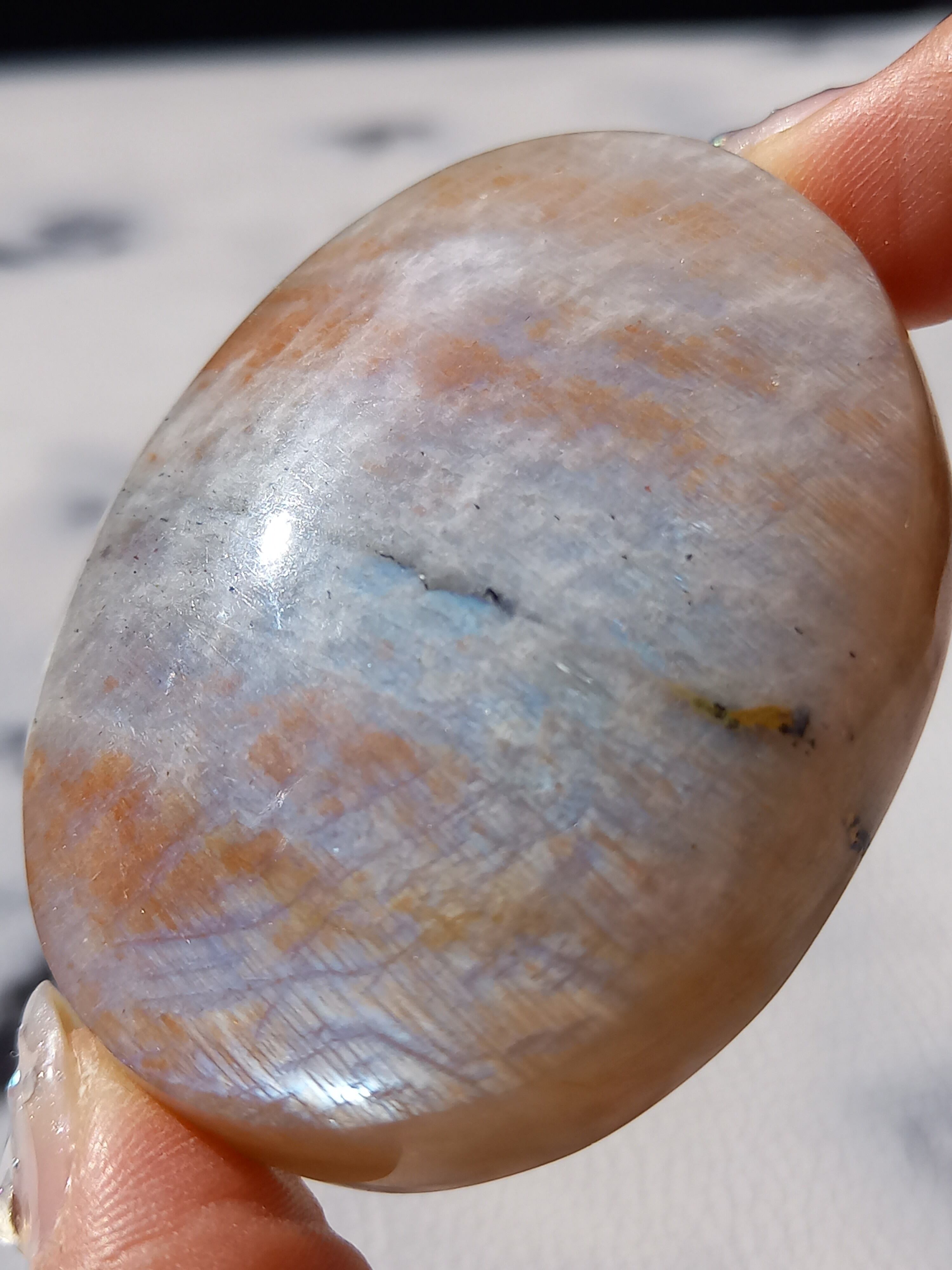 傾きによって、ムーンストーンの美しいブルーシラーが見えたり、ゴールドサンストーンの煌めきが見えたりと、1つのパームでサンムーンストーンの異なる美しさを堪能できる贅沢な子です。