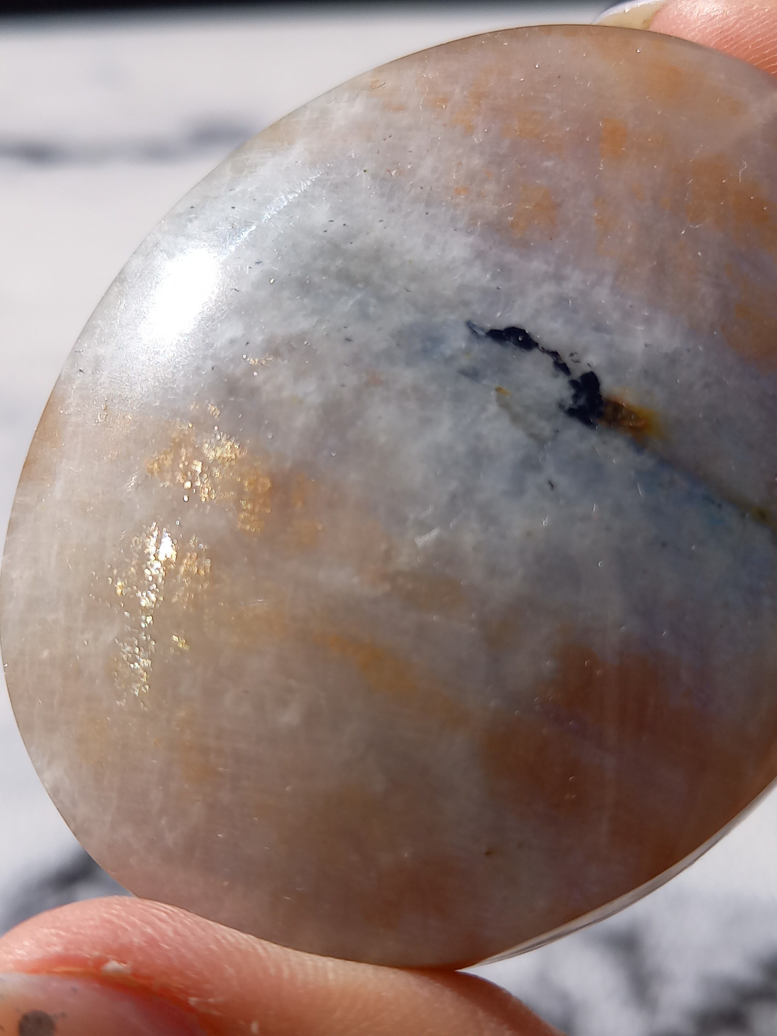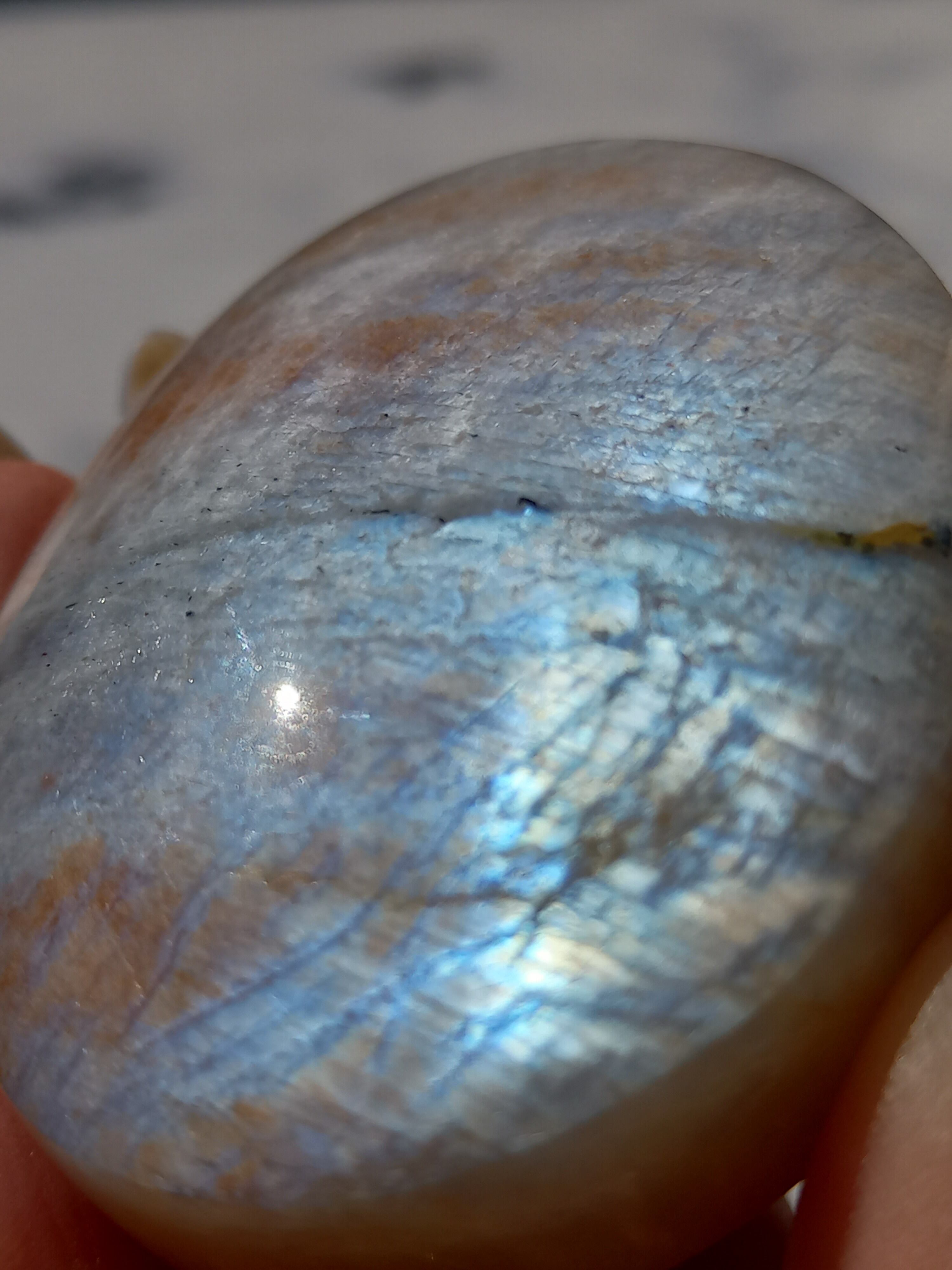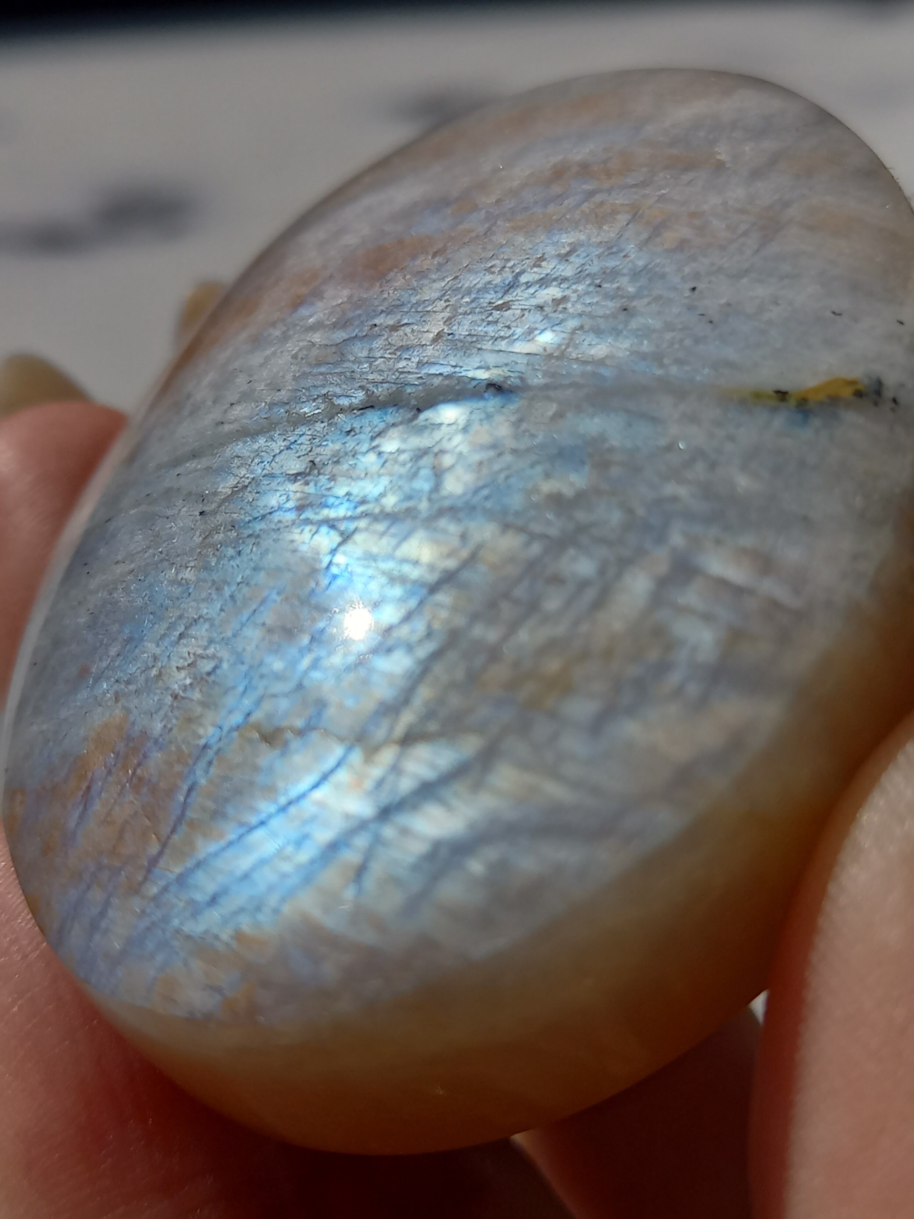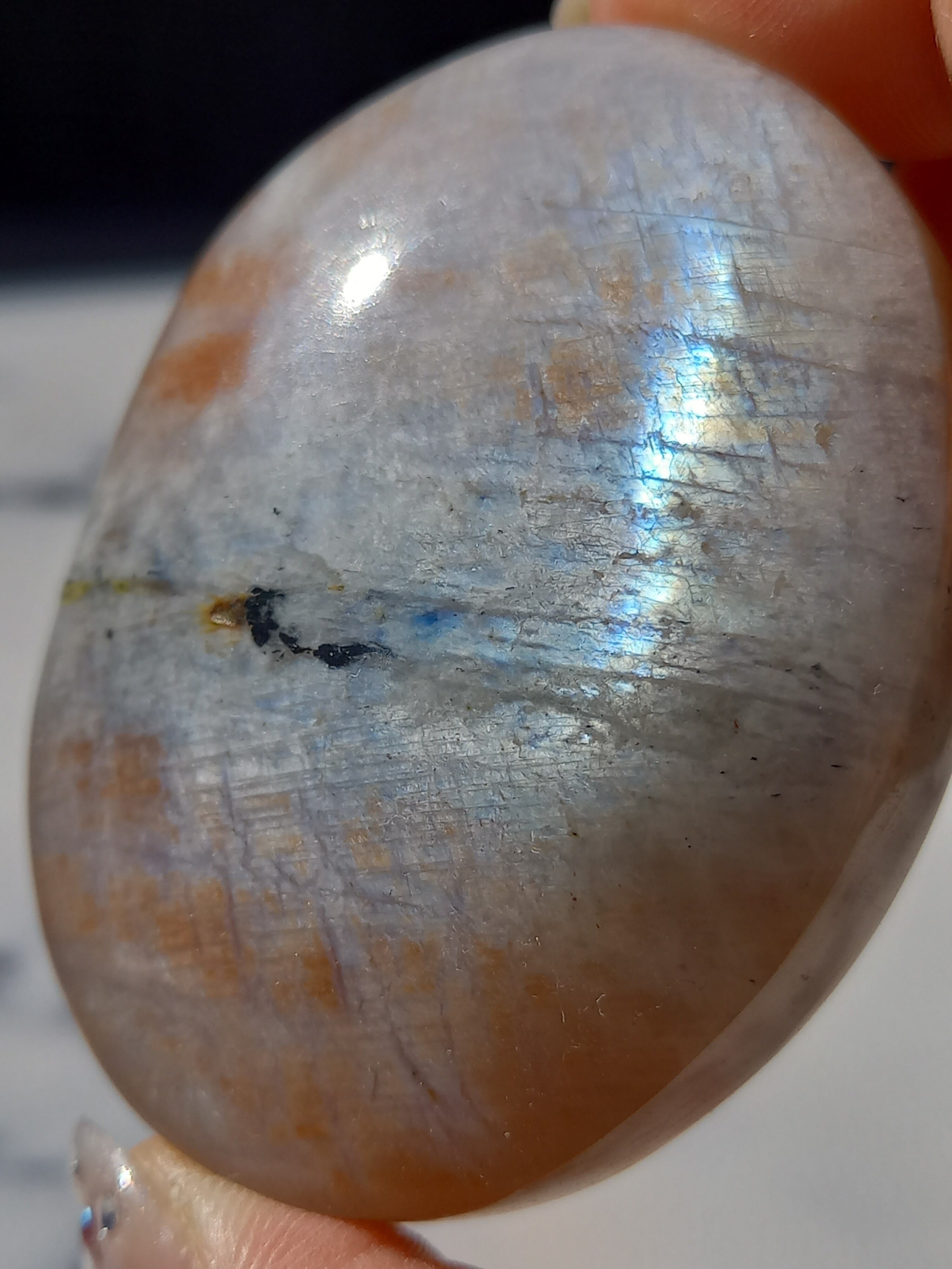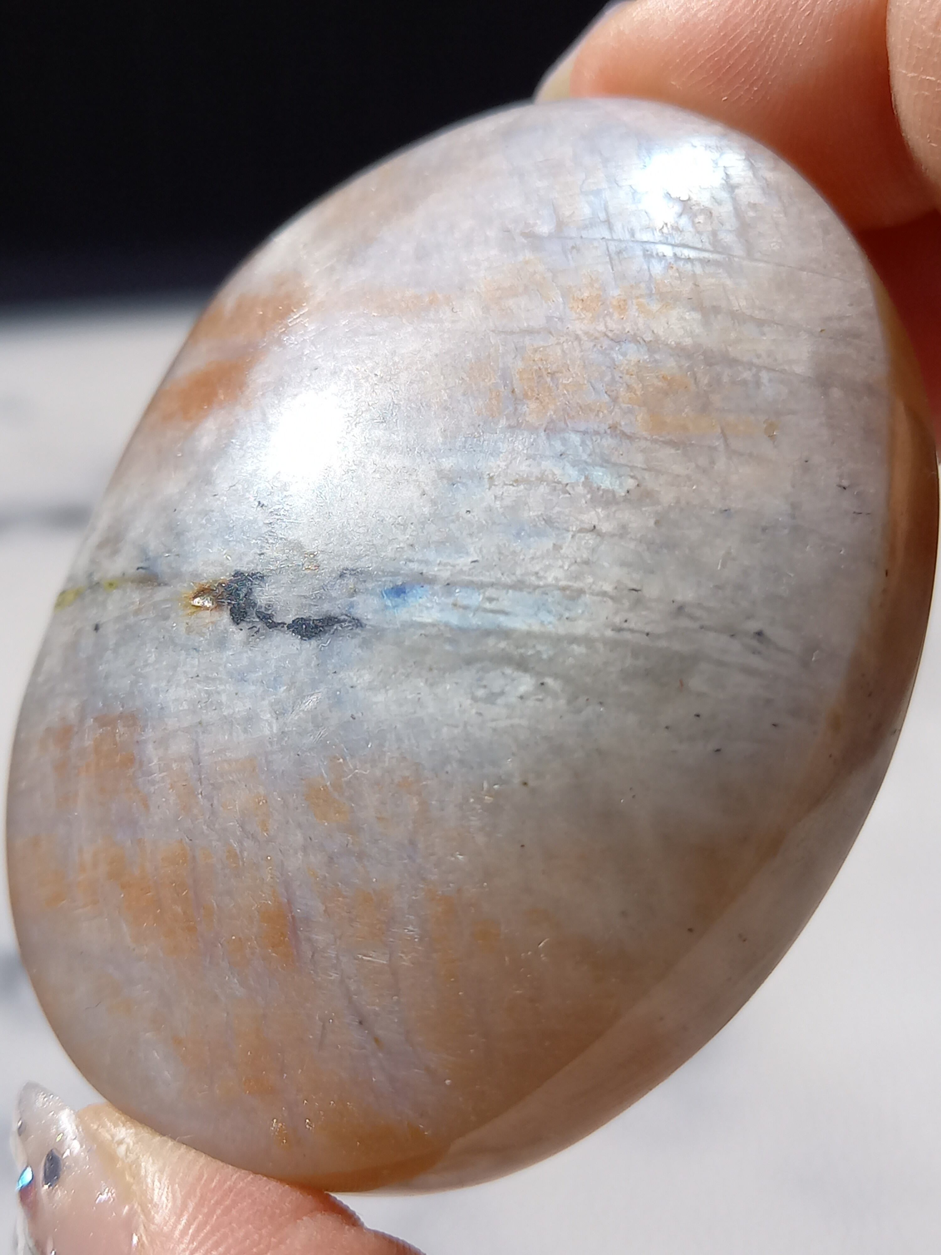 傾きによって、ムーンストーンの美しいブルーシラーが見えたり、ゴールドサンストーンの煌めきが見えたりと、1つのパームでサンムーンストーンの異なる美しさを堪能できる贅沢な子です。