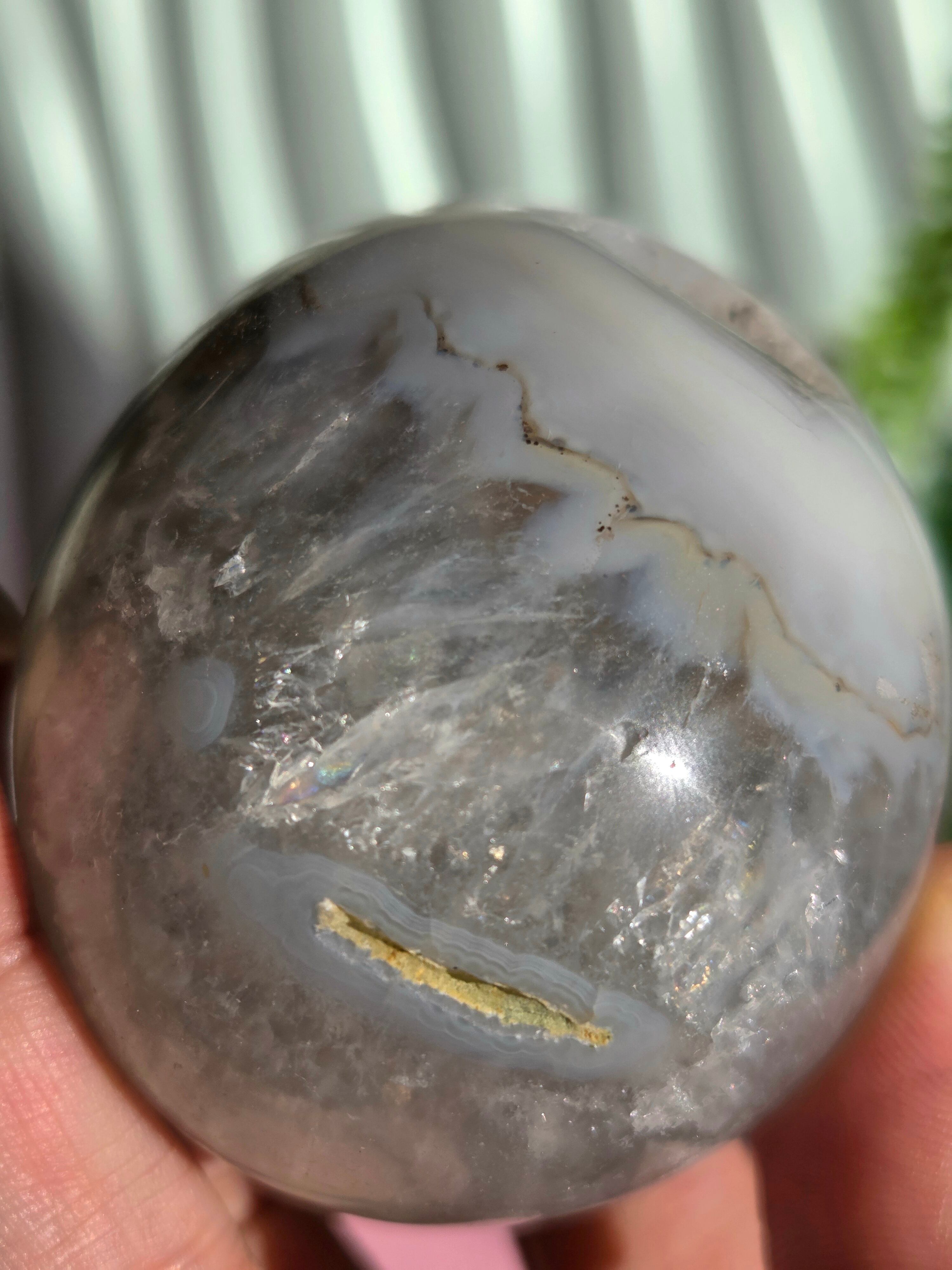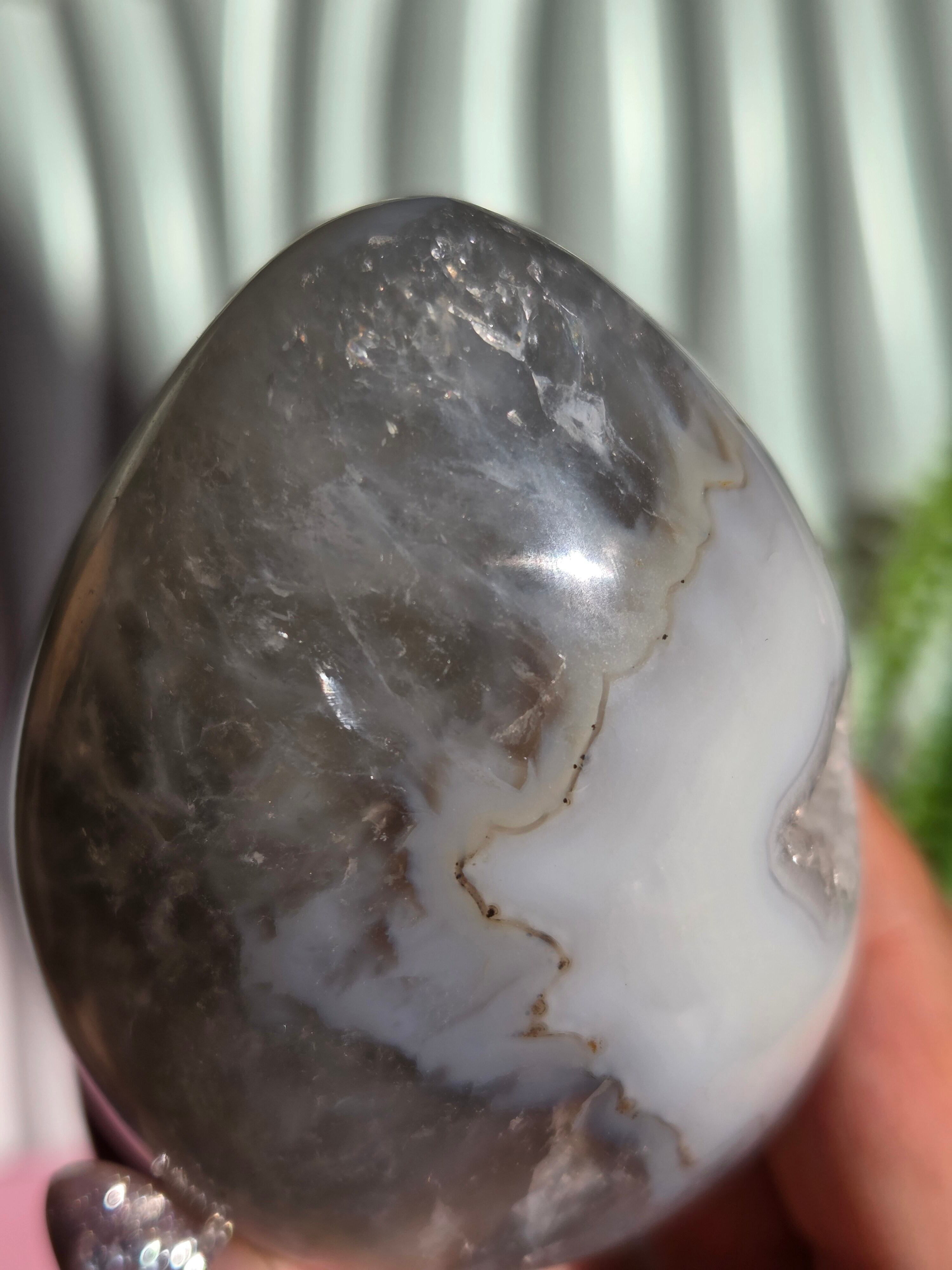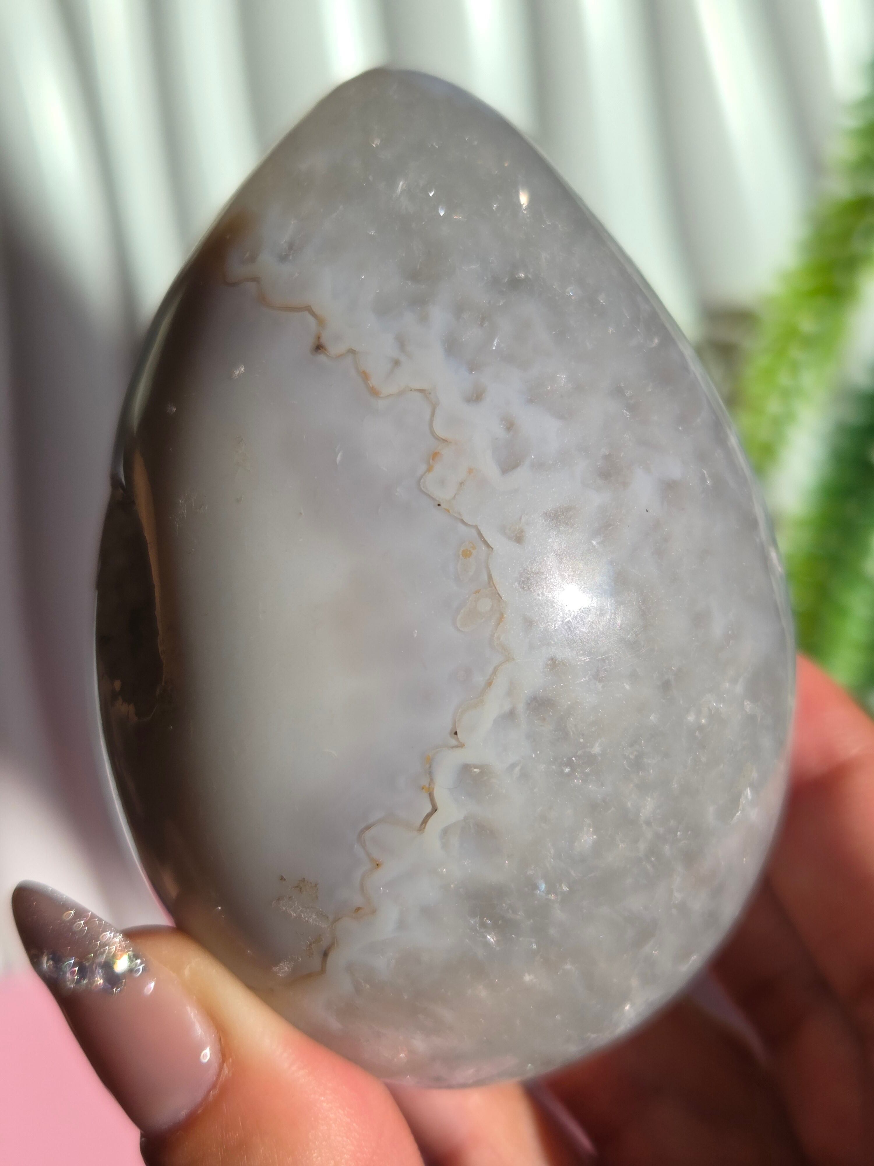グリーンカラーの為グリーンアメジストのようにも見えるのですが、確定していない為、アゲートジオードエッグとのみ記載しております。