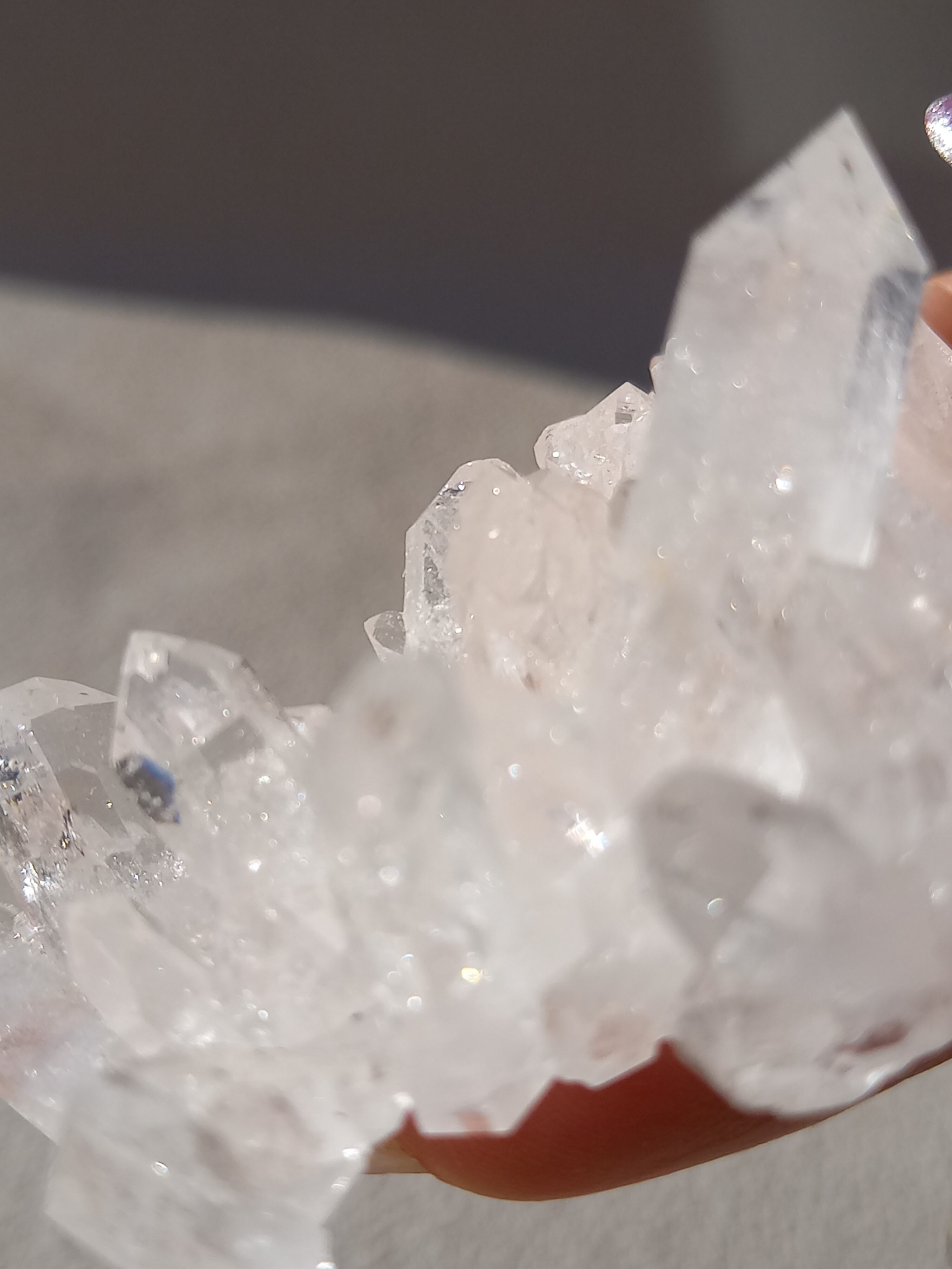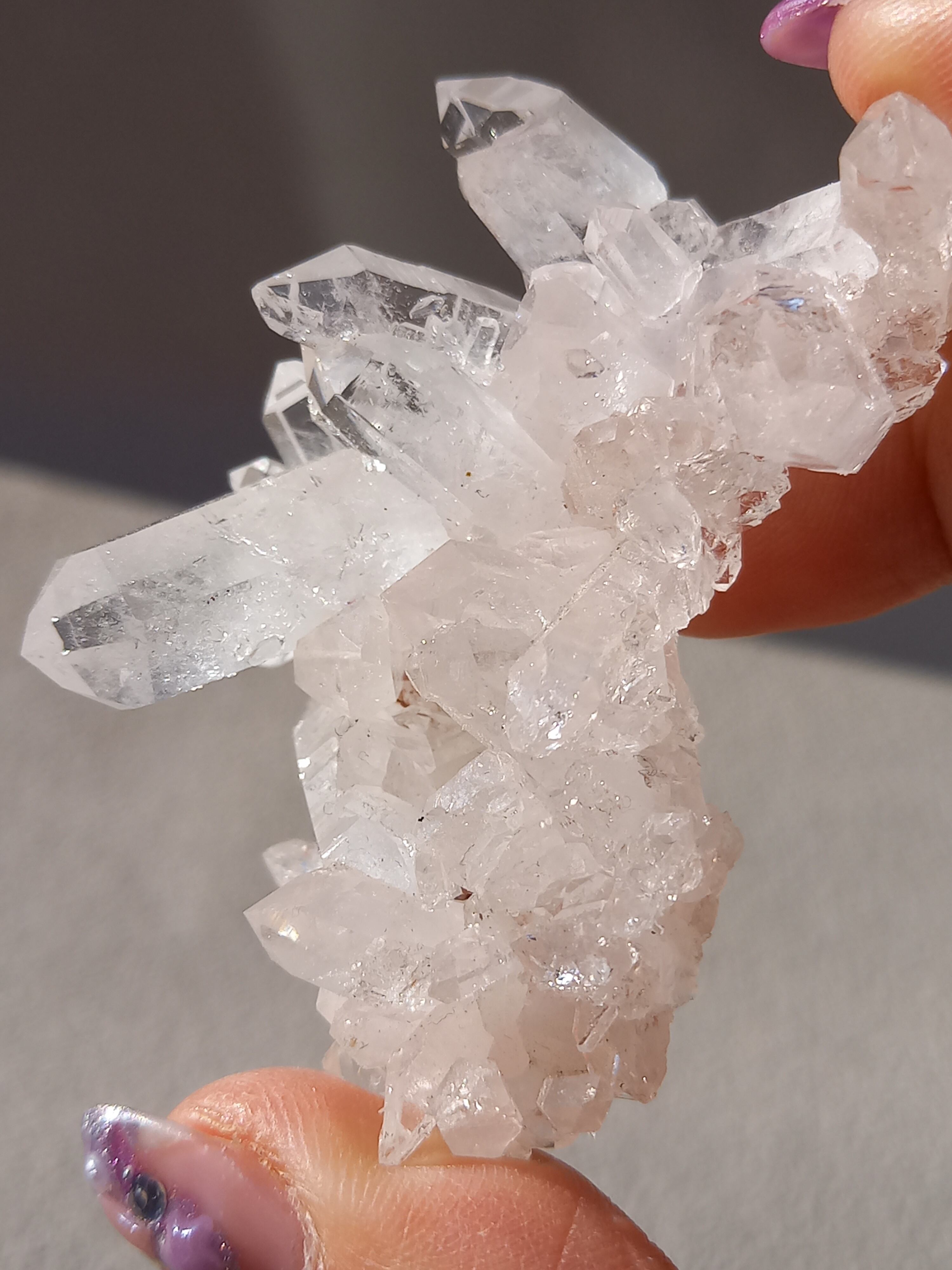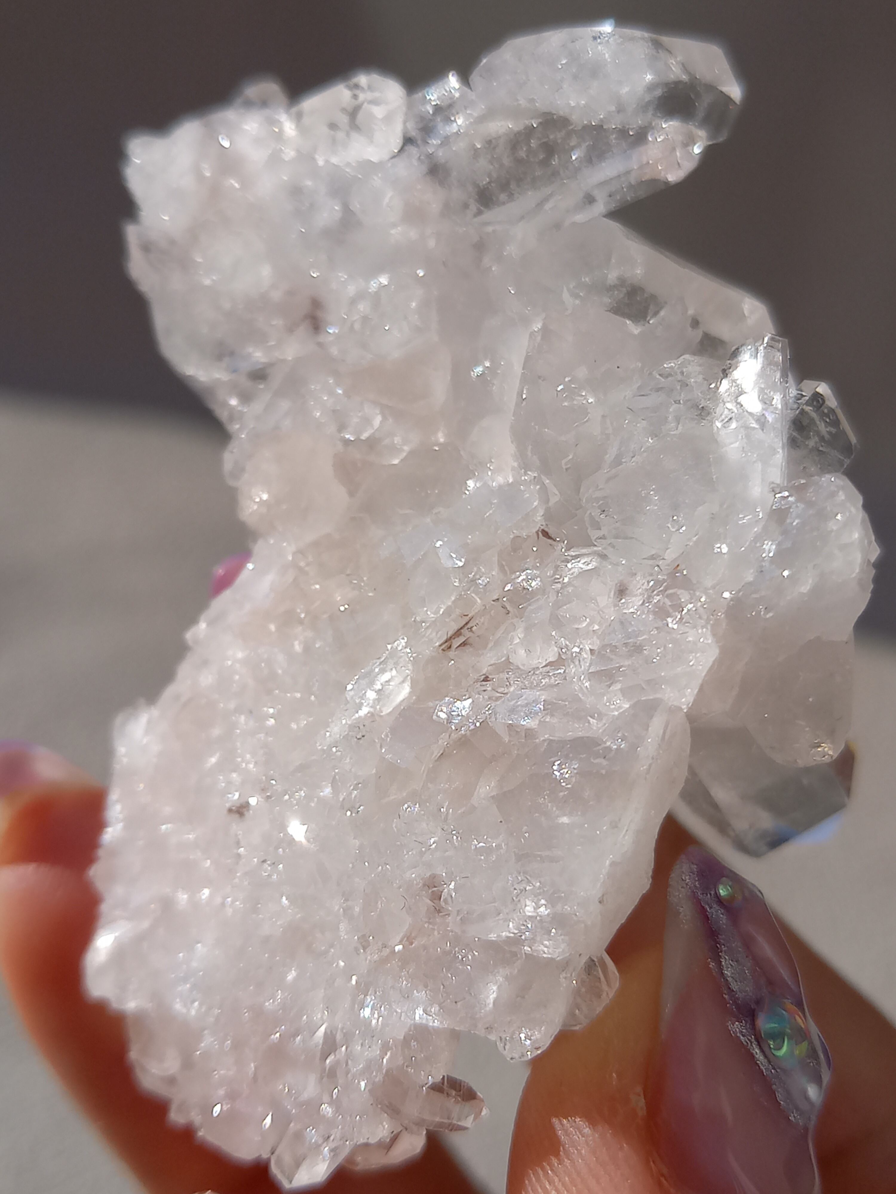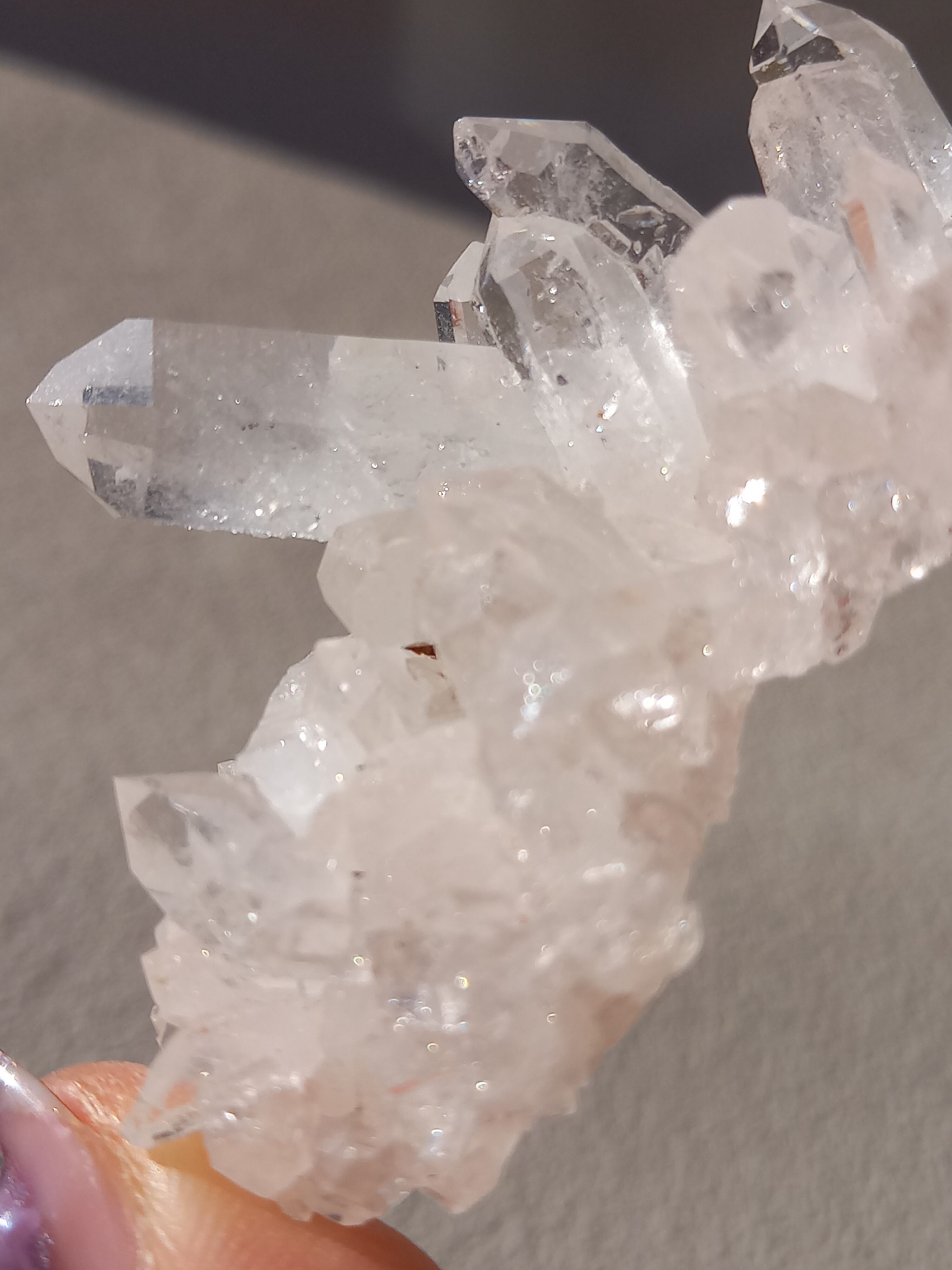 うっすらピンク色の、キラキラな透明感溢れるクォーツがとても素敵です。コロンビア産水晶の特徴は何と言っても抜群の透明度です。 まさに「氷」のようです。その透明度と照りは「世界で一番美しい」とさえいわれる程です。