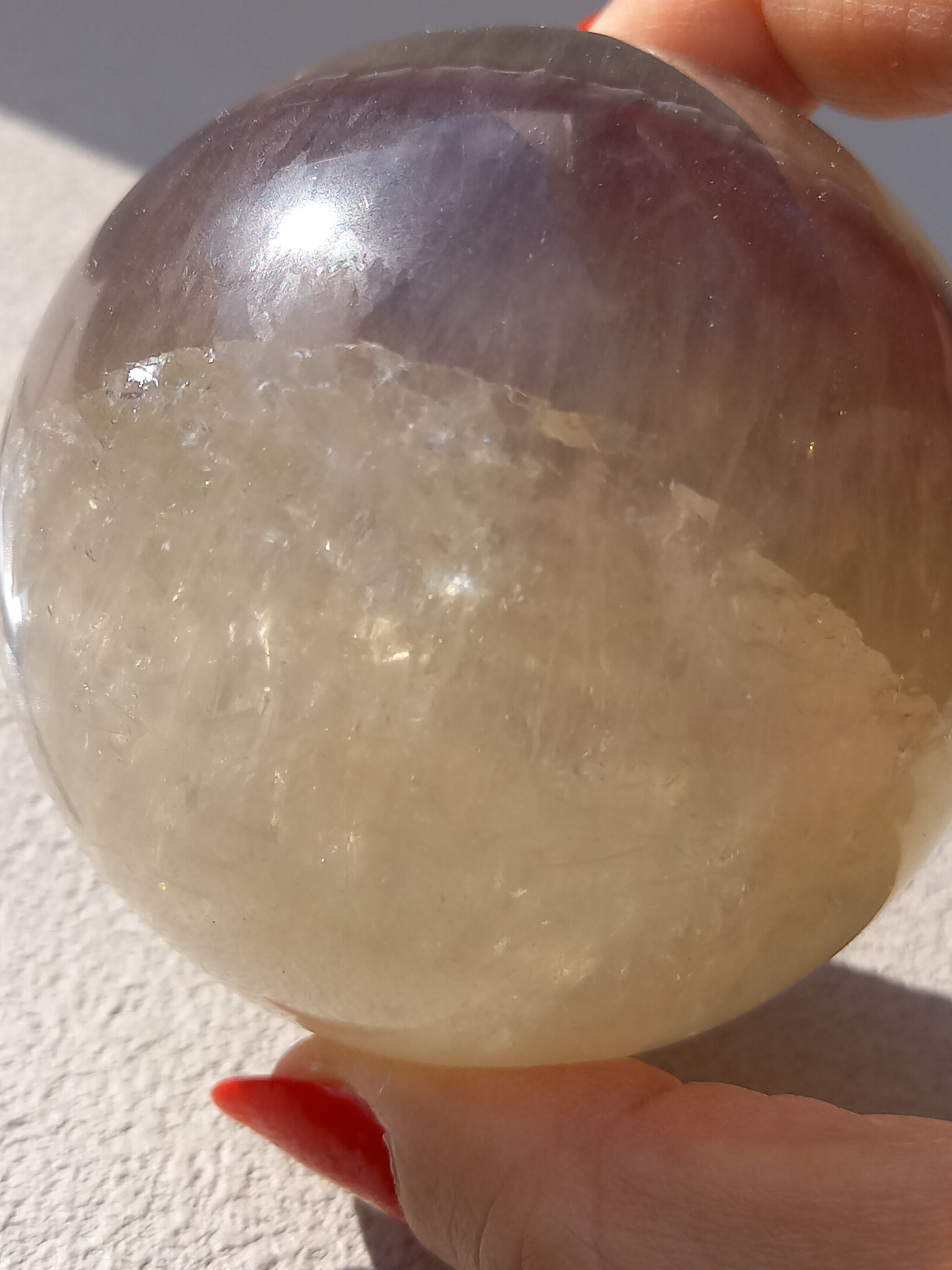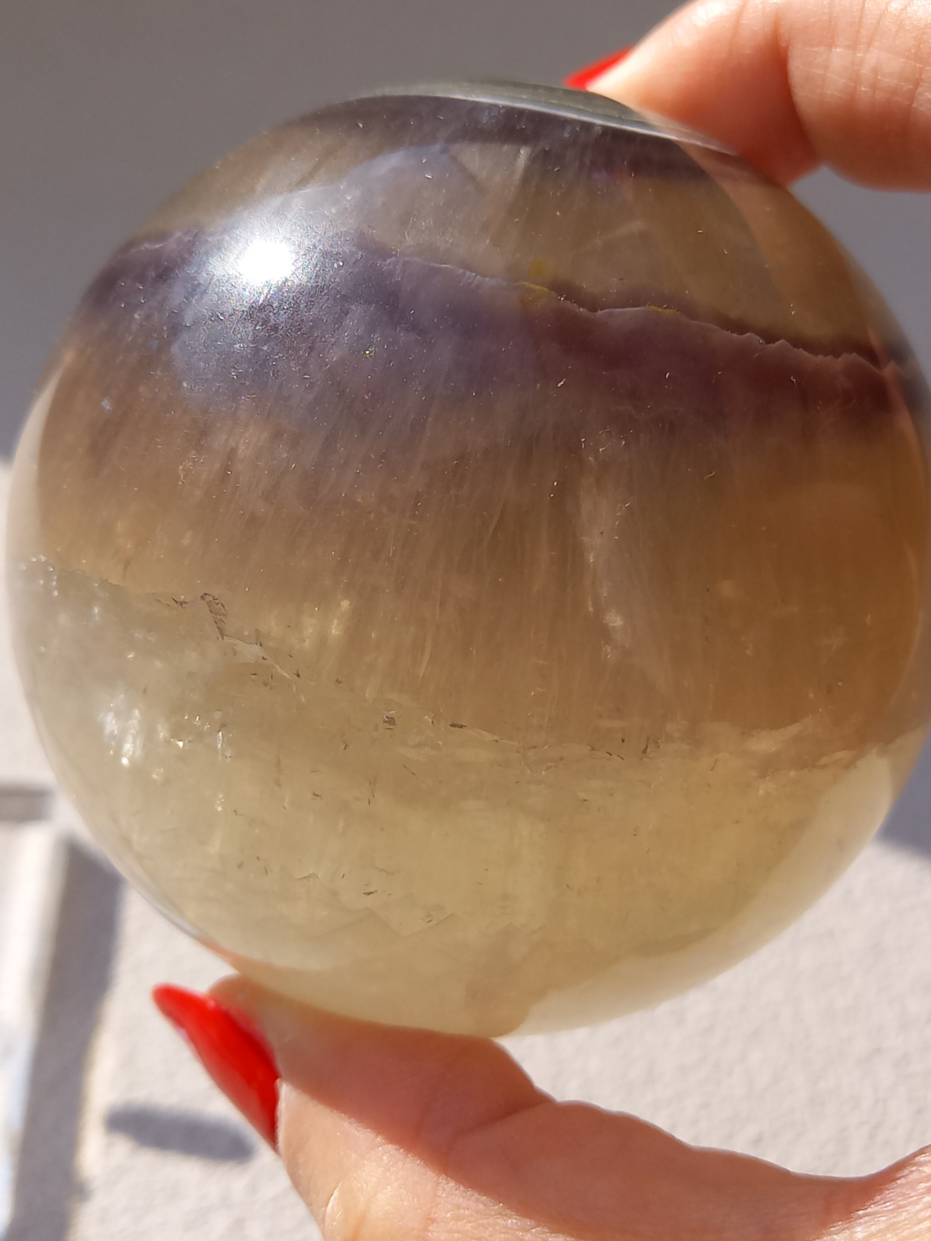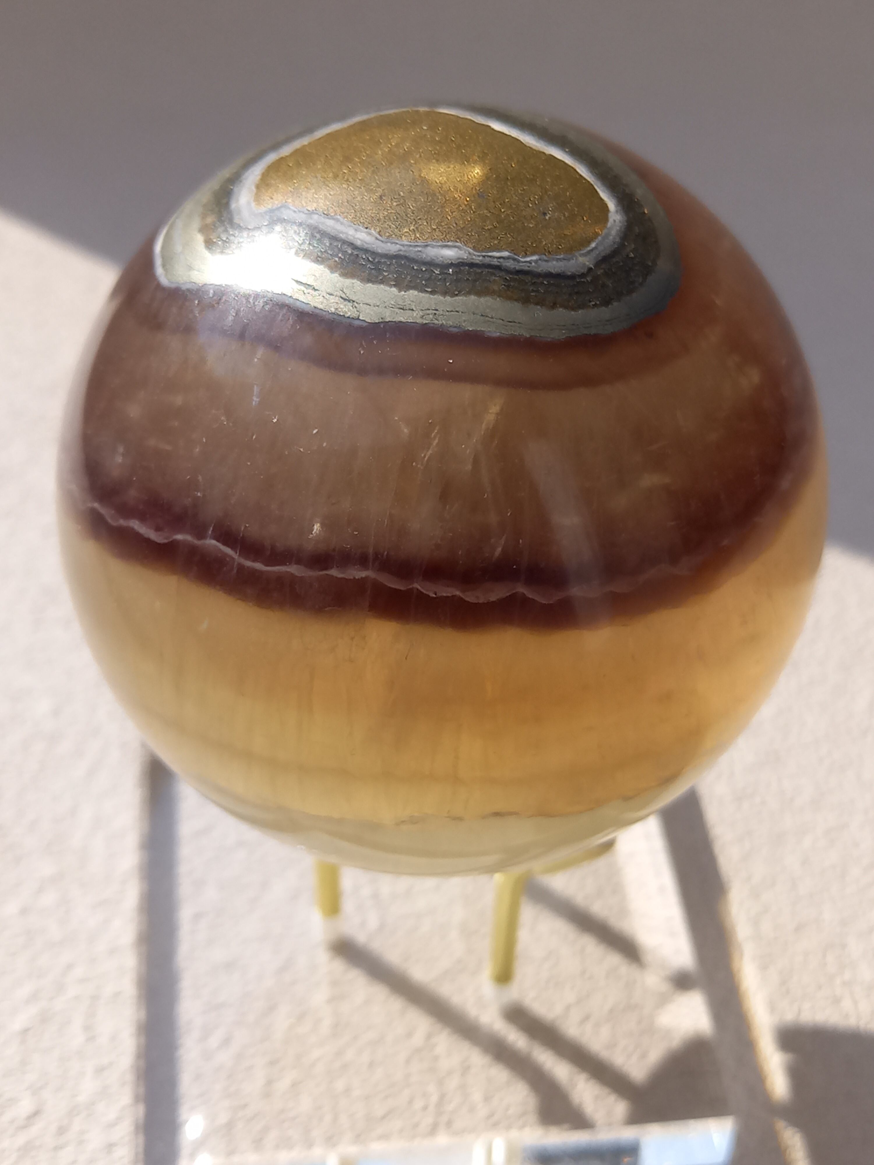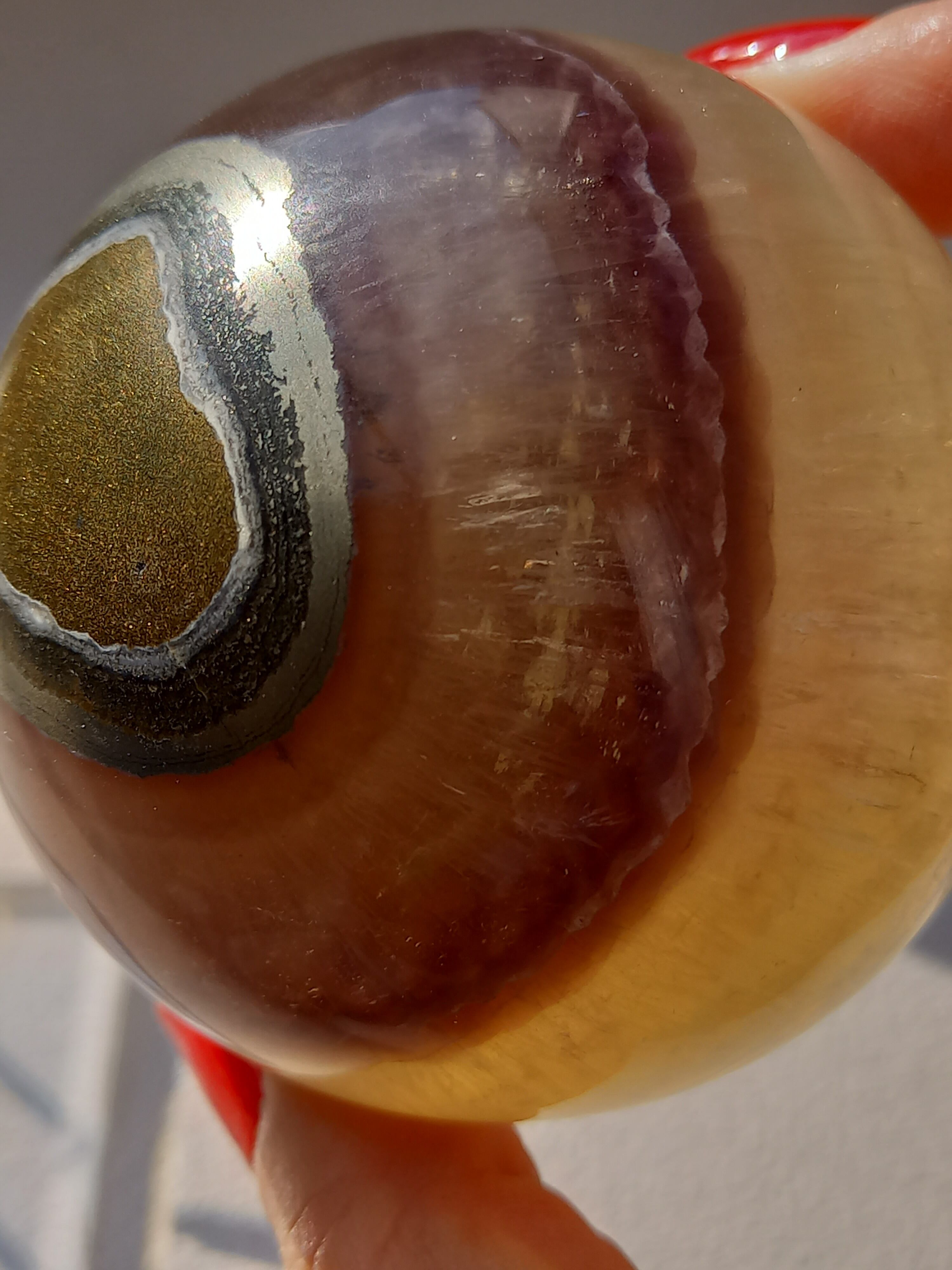 パープル×イエローカラーのフローライトに、キラッキラマイカとパイライトが入ったスフィアになります。