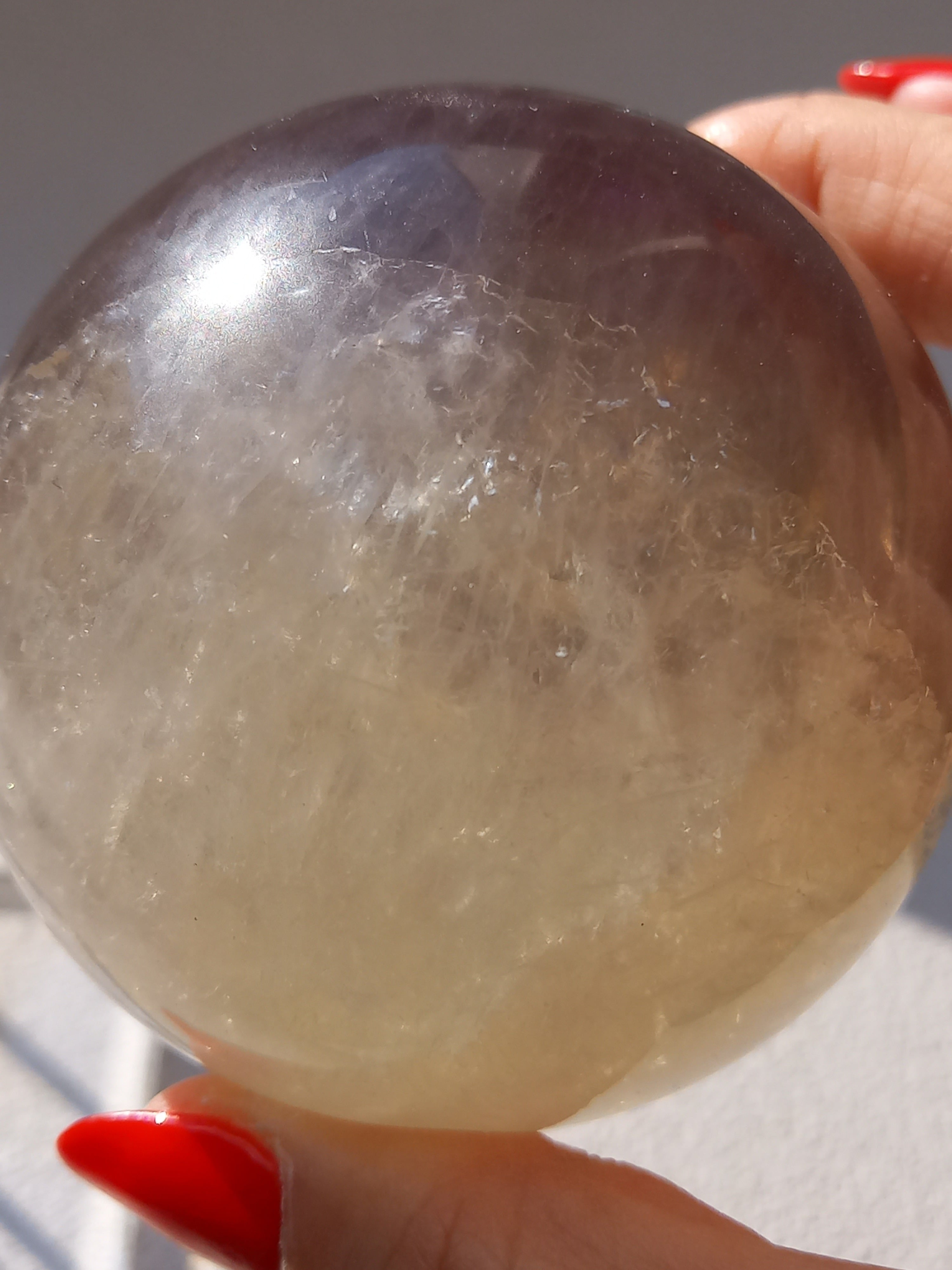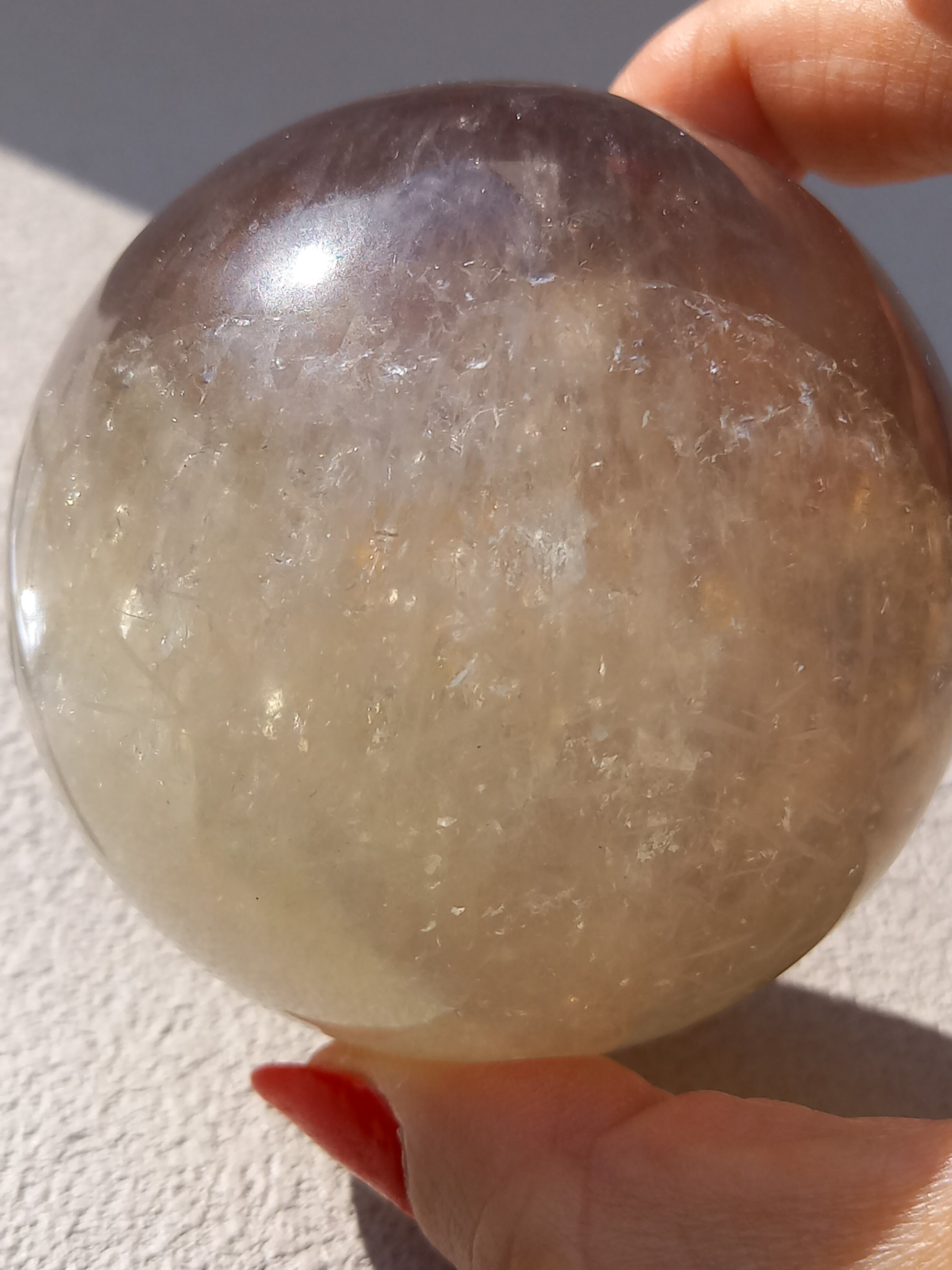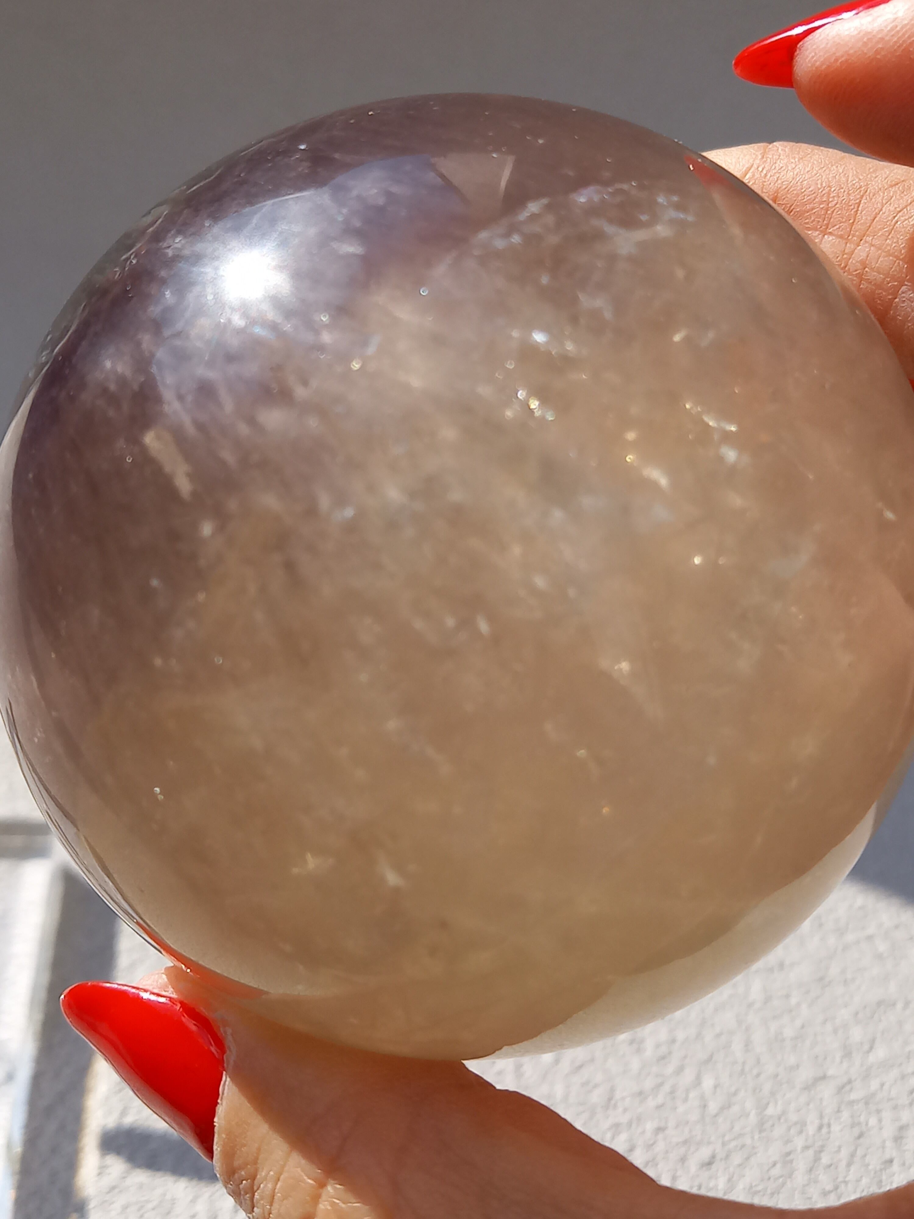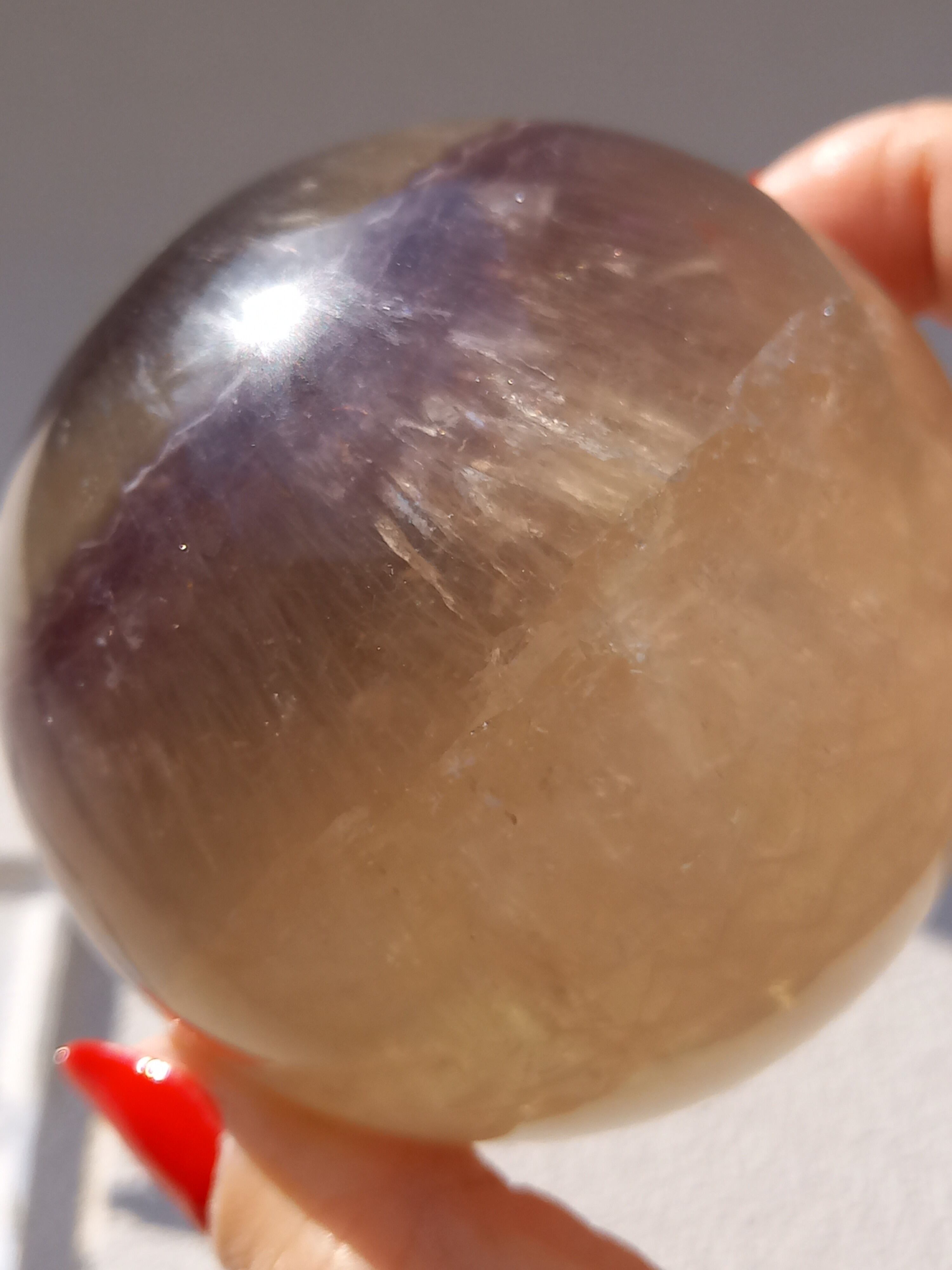 パープル×イエローカラーのフローライトに、キラッキラマイカとパイライトが入ったスフィアになります。