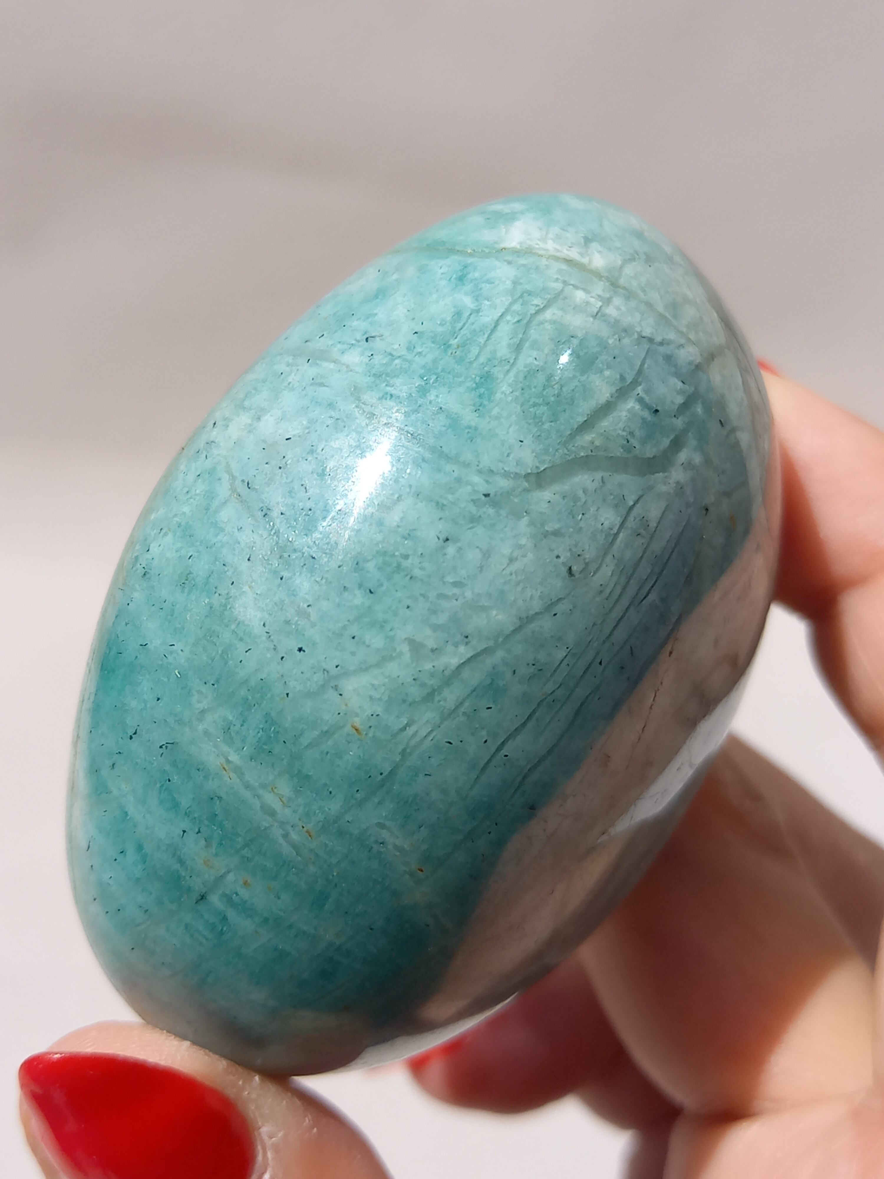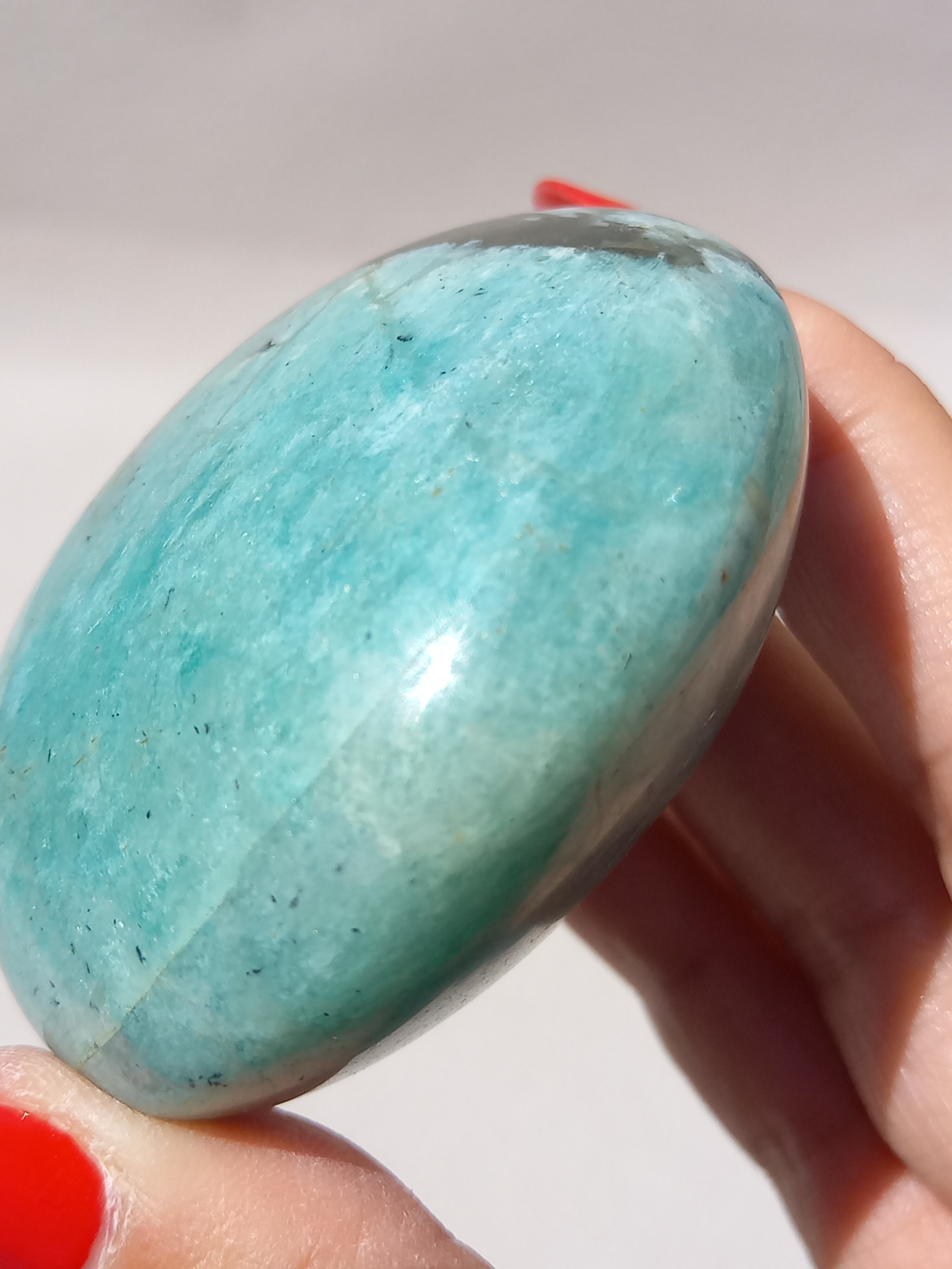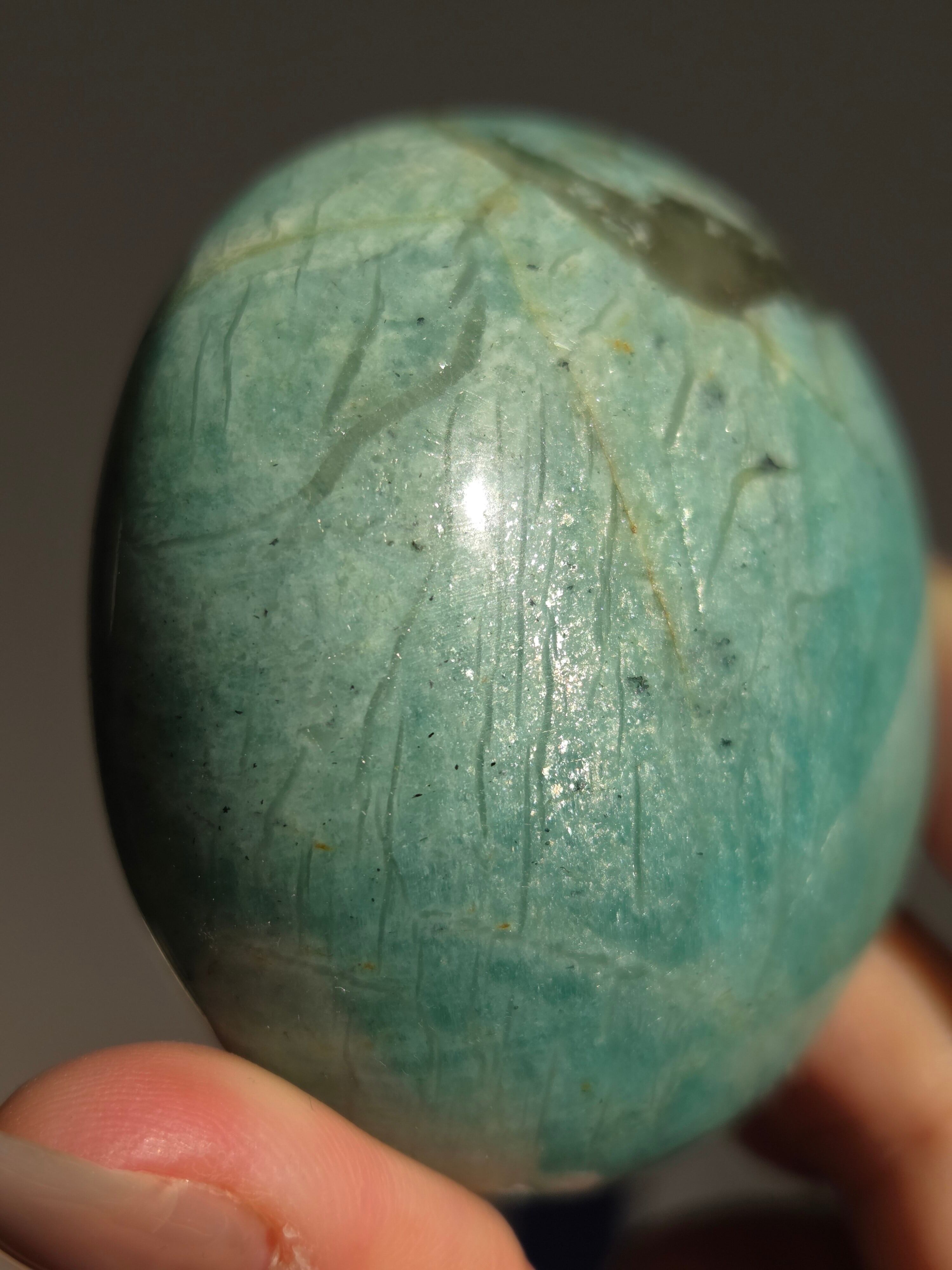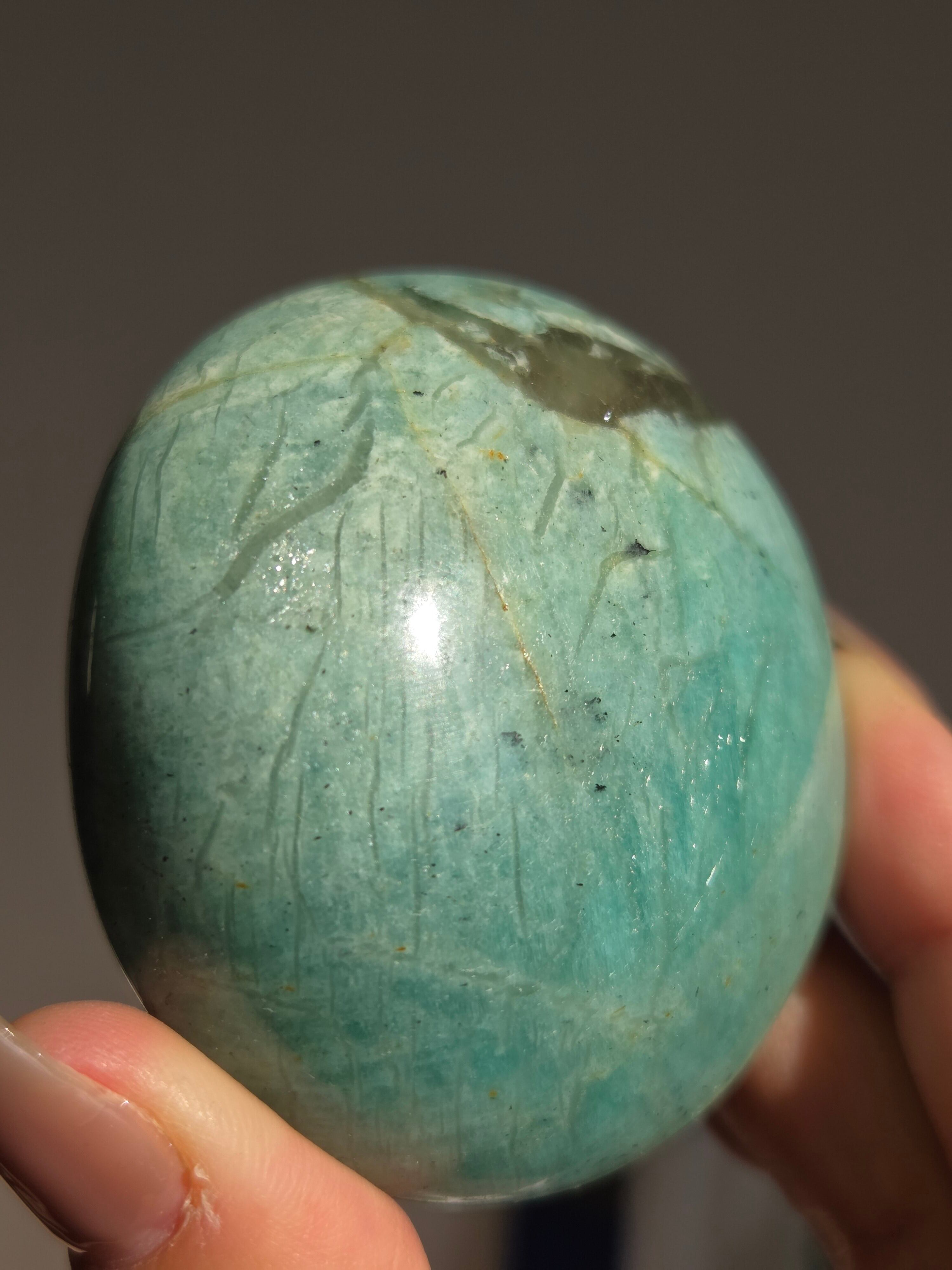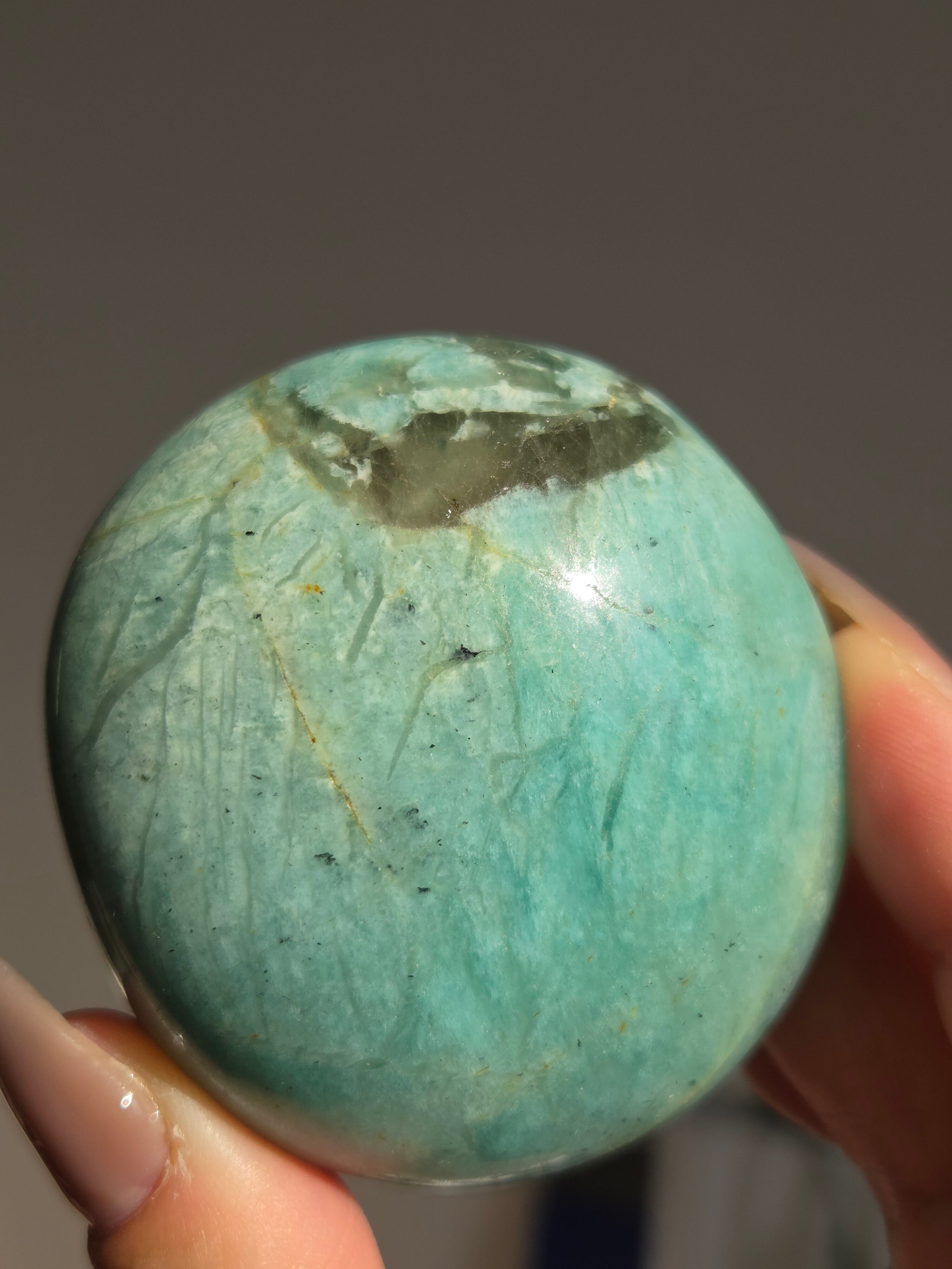 エメラルドグリーンとシラーが美しいアマゾナイトのパームです。