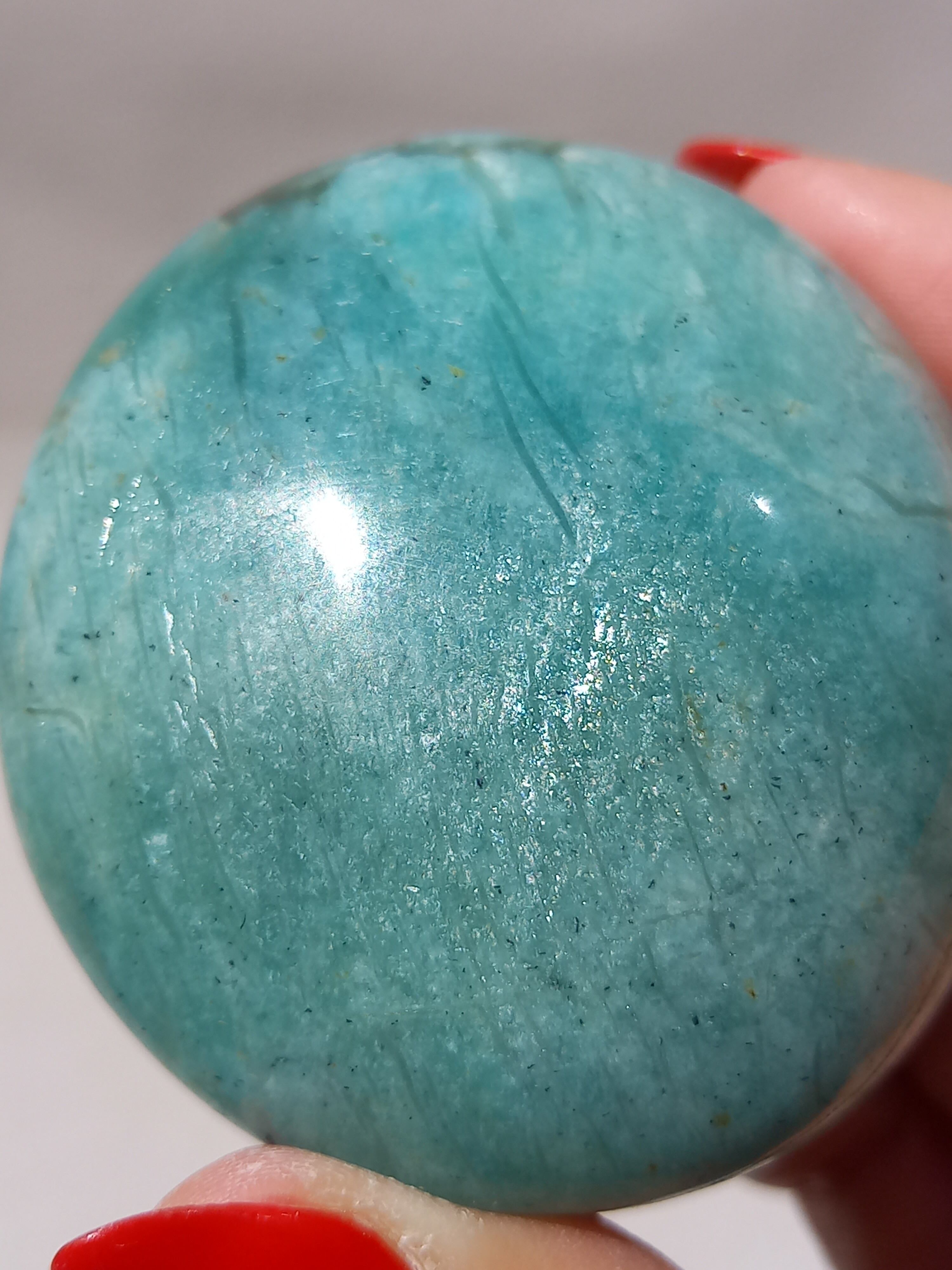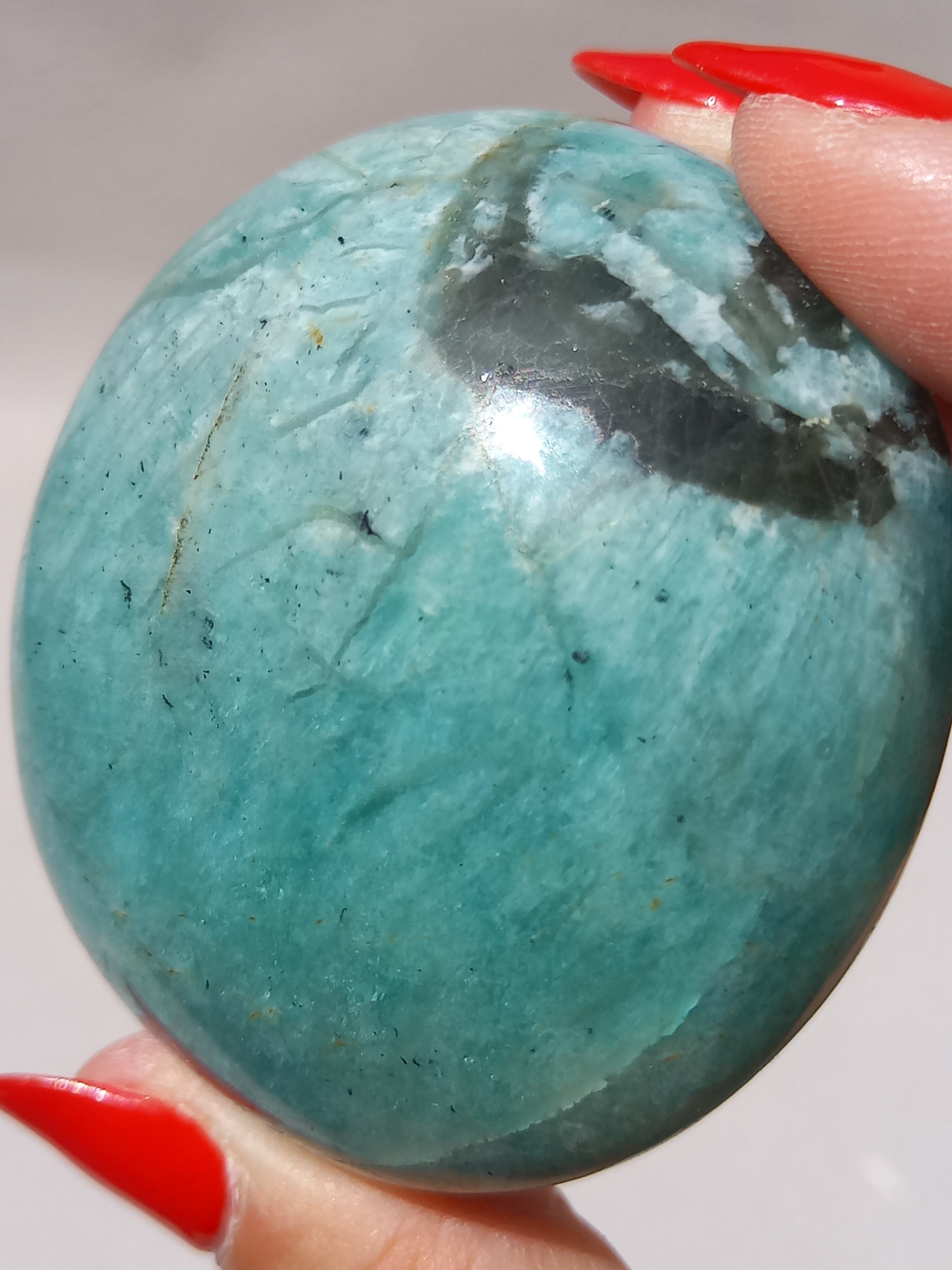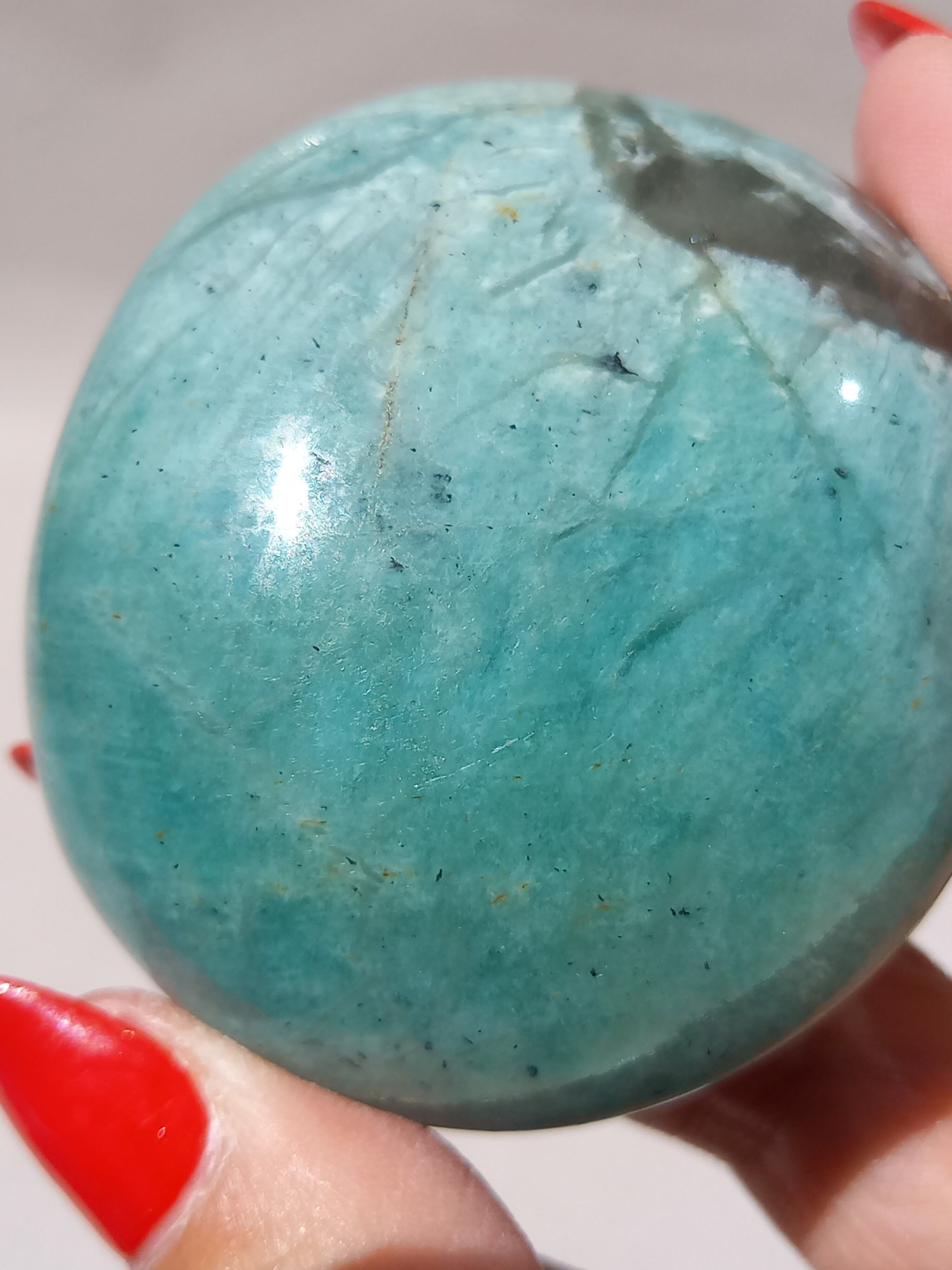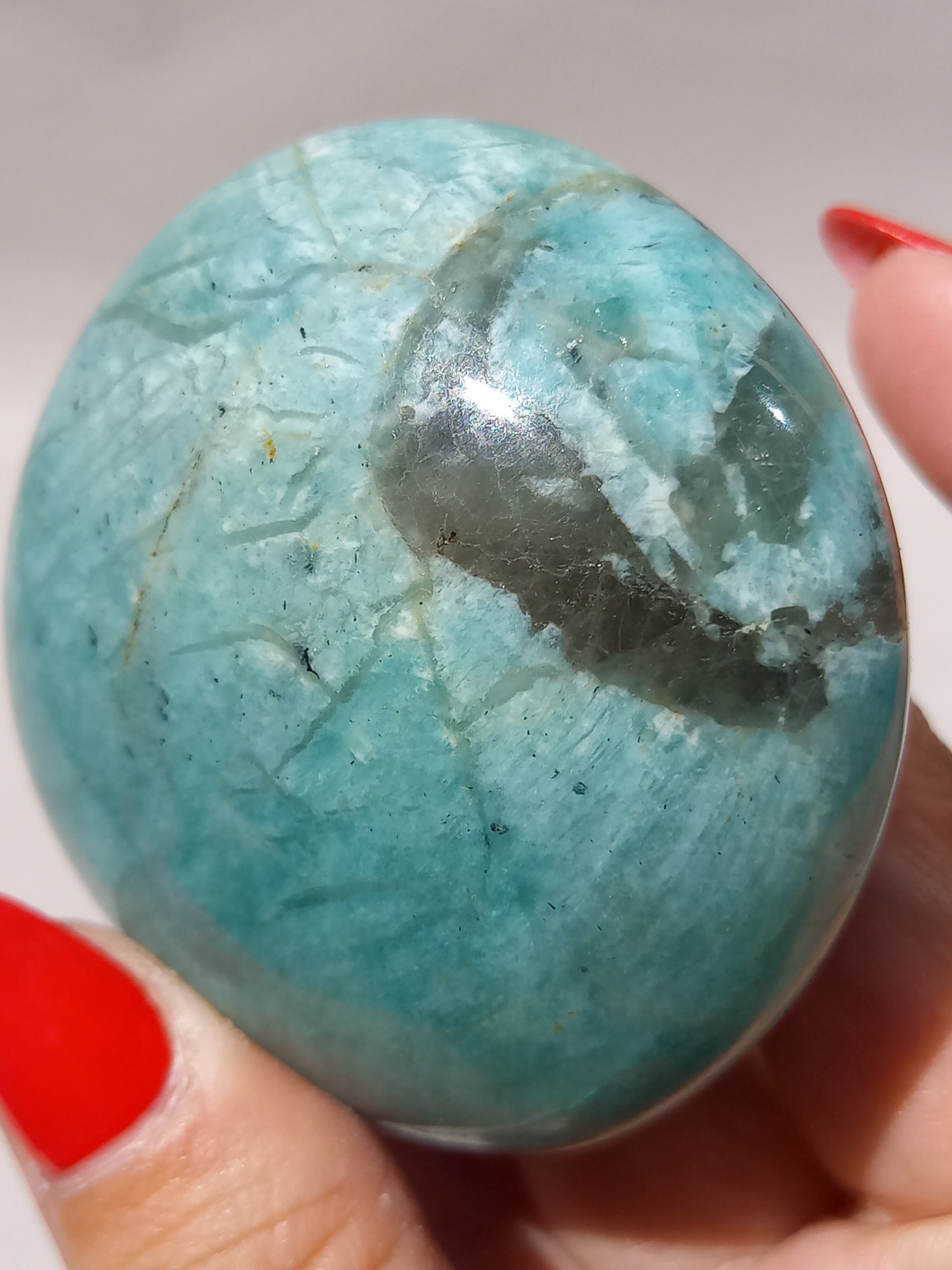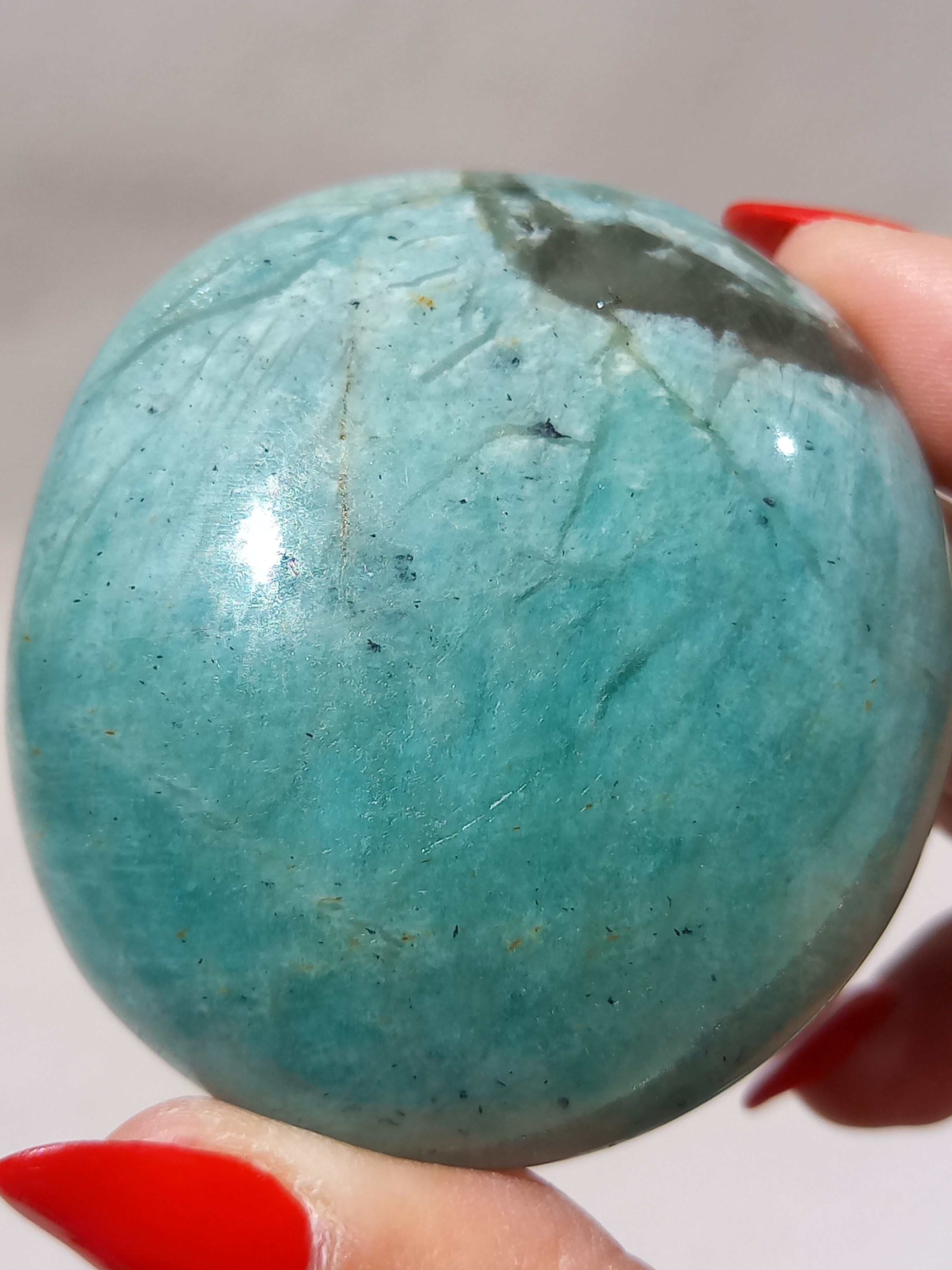 エメラルドグリーンとシラーが美しいアマゾナイトのパームです。