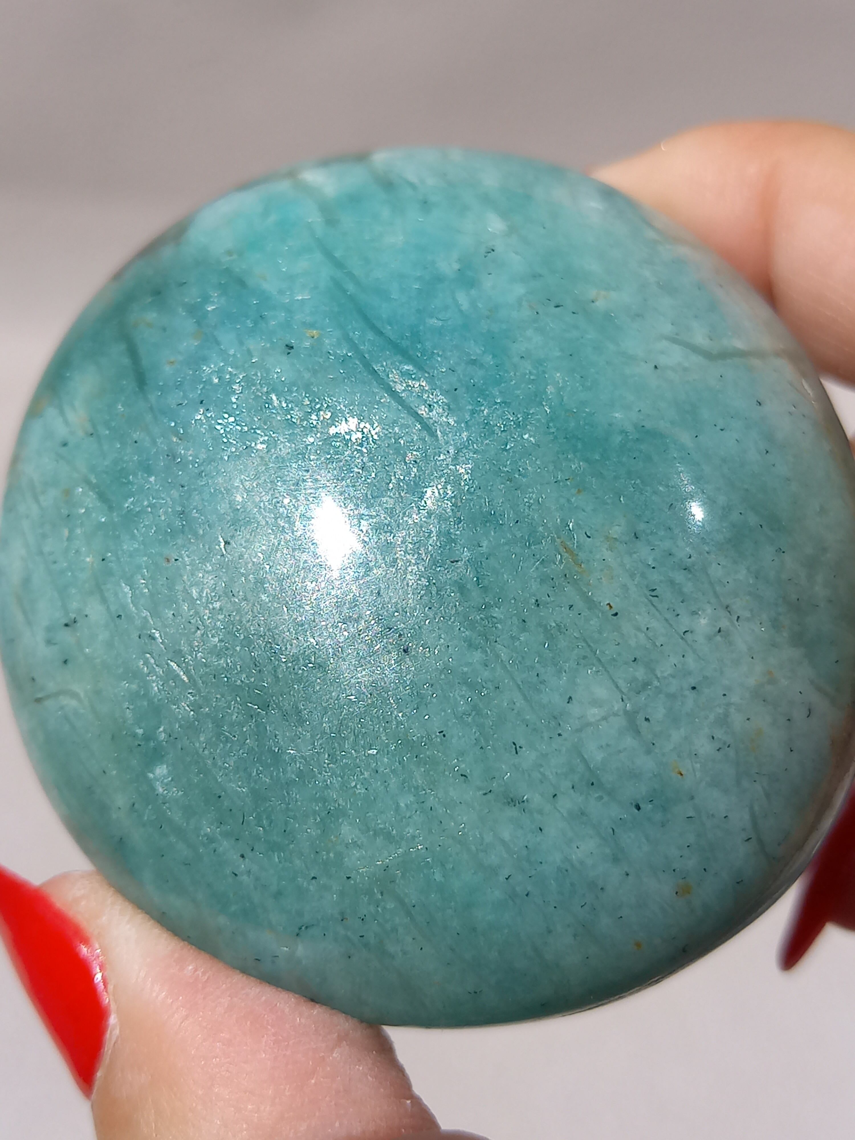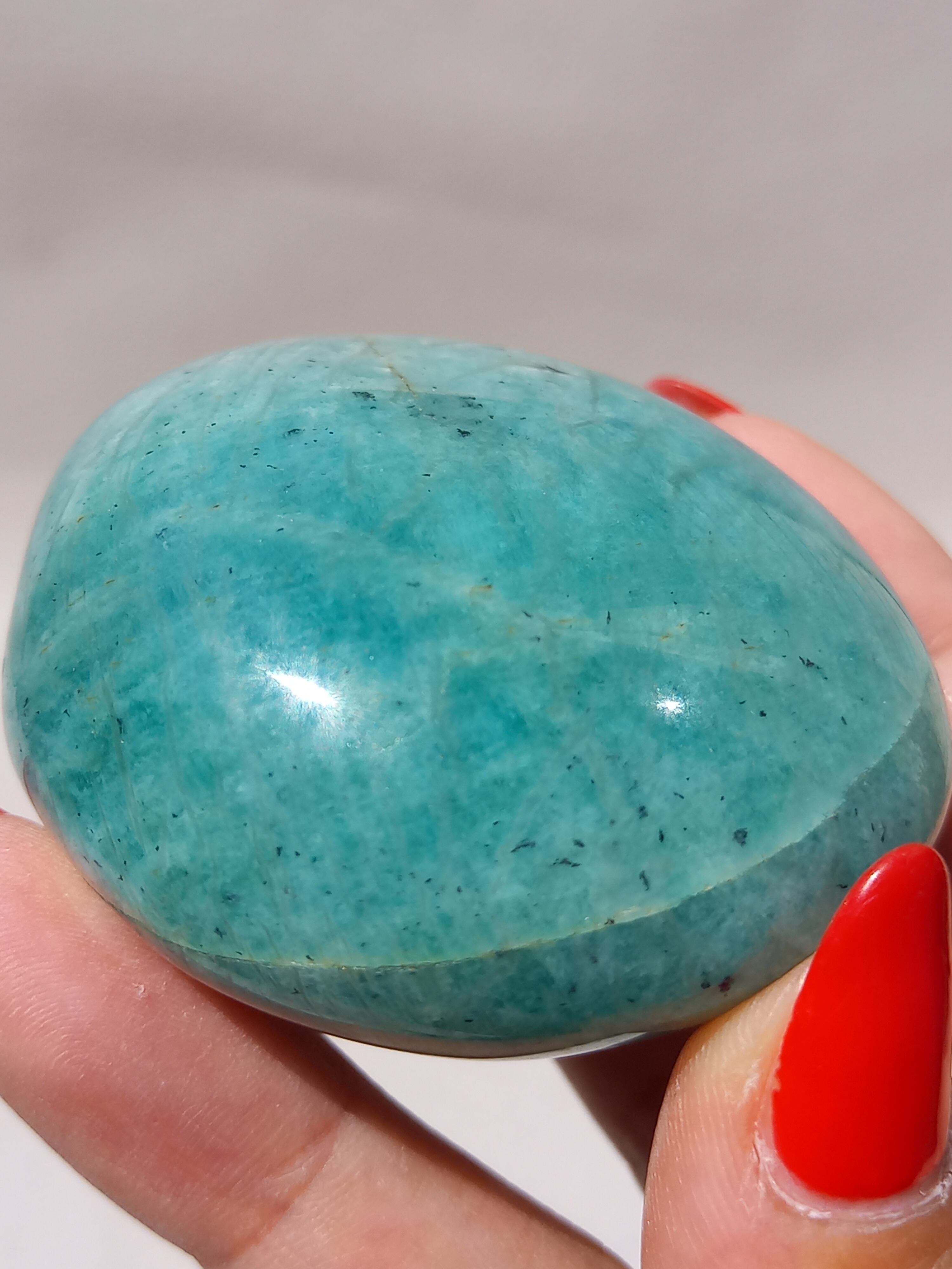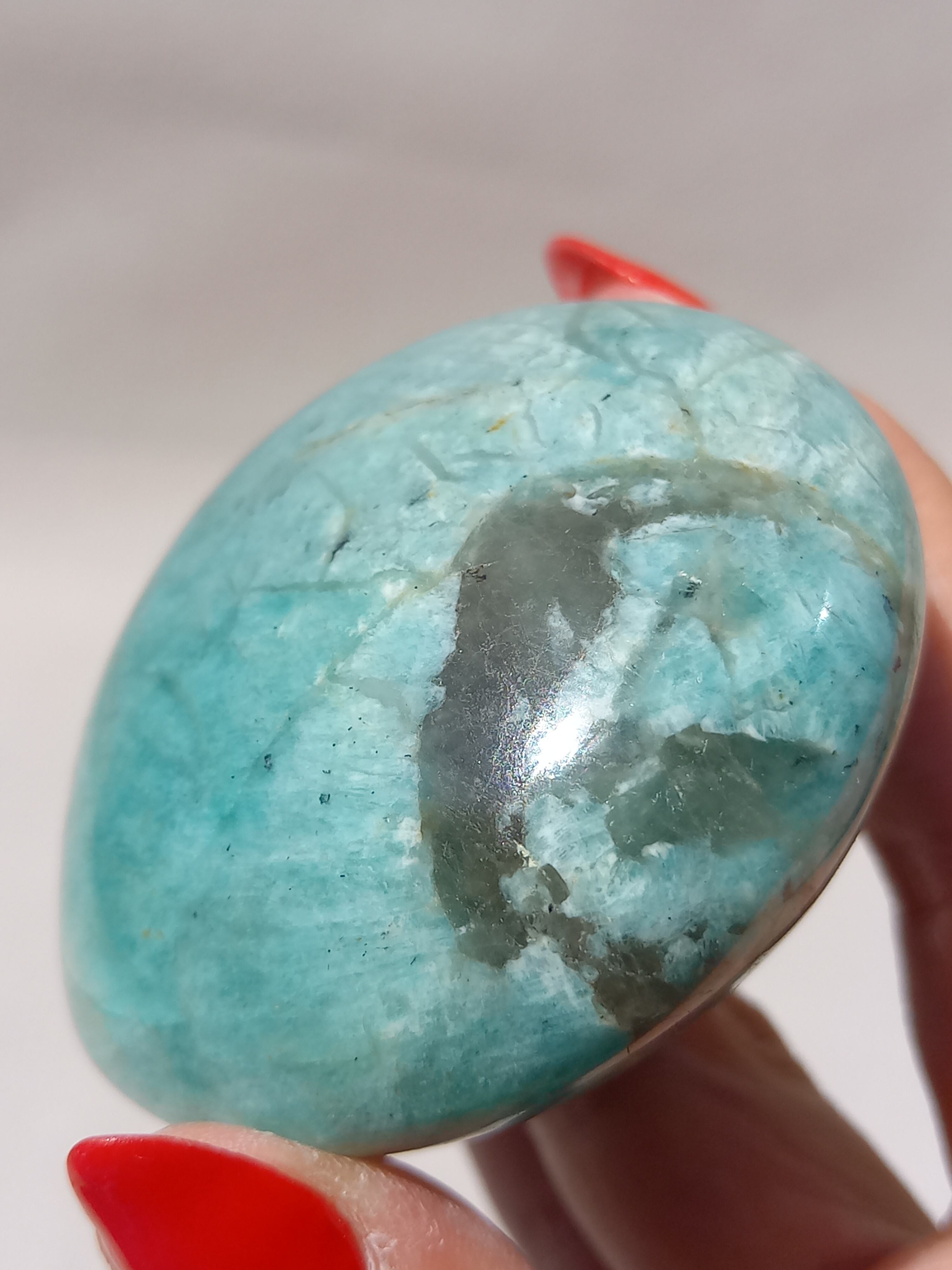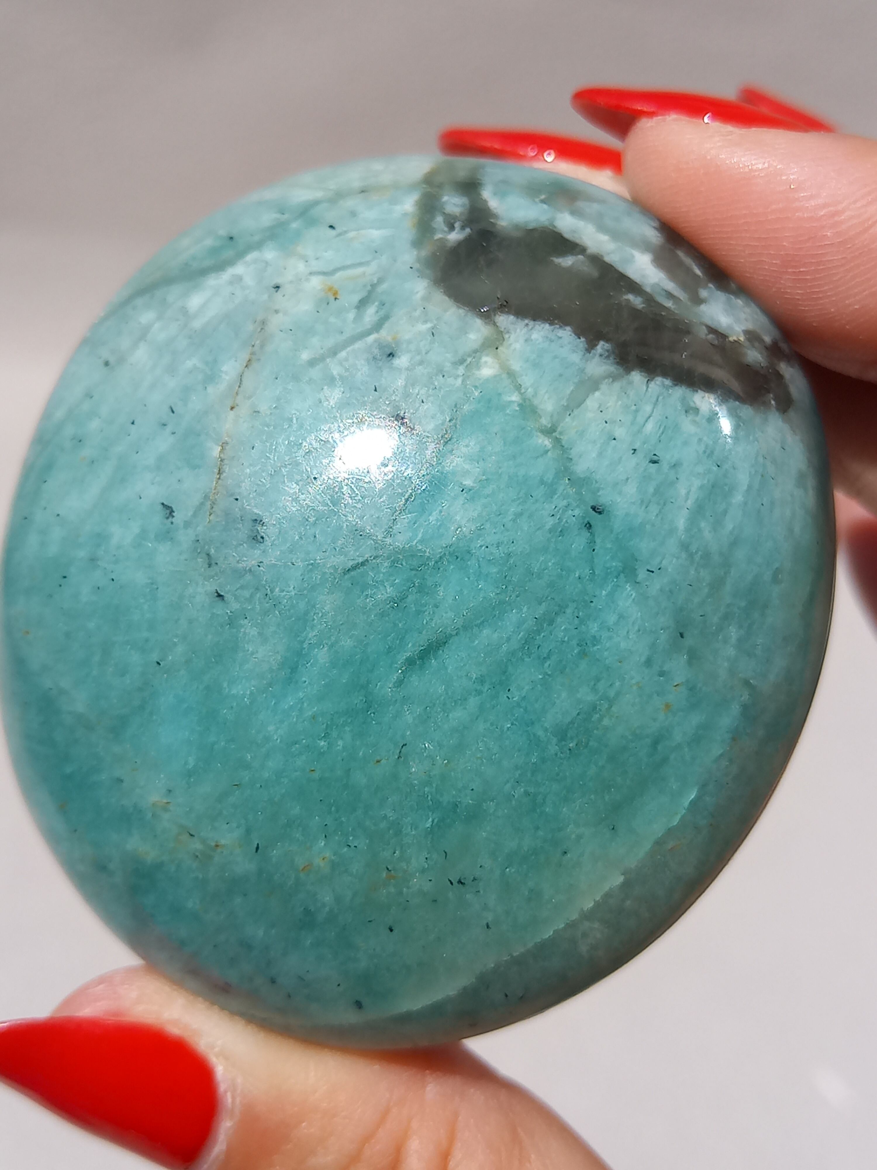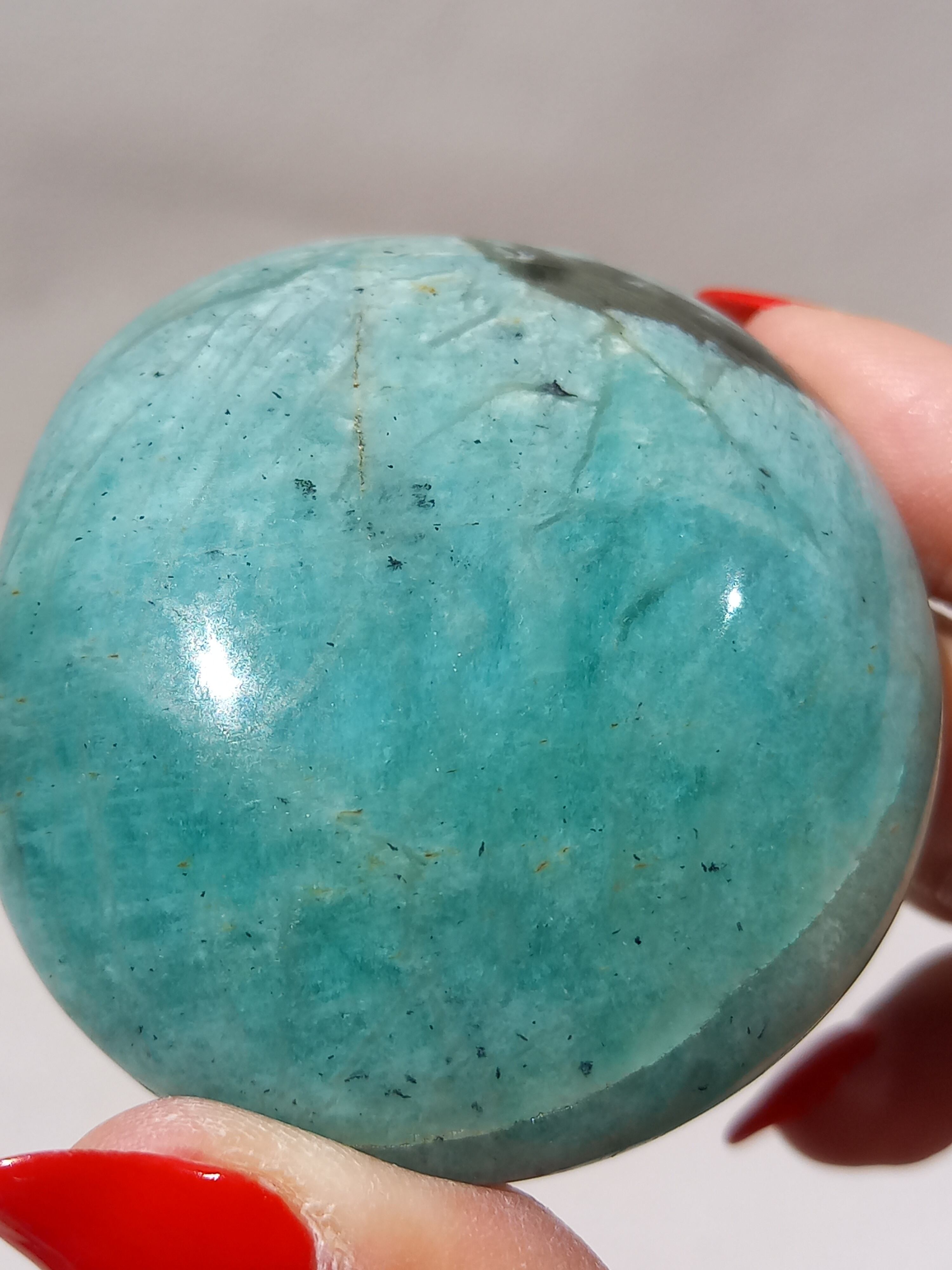 エメラルドグリーンとシラーが美しいアマゾナイトのパームです。