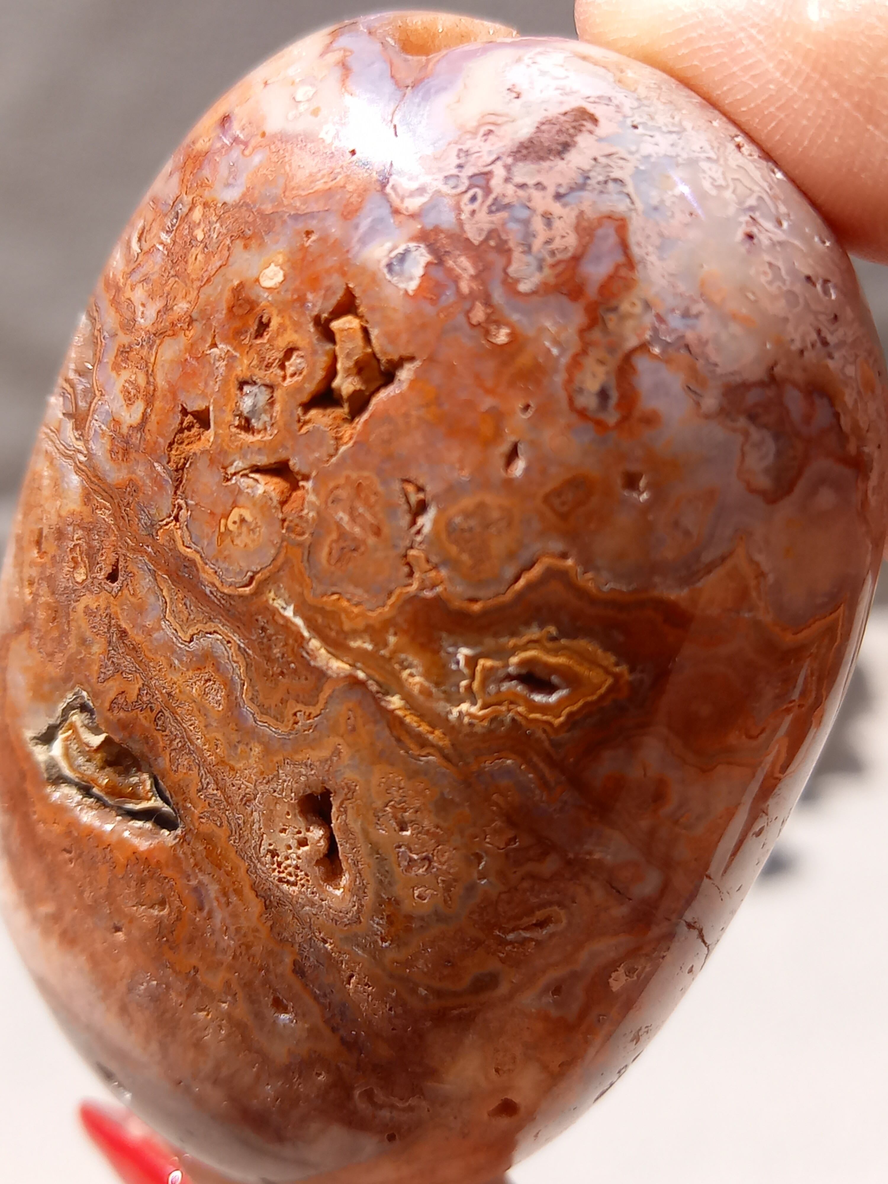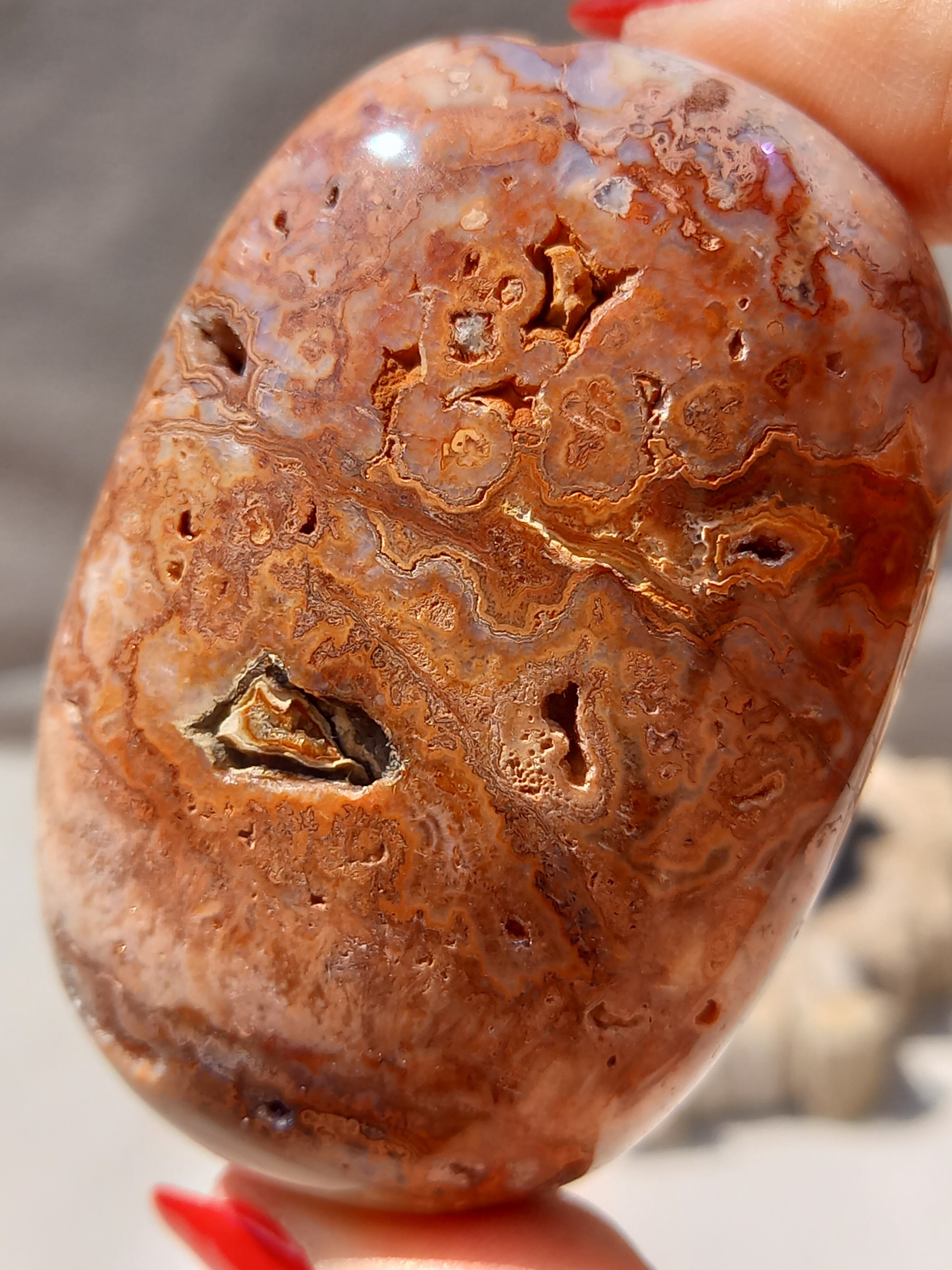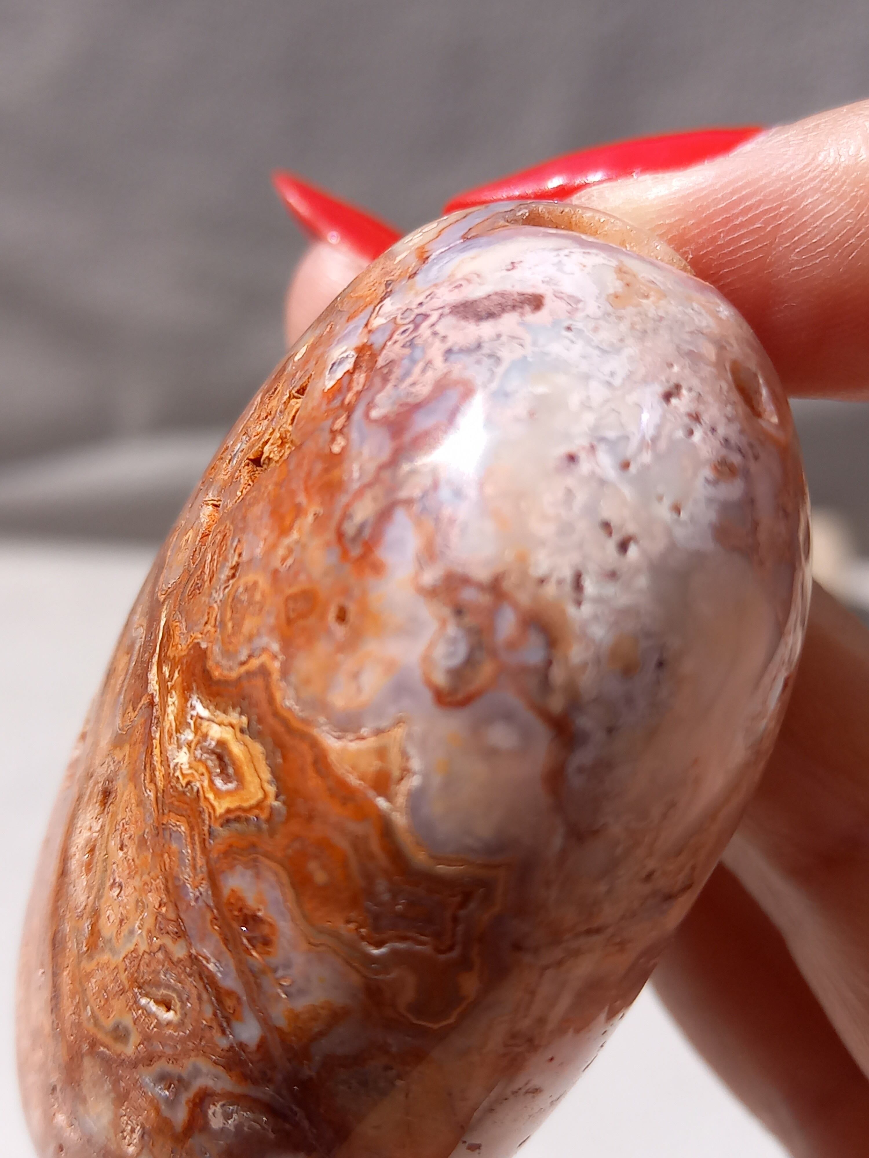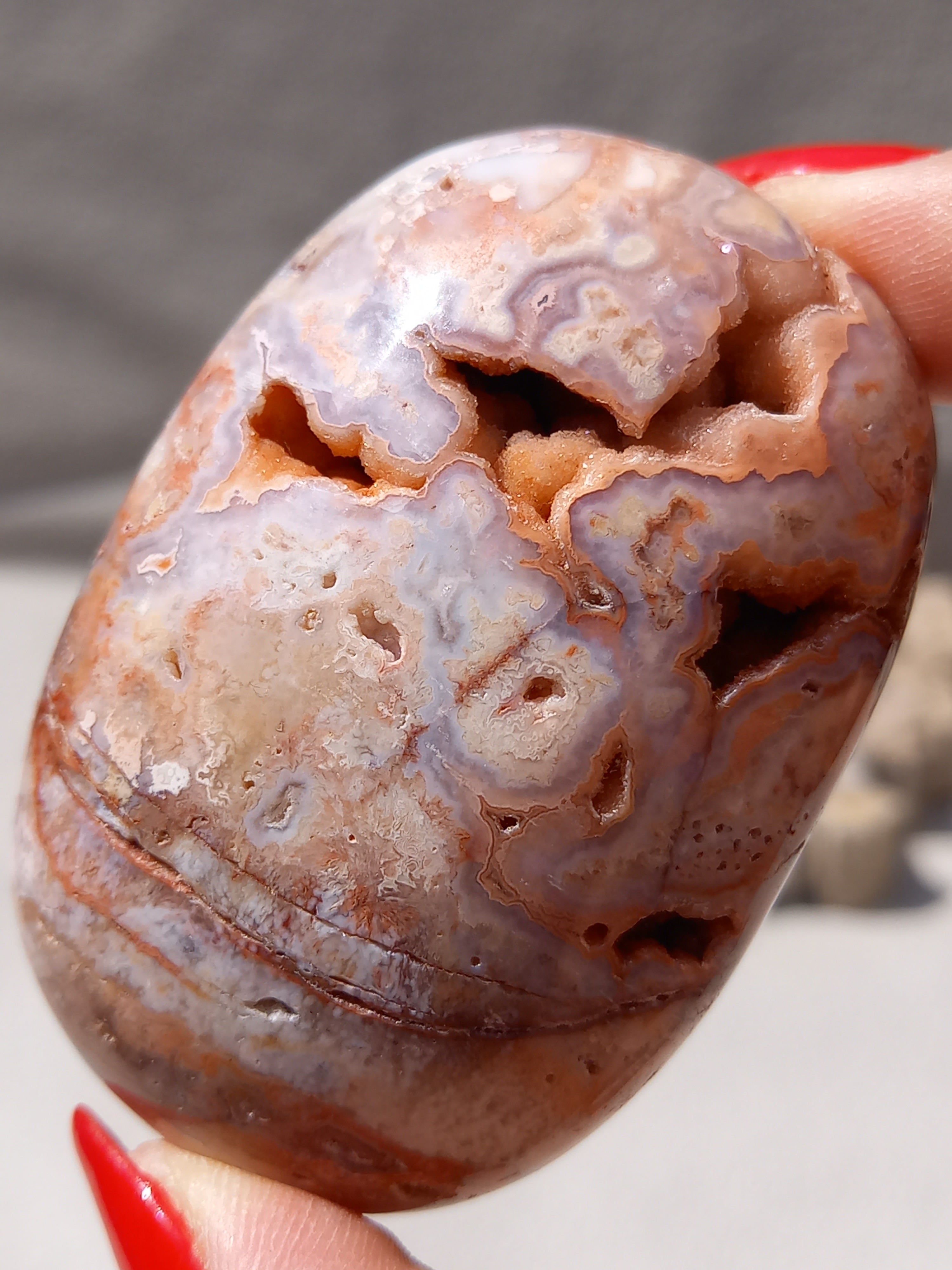 クレイジーレースアゲートは、ヒーリングストーンの一つで、幾層にも重なった模様から発せられる些細な波動が心身にやさしく働きかけ、持ち主の精神的な痛みを和らげ、感情的な負担を解放してくれるといわれています。 クレイジーレースアゲートは、強力な守護力があり、旅の守護石とも呼ばれています。