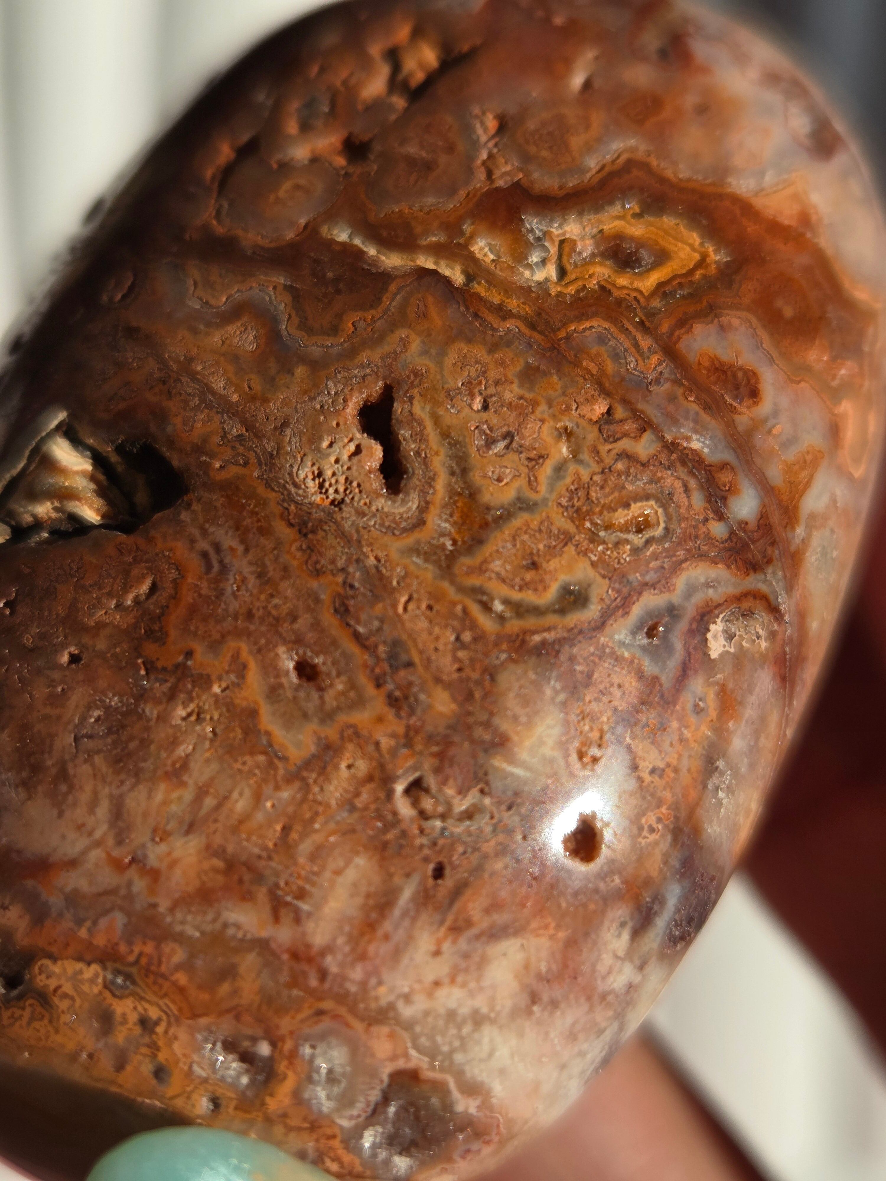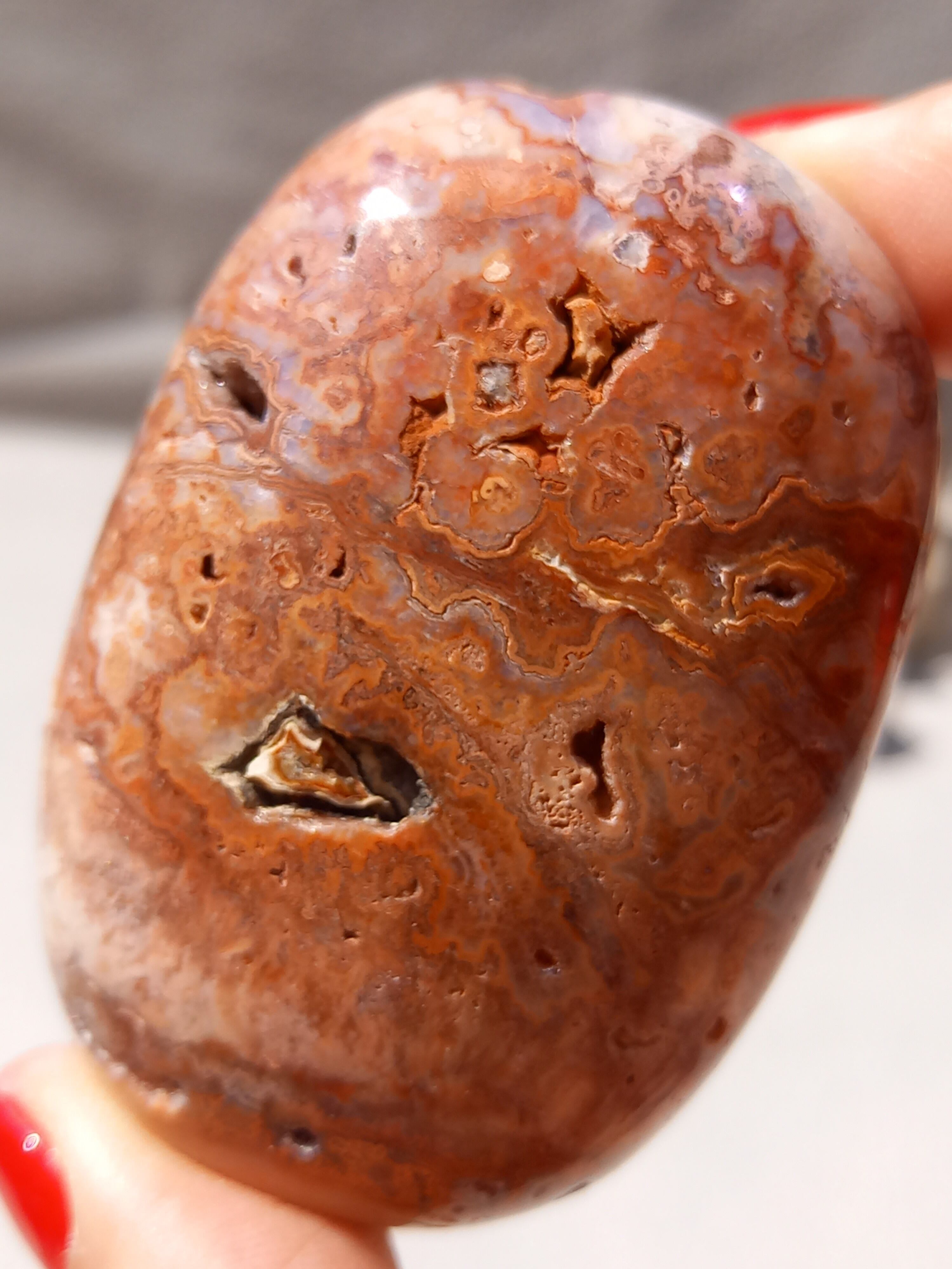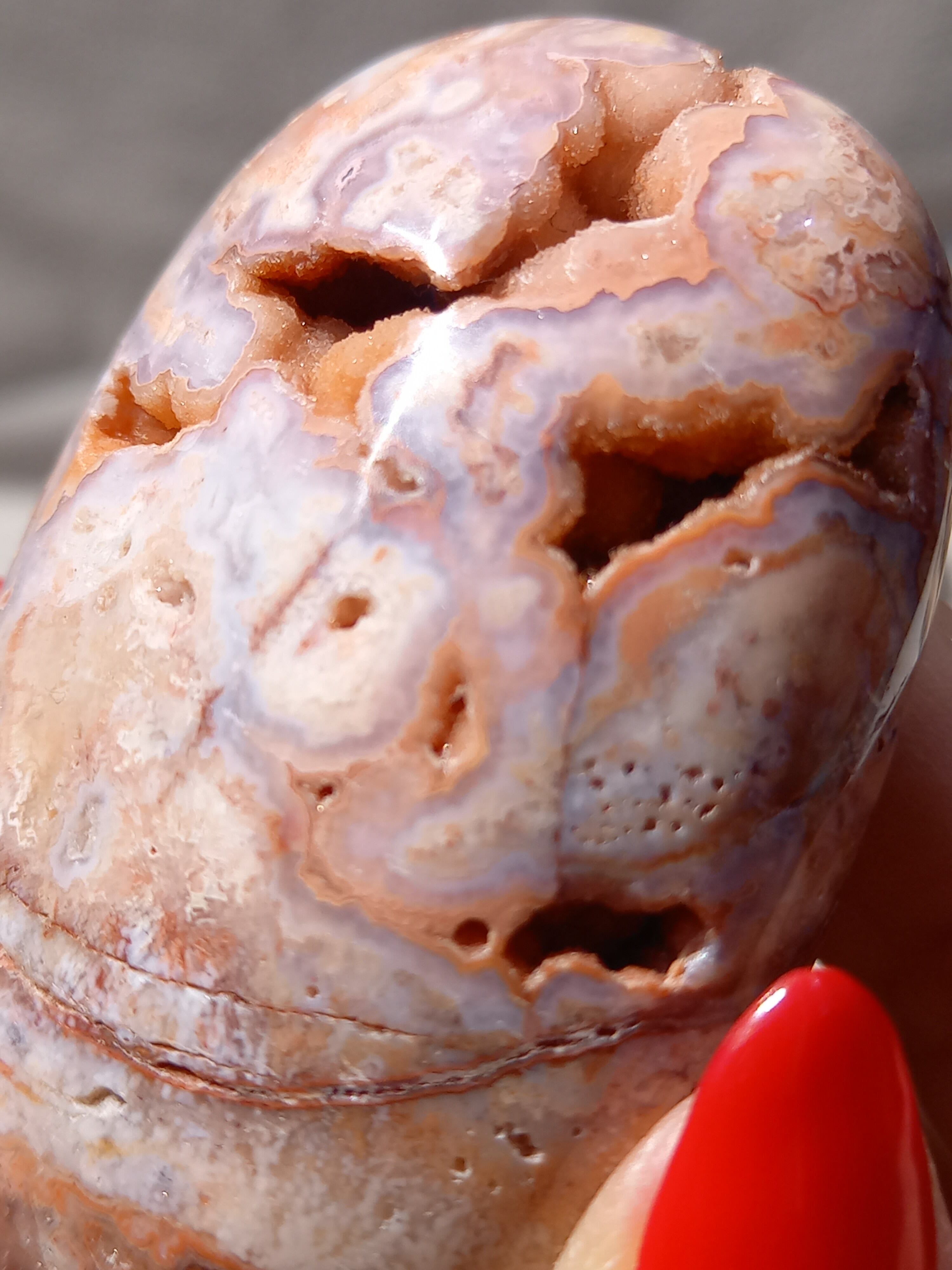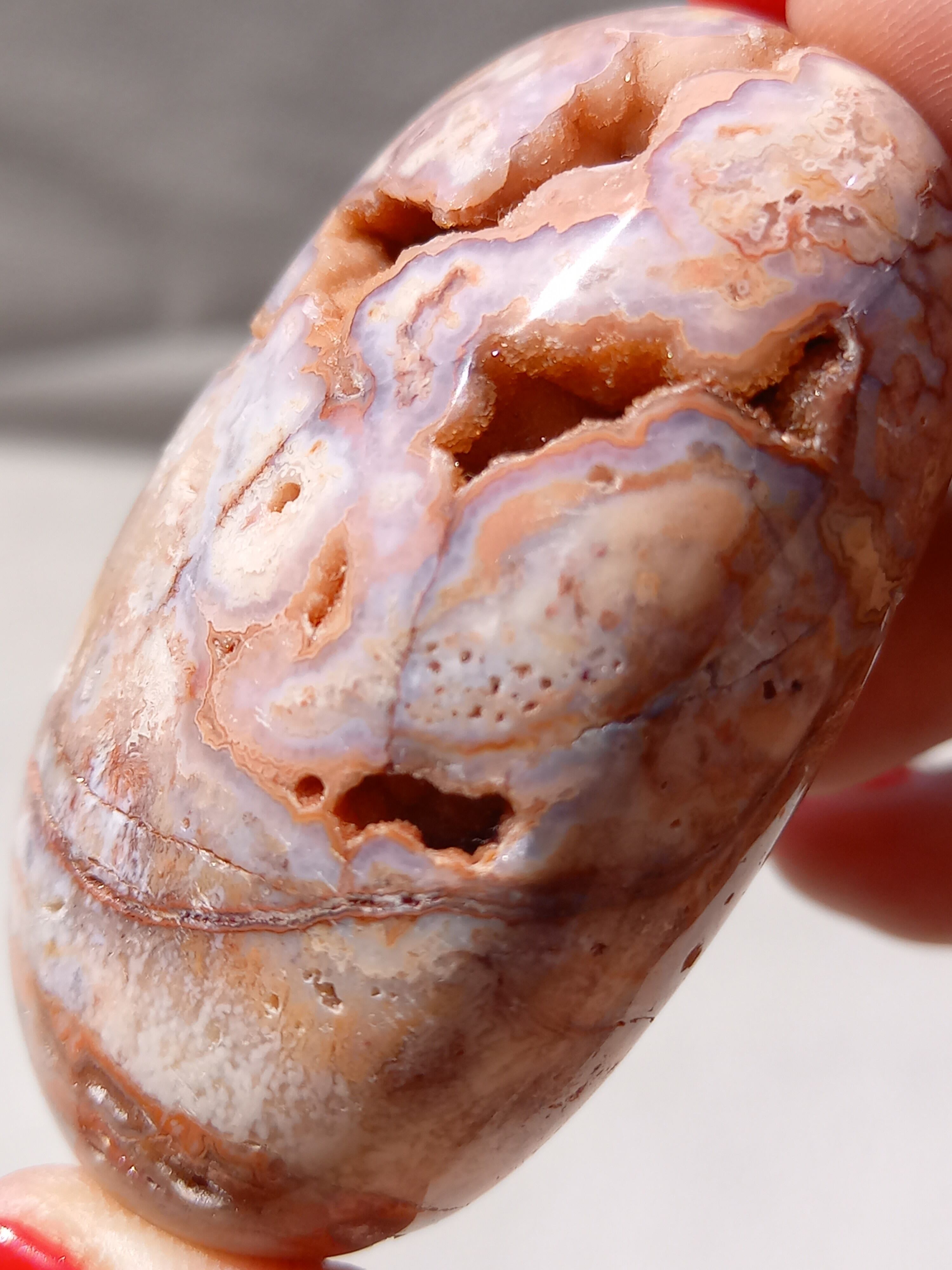 クレイジーレースアゲートは、ヒーリングストーンの一つで、幾層にも重なった模様から発せられる些細な波動が心身にやさしく働きかけ、持ち主の精神的な痛みを和らげ、感情的な負担を解放してくれるといわれています。 クレイジーレースアゲートは、強力な守護力があり、旅の守護石とも呼ばれています。