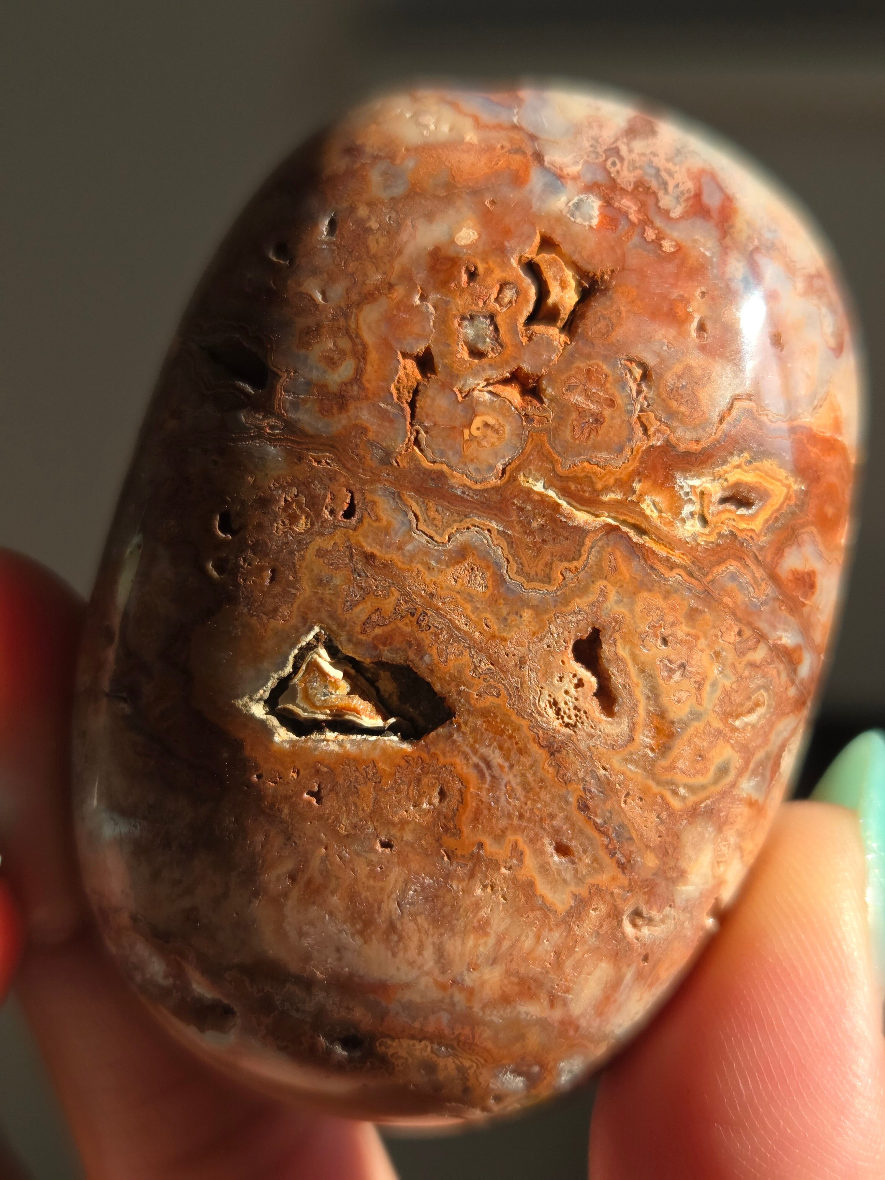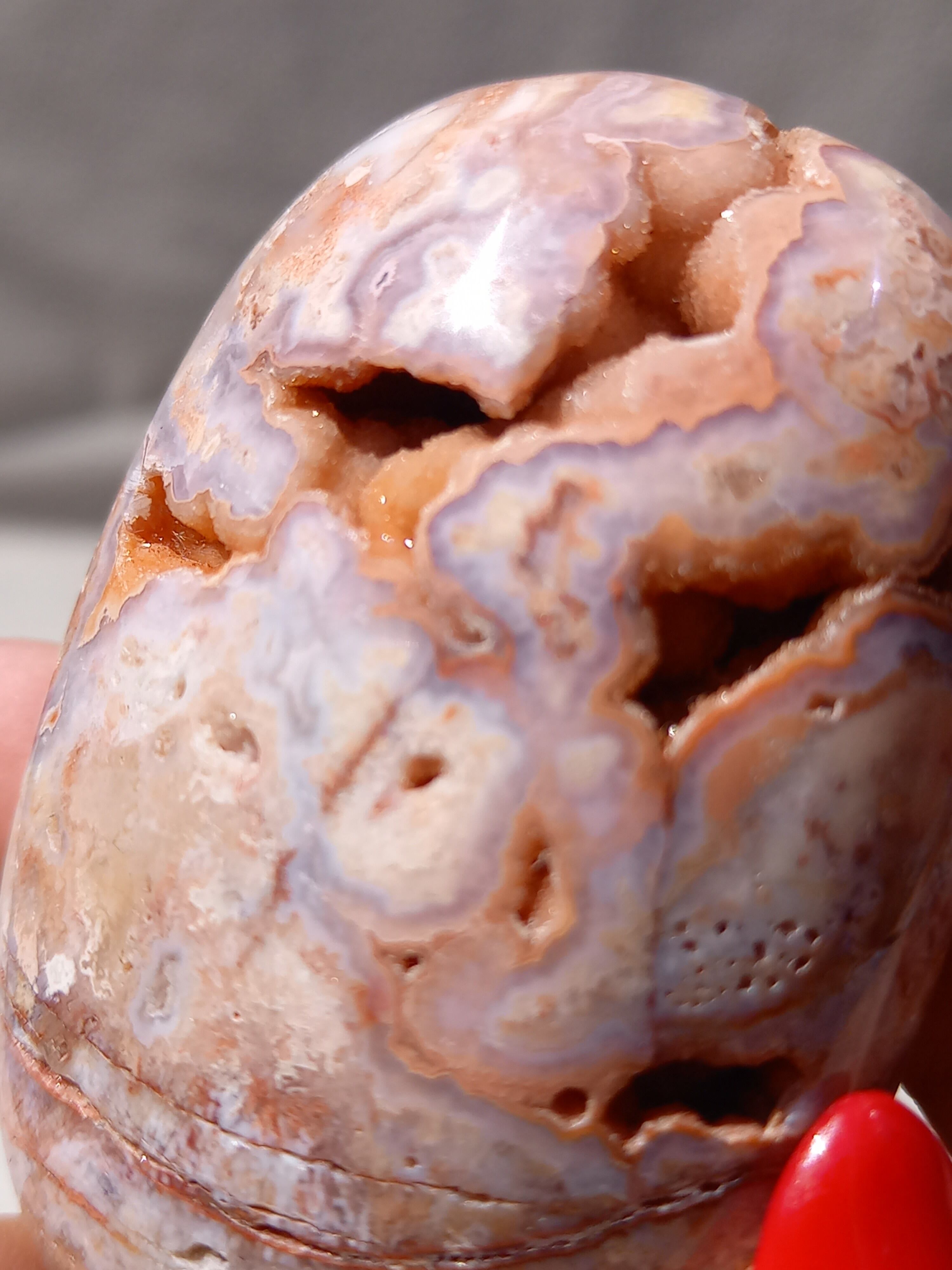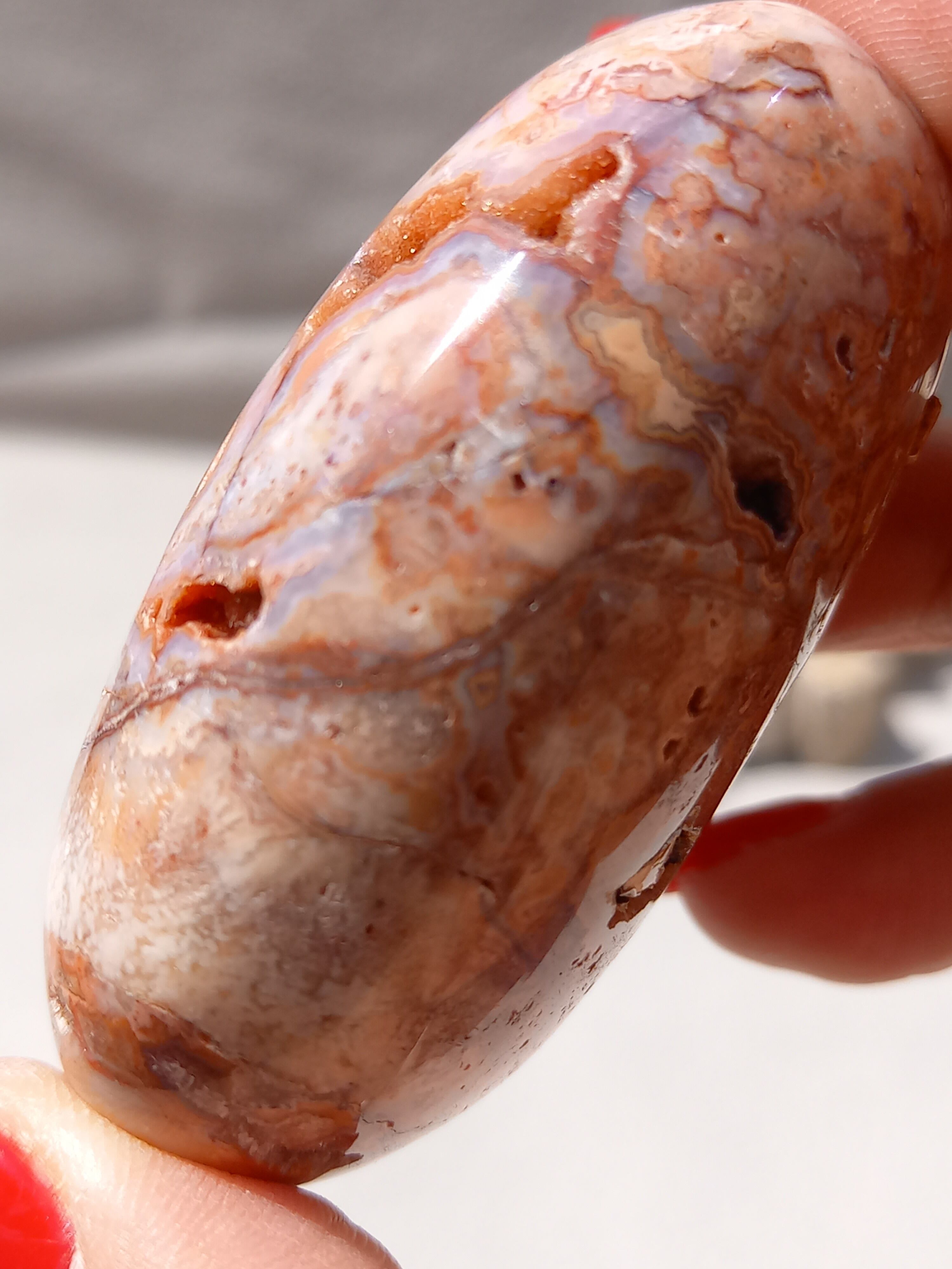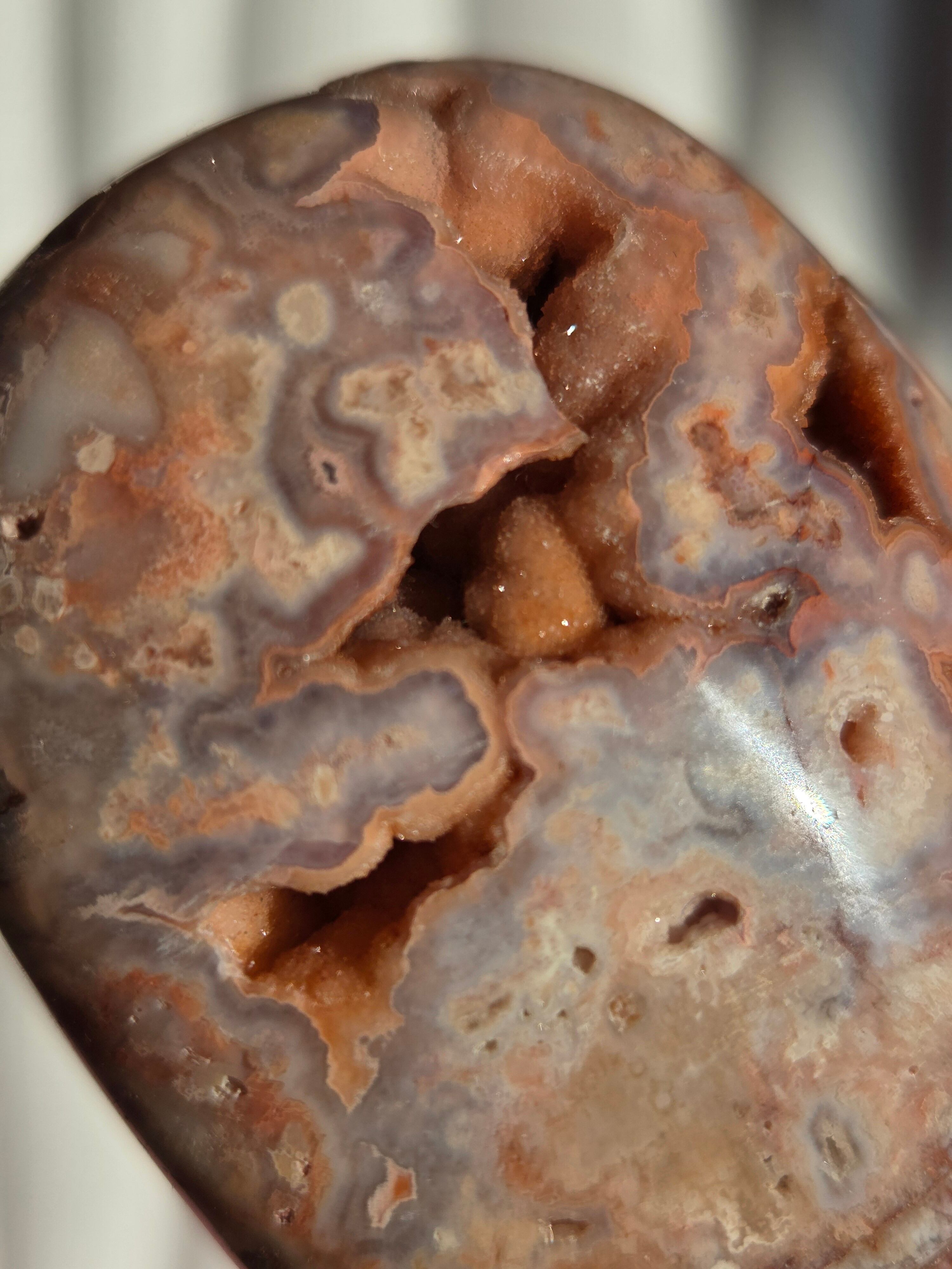 クレイジーレースアゲートは、ヒーリングストーンの一つで、幾層にも重なった模様から発せられる些細な波動が心身にやさしく働きかけ、持ち主の精神的な痛みを和らげ、感情的な負担を解放してくれるといわれています。 クレイジーレースアゲートは、強力な守護力があり、旅の守護石とも呼ばれています。