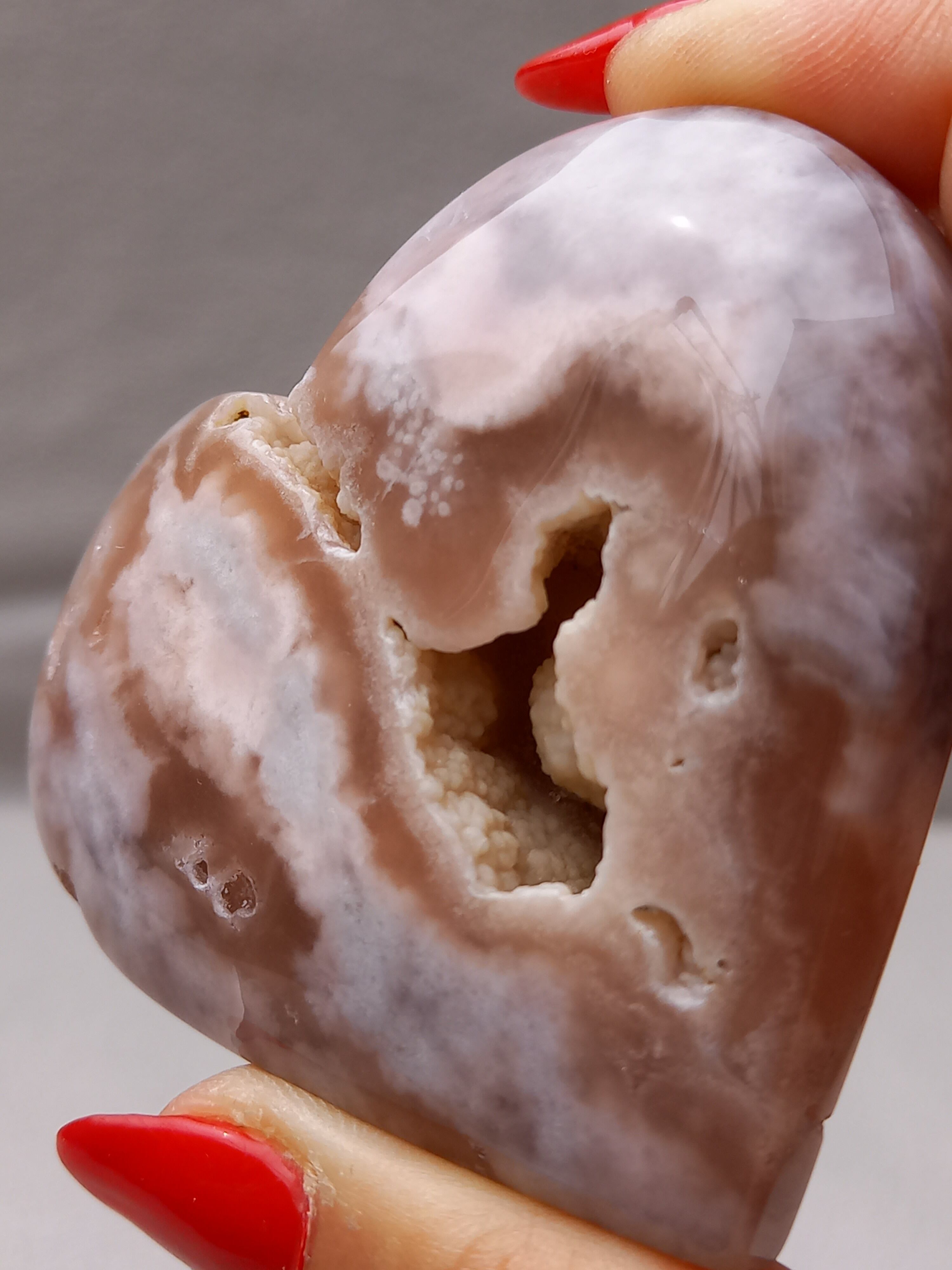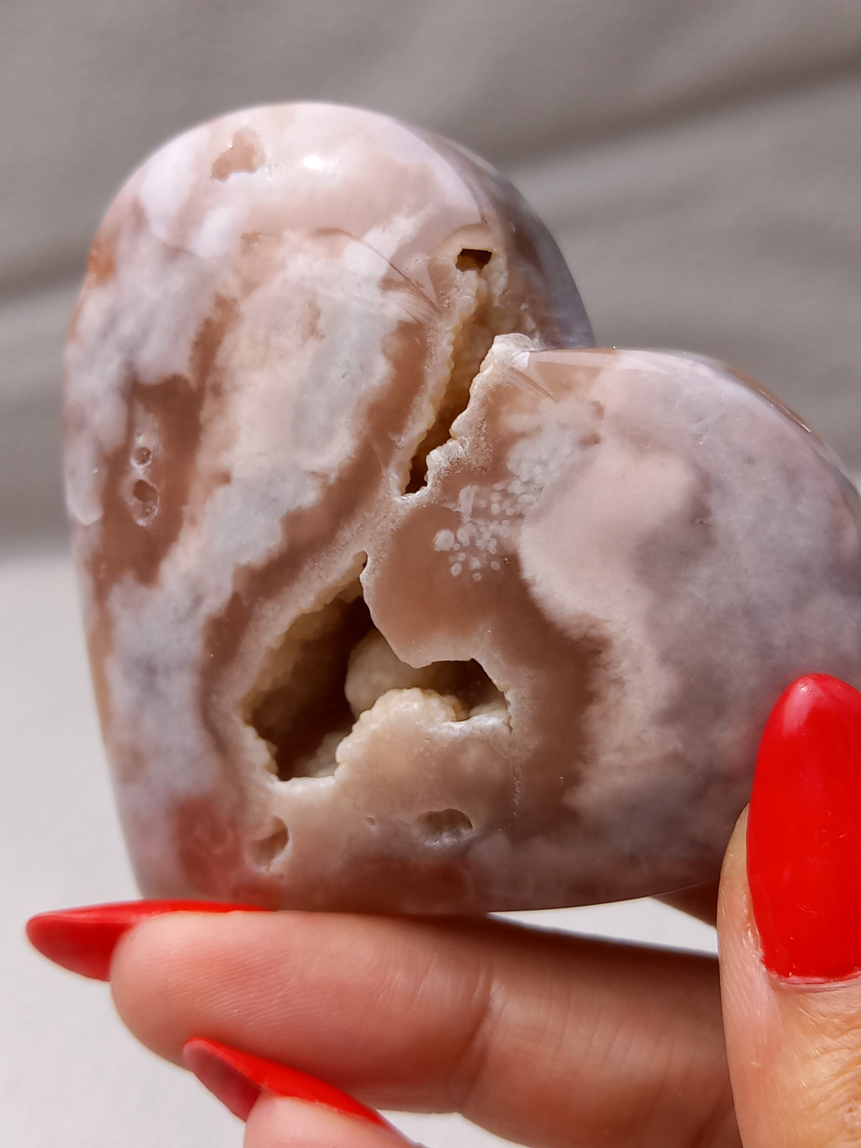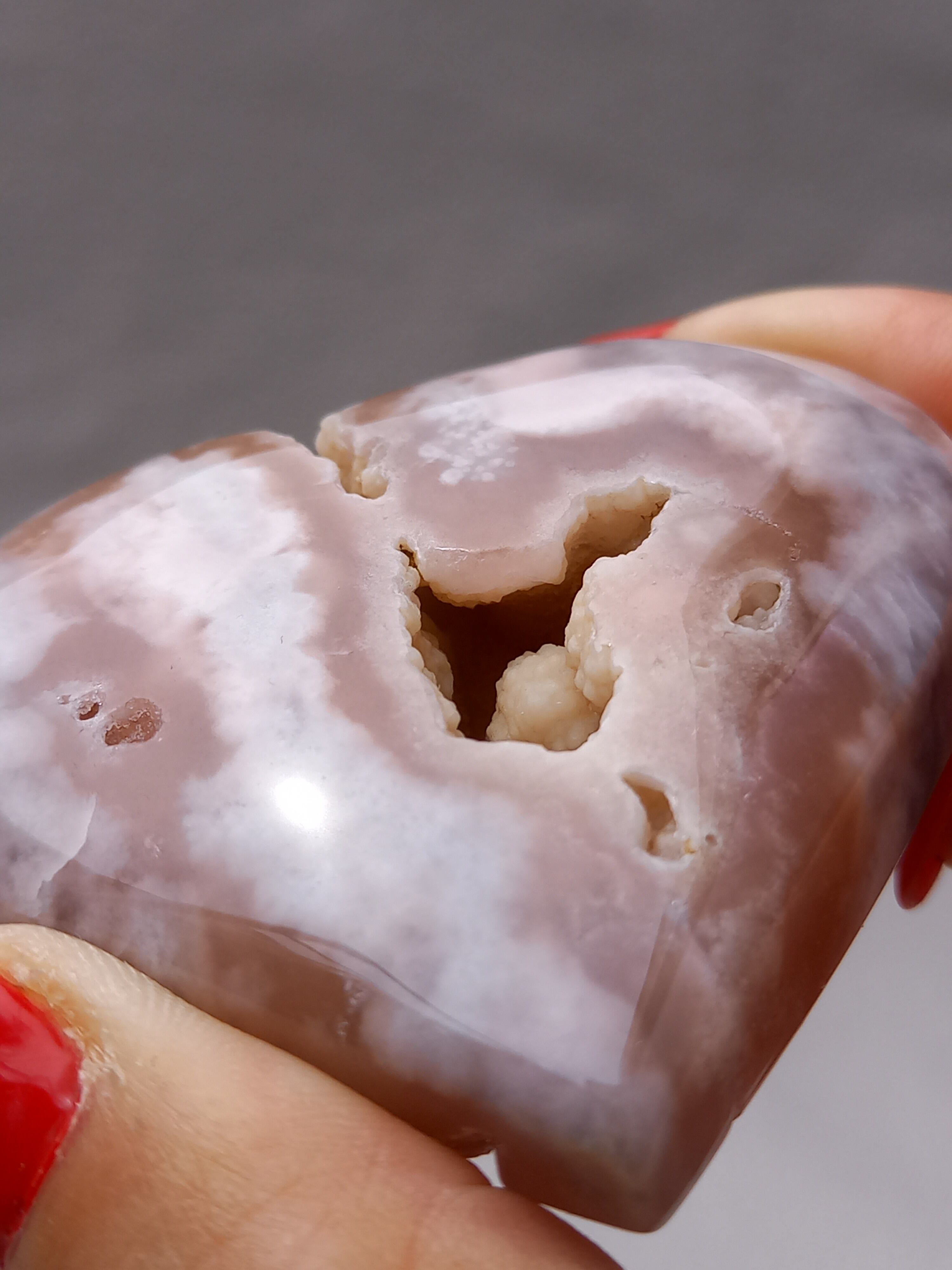 ジオード部分から見えるモコモコ結晶と、ザクザク結晶の2種類が見られる子です。