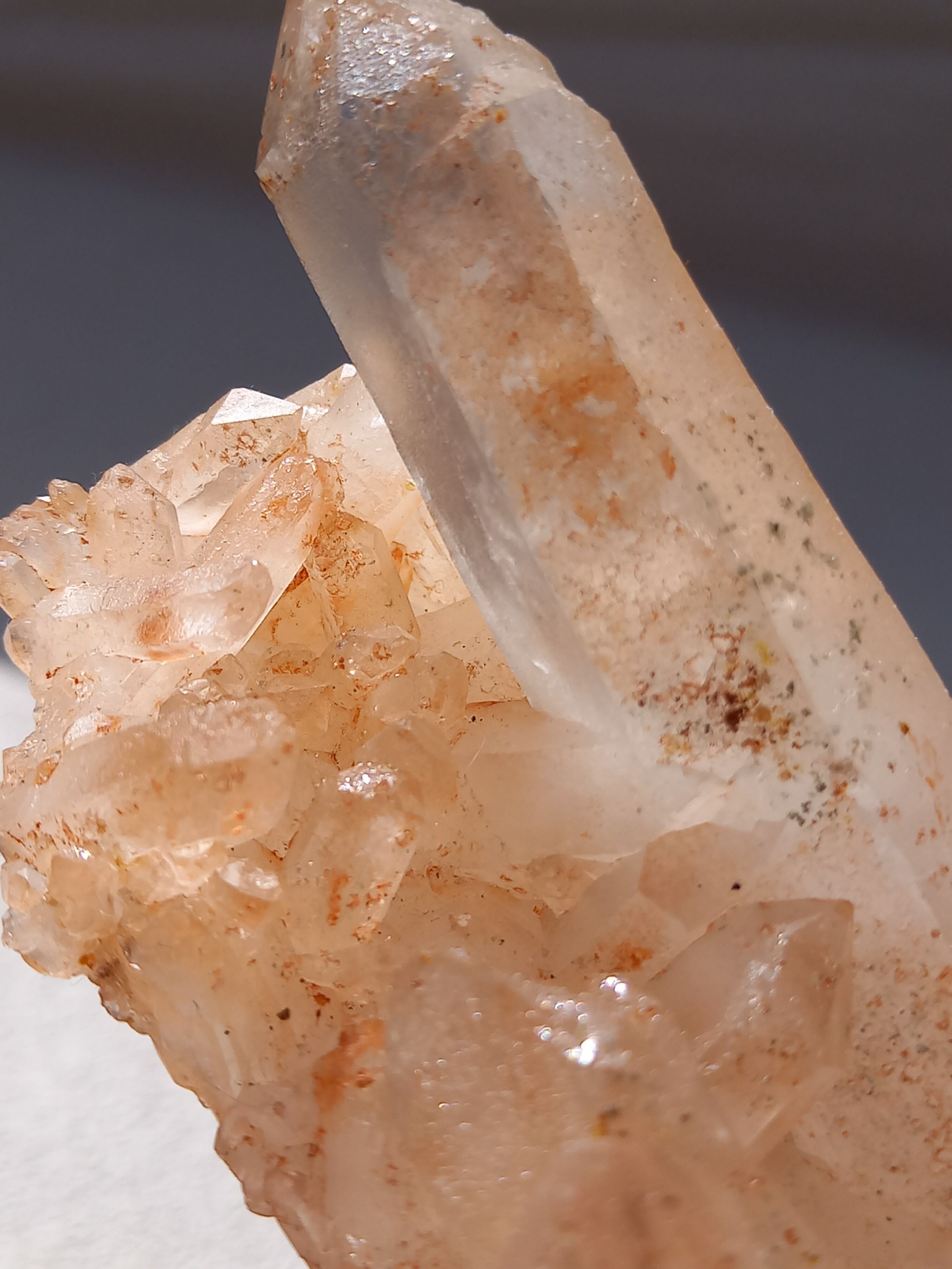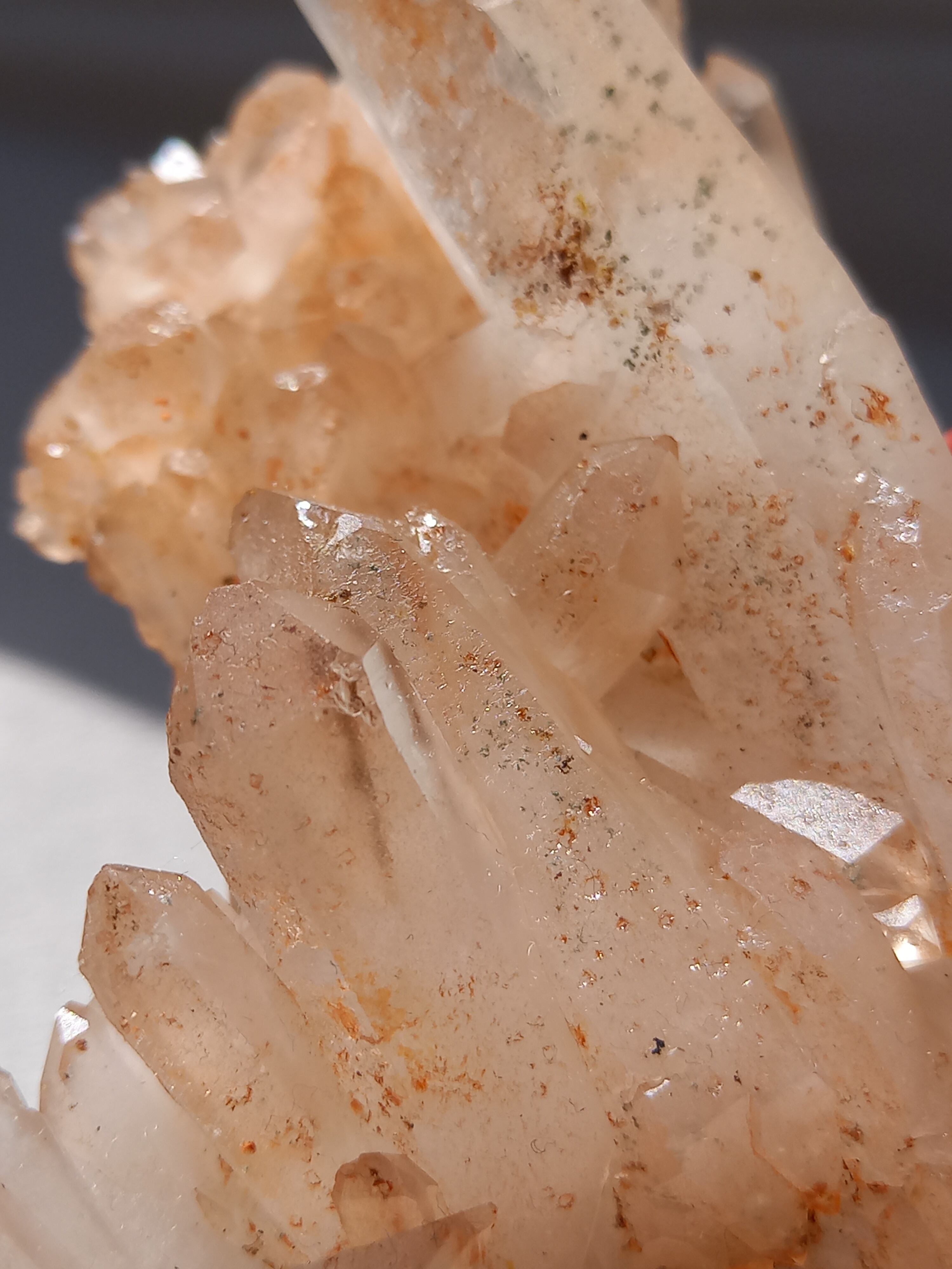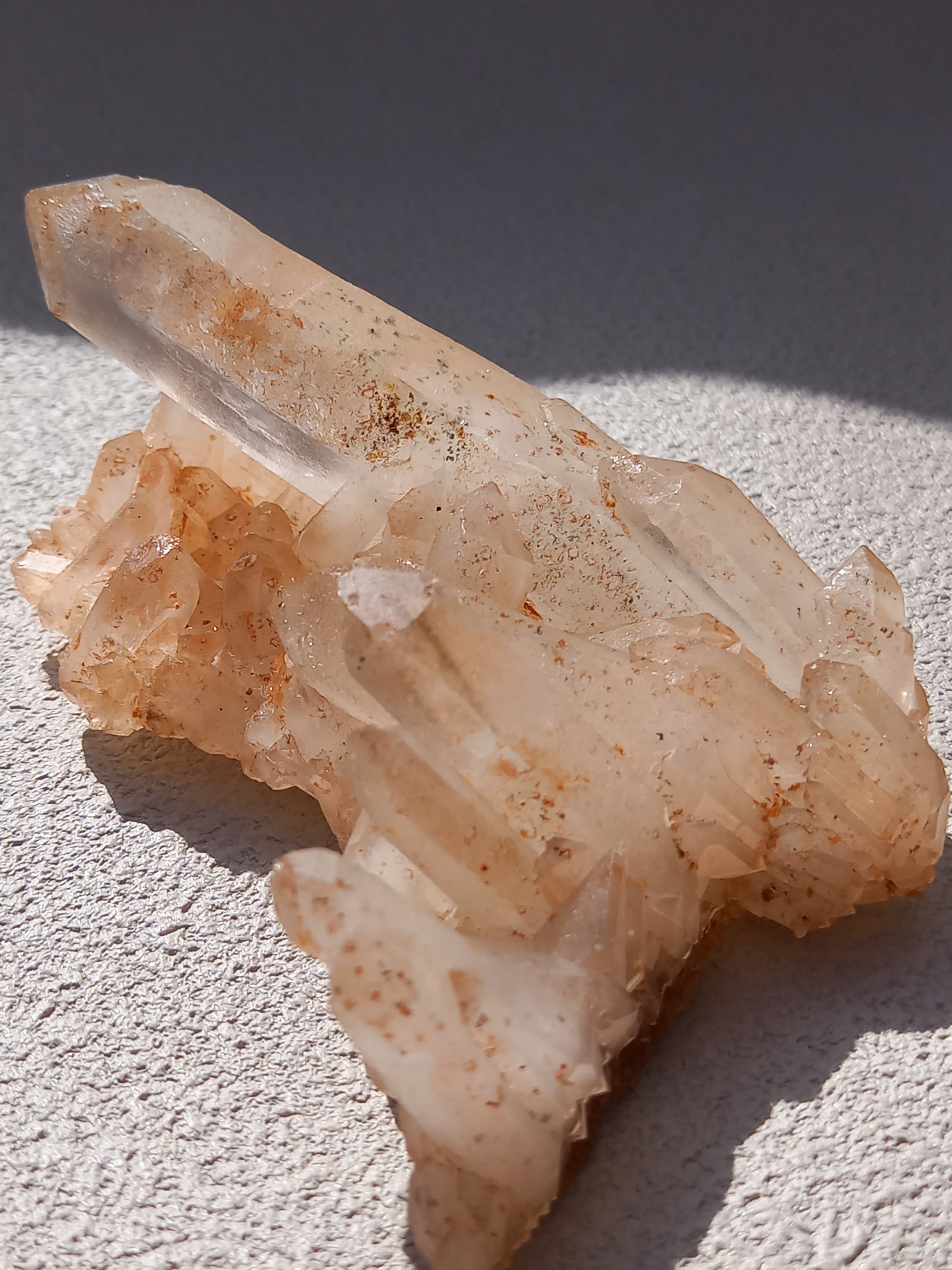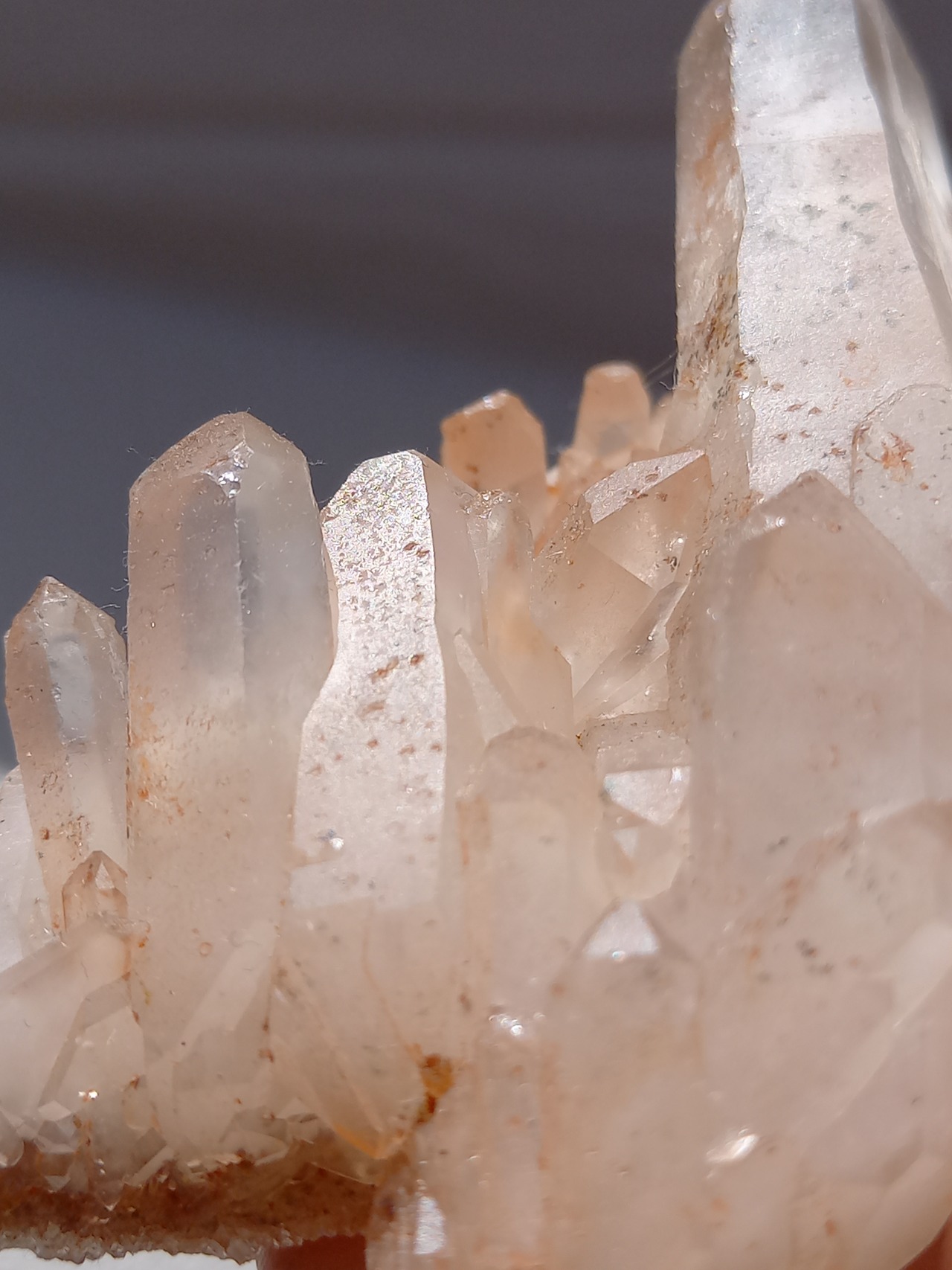 土壌に含まれる赤褐色をした酸化鉄により表面や母岩部がピンク色をしたものがよく見られます。この子は、ピンクオレンジのようなカラーに染まった子です。
