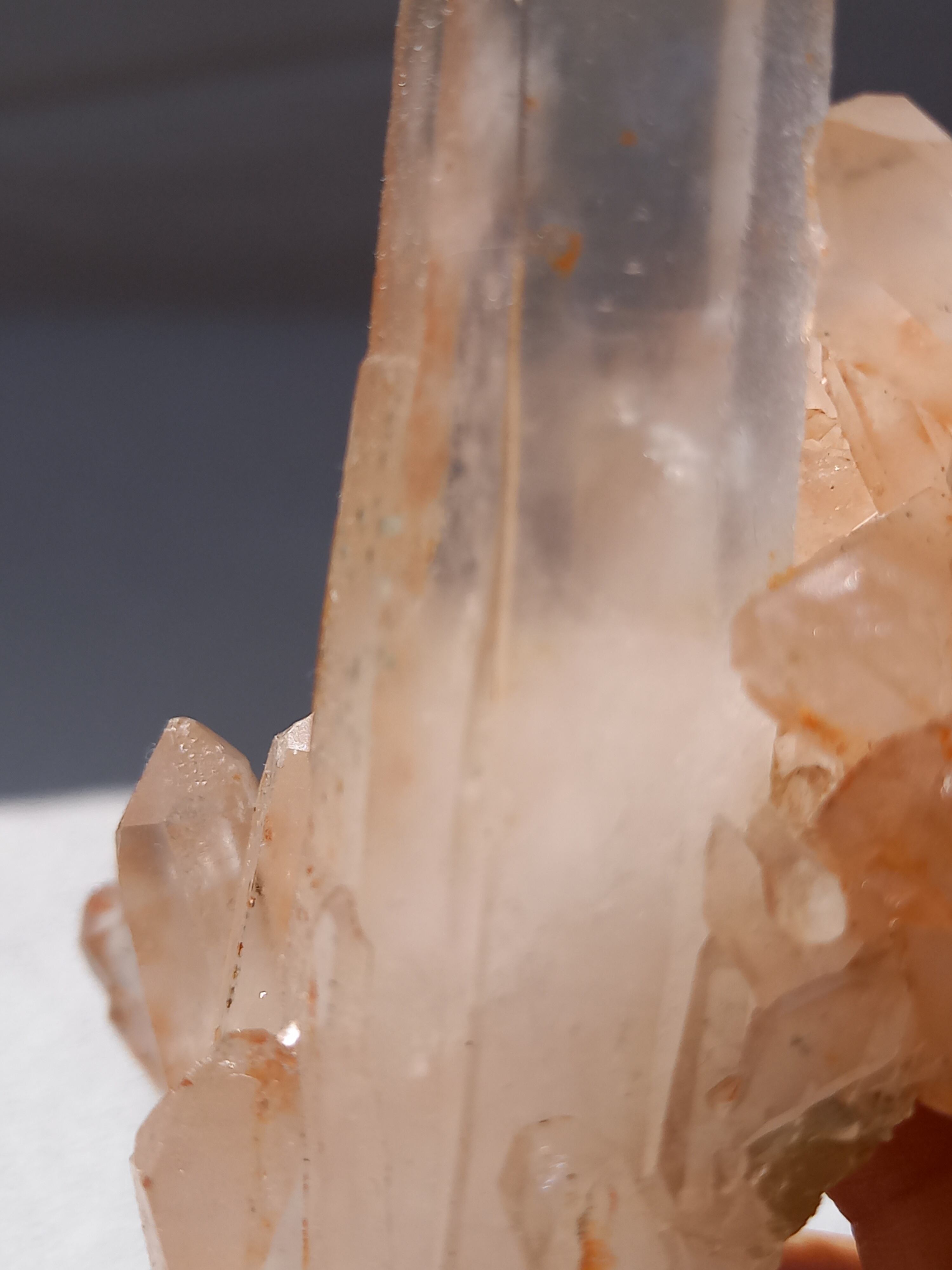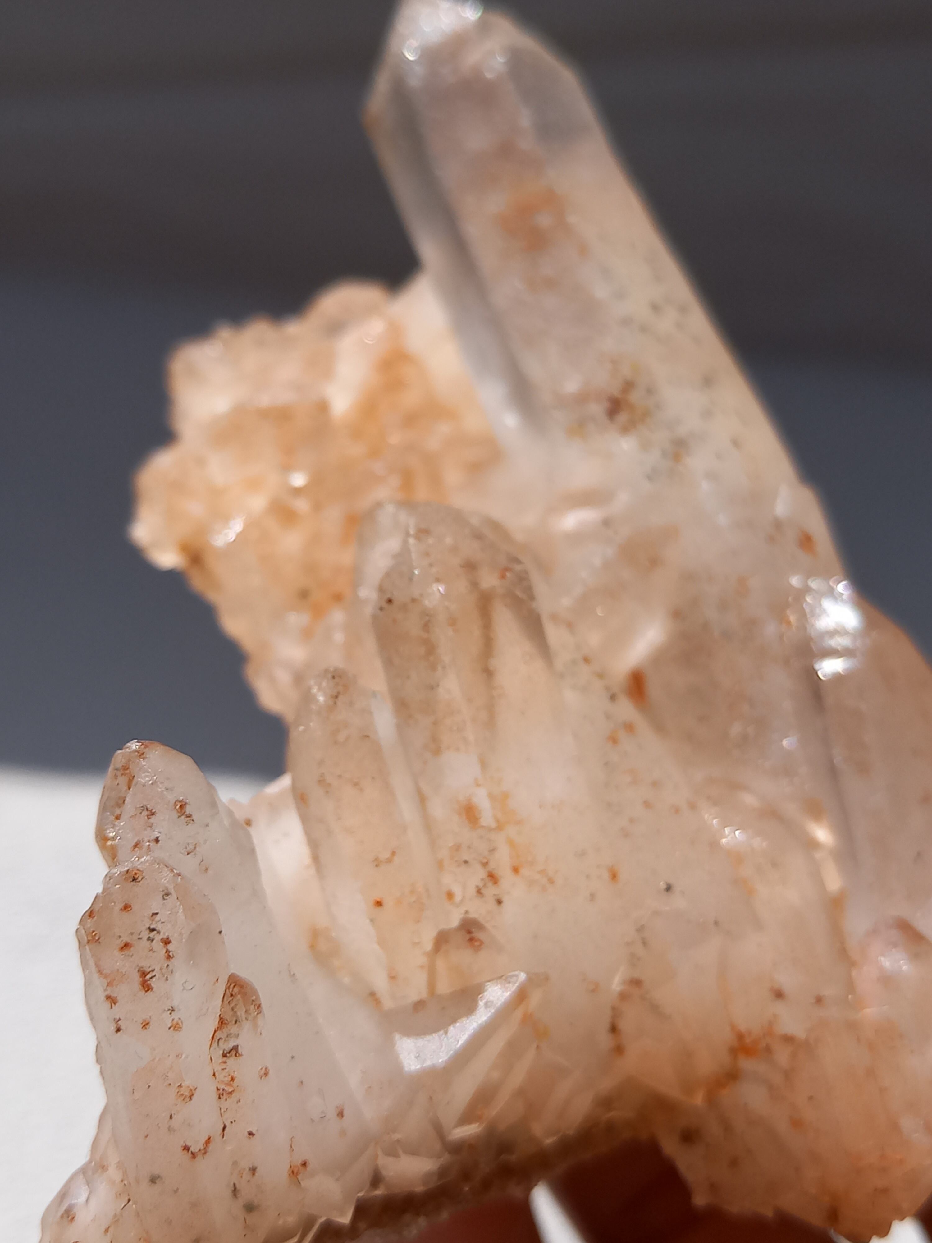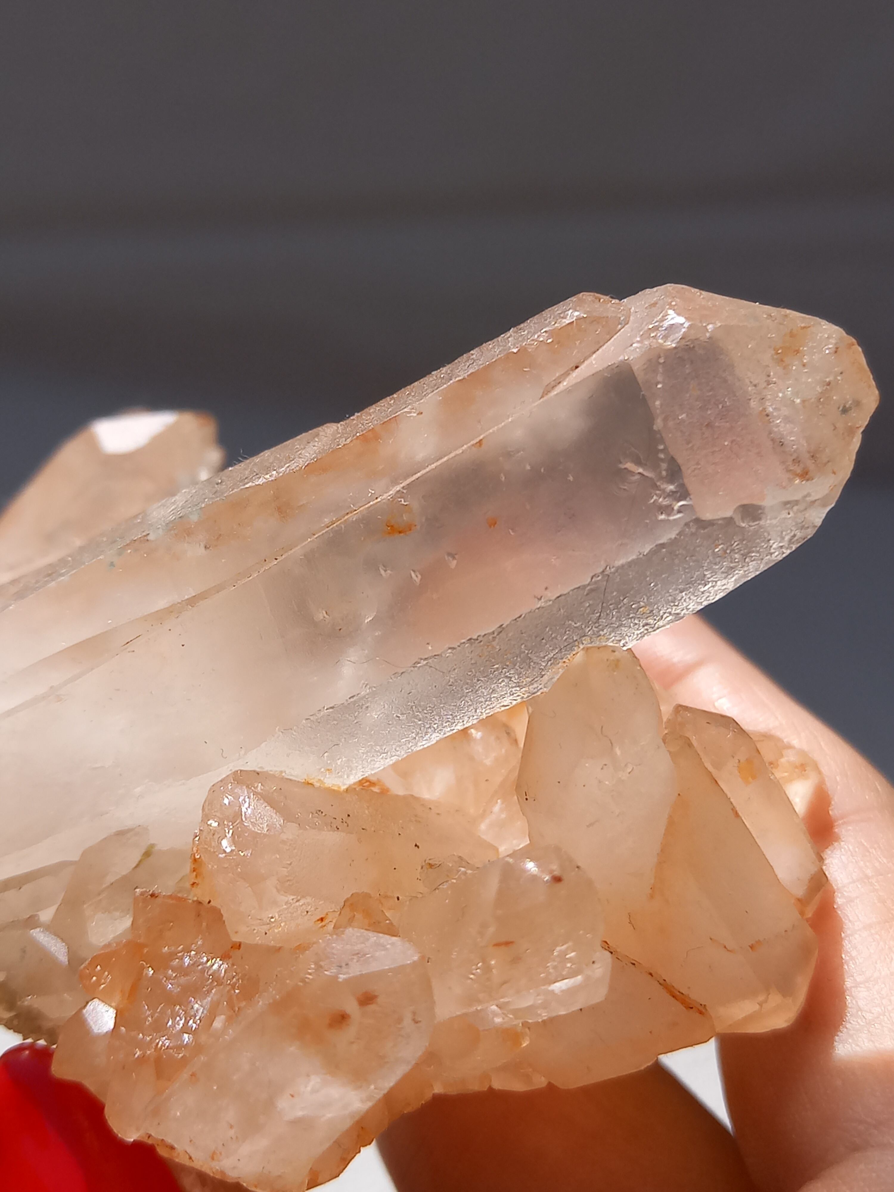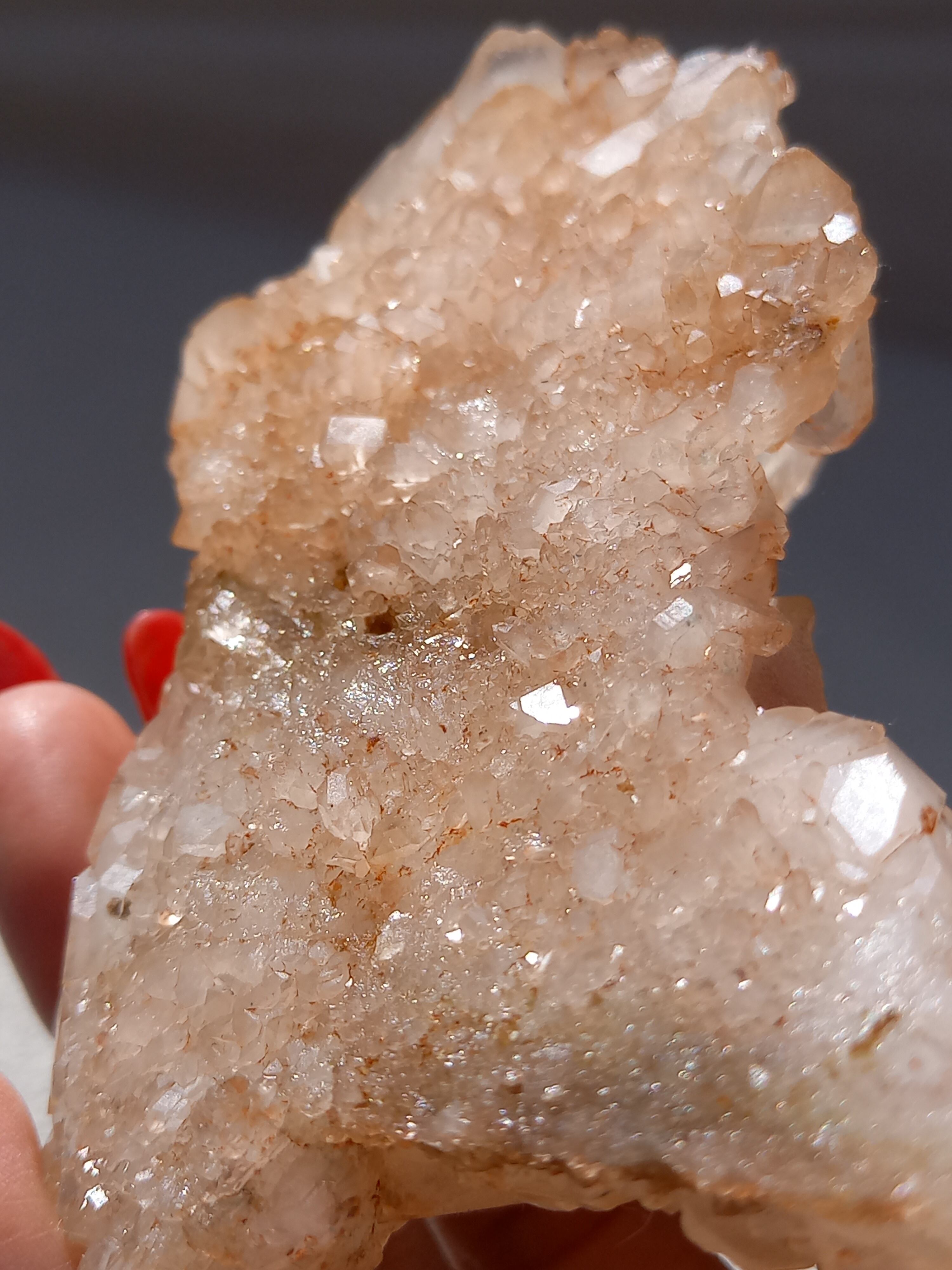 土壌に含まれる赤褐色をした酸化鉄により表面や母岩部がピンク色をしたものがよく見られます。この子は、ピンクオレンジのようなカラーに染まった子です。