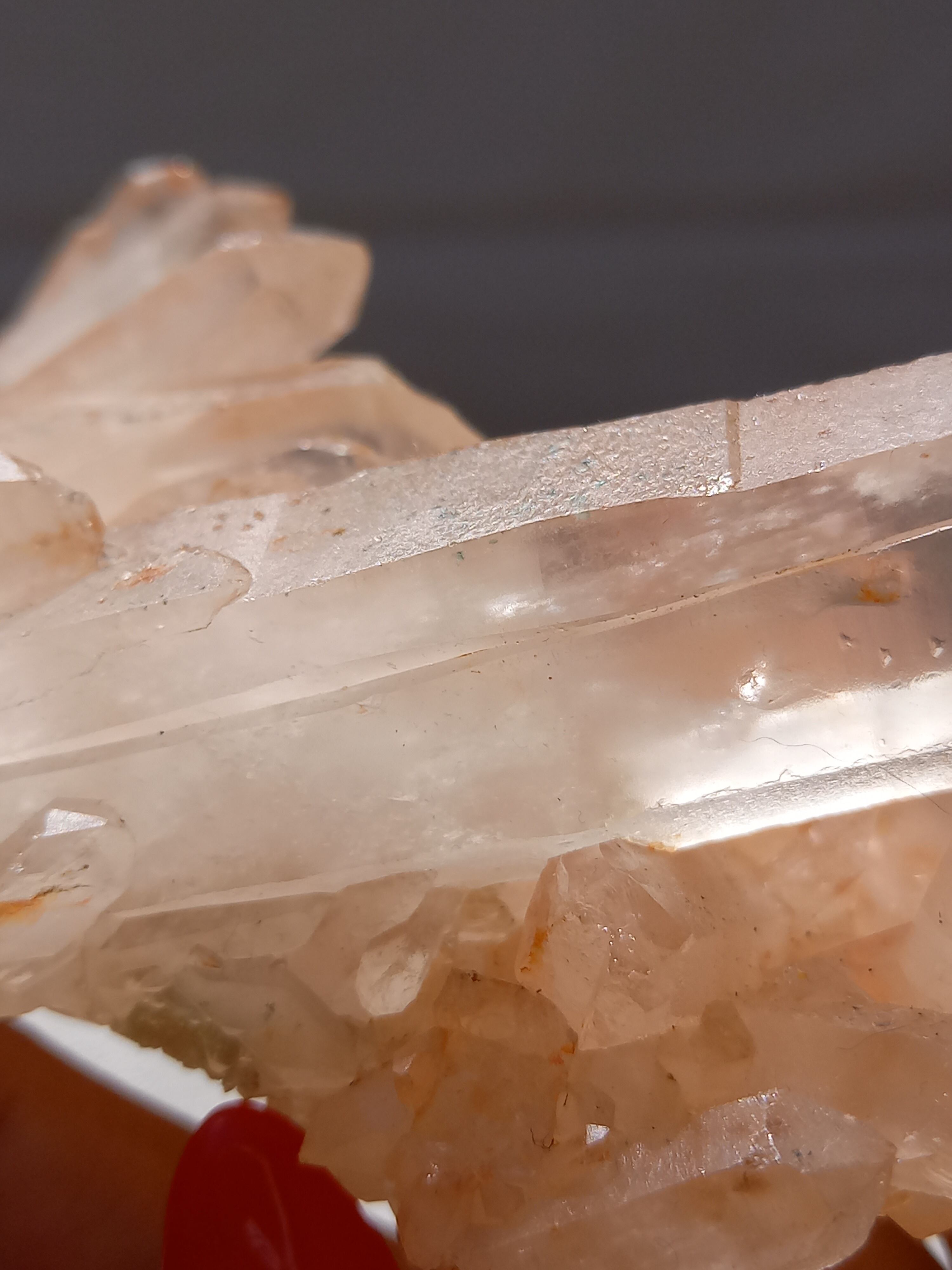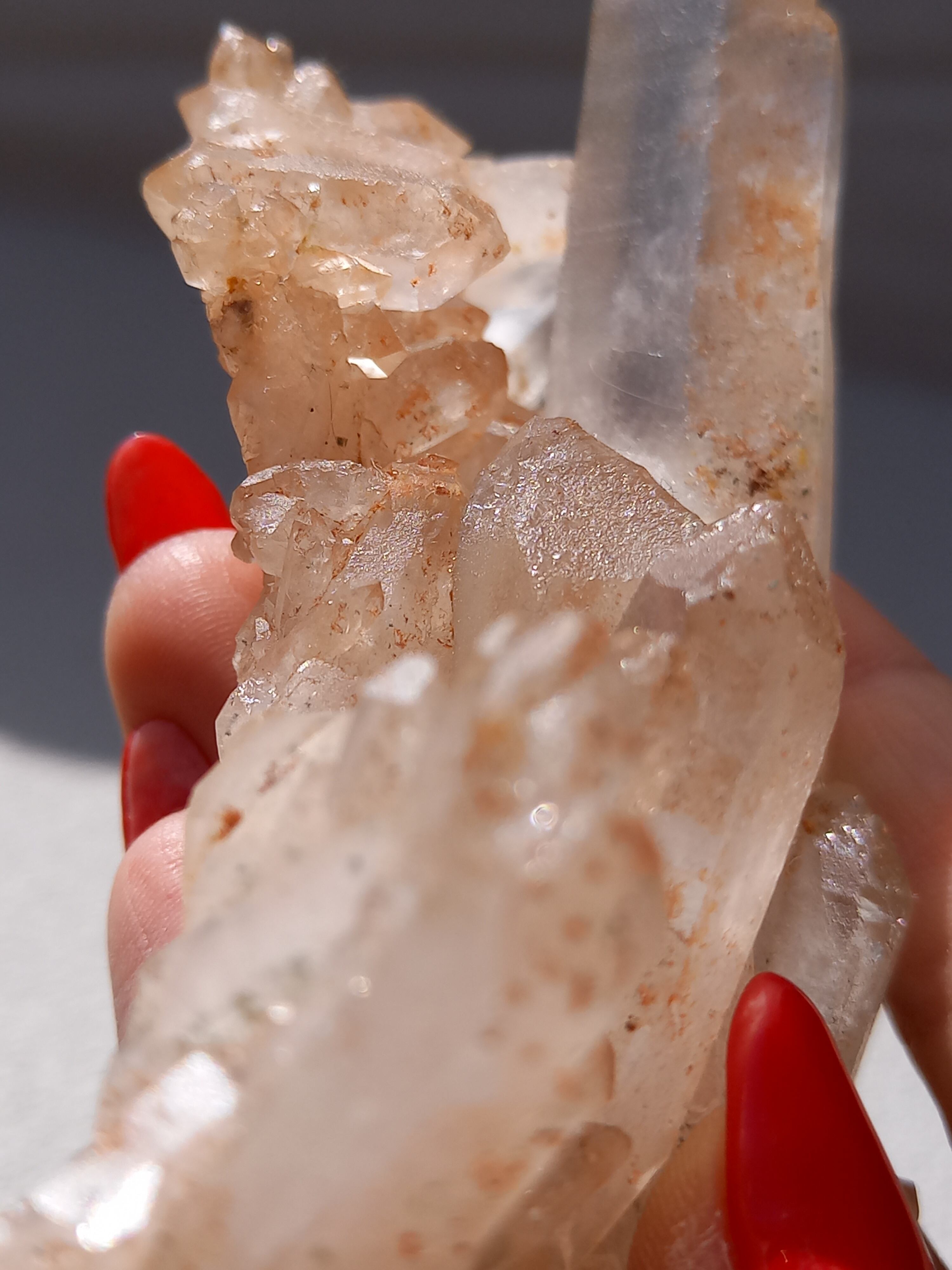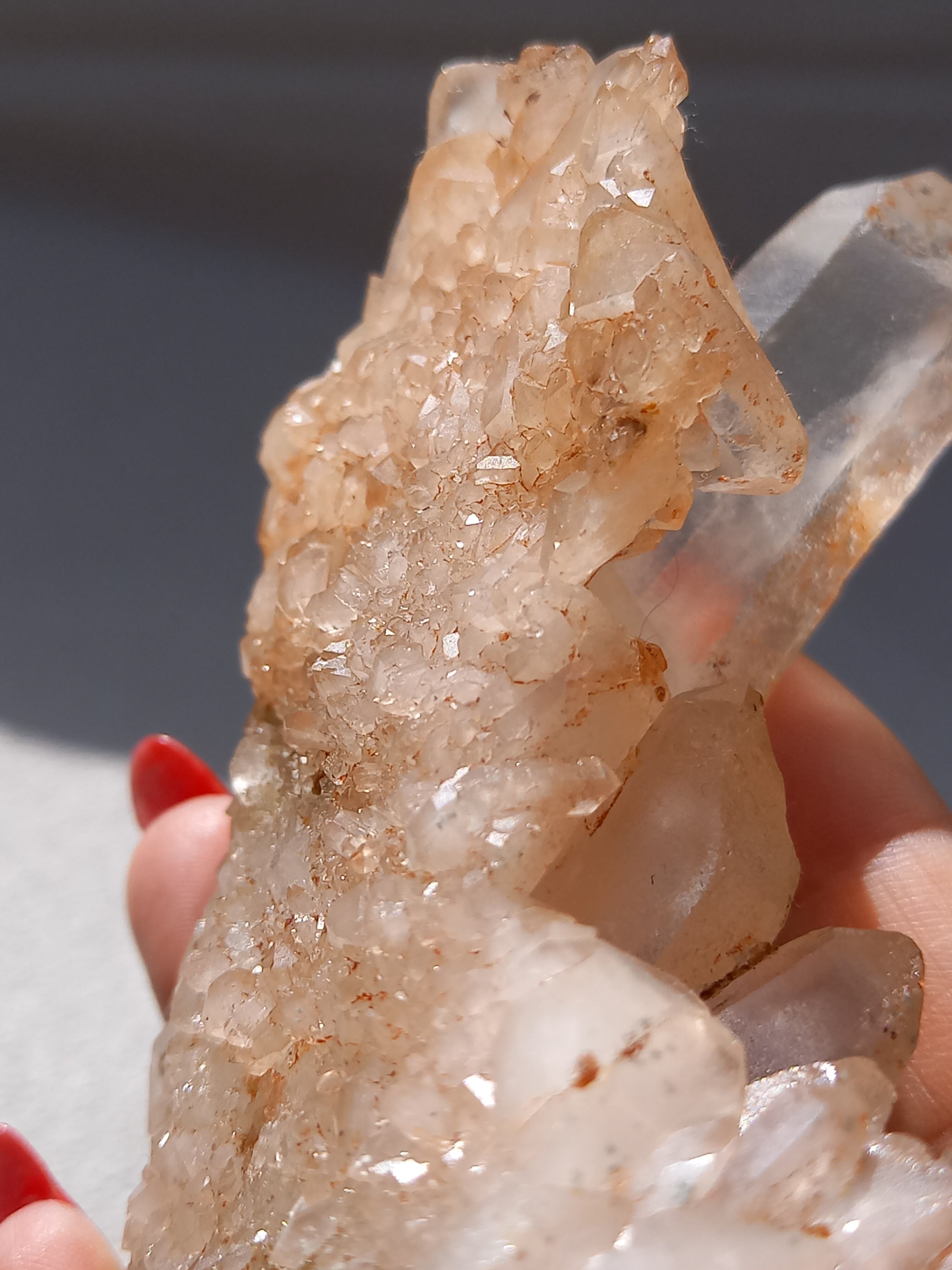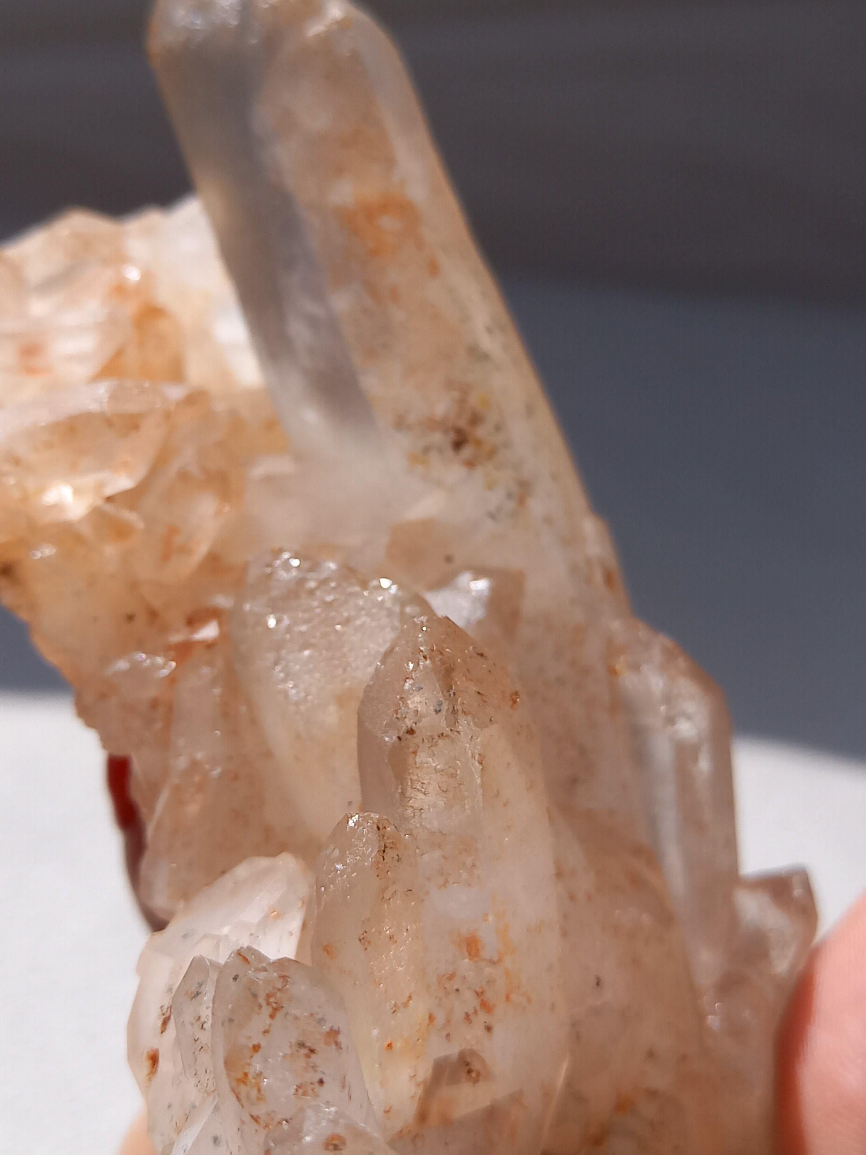 土壌に含まれる赤褐色をした酸化鉄により表面や母岩部がピンク色をしたものがよく見られます。この子は、ピンクオレンジのようなカラーに染まった子です。