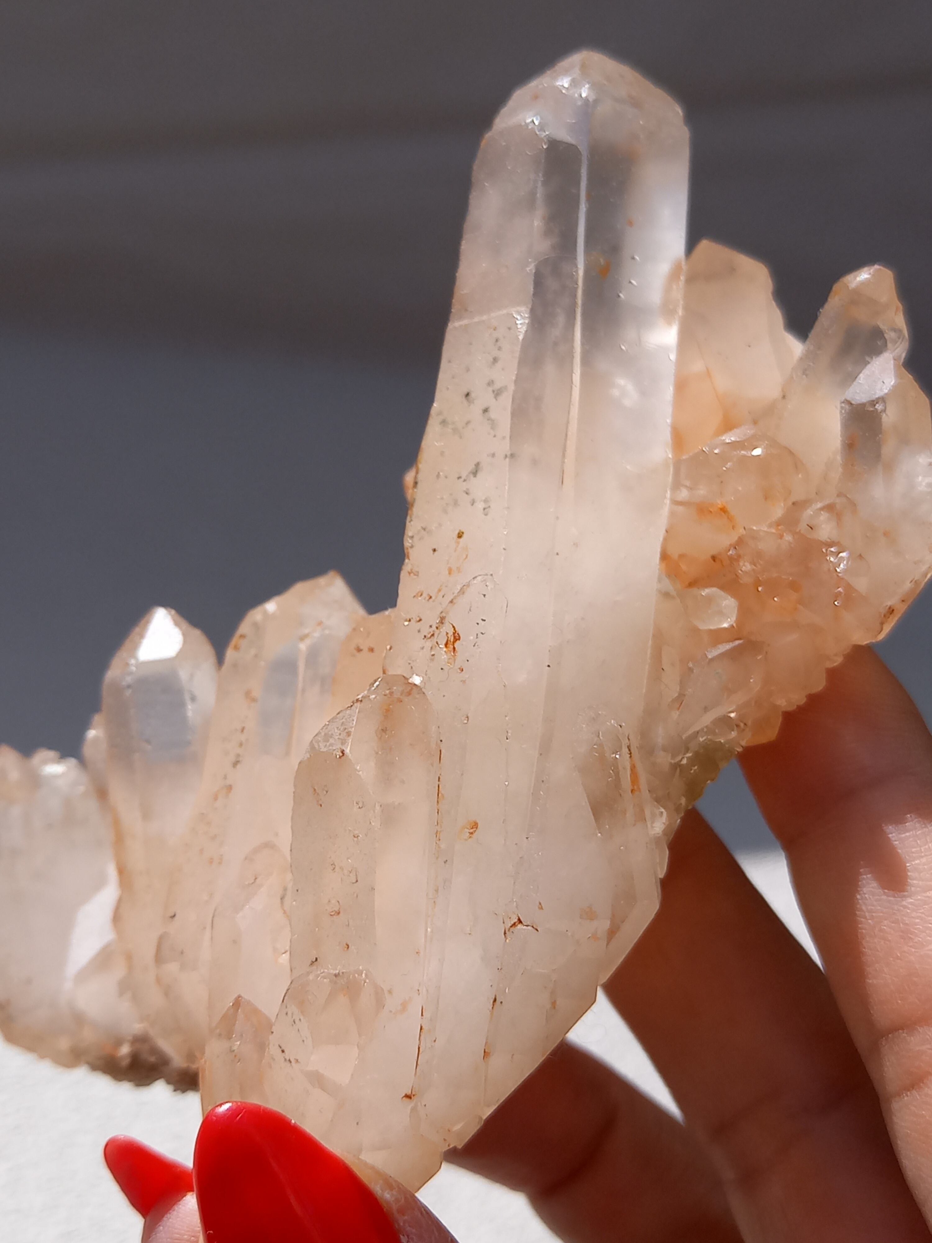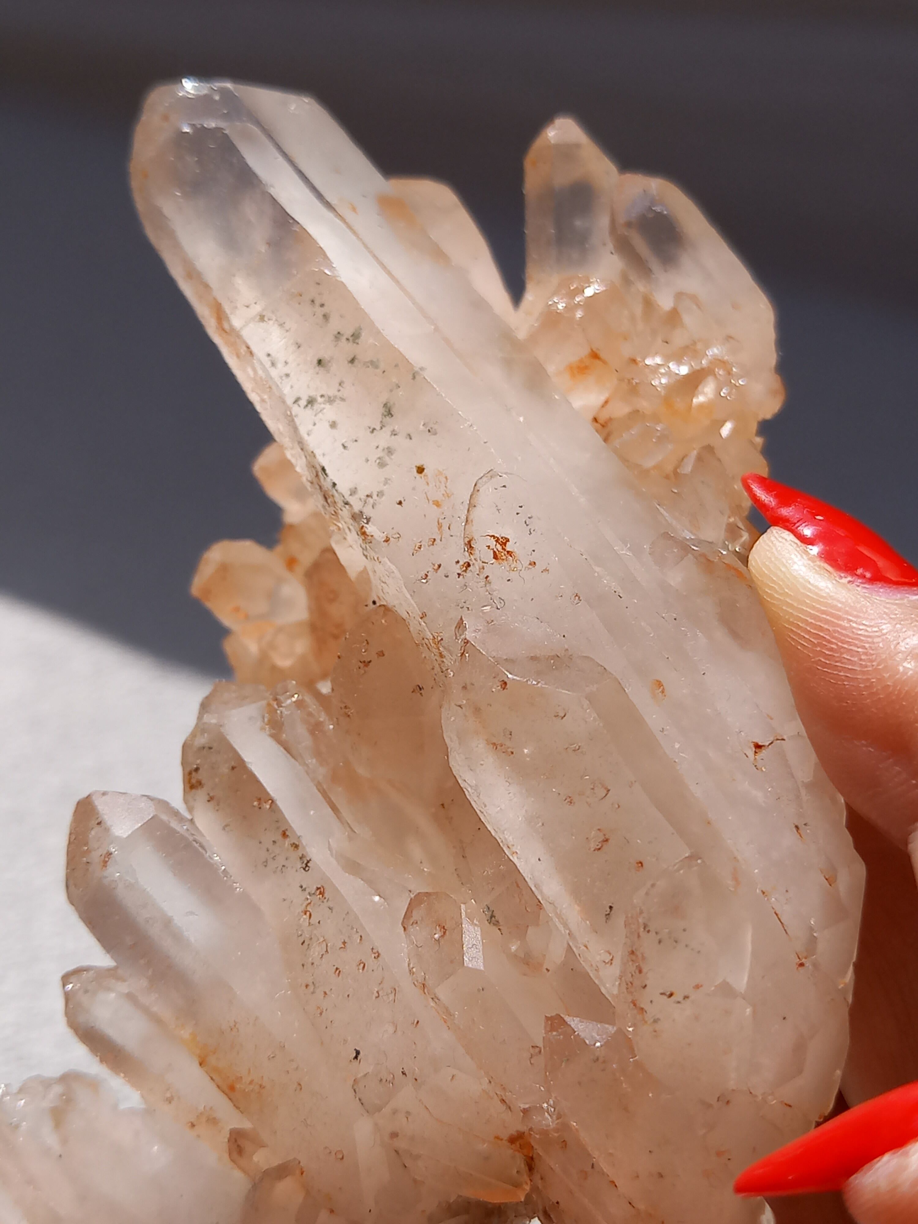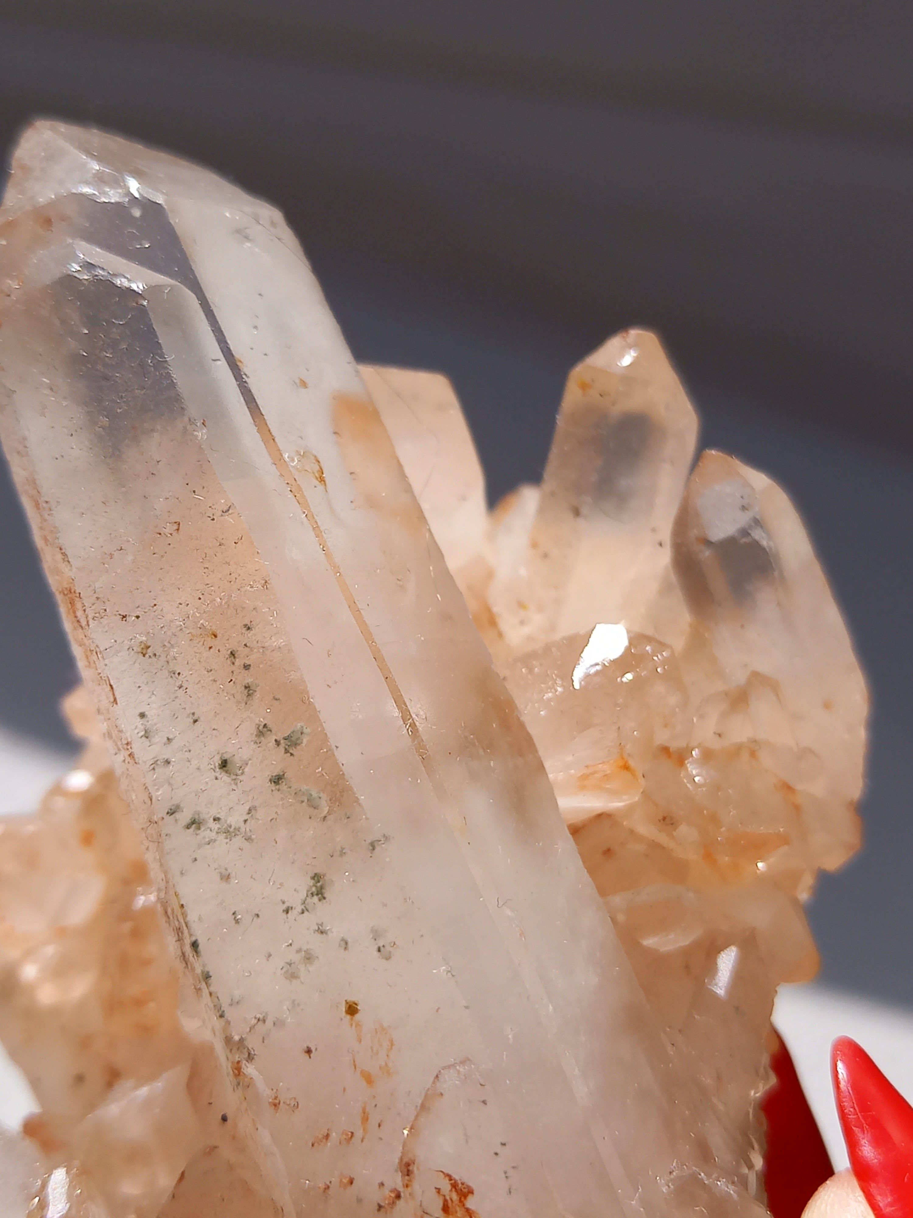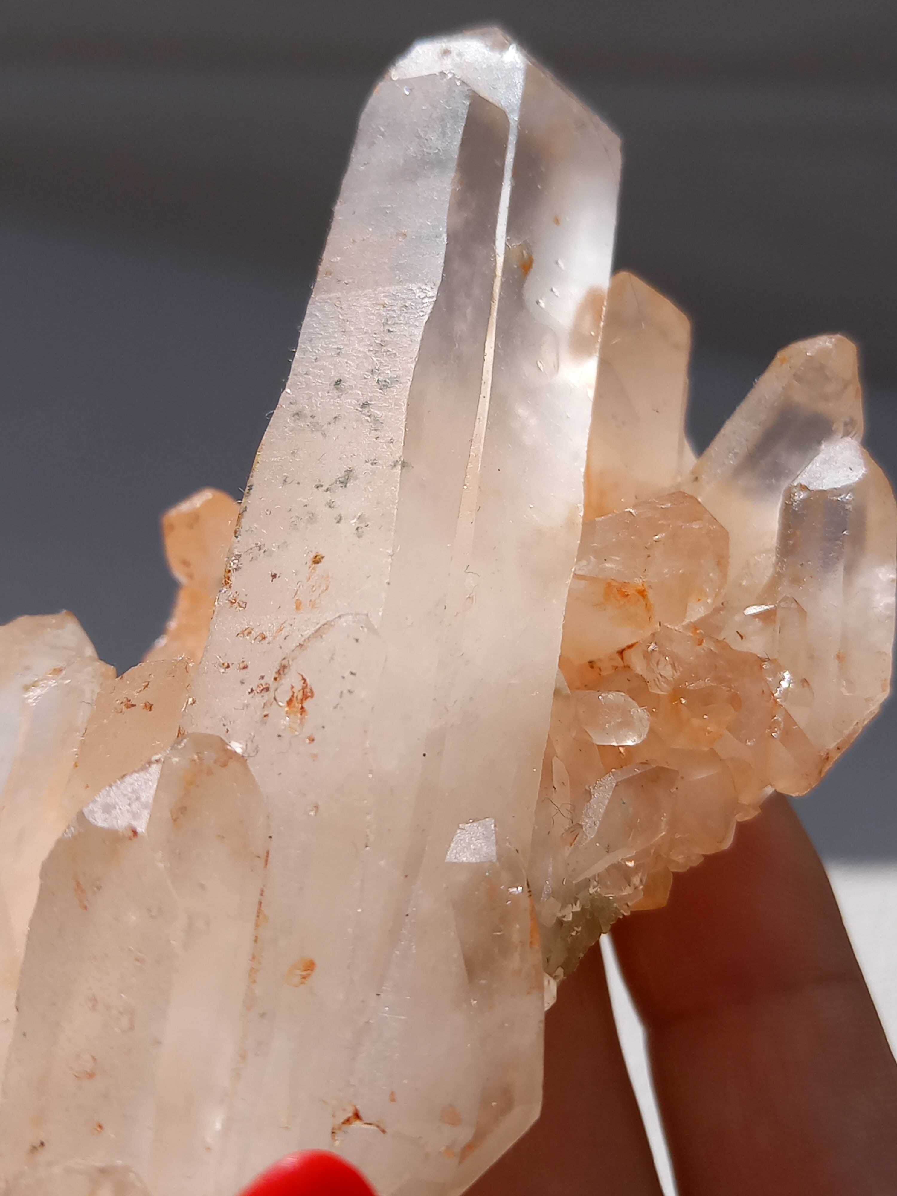 土壌に含まれる赤褐色をした酸化鉄により表面や母岩部がピンク色をしたものがよく見られます。この子は、ピンクオレンジのようなカラーに染まった子です。
