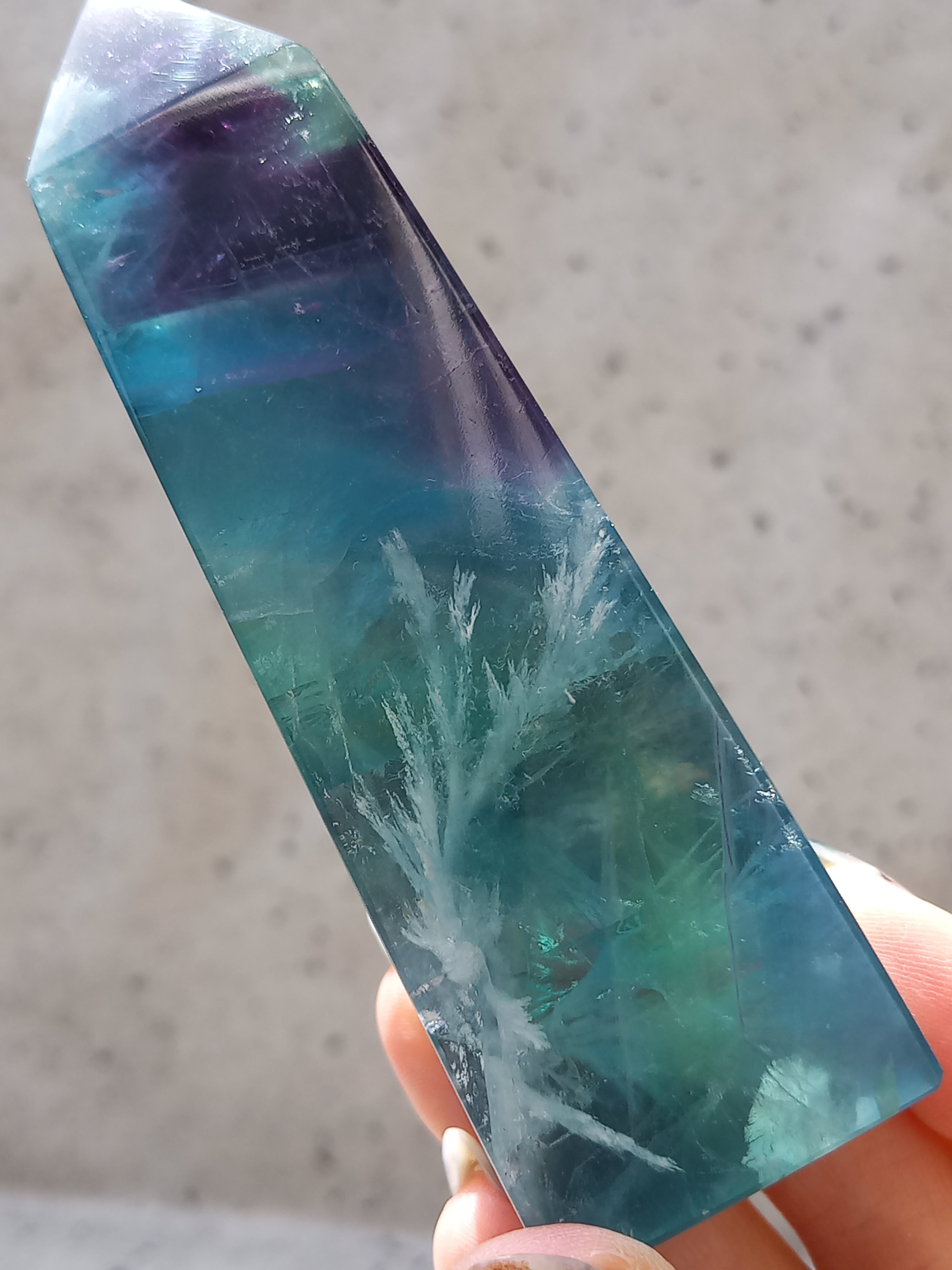 透明感のあるフローライトに、フェザーがとても美しいです。