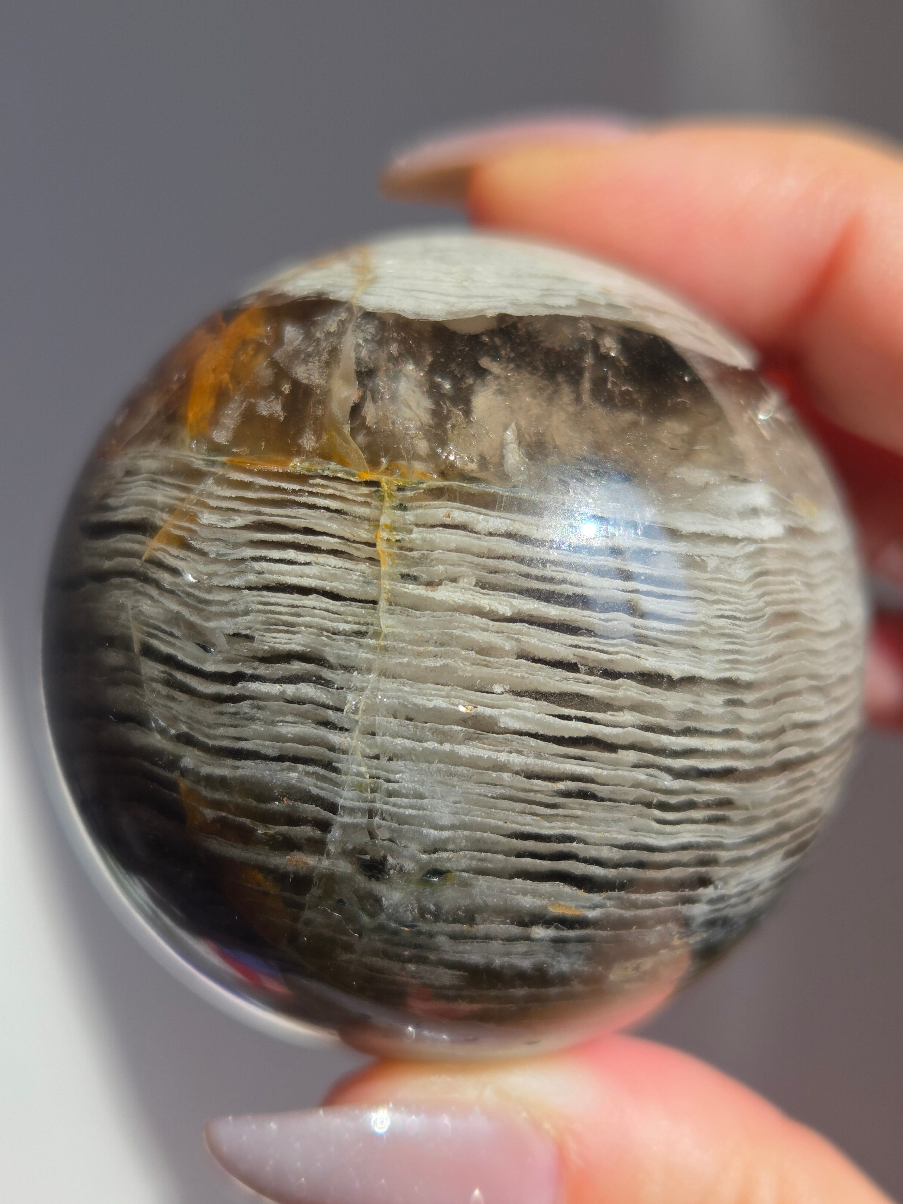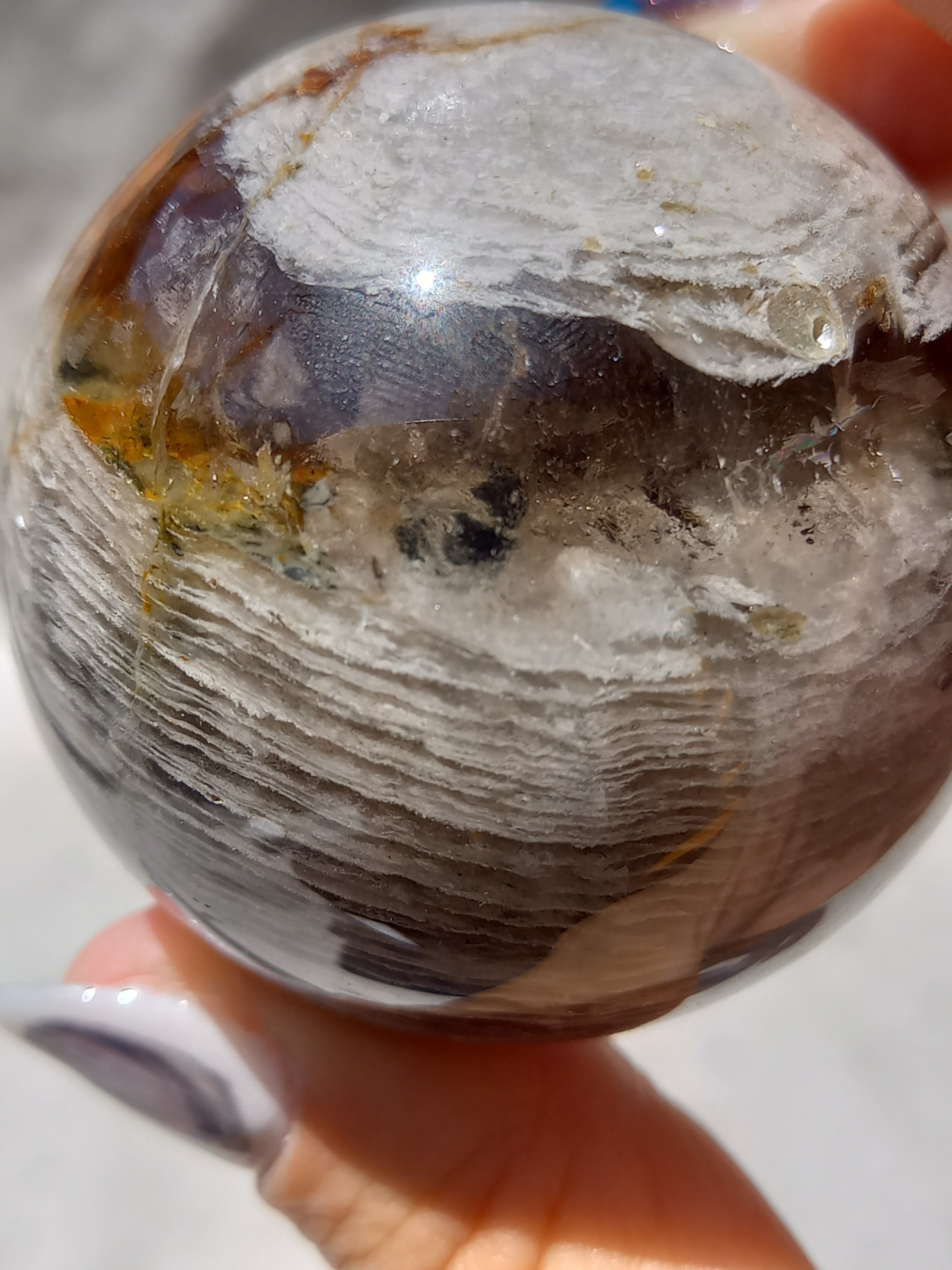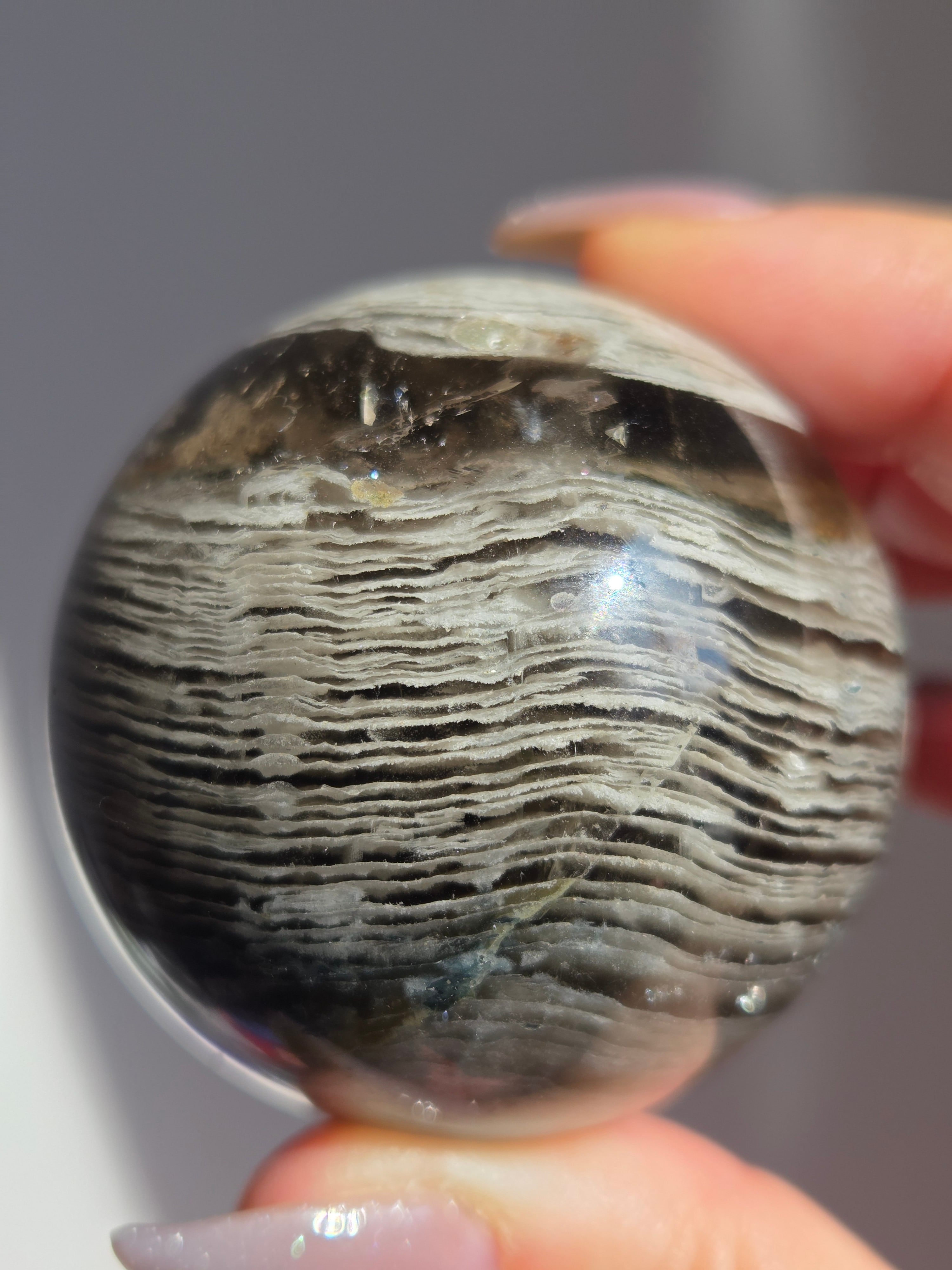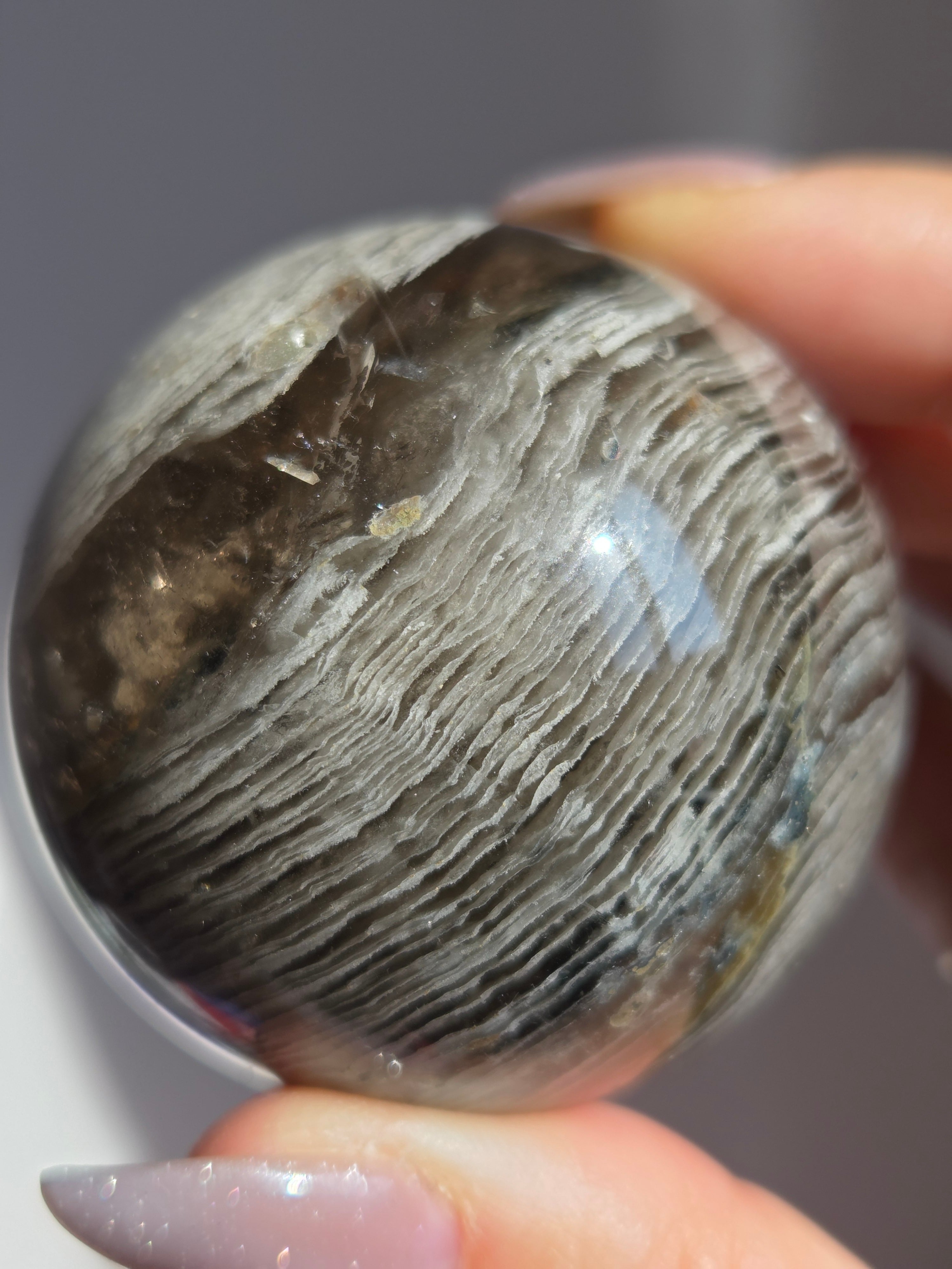 透明感のあるスモーキークォーツの中に千層ガーデンが見られる、カッコイイ子です。