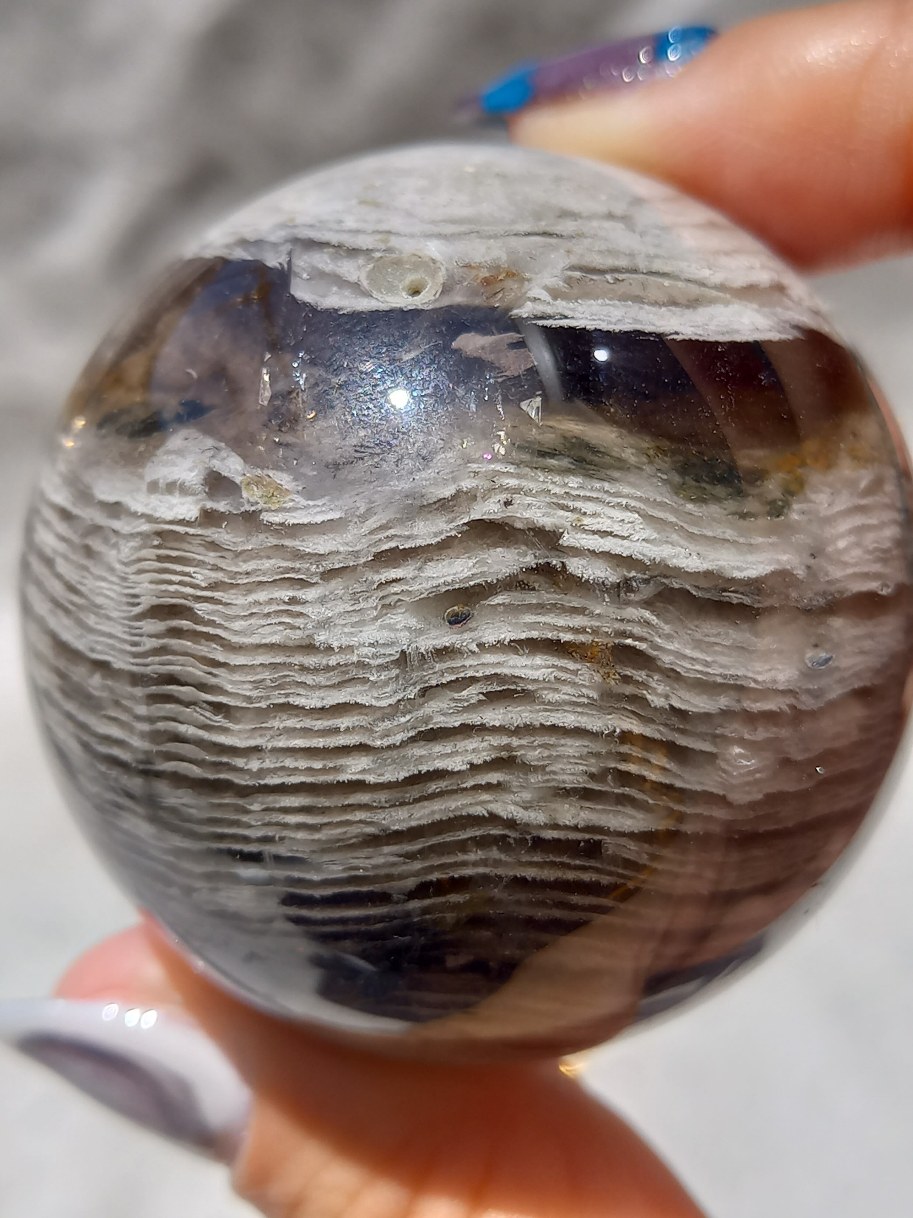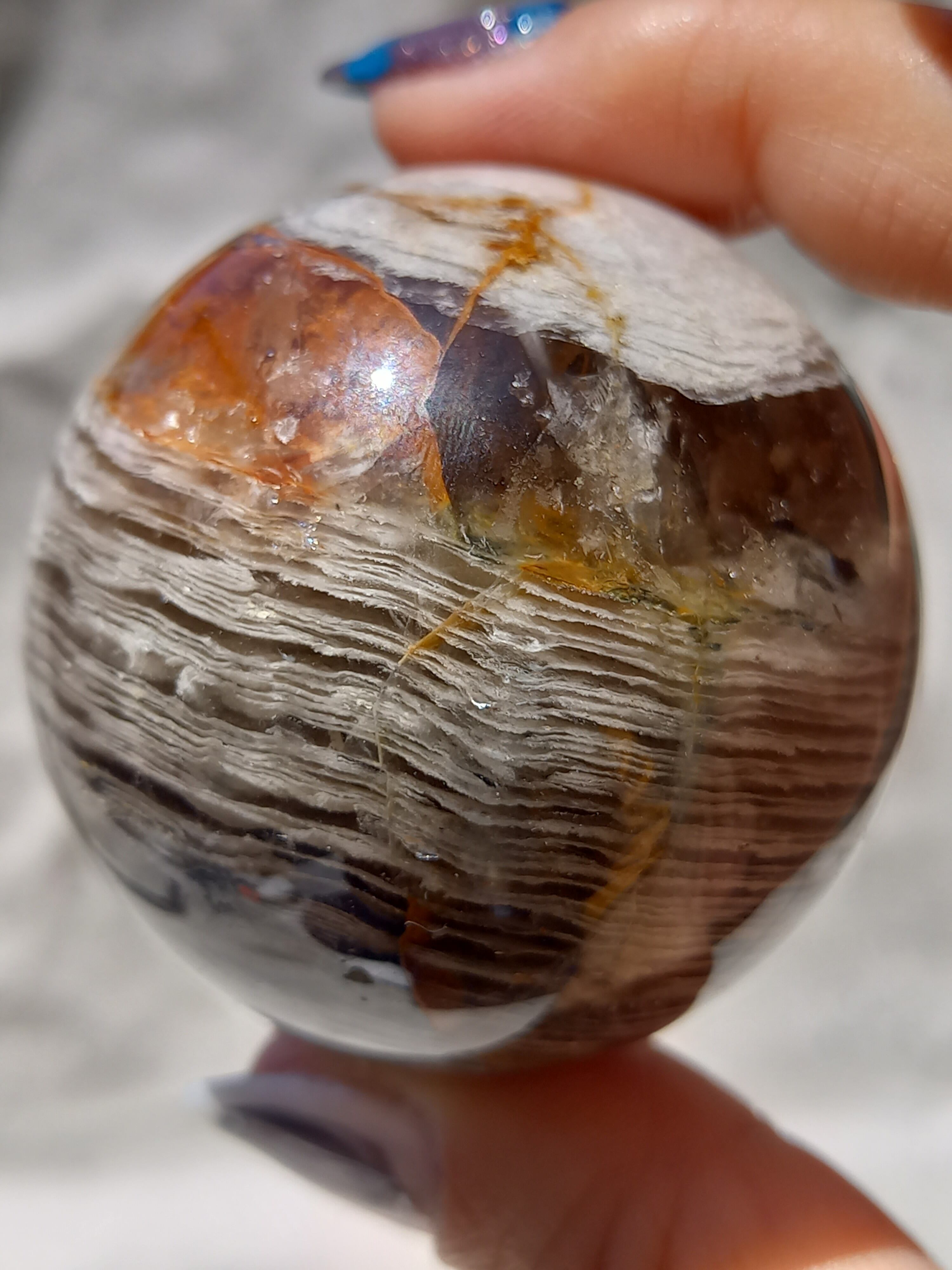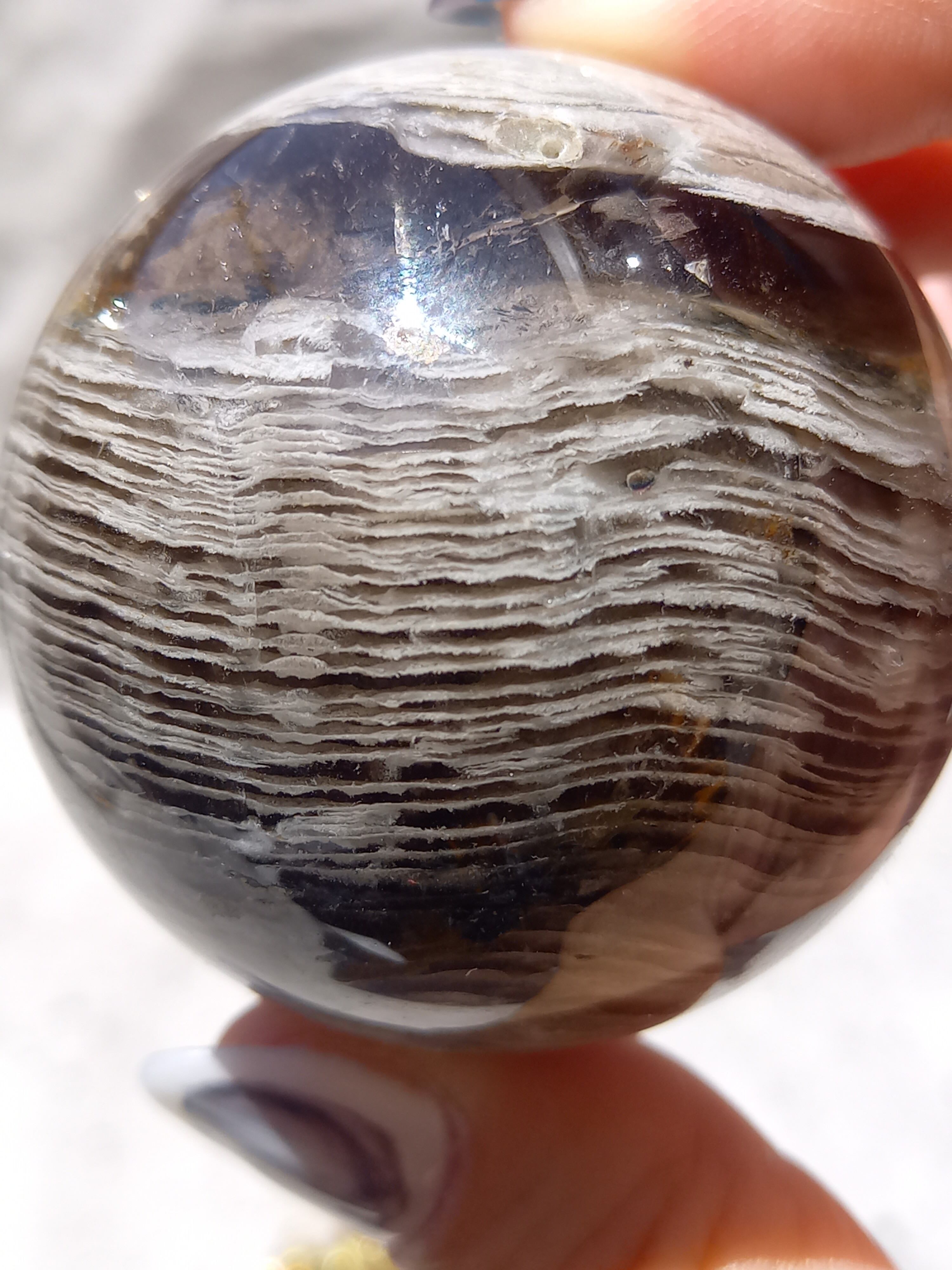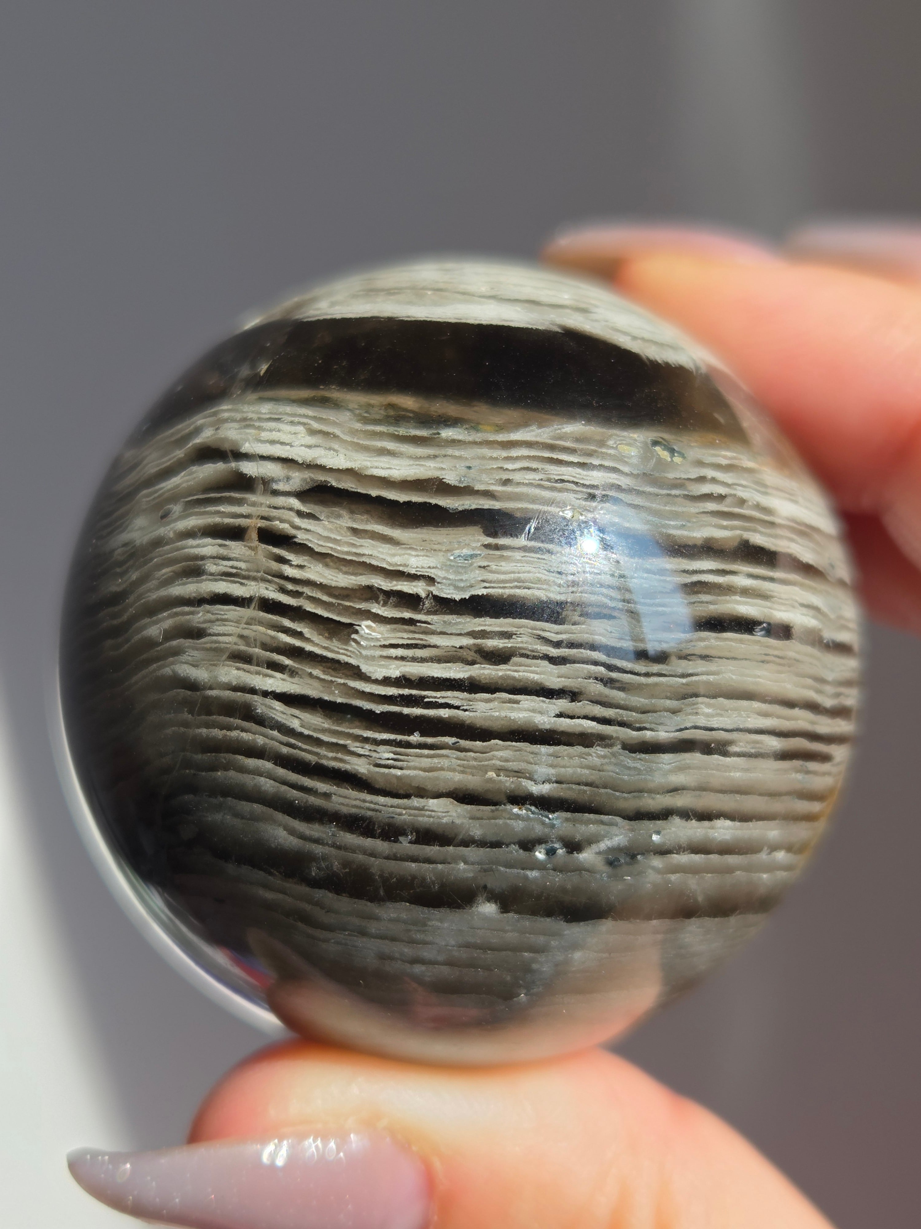 透明感のあるスモーキークォーツの中に千層ガーデンが見られる、カッコイイ子です。