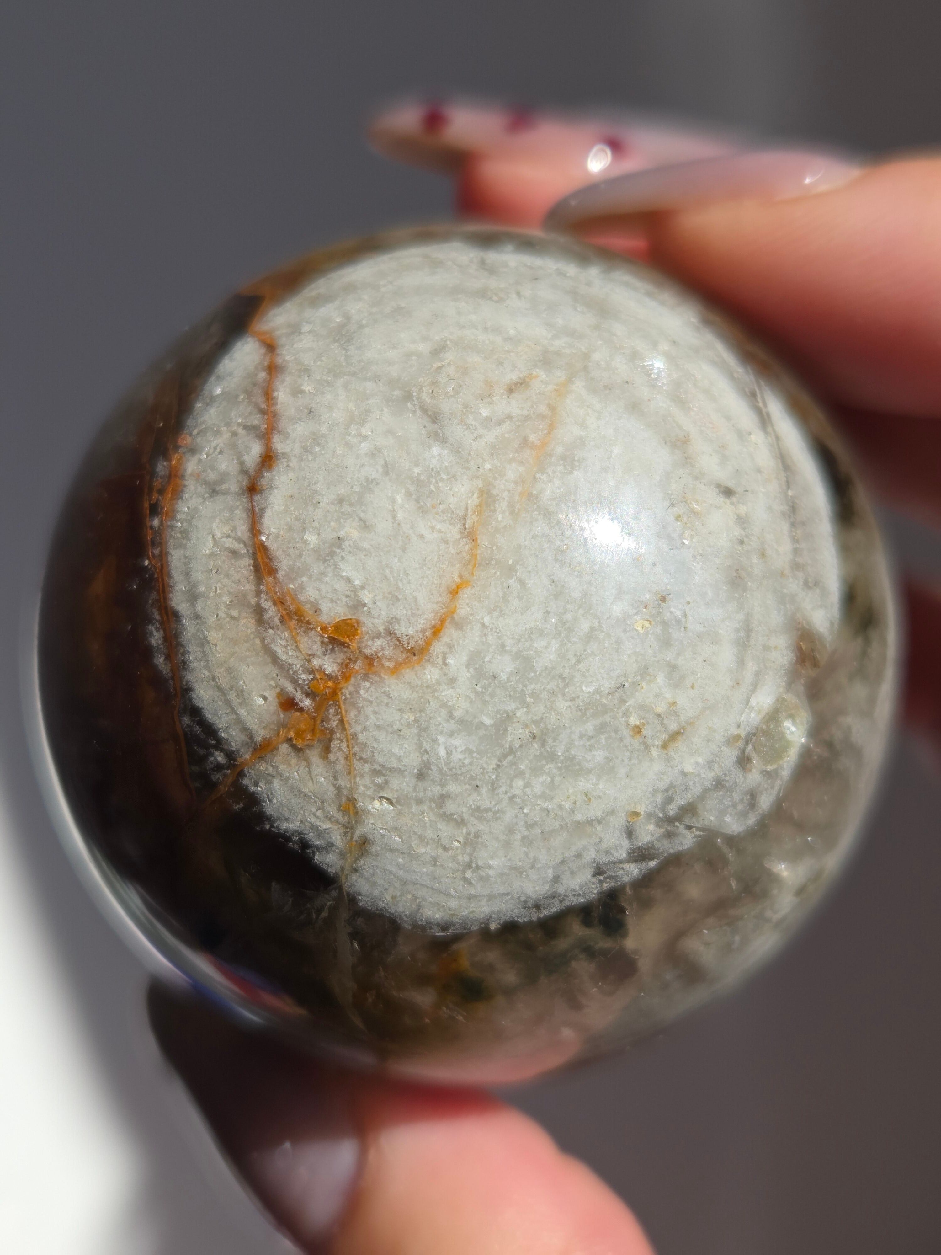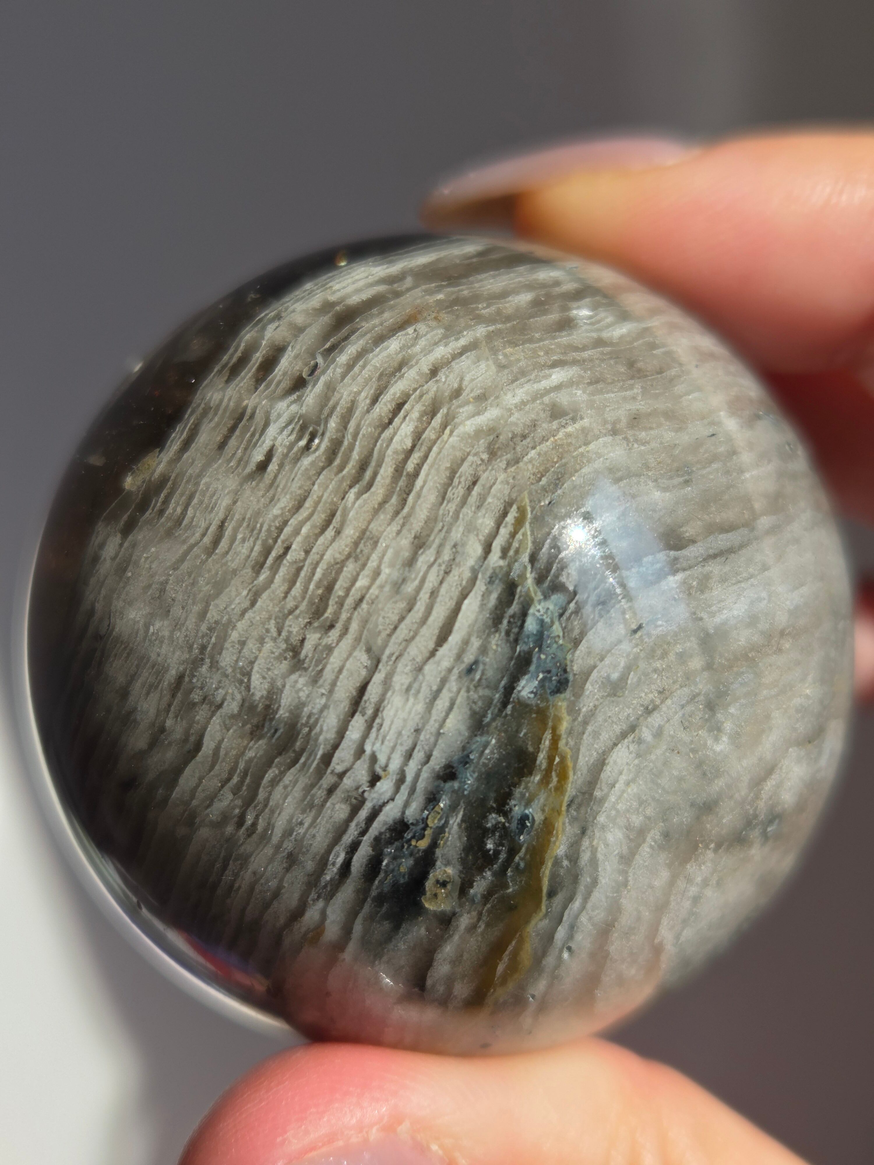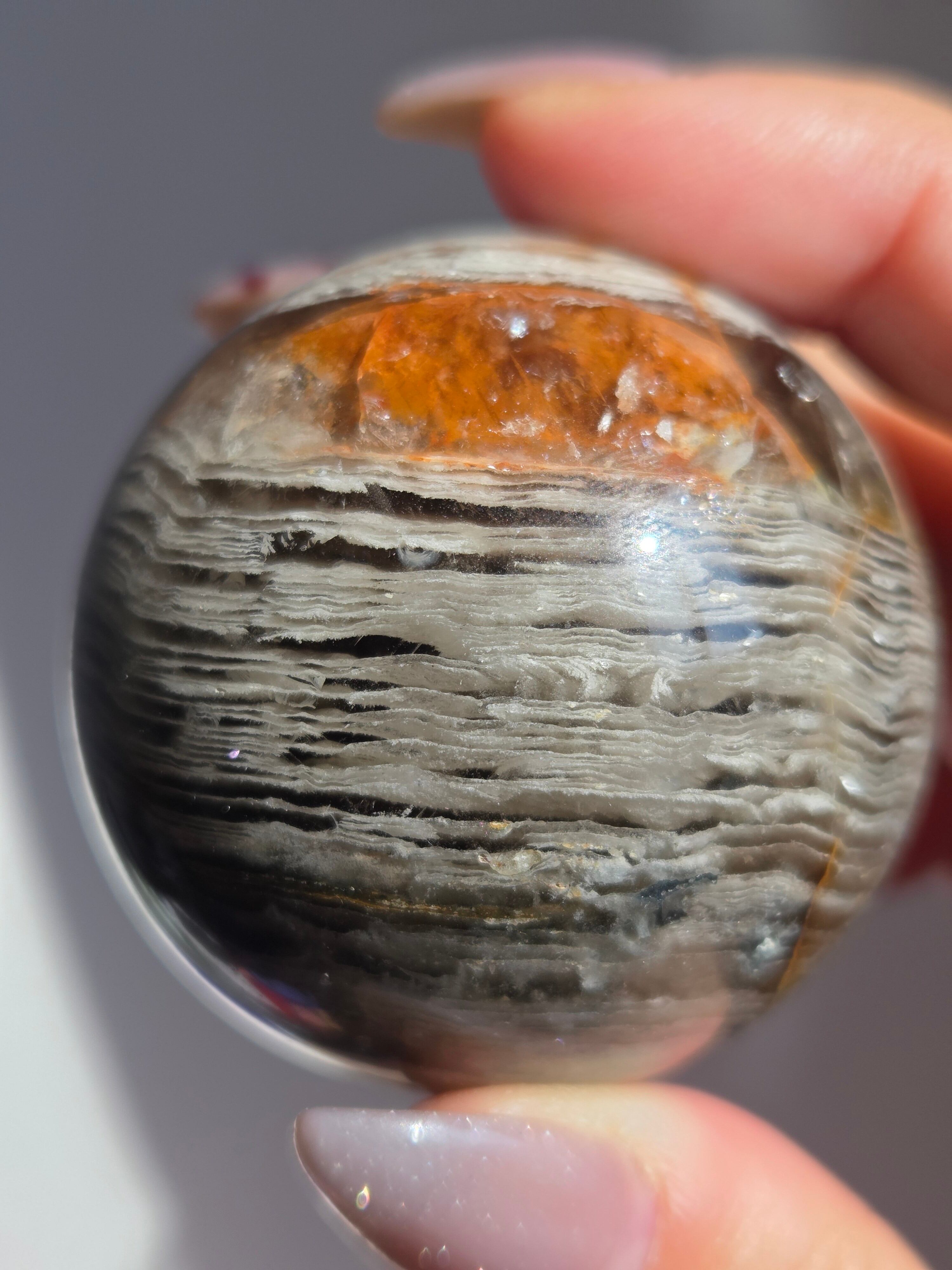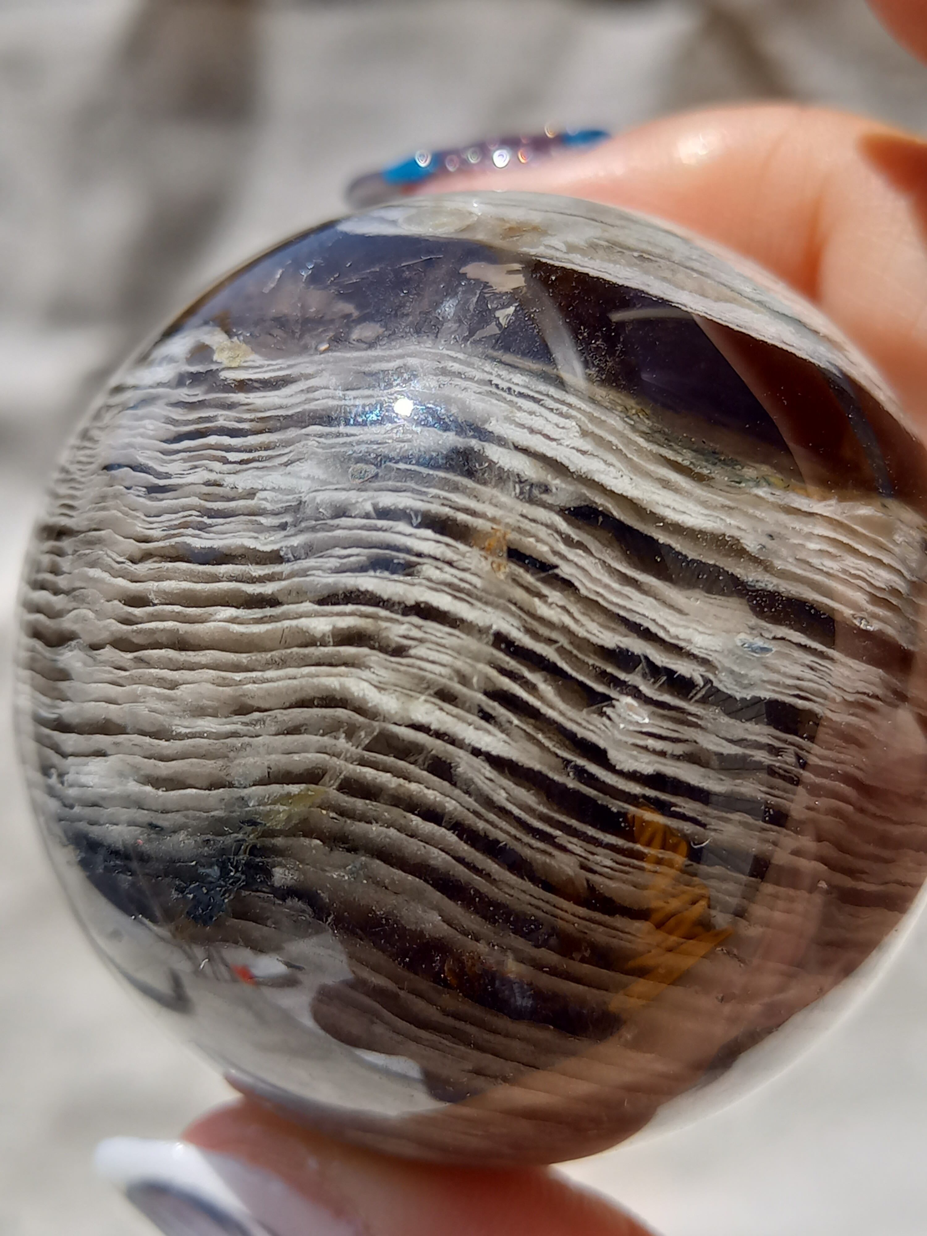 透明感のあるスモーキークォーツの中に千層ガーデンが見られる、カッコイイ子です。