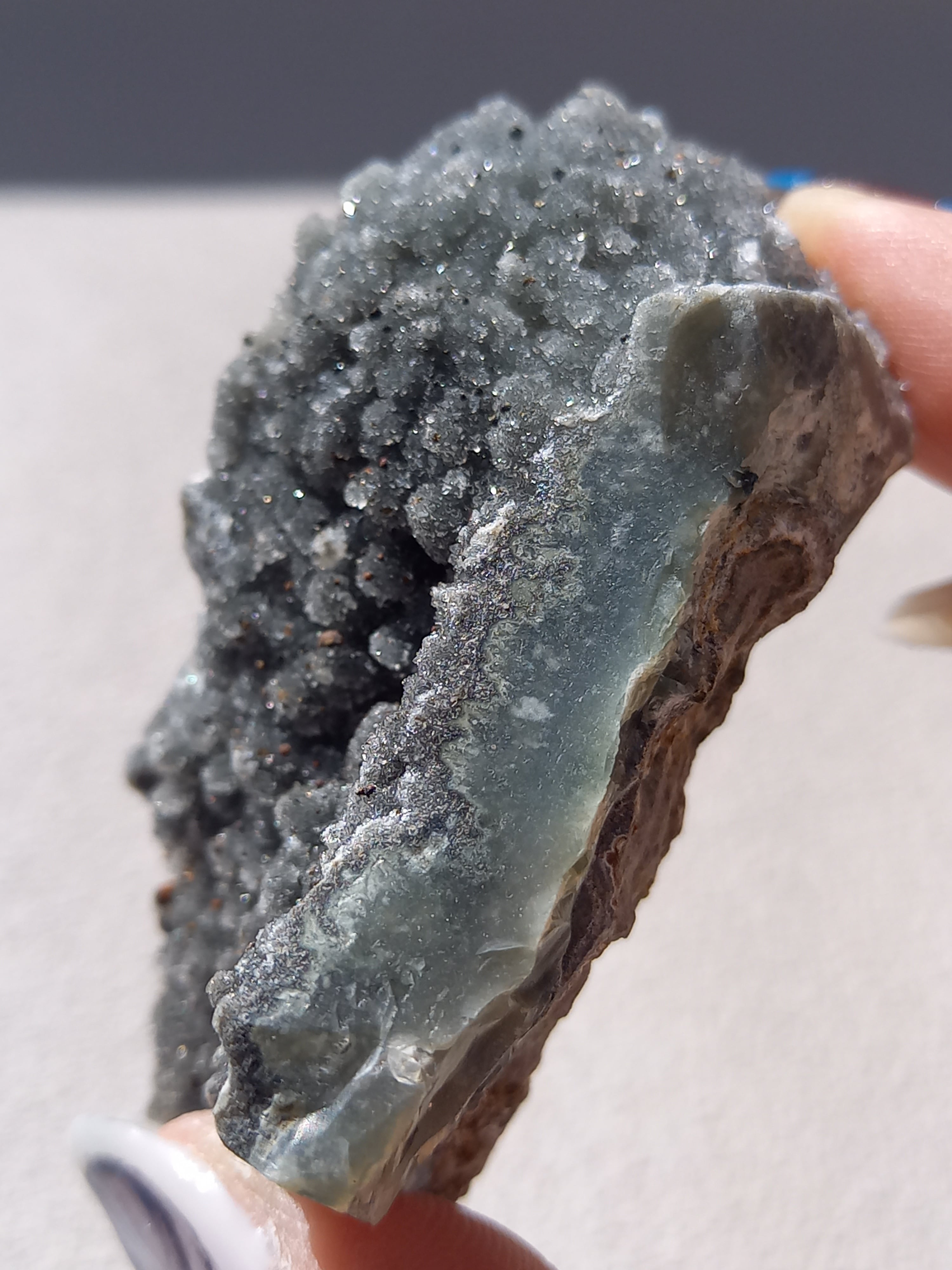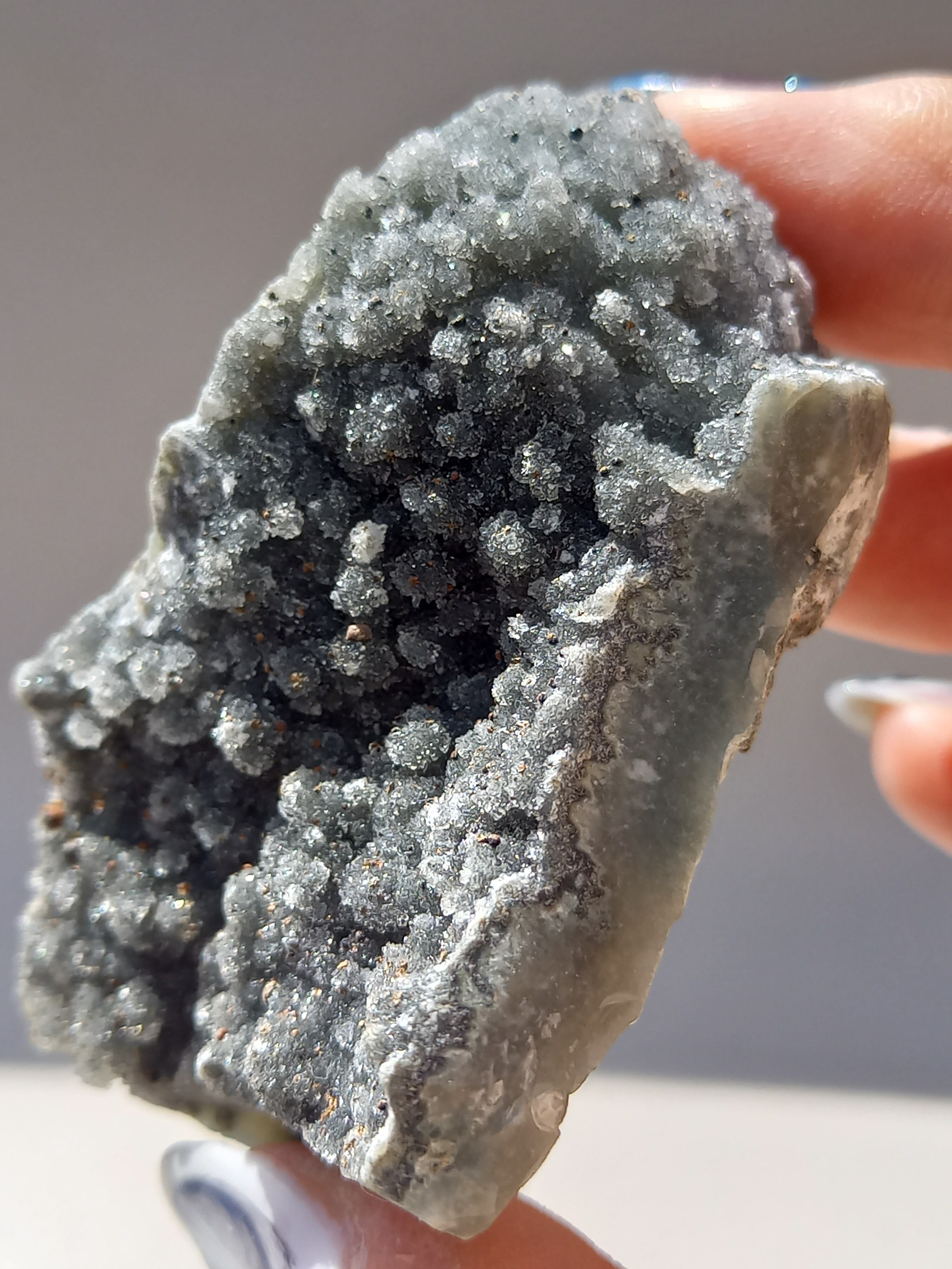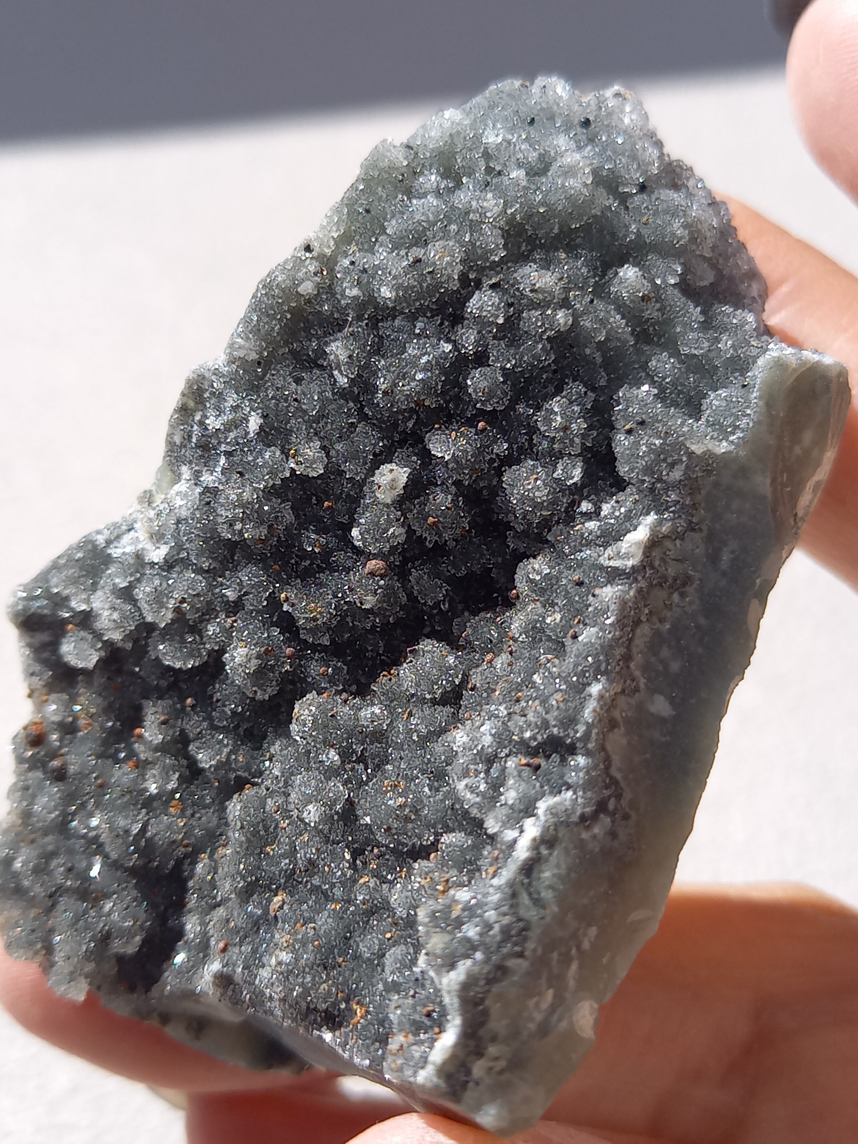 アメジスト原石の表面に水晶のドゥルージーが結晶しています。 これは若い結晶で、いわゆる赤ちゃんや子供のようなものです。 キラキラ輝く姿が砂糖菓子をまぶしたように見えることからシュガーアメジストと呼ばれます。