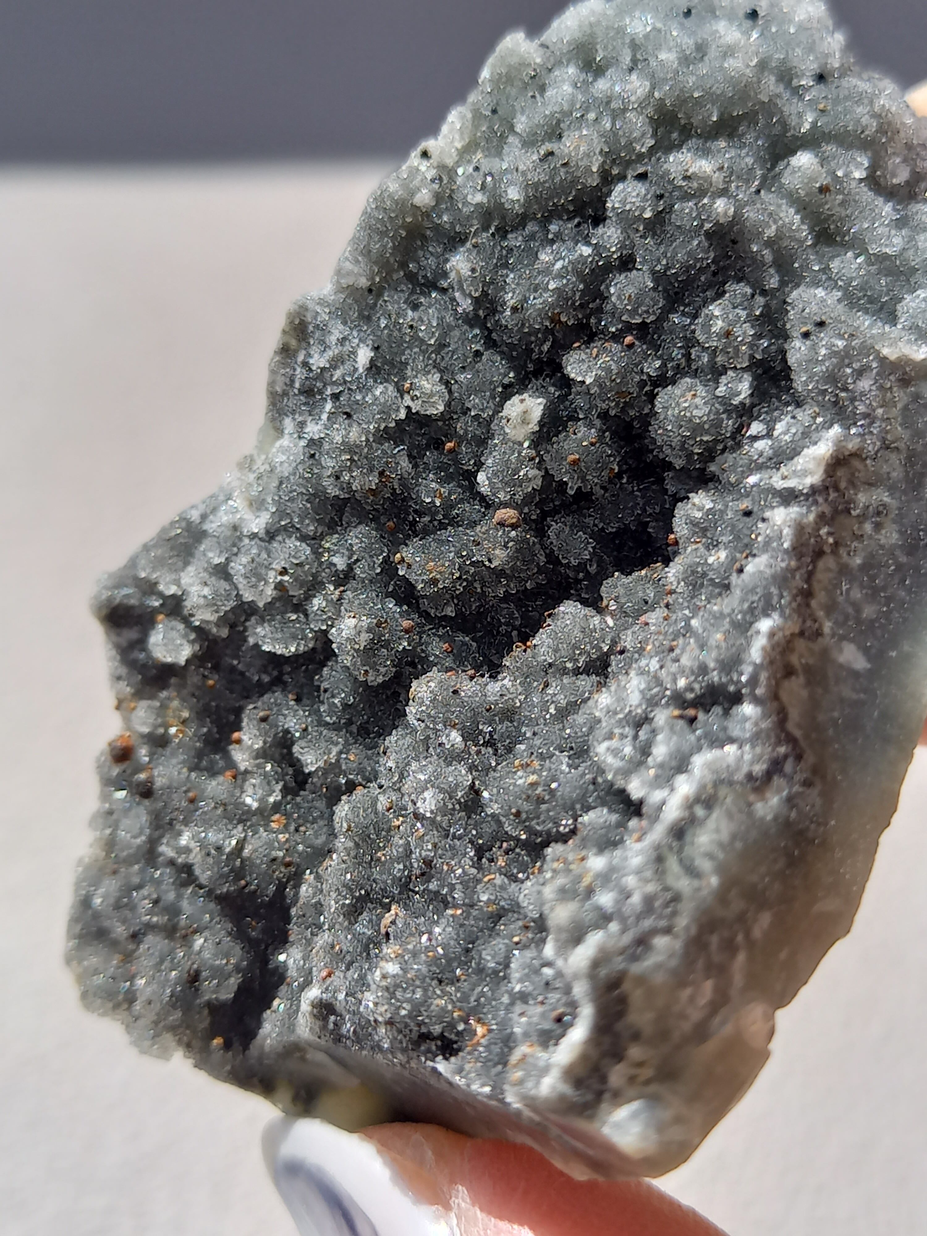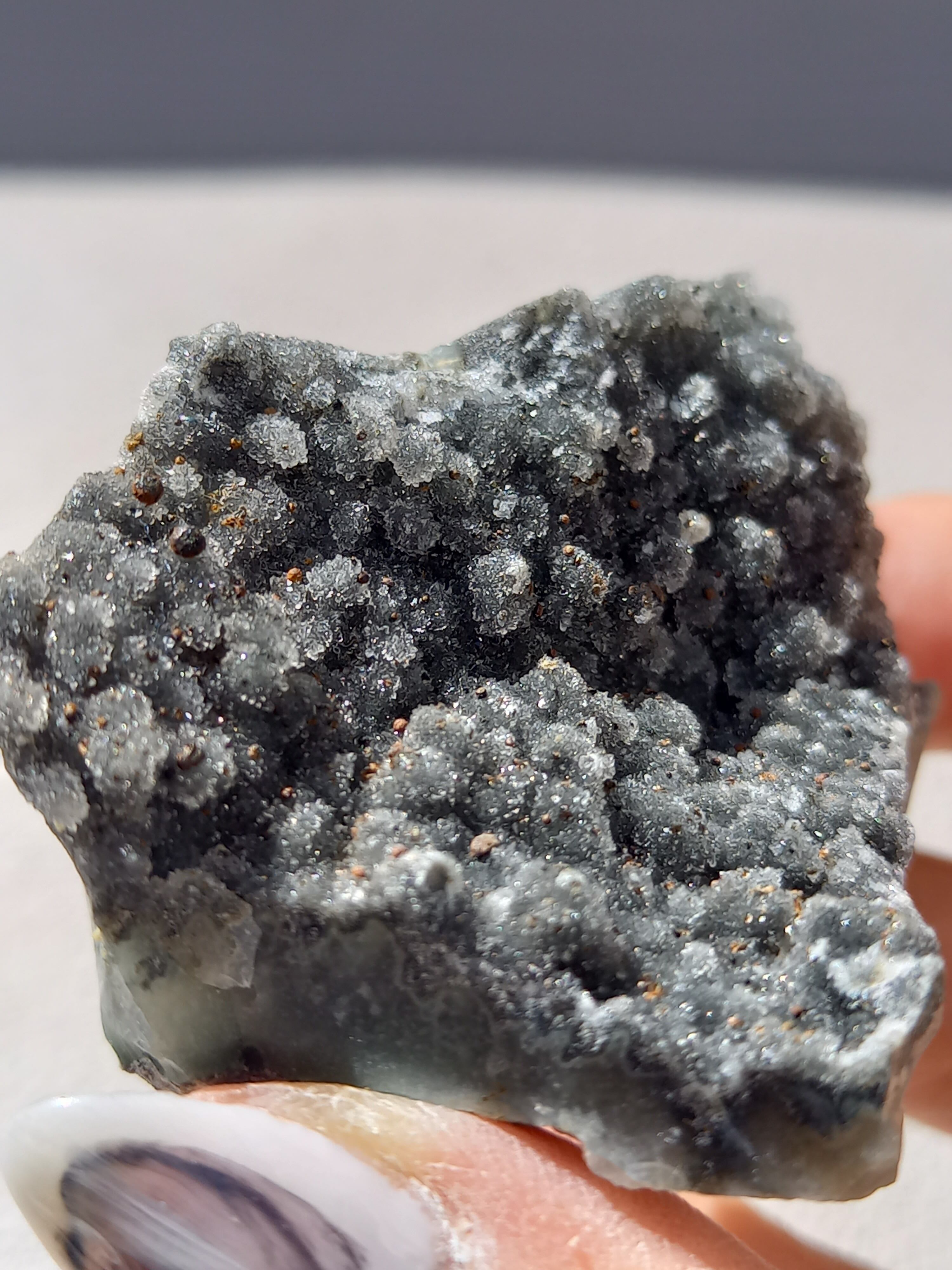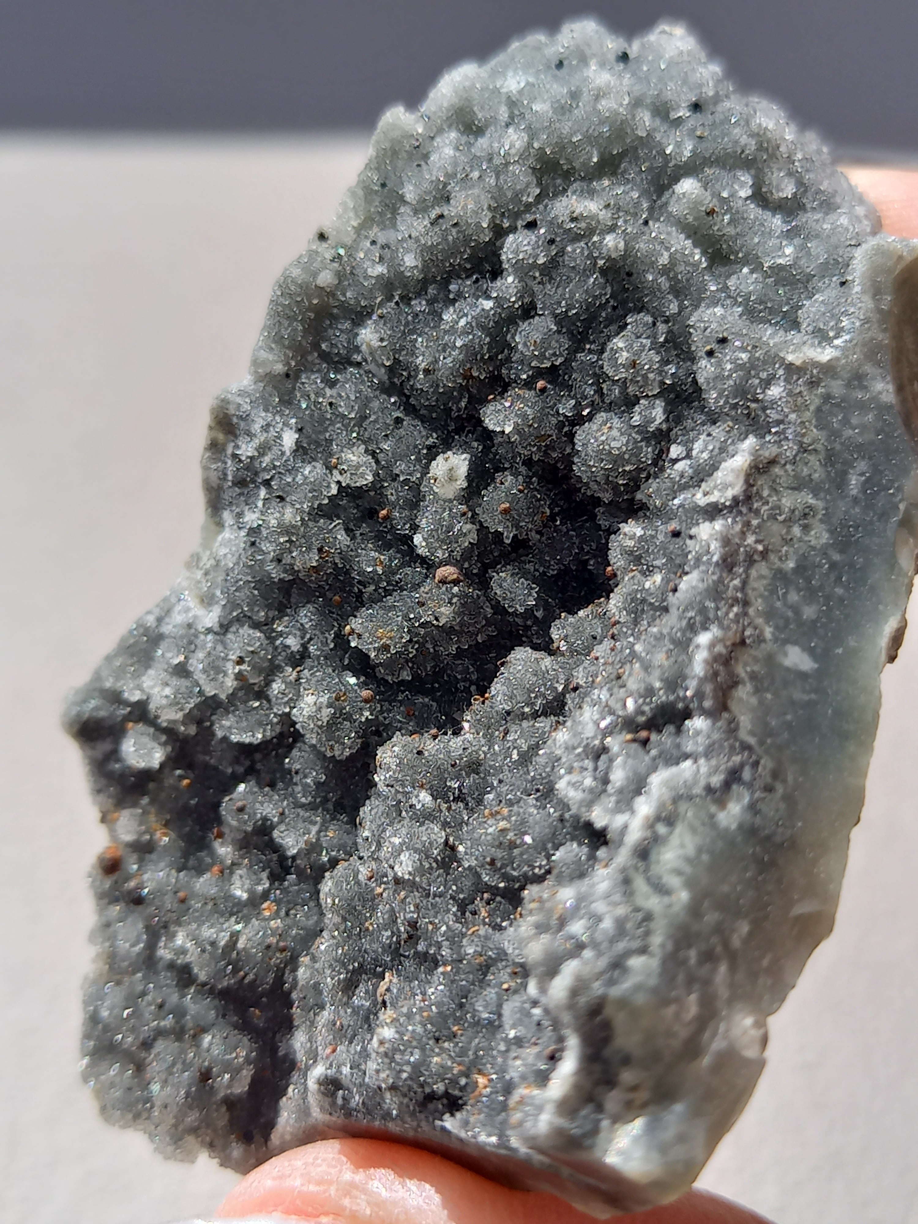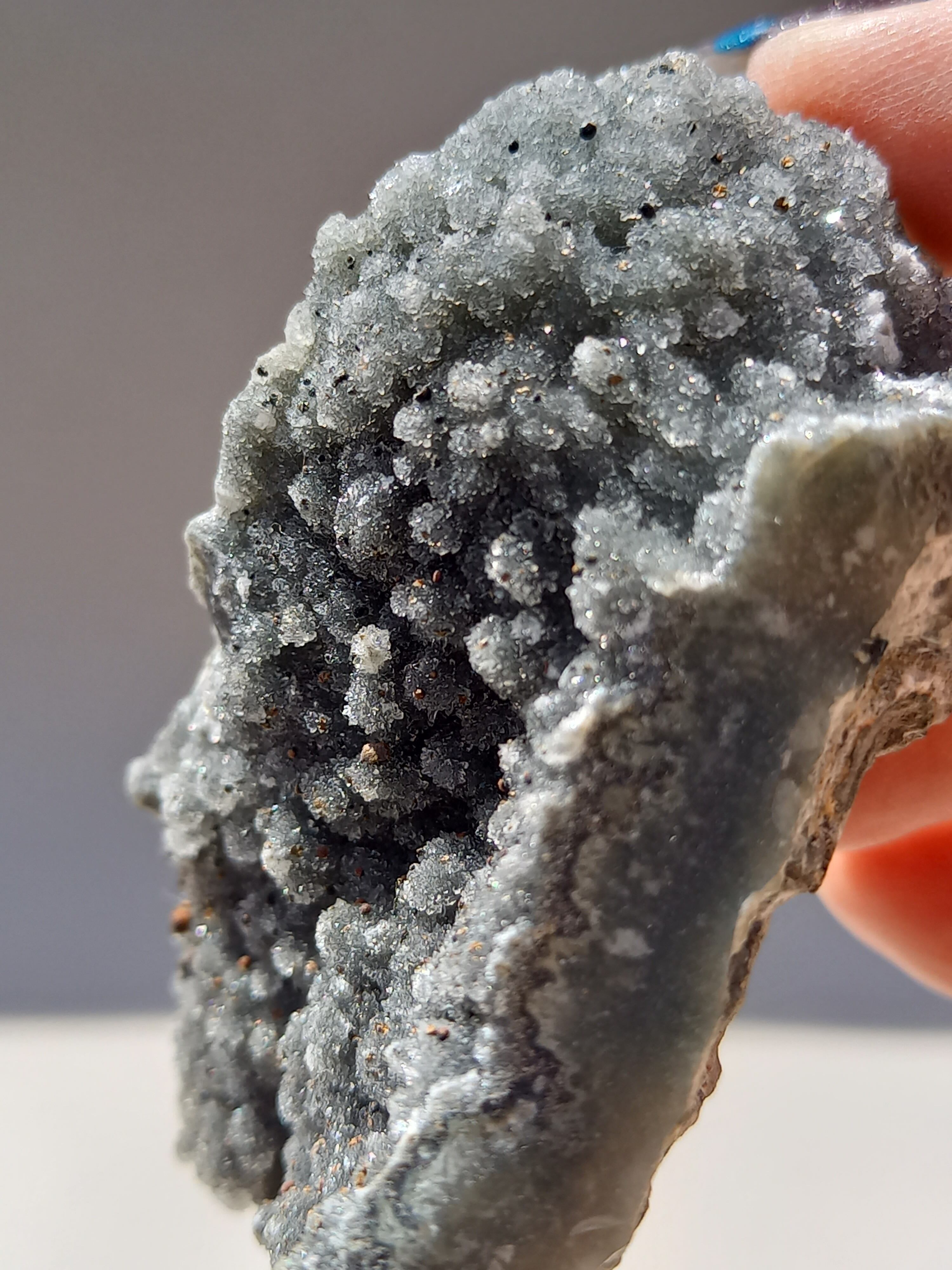アメジスト原石の表面に水晶のドゥルージーが結晶しています。 これは若い結晶で、いわゆる赤ちゃんや子供のようなものです。 キラキラ輝く姿が砂糖菓子をまぶしたように見えることからシュガーアメジストと呼ばれます。