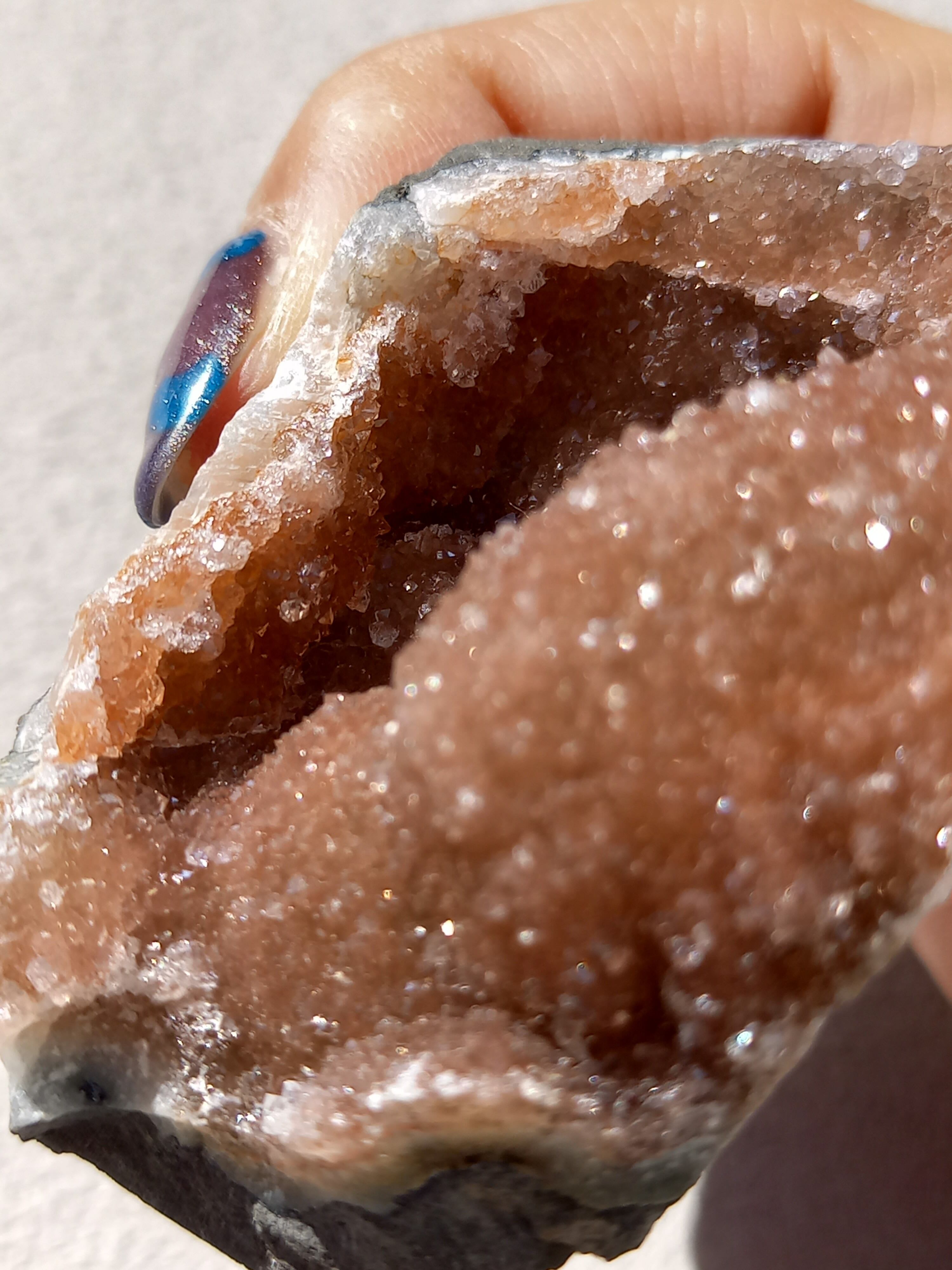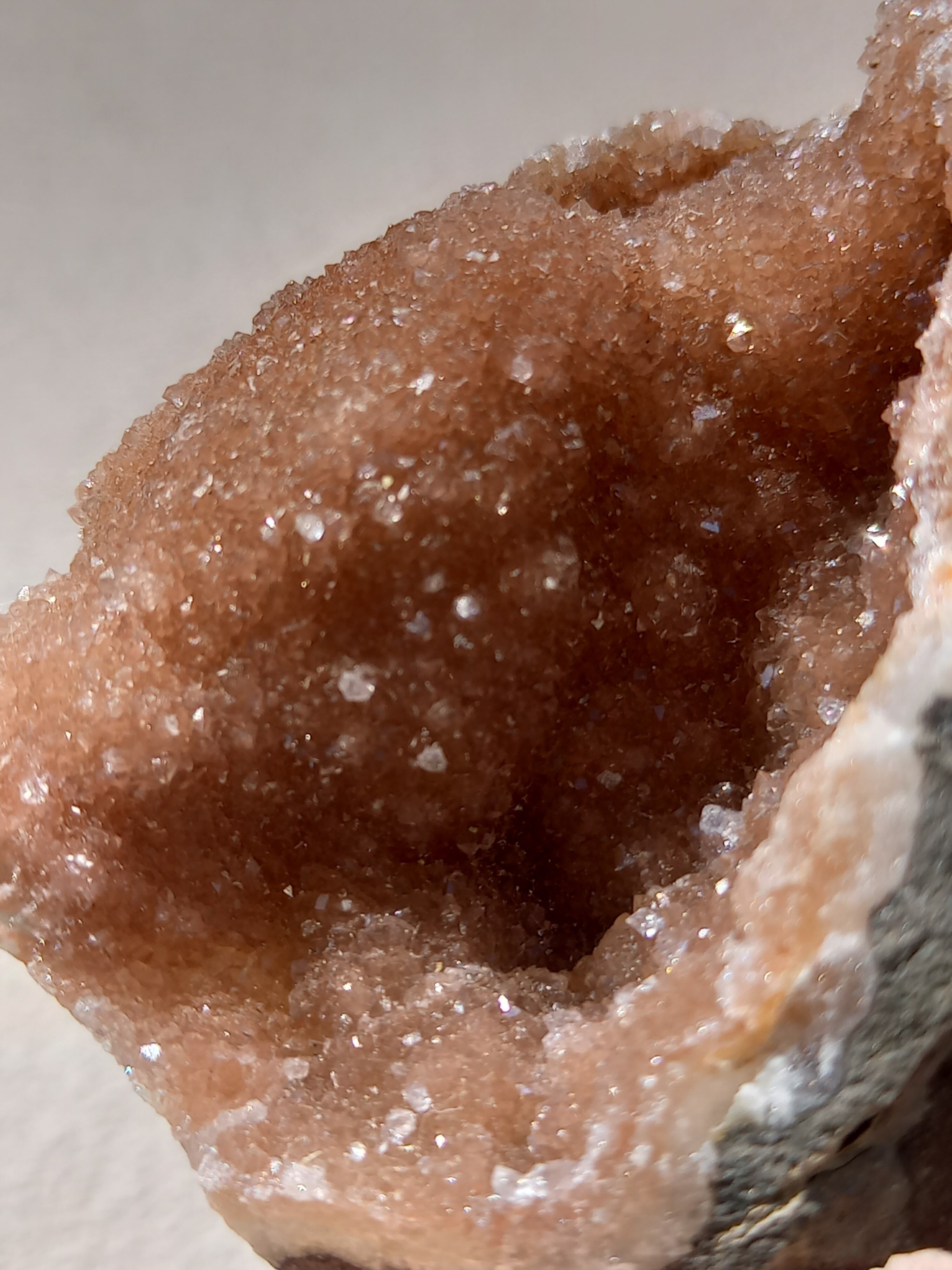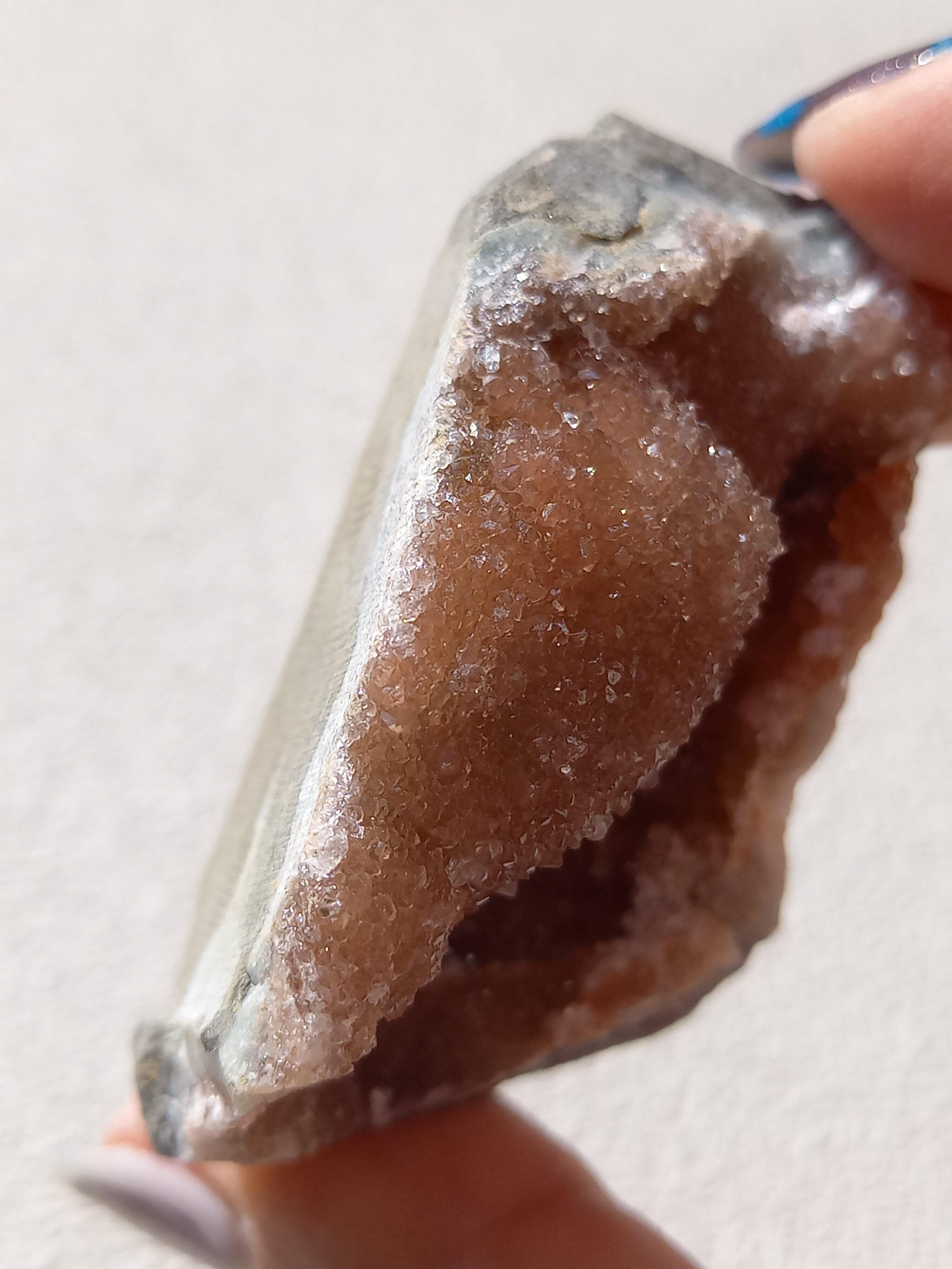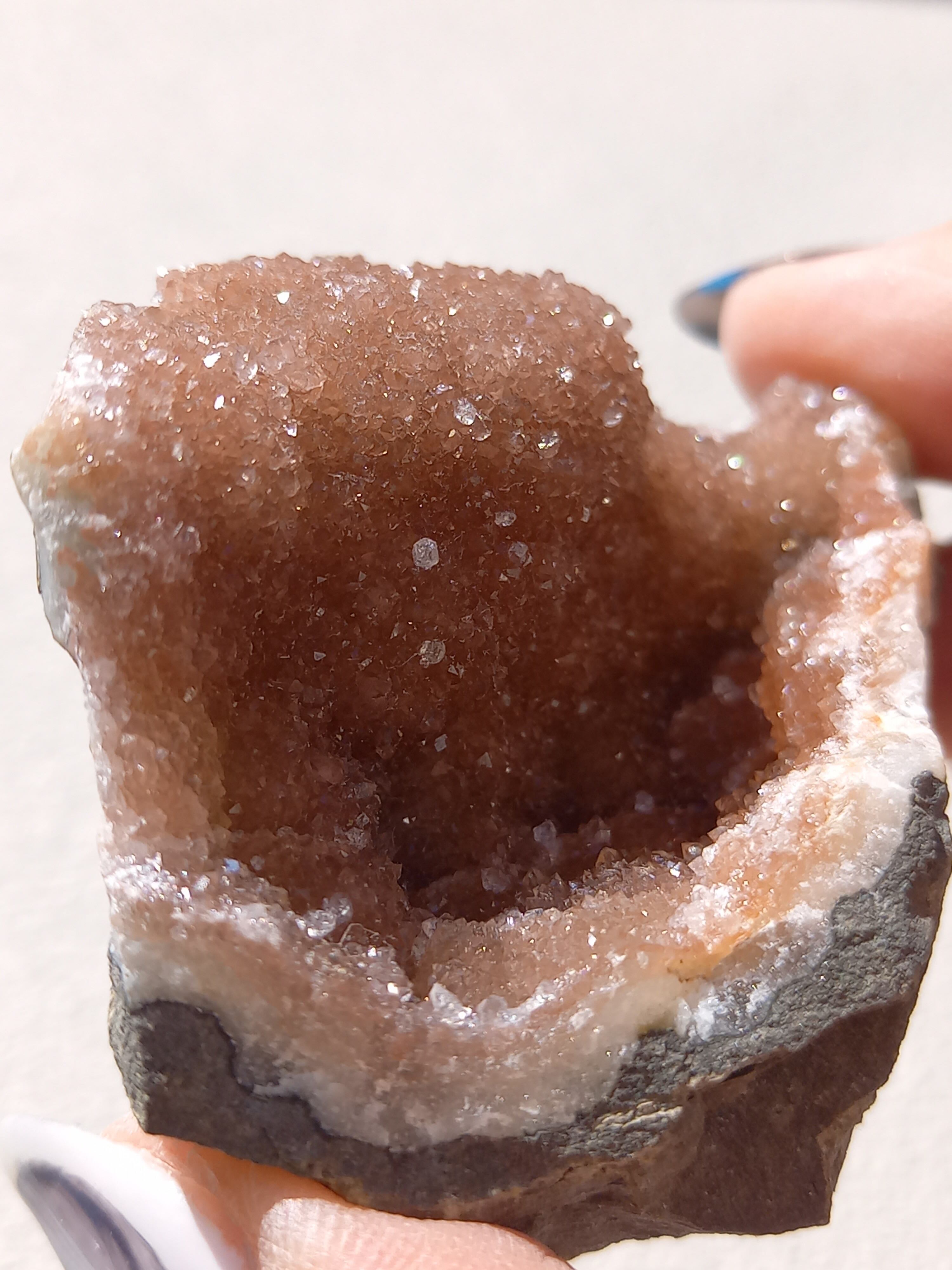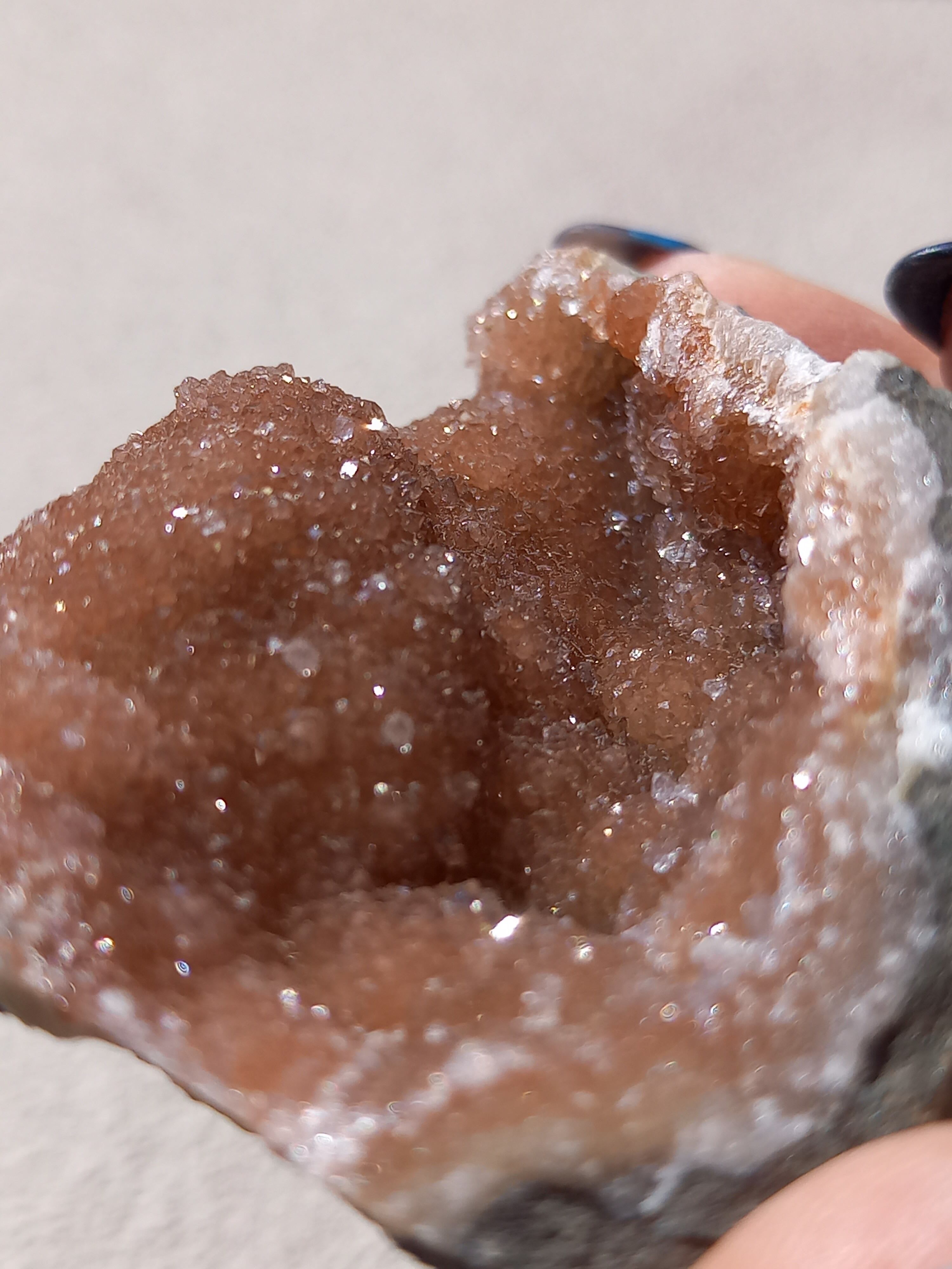アメジスト原石の表面に水晶のドゥルージーが結晶しています。 これは若い結晶で、いわゆる赤ちゃんや子供のようなものです。 キラキラ輝く姿が砂糖菓子をまぶしたように見えることからシュガーアメジストと呼ばれます。