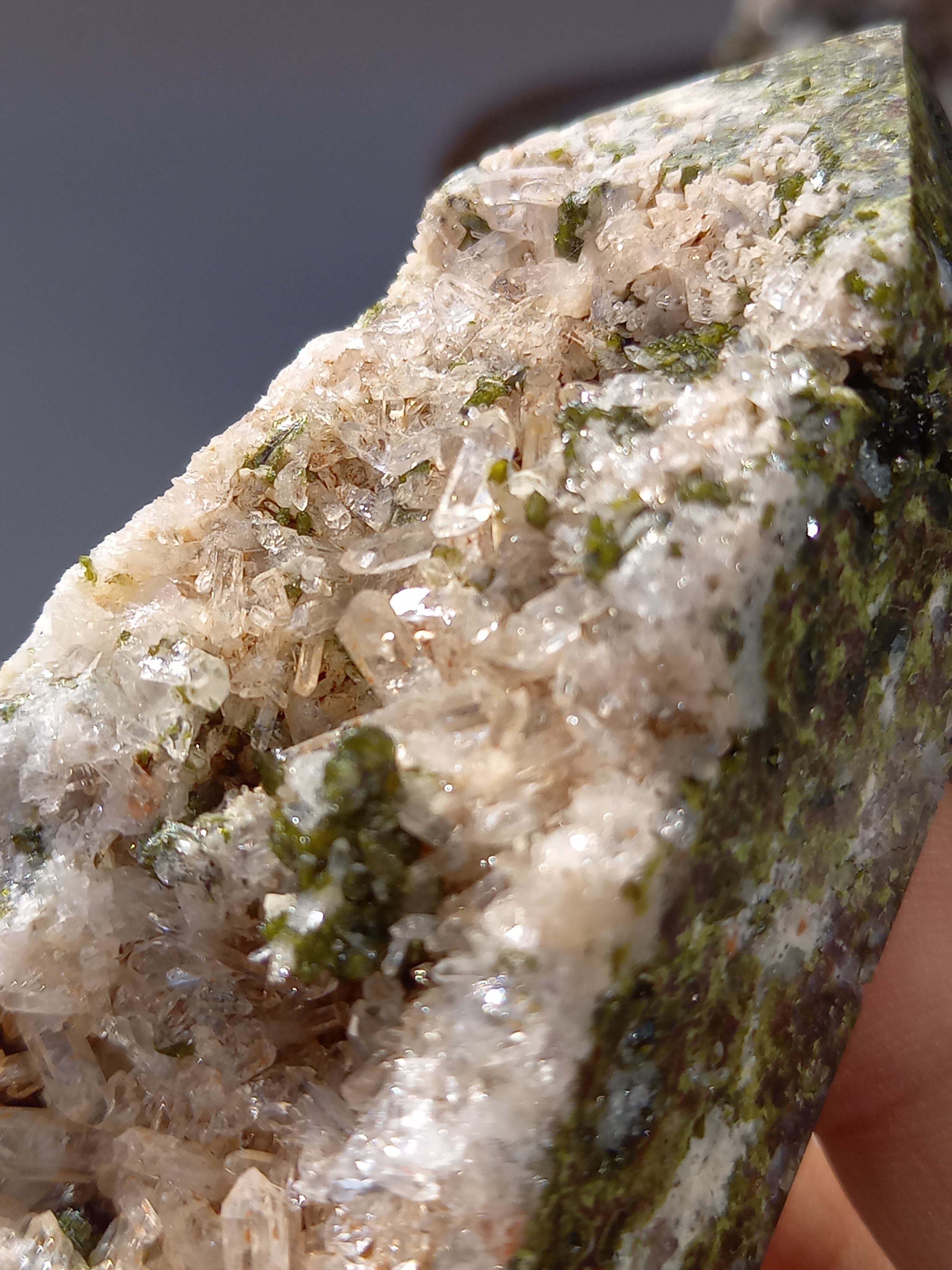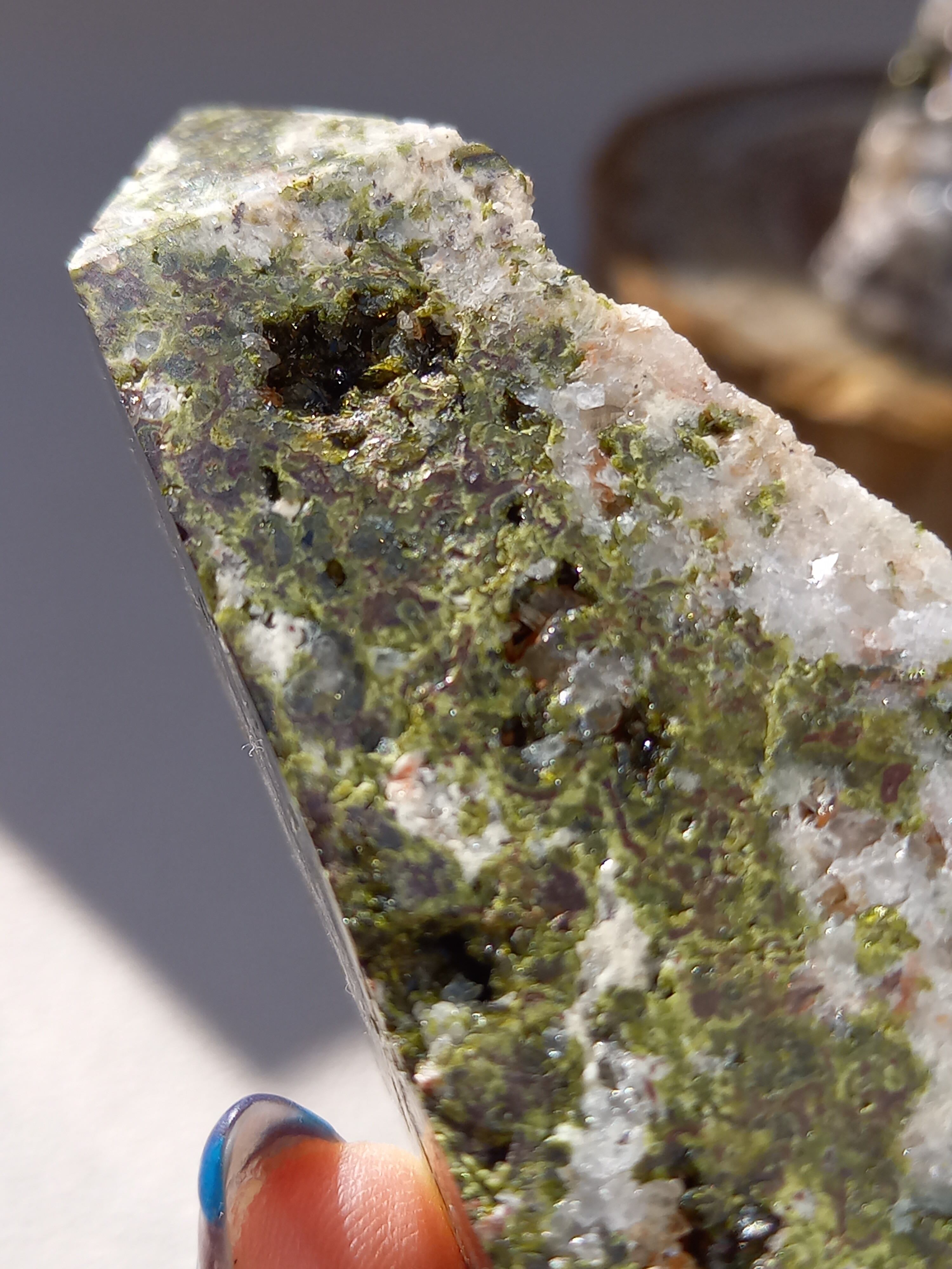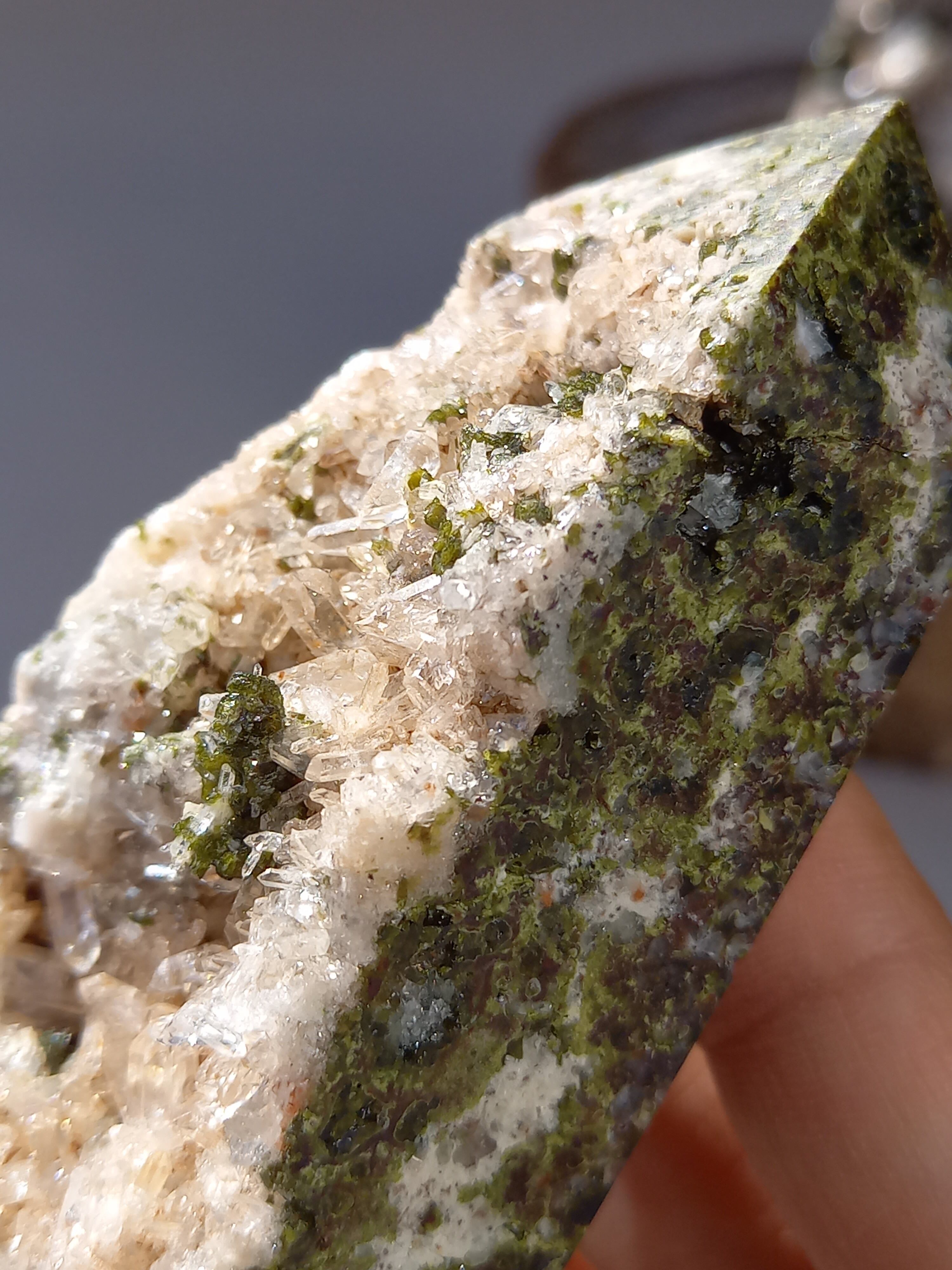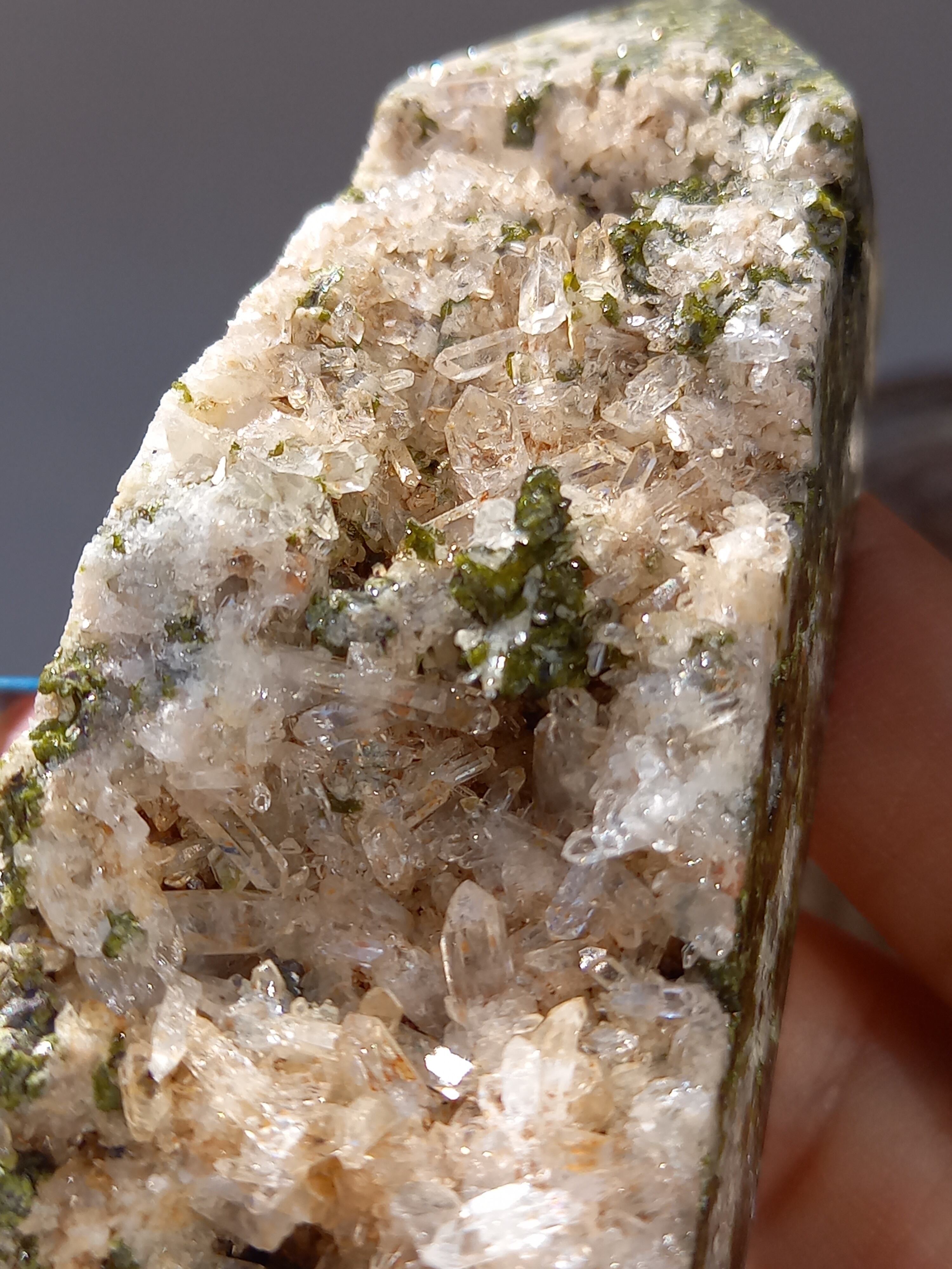 原石面を残した一面は、まさに鉱物標本のように、しっかりクォーツのポイント部分や、エピドートのキラキラした結晶面も見られます。