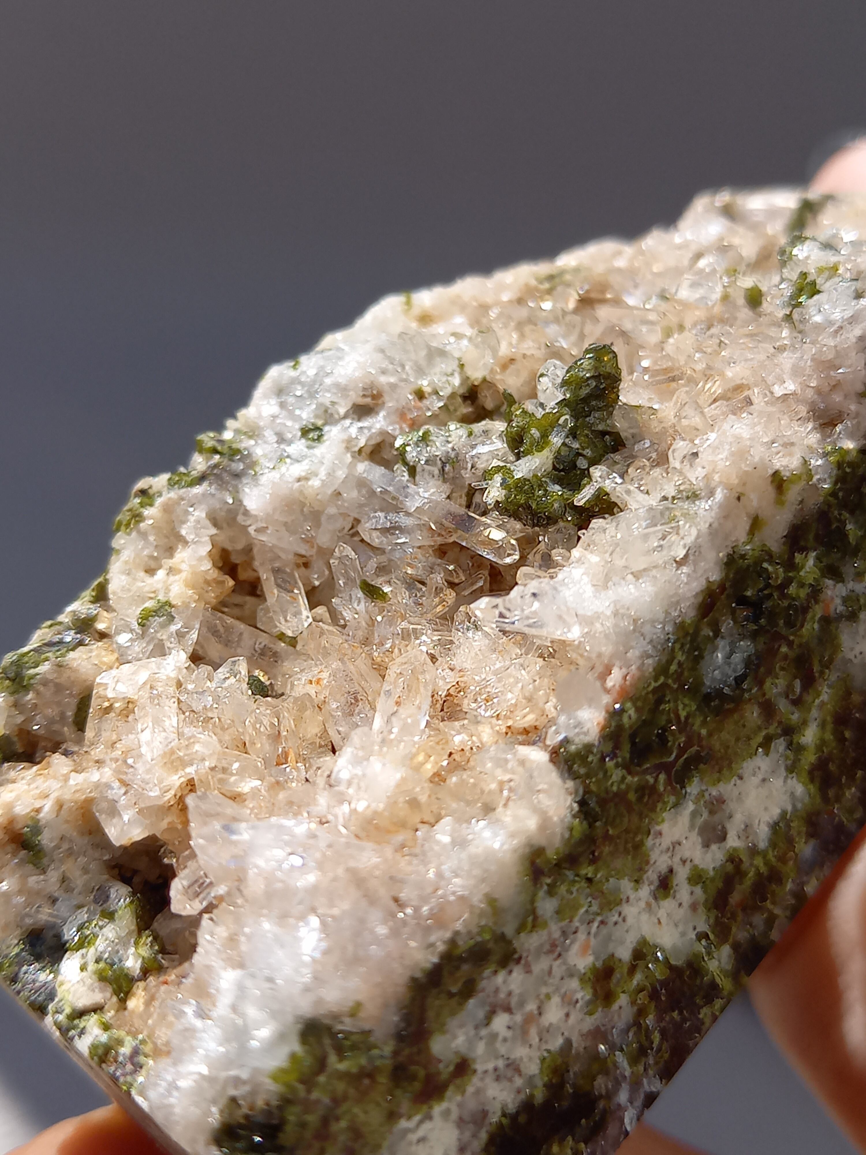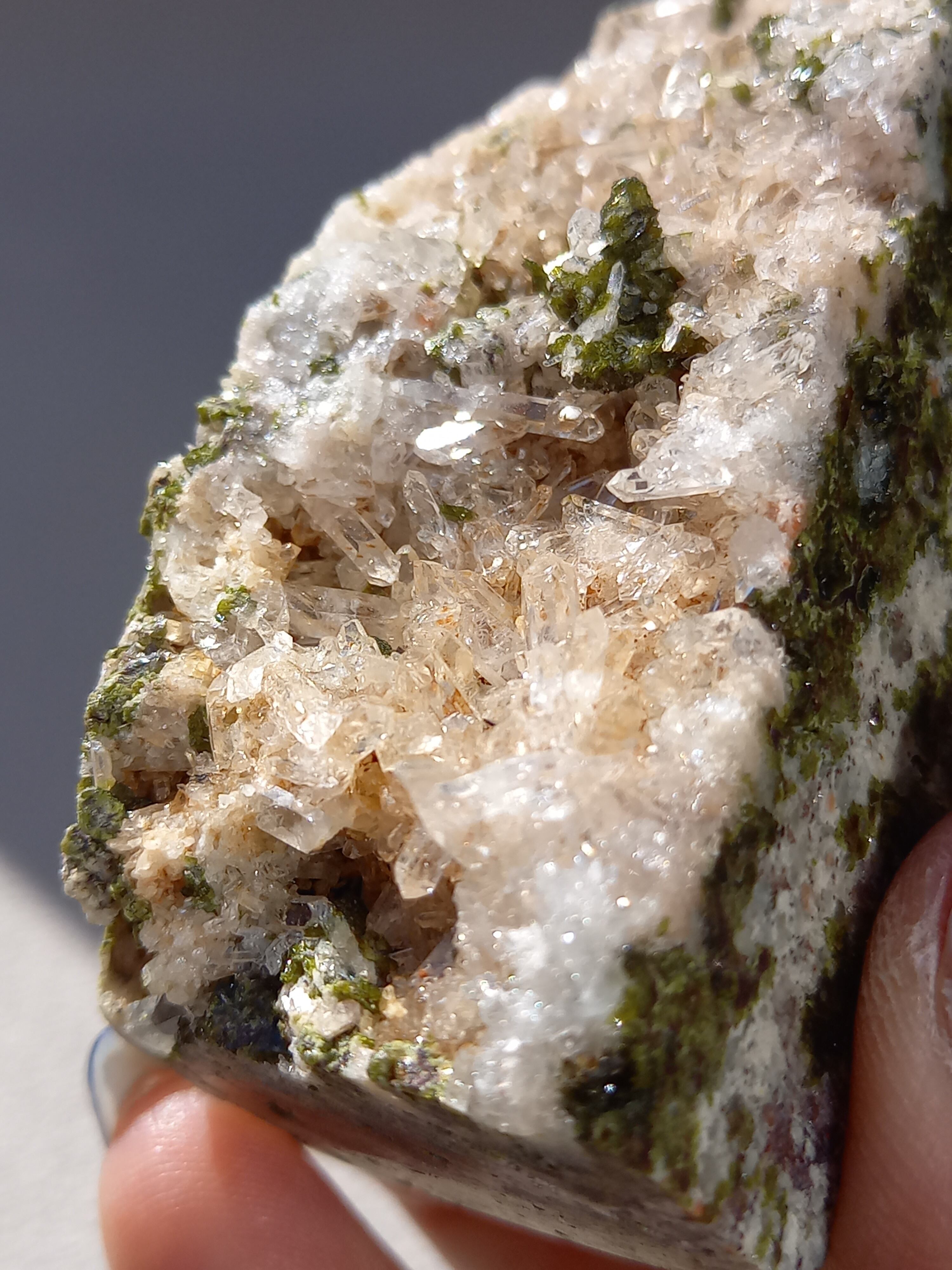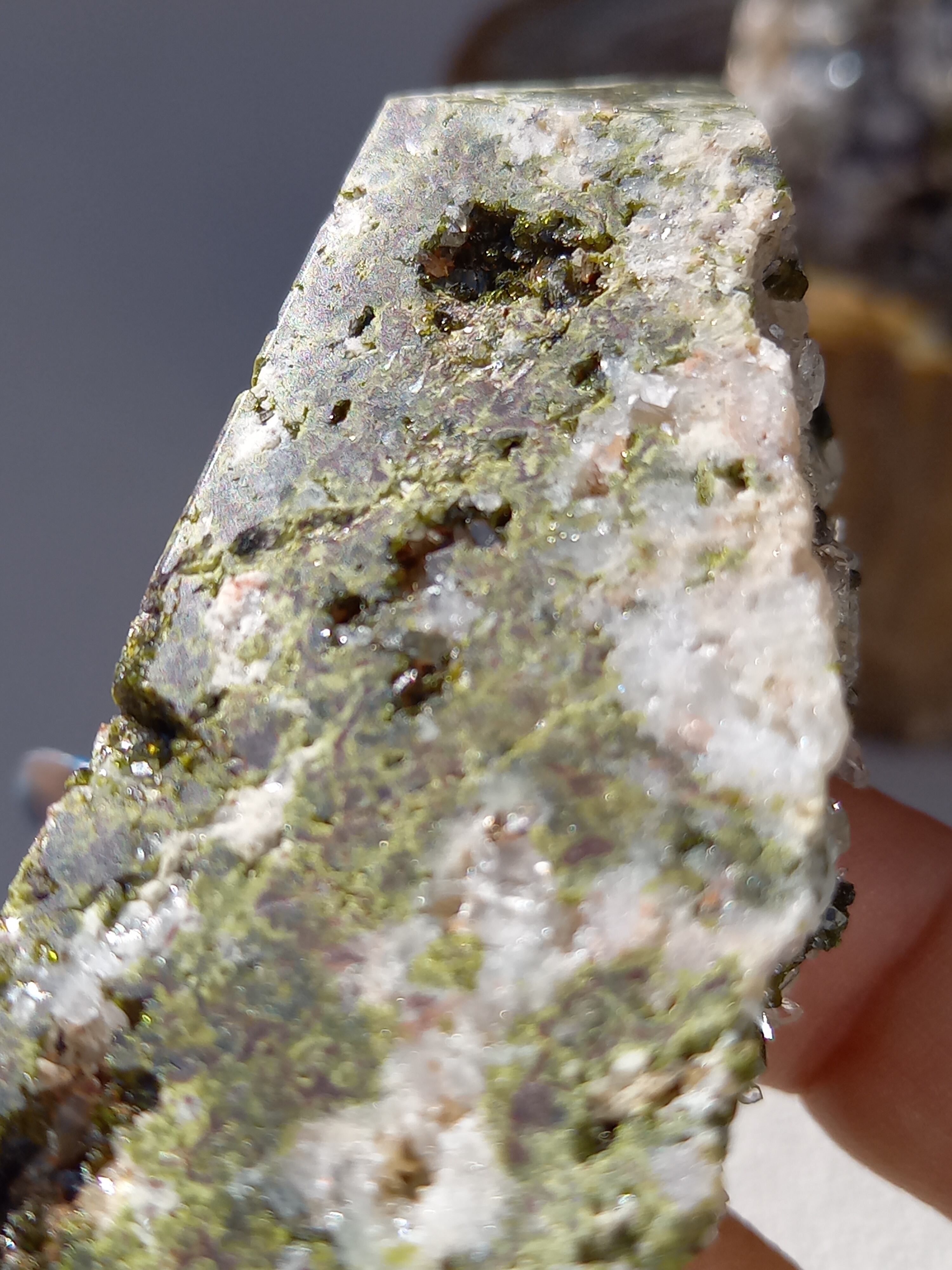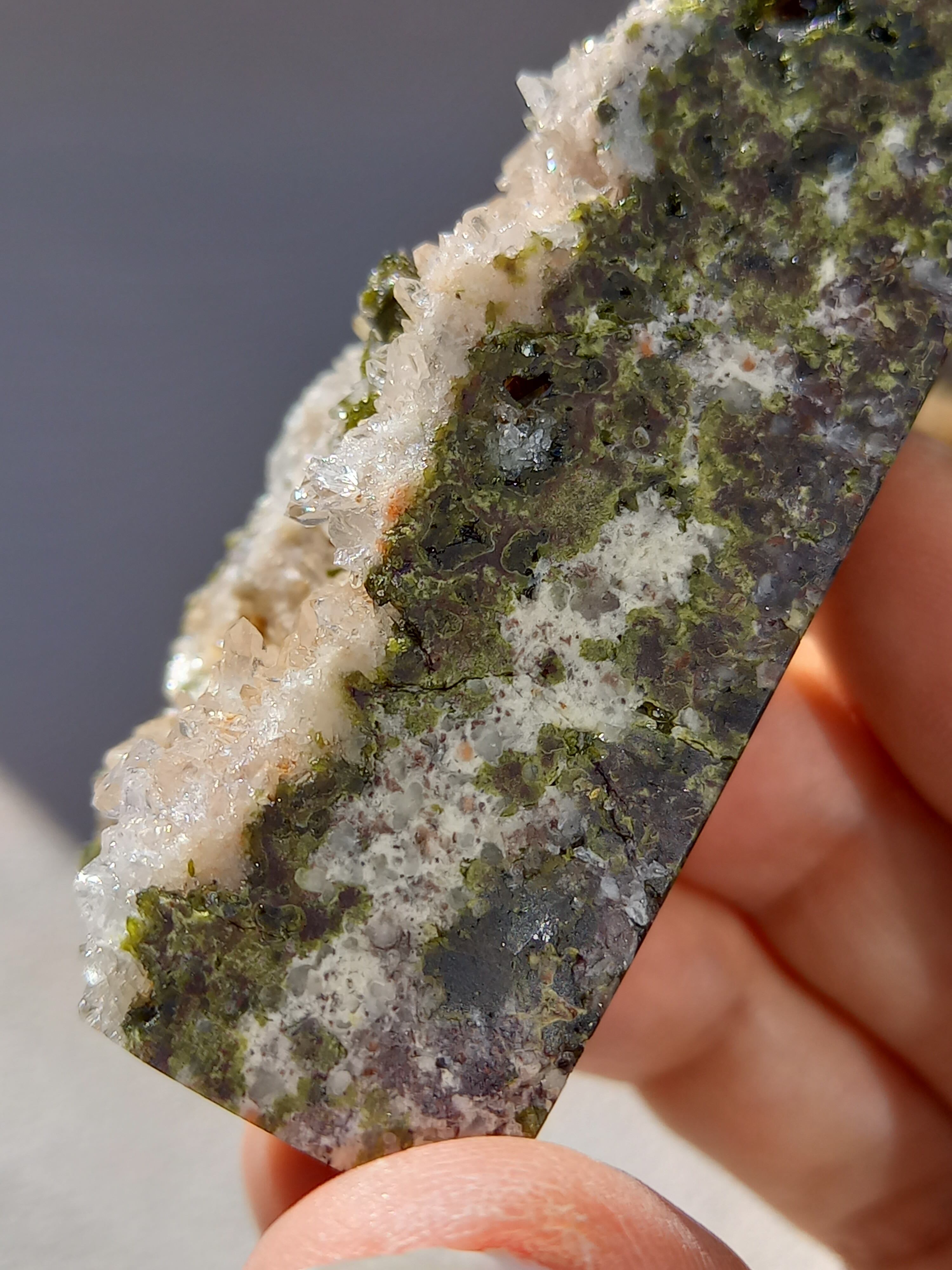 原石面を残した一面は、まさに鉱物標本のように、しっかりクォーツのポイント部分や、エピドートのキラキラした結晶面も見られます。