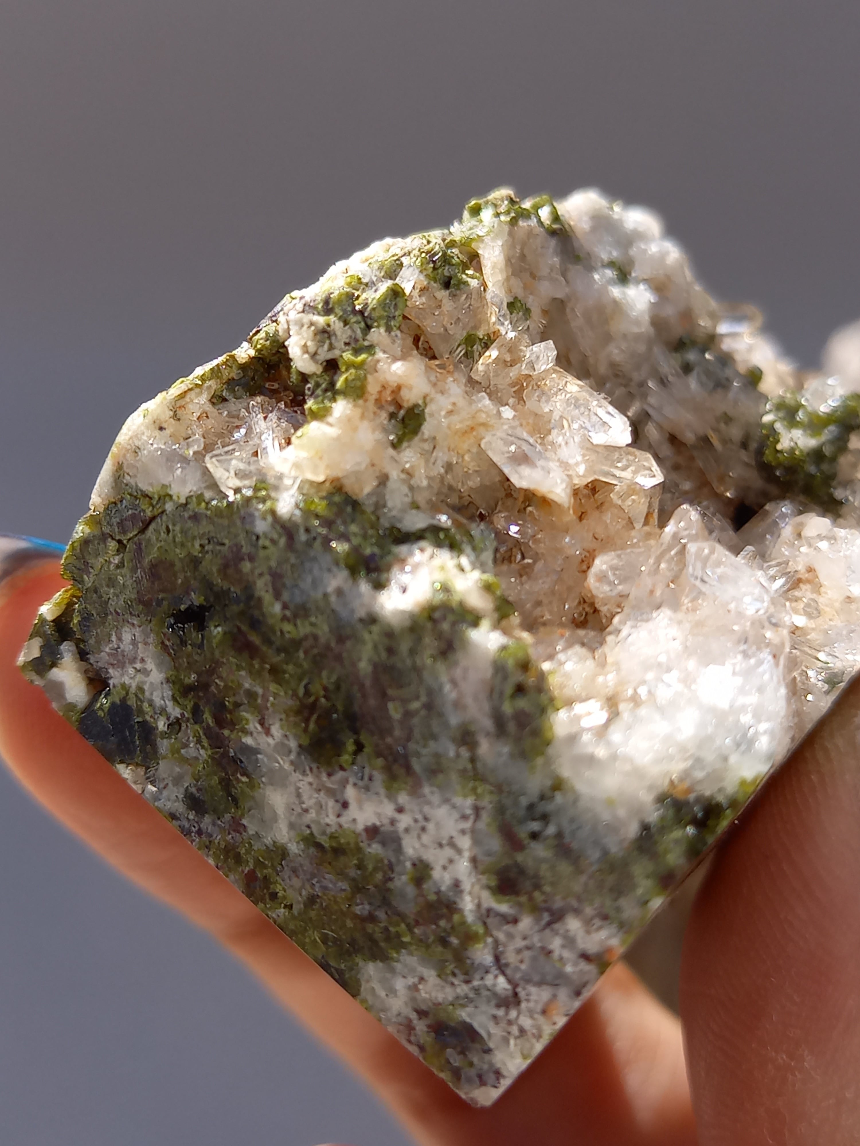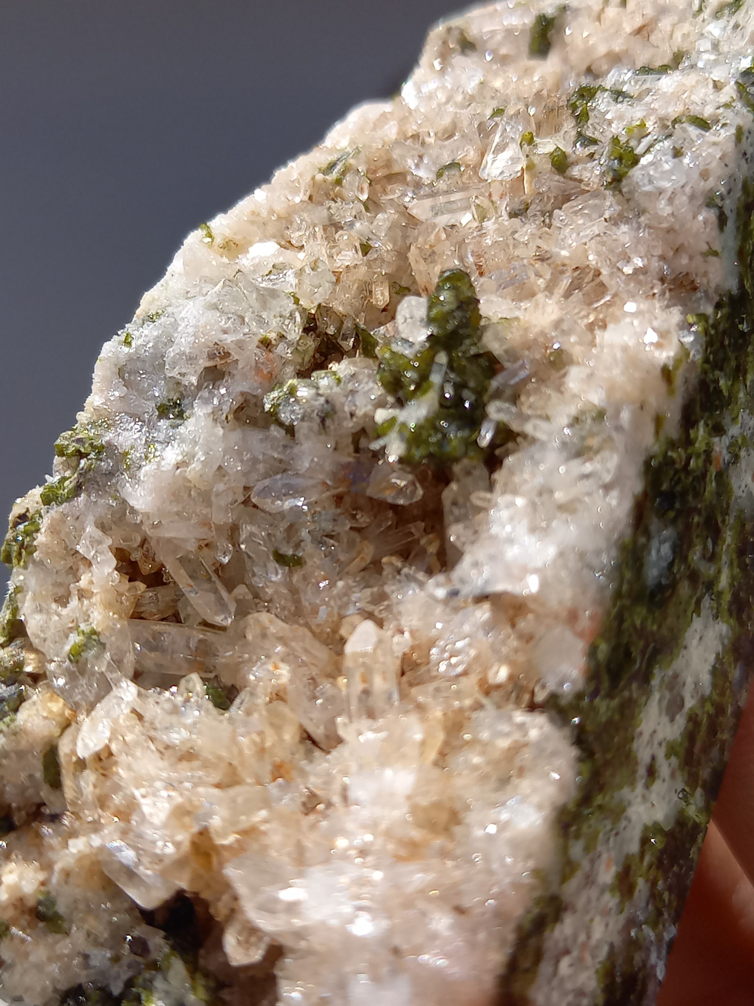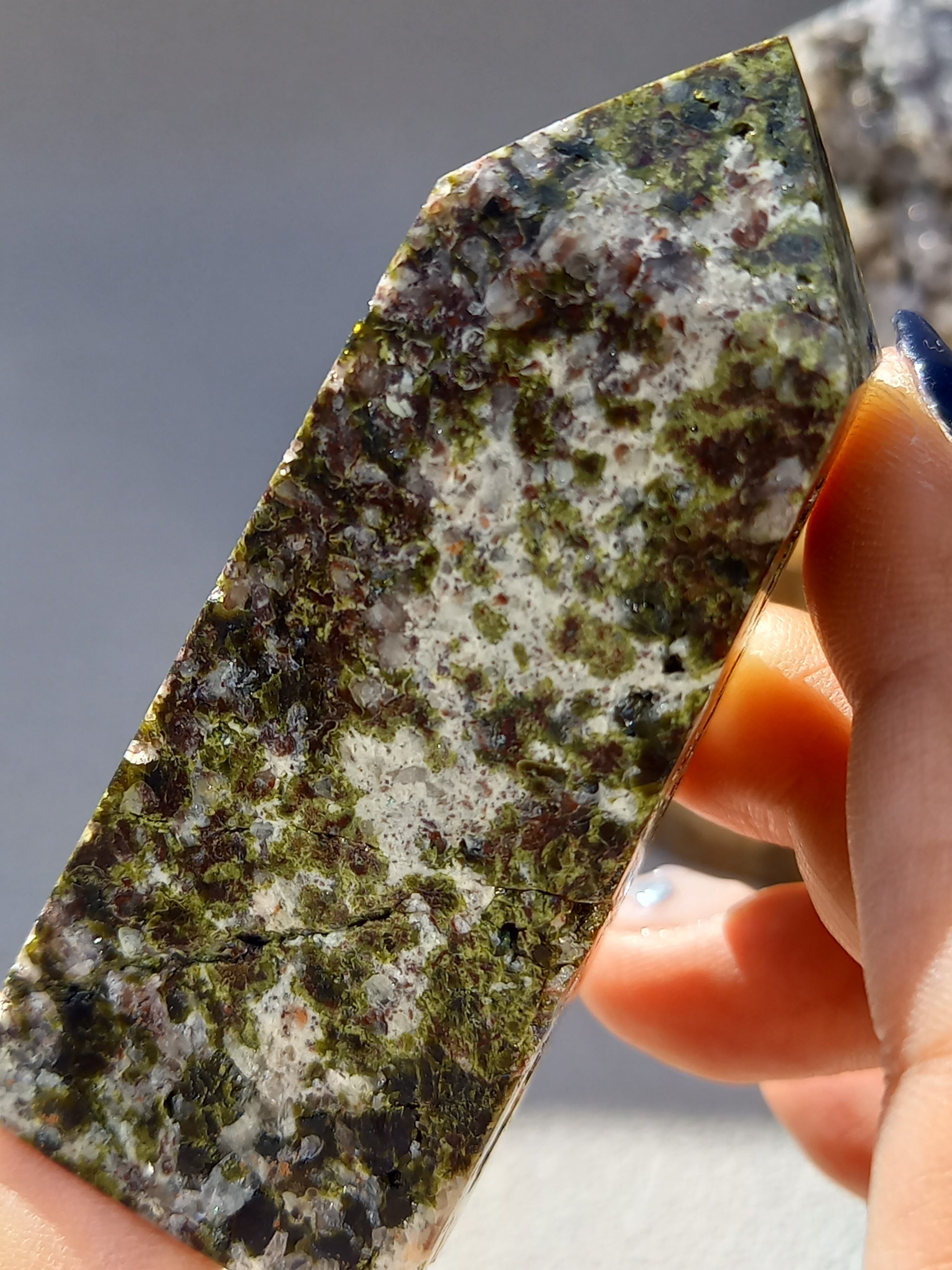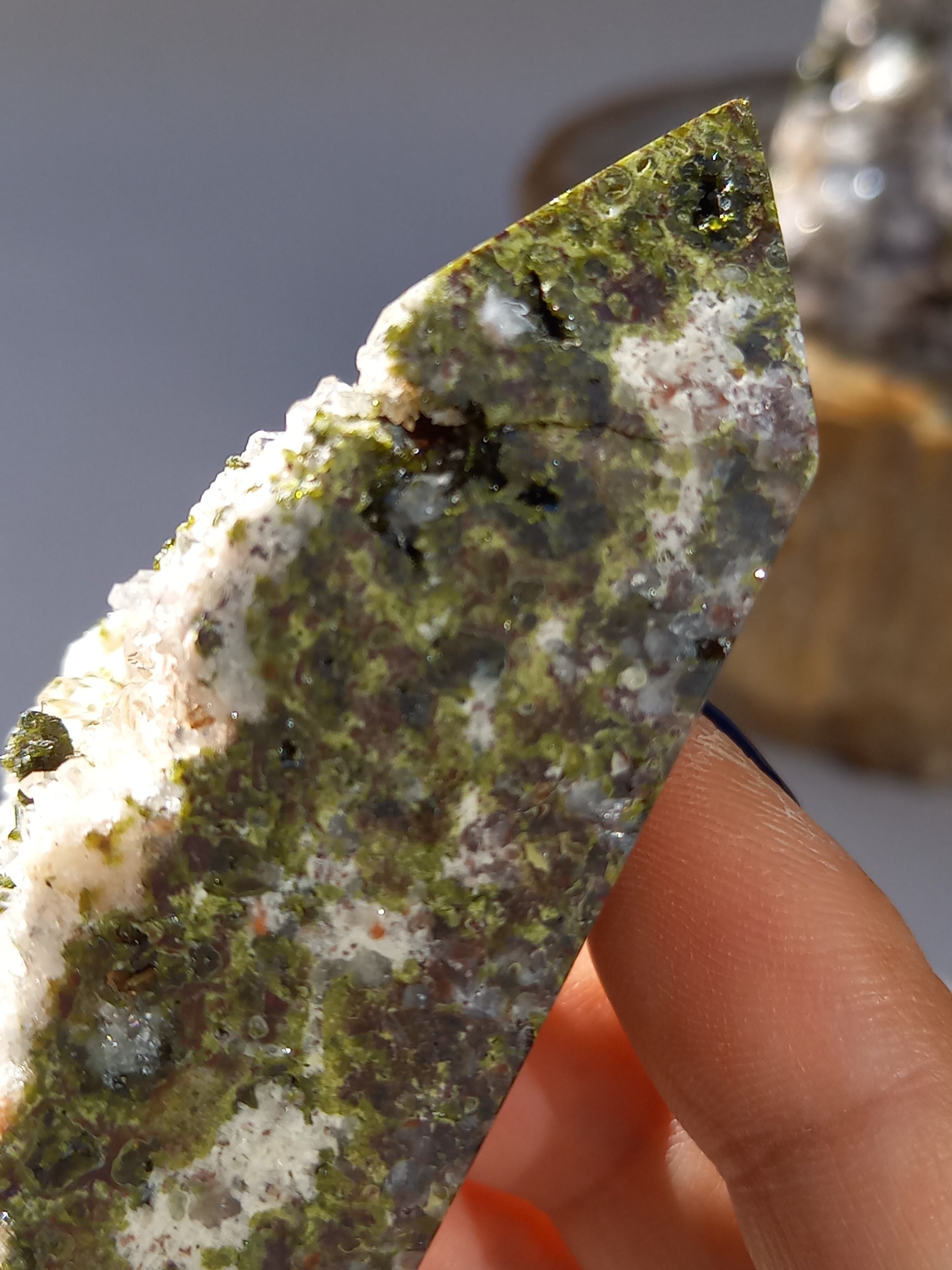 原石面を残した一面は、まさに鉱物標本のように、しっかりクォーツのポイント部分や、エピドートのキラキラした結晶面も見られます。