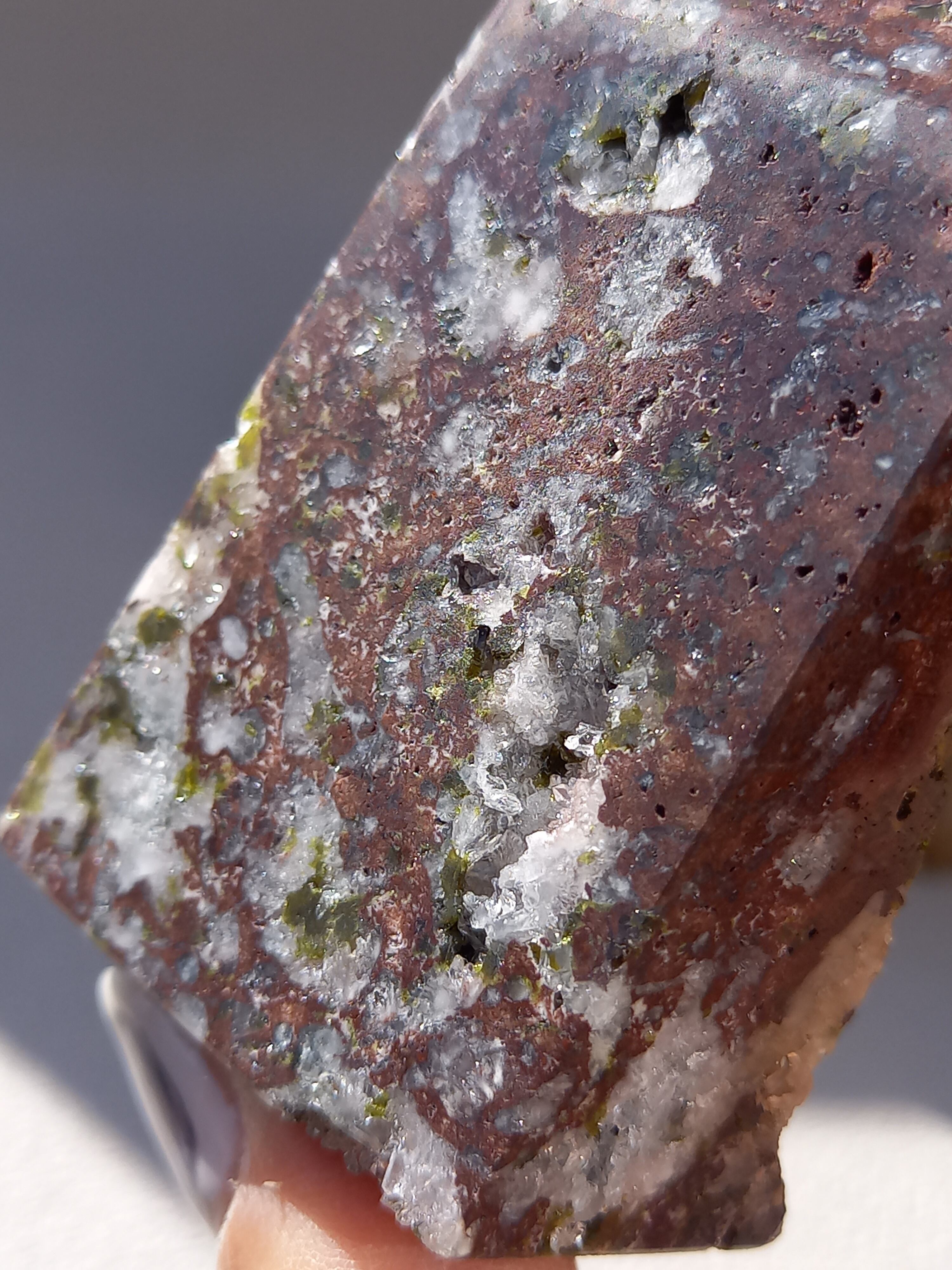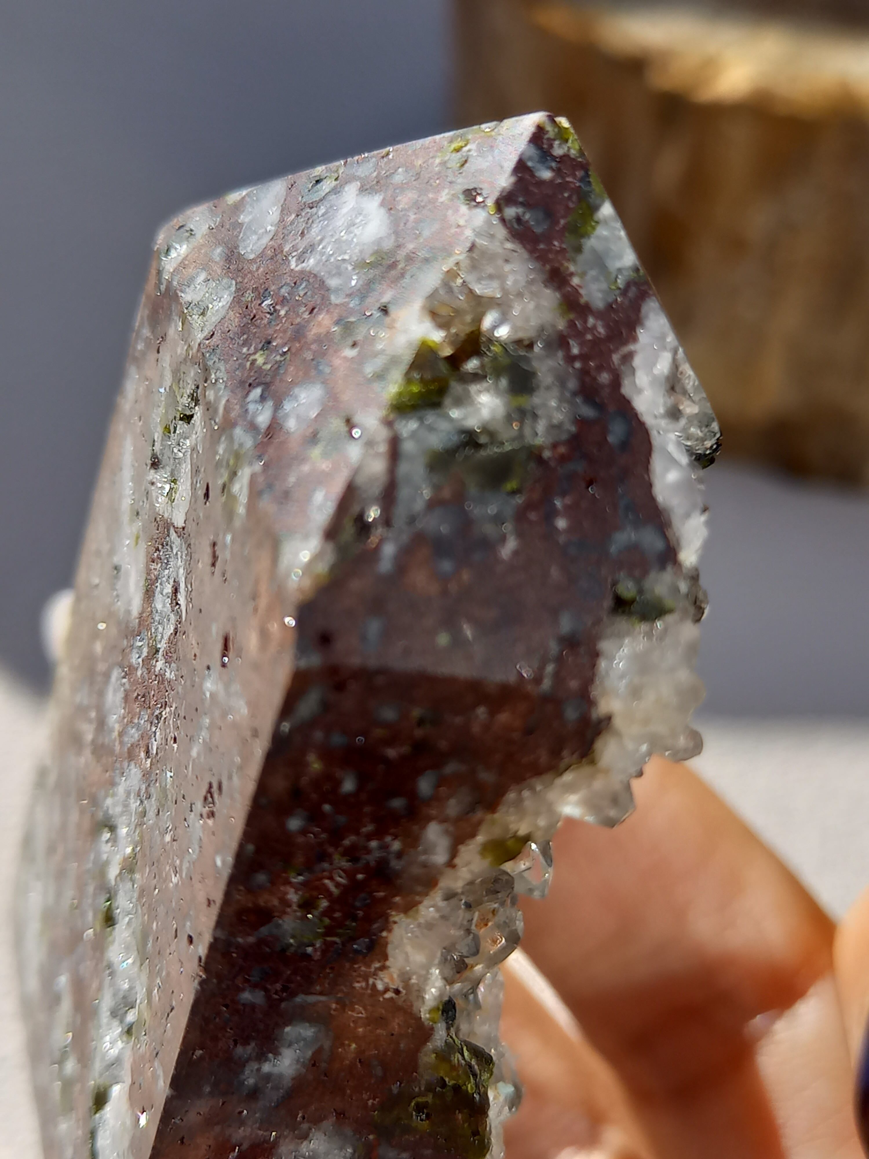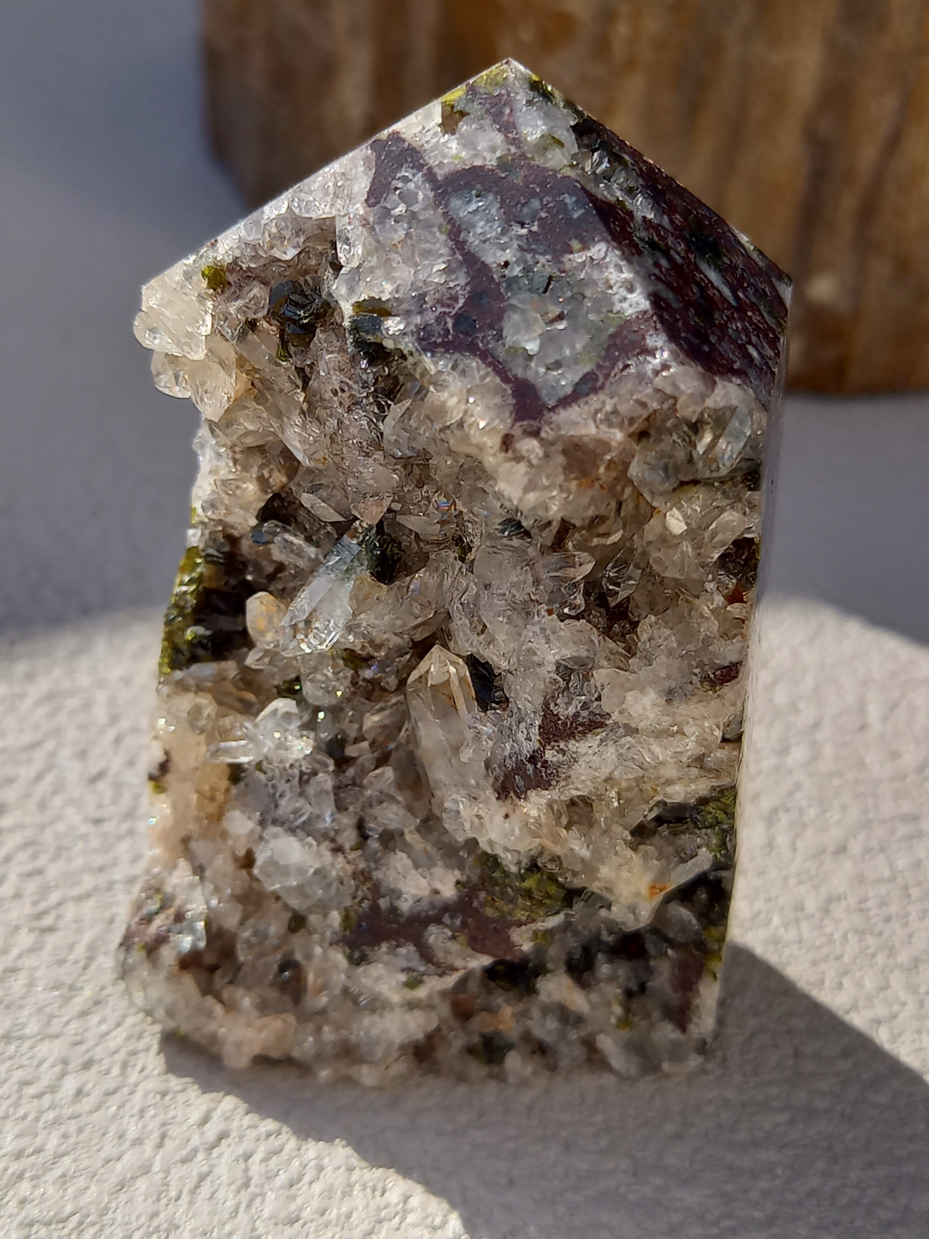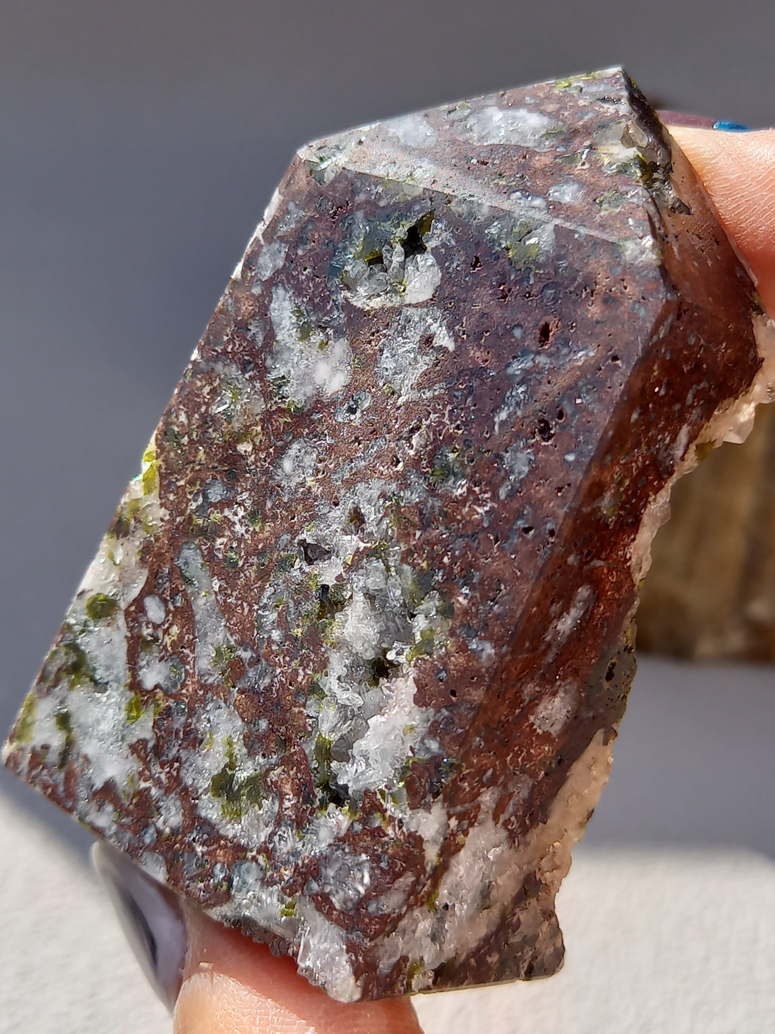 原石面を残した一面は、まさに鉱物標本のように、しっかりクォーツのポイント部分や、エピドートのキラキラした結晶面も見られます。
