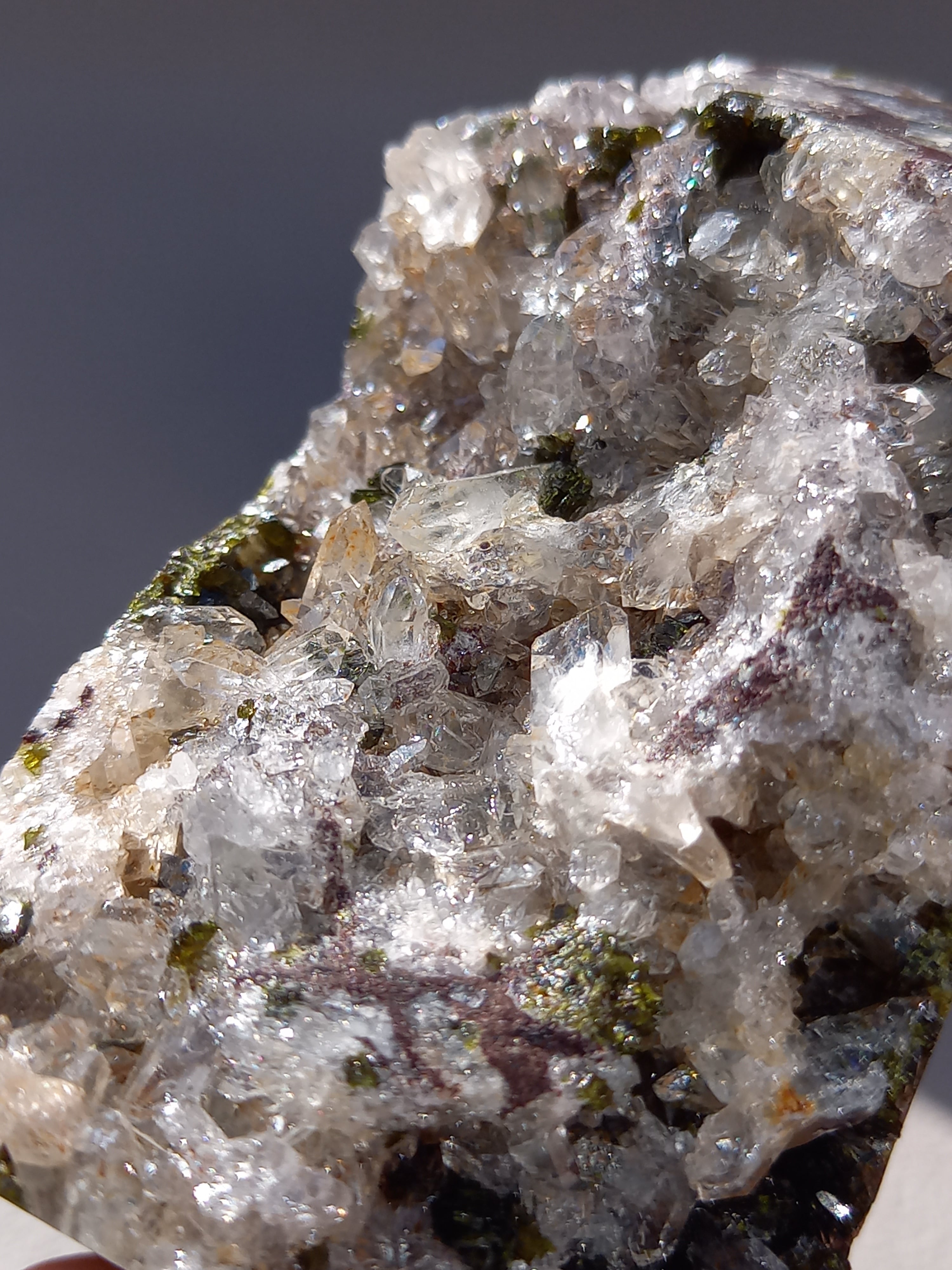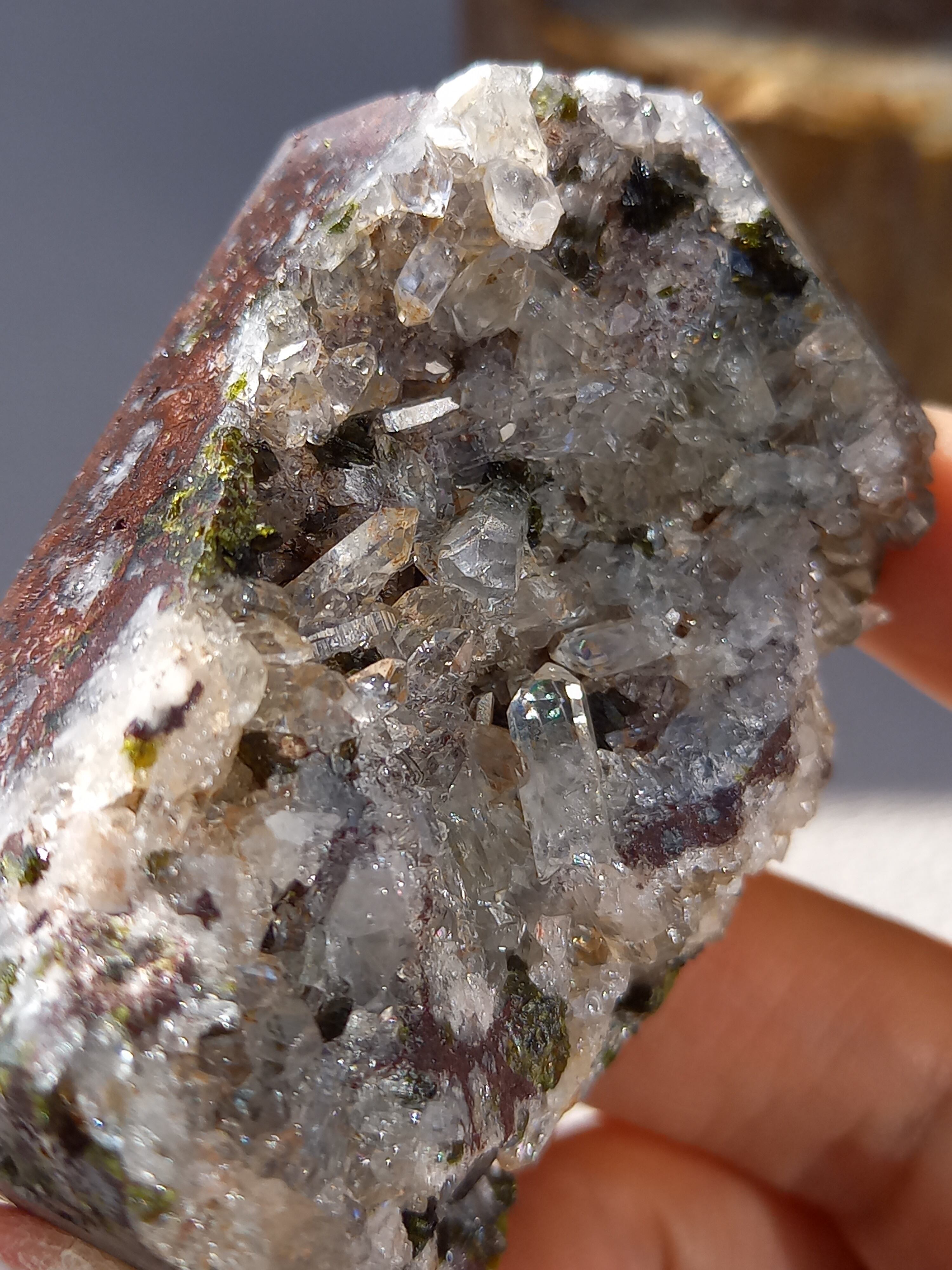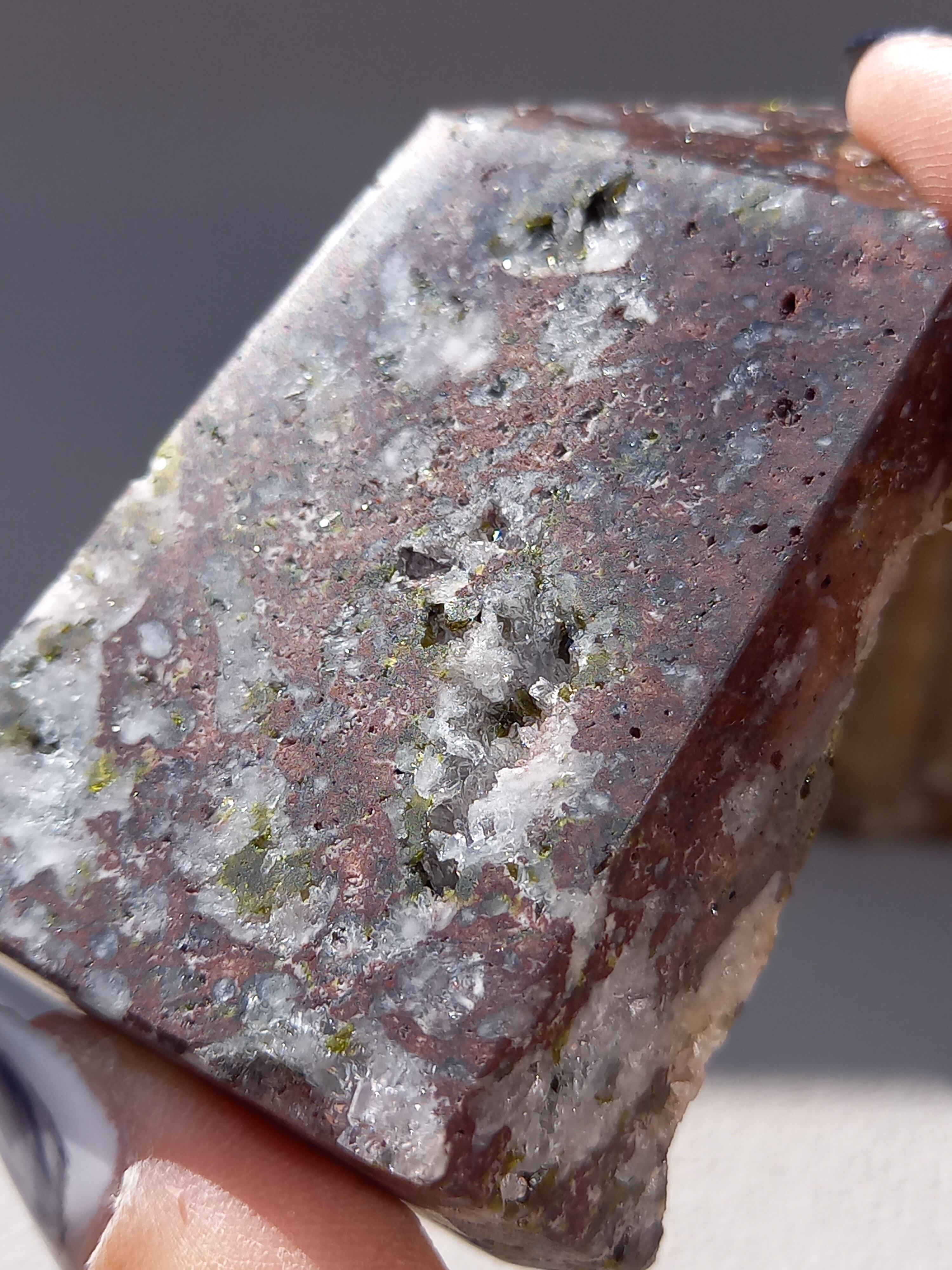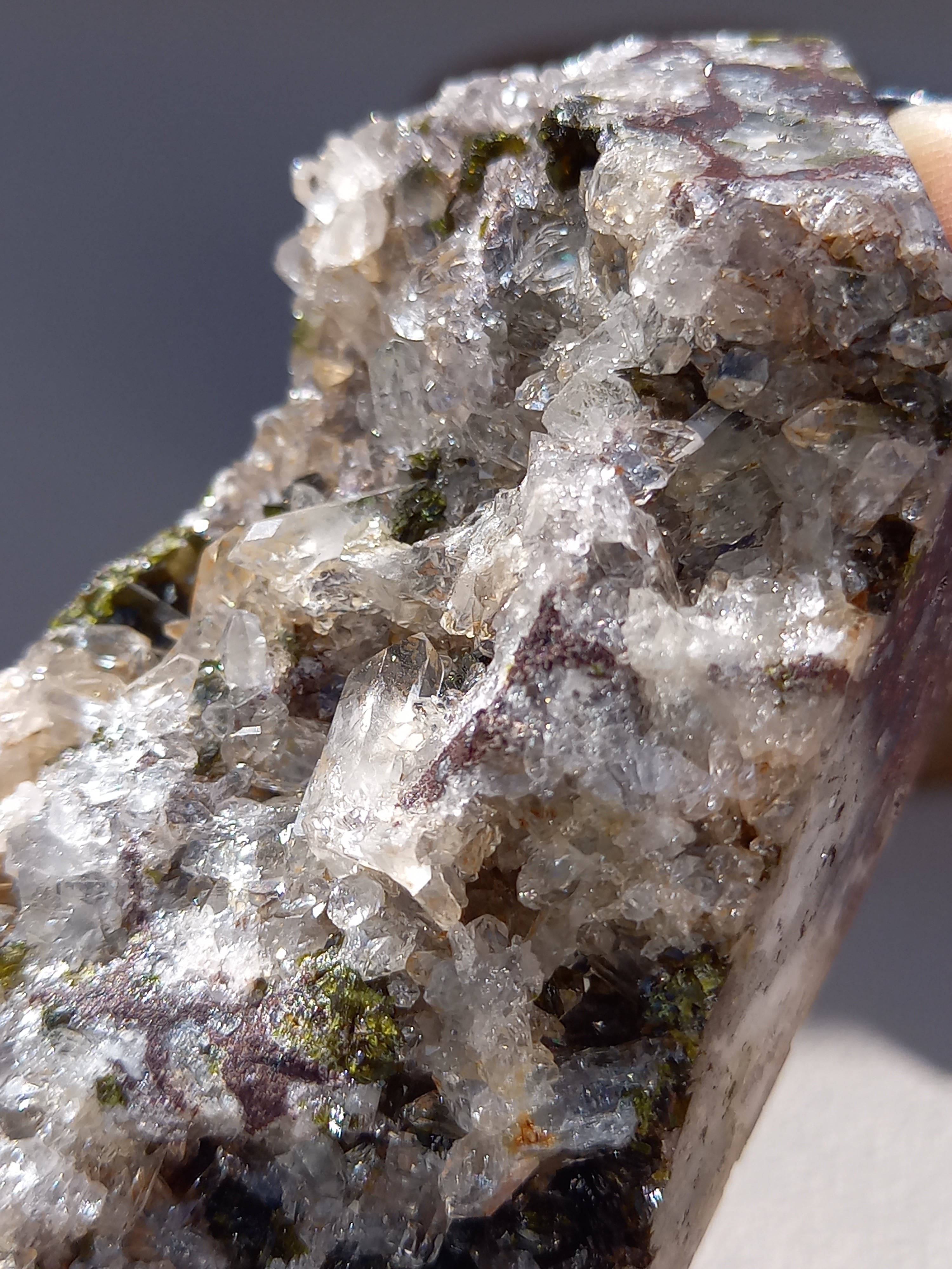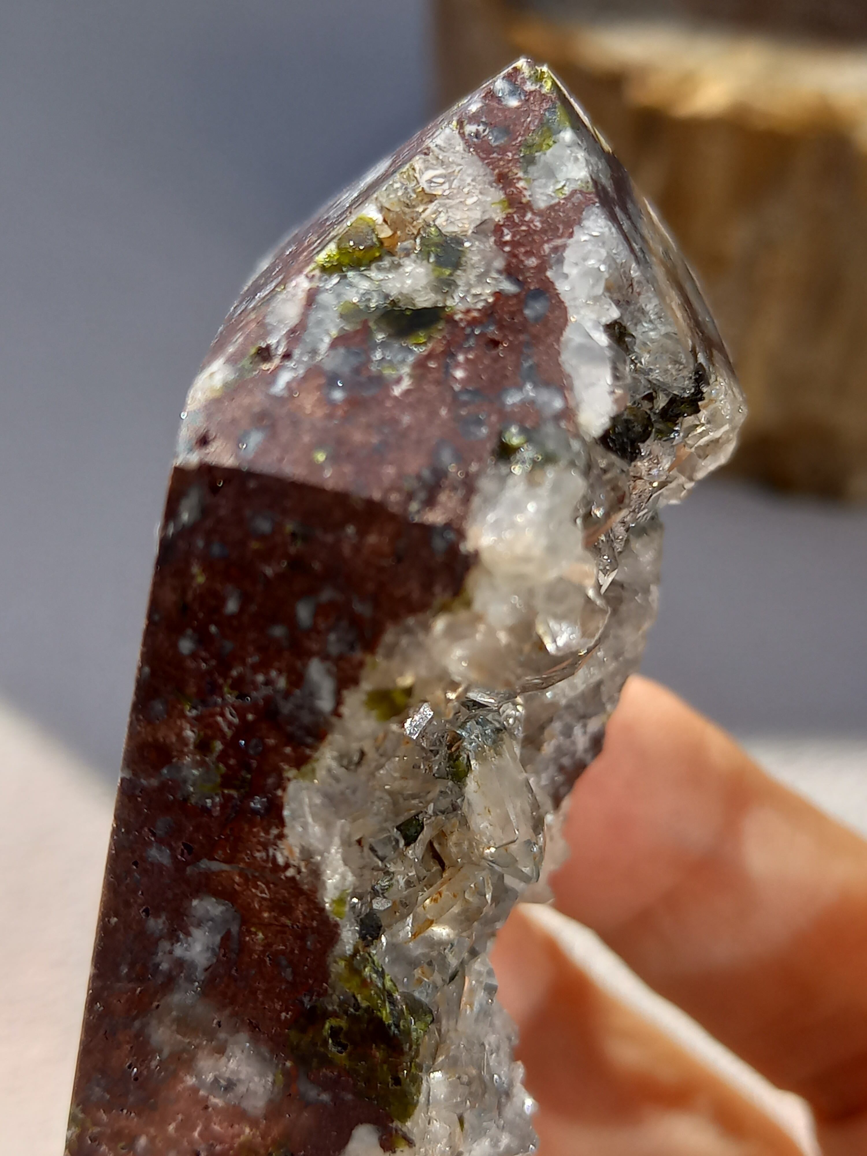 原石面を残した一面は、まさに鉱物標本のように、しっかりクォーツのポイント部分や、エピドートのキラキラした結晶面も見られます。