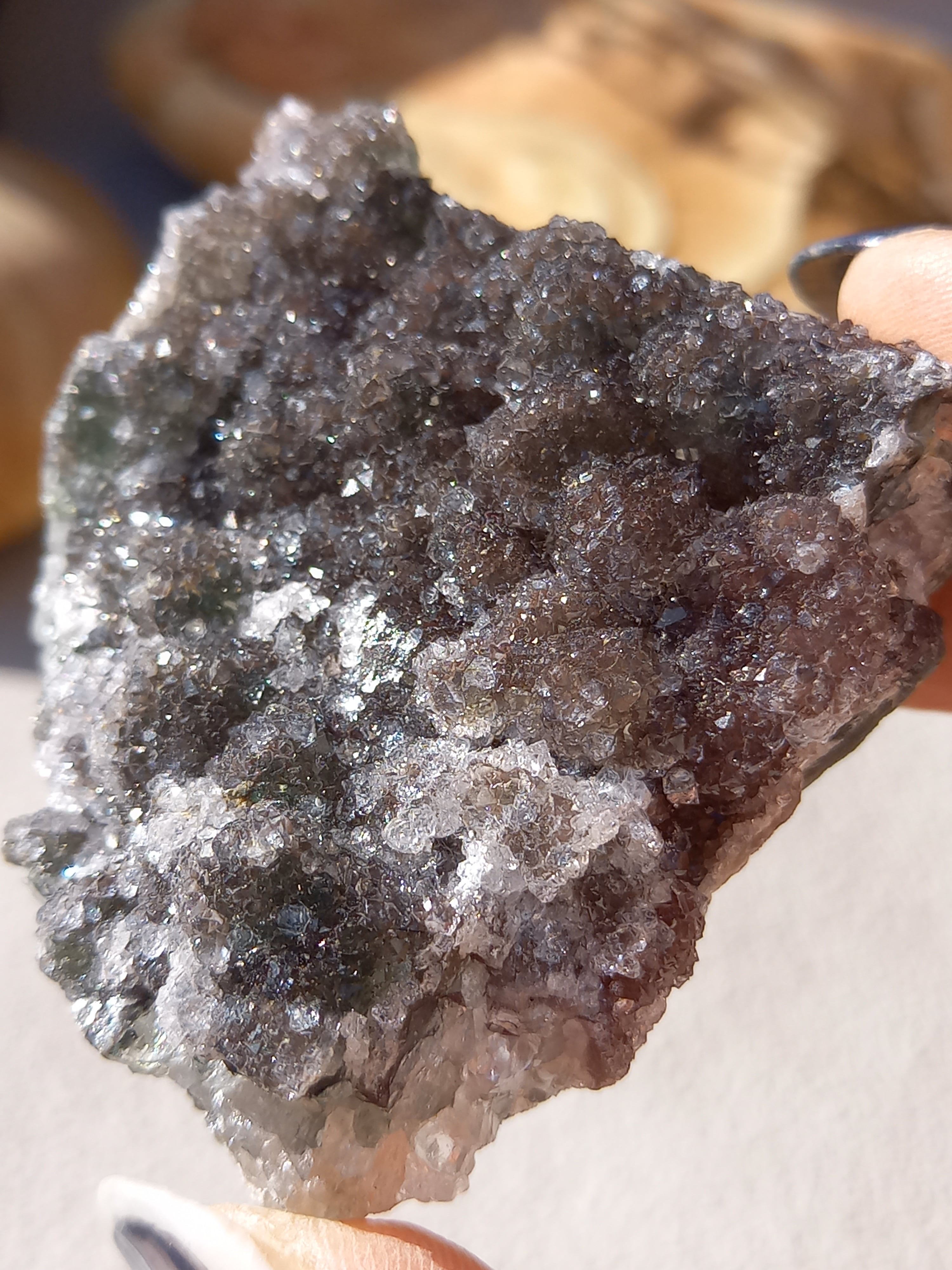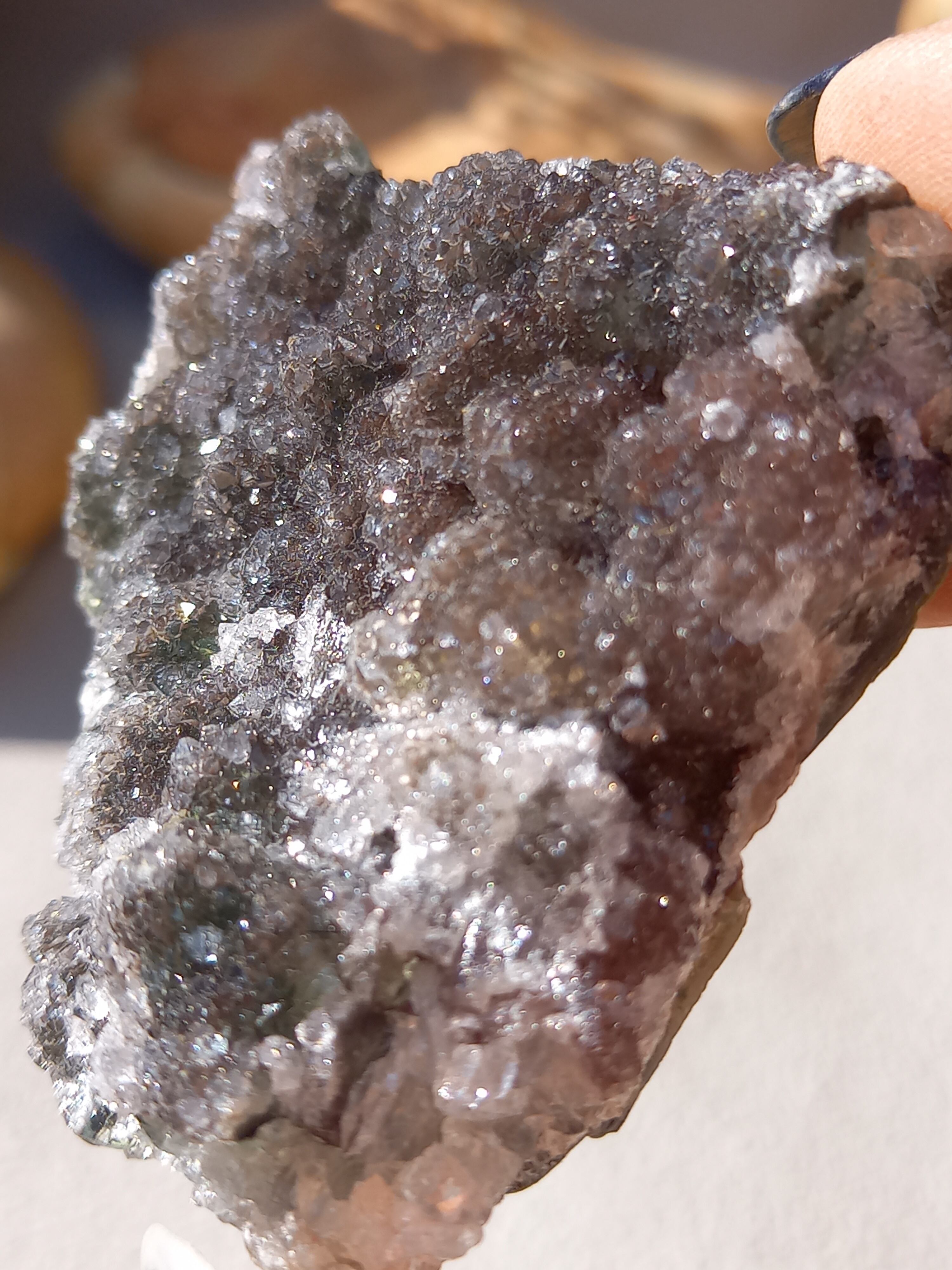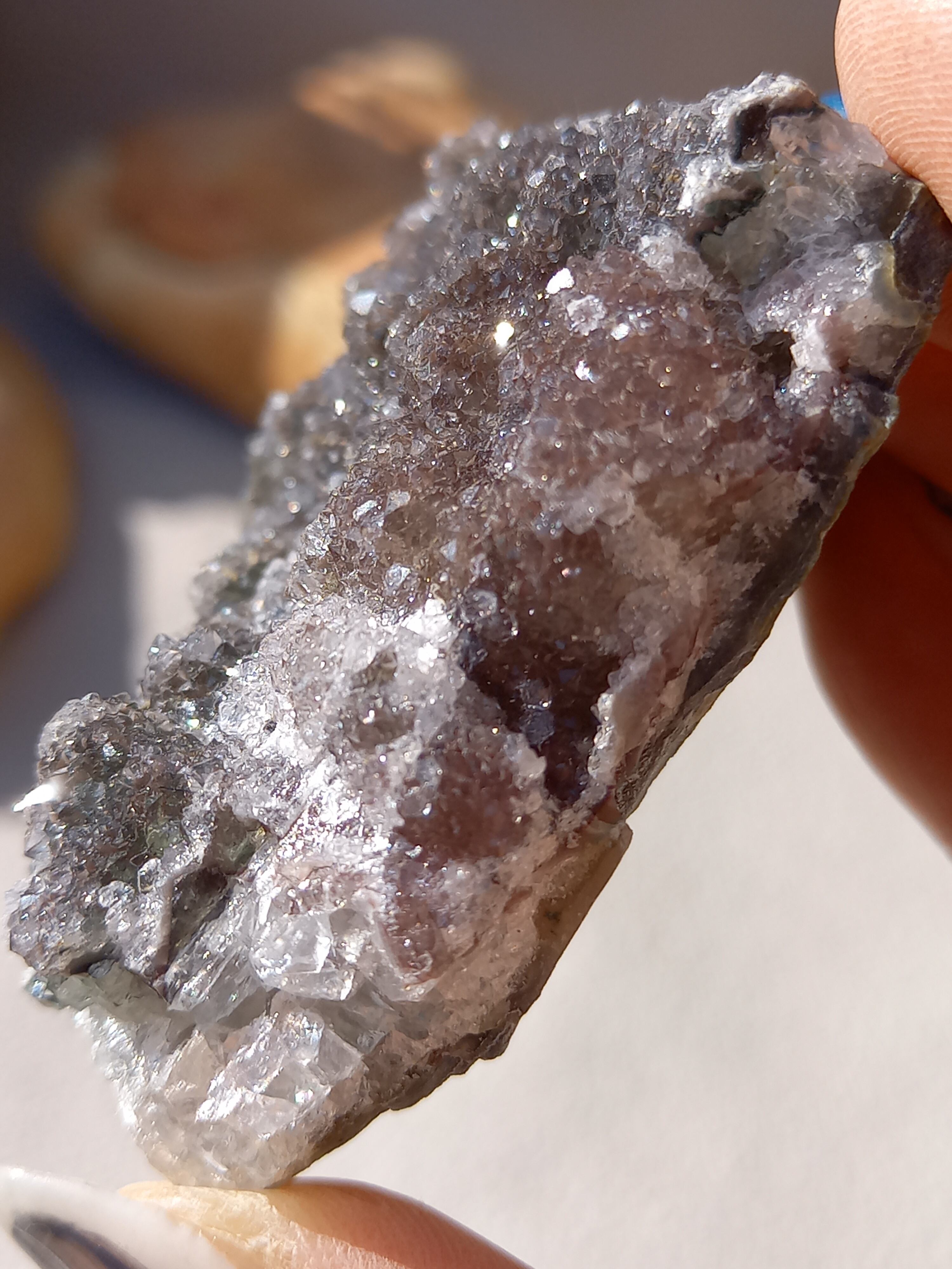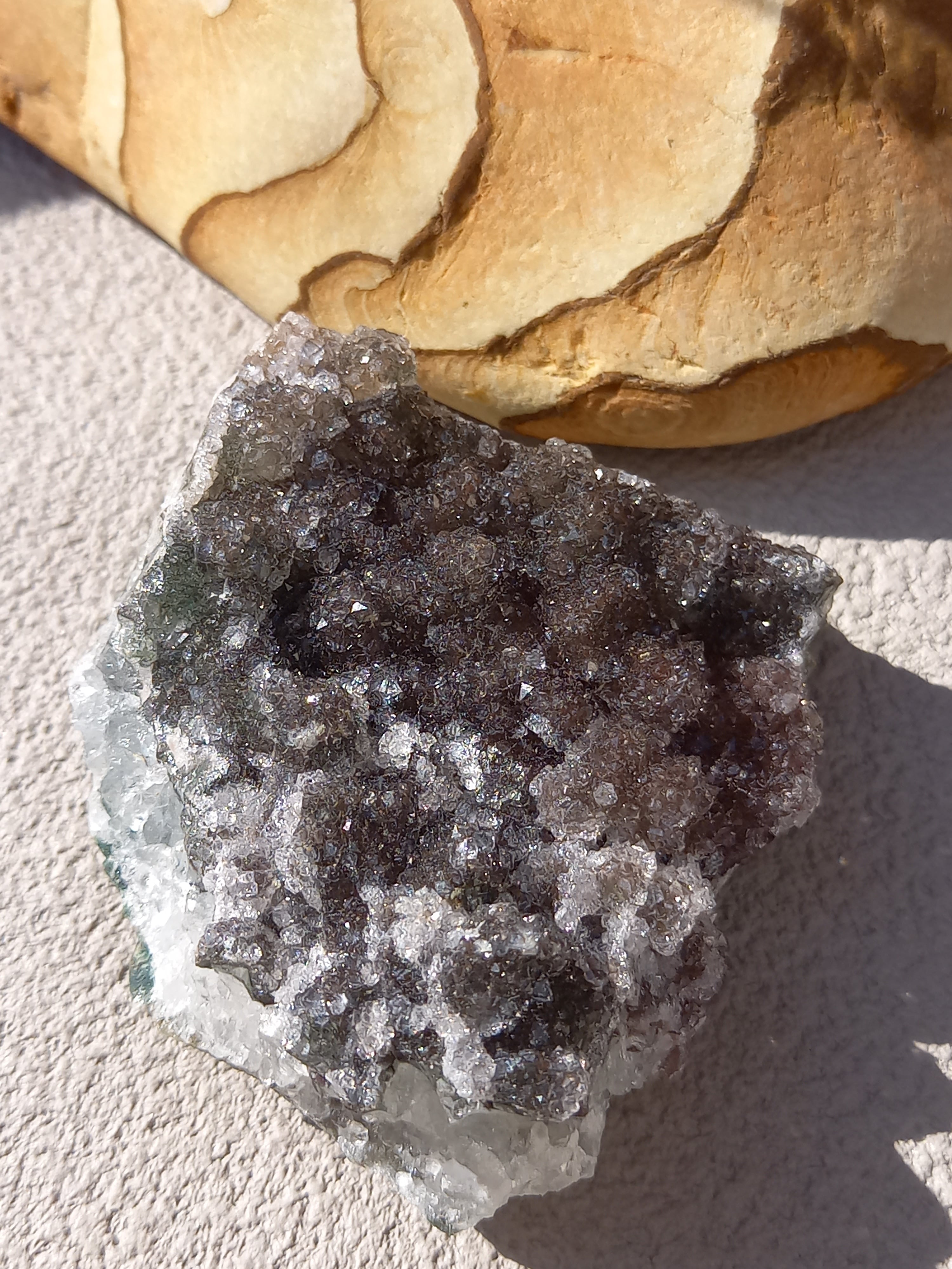 アメジスト原石の表面に水晶のドゥルージーが結晶しています。 これは若い結晶で、いわゆる赤ちゃんや子供のようなものです。 キラキラ輝く姿が砂糖菓子をまぶしたように見えることからシュガーアメジストと呼ばれます。