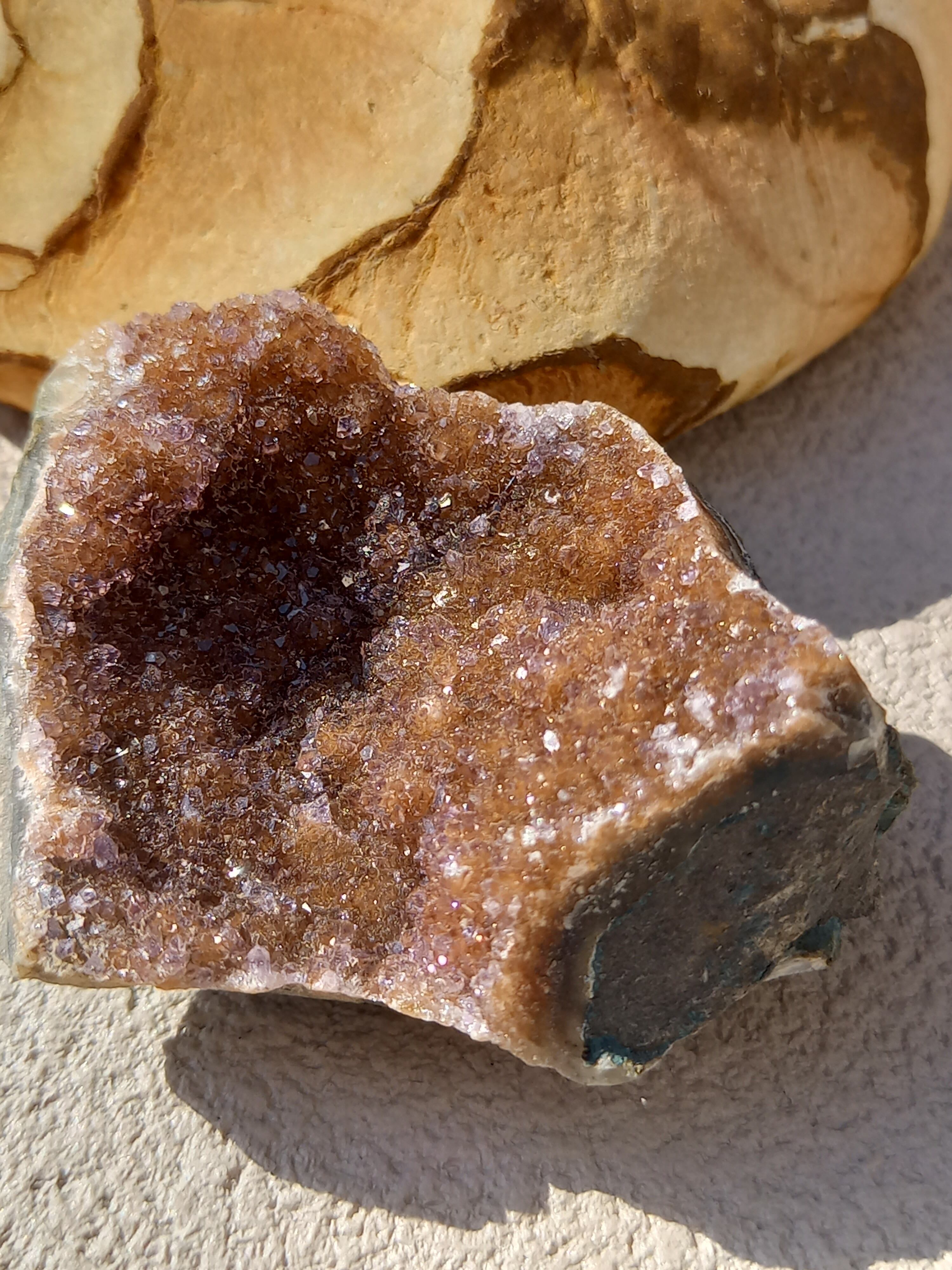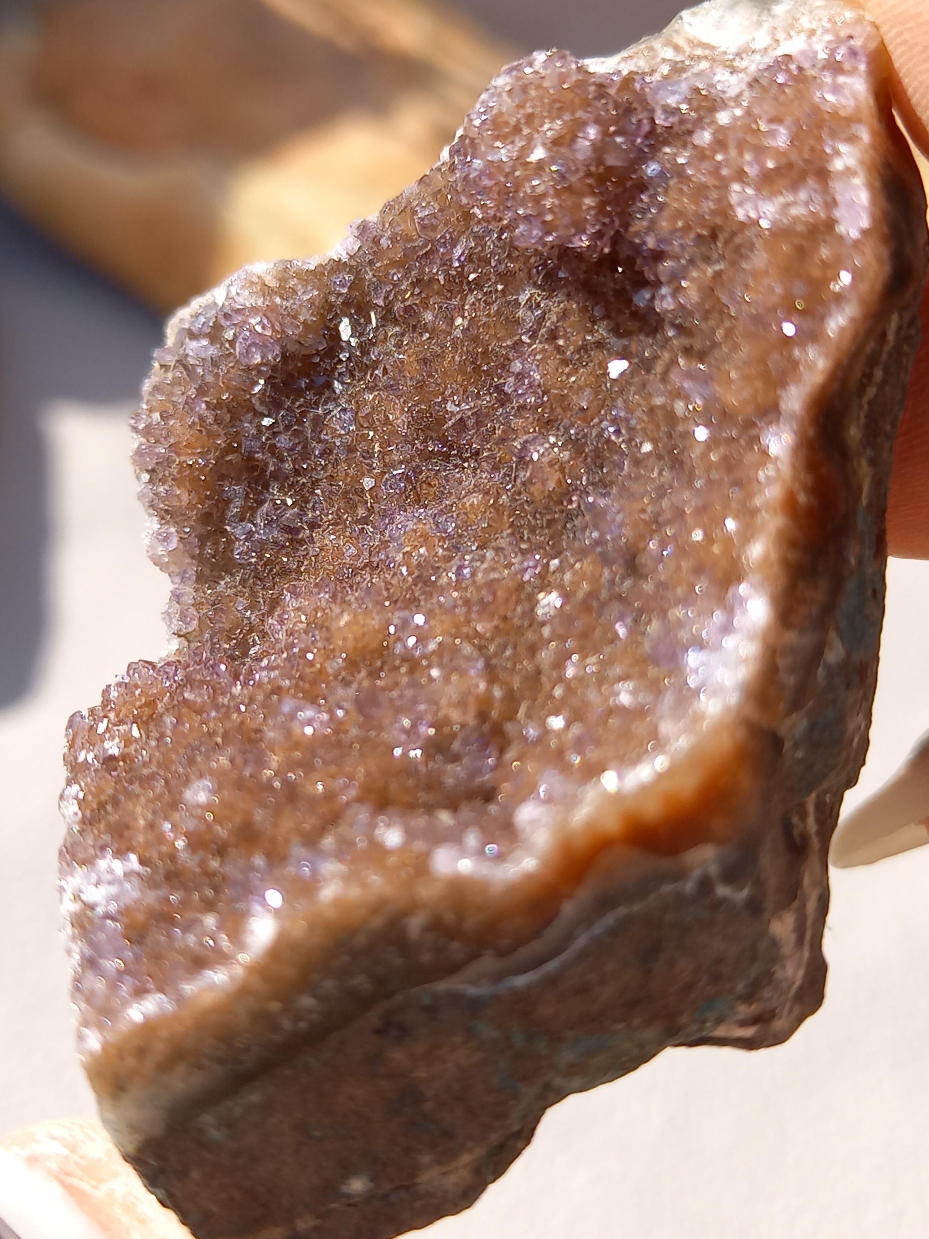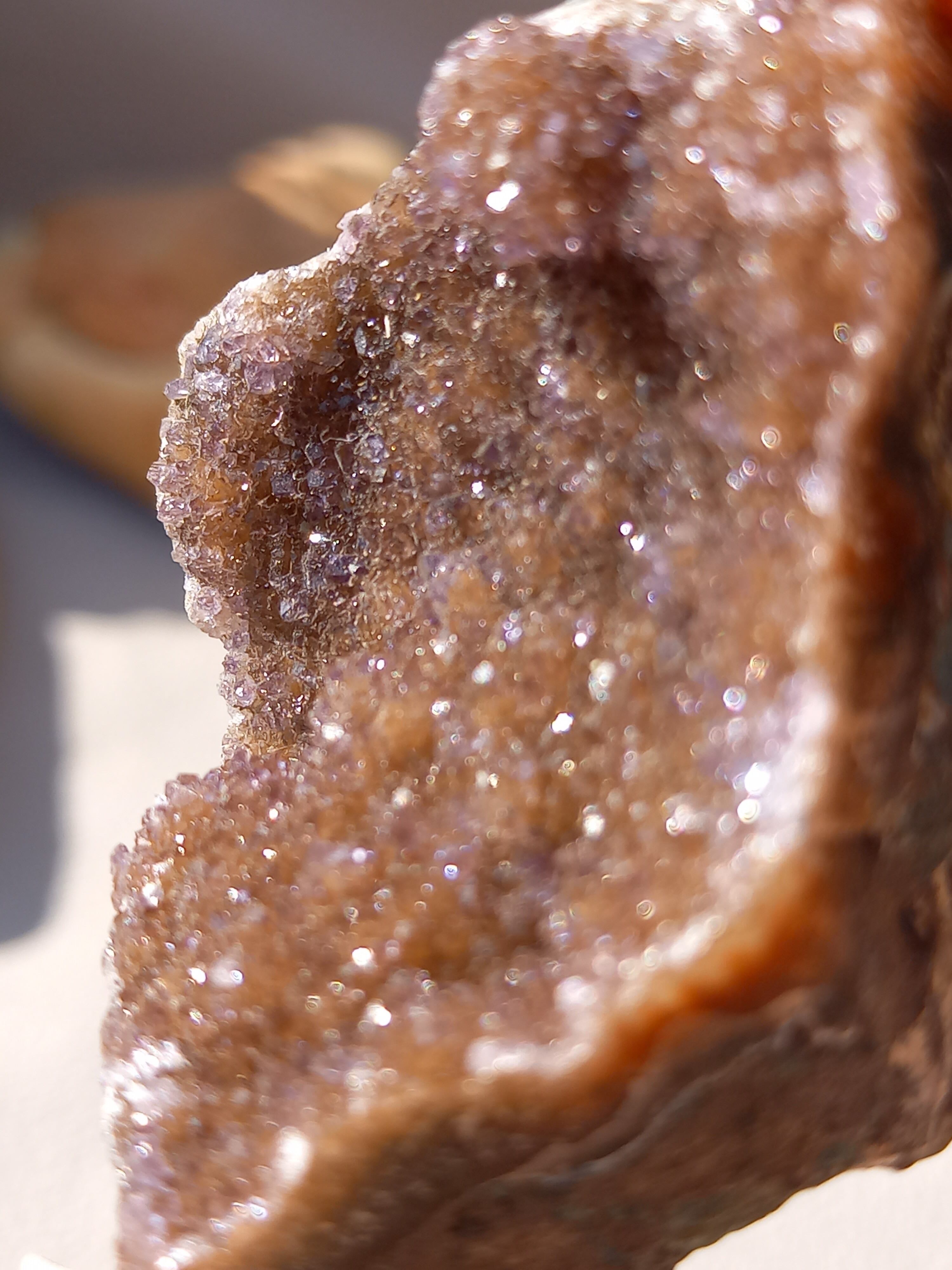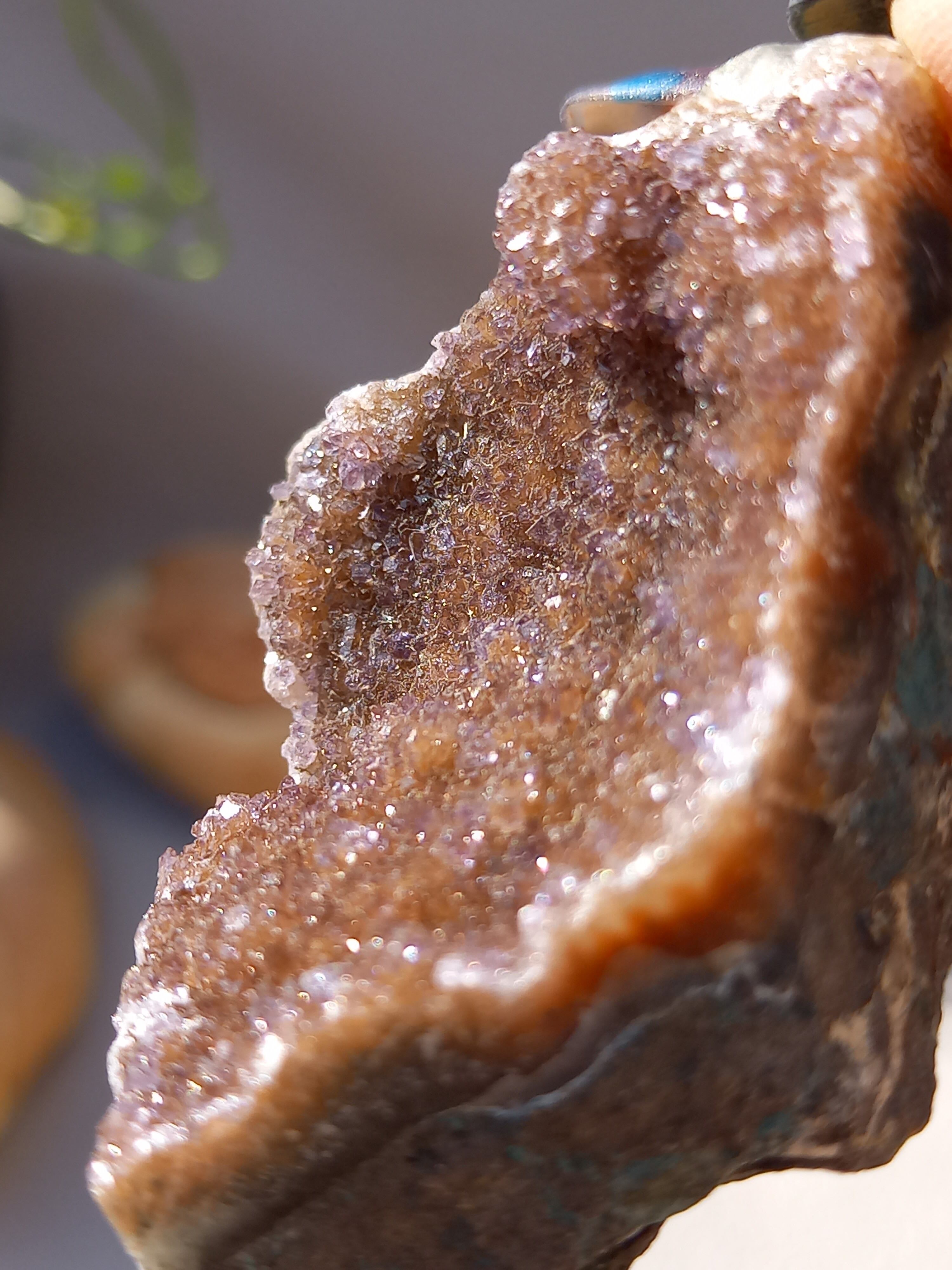 アメジスト原石の表面に水晶のドゥルージーが結晶しています。 これは若い結晶で、いわゆる赤ちゃんや子供のようなものです。 キラキラ輝く姿が砂糖菓子をまぶしたように見えることからシュガーアメジストと呼ばれます。