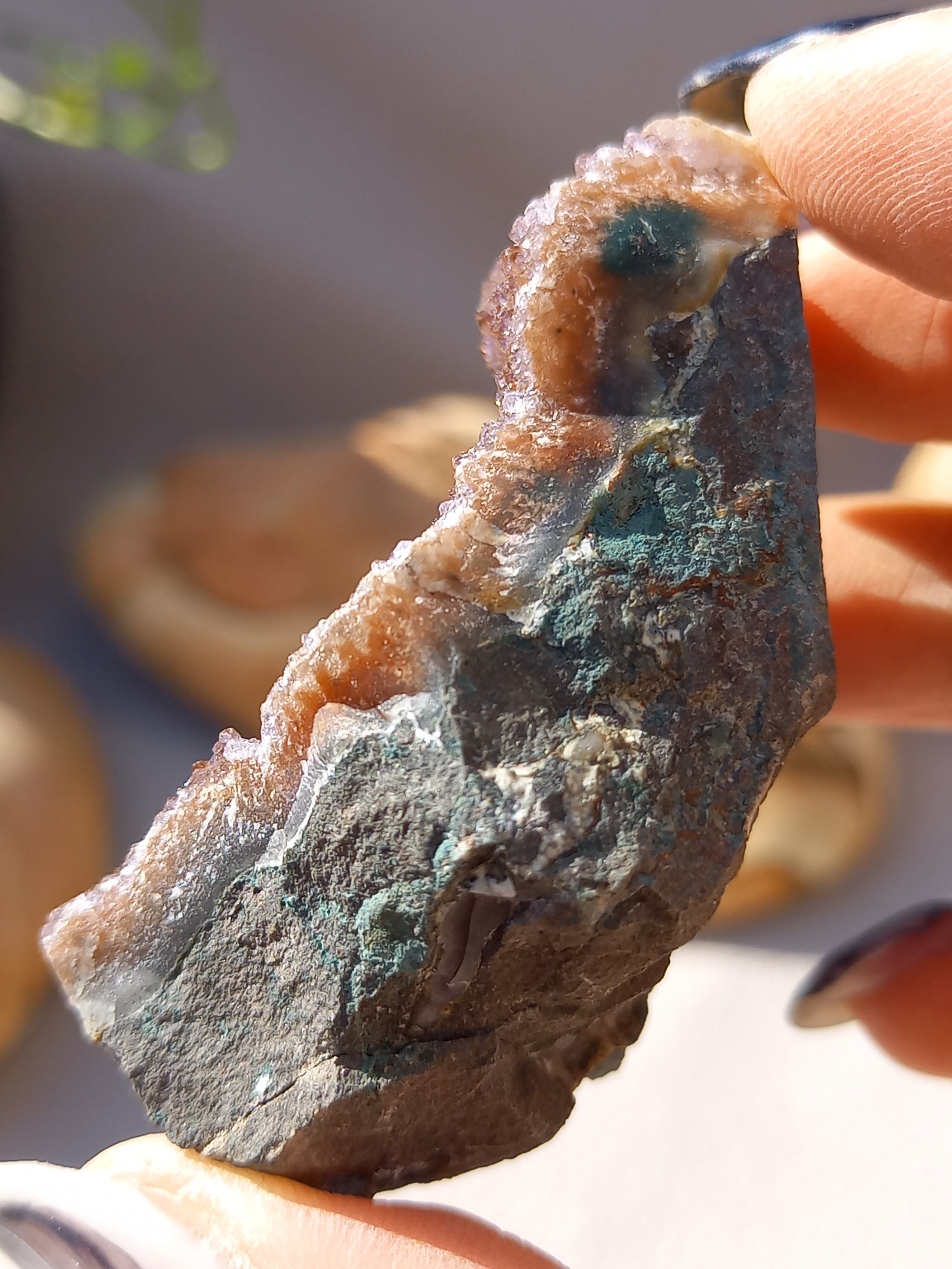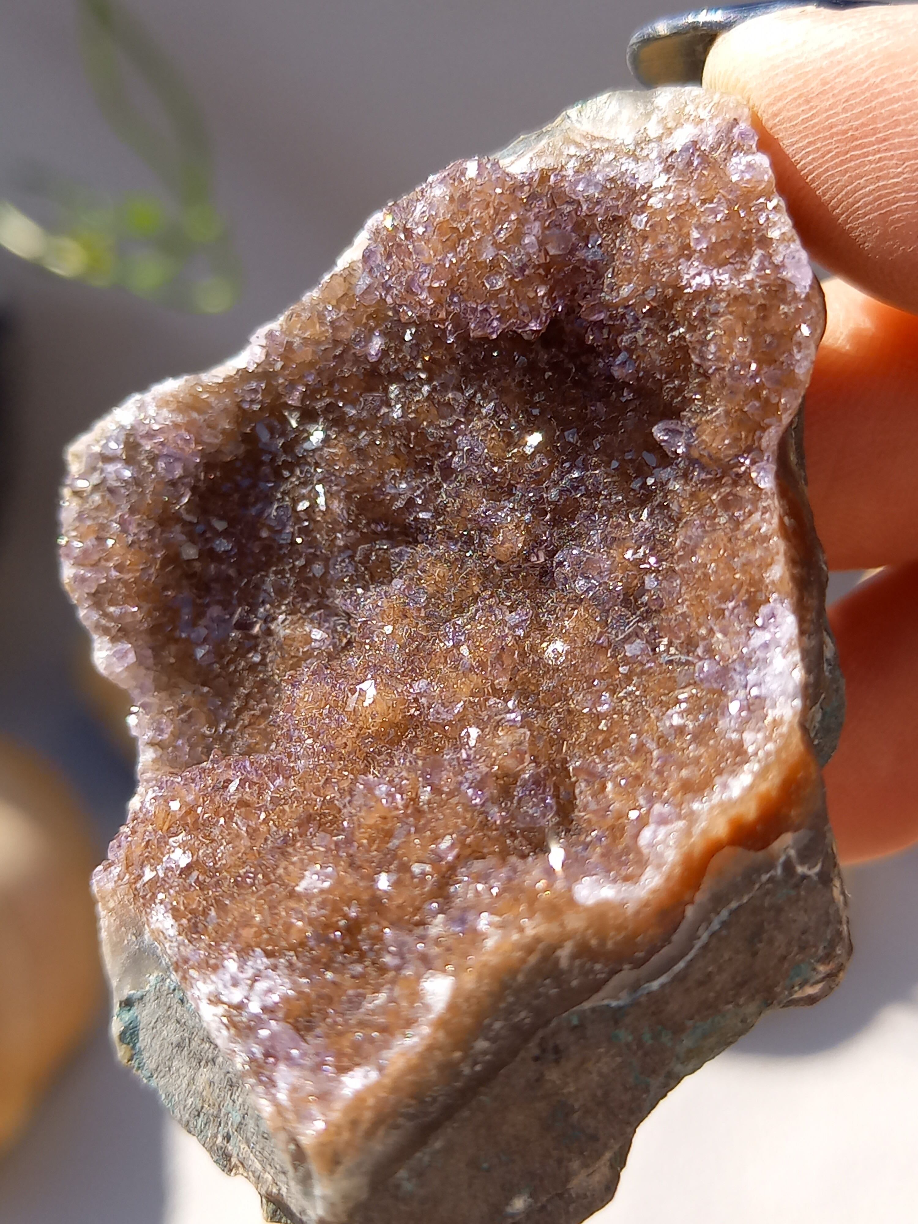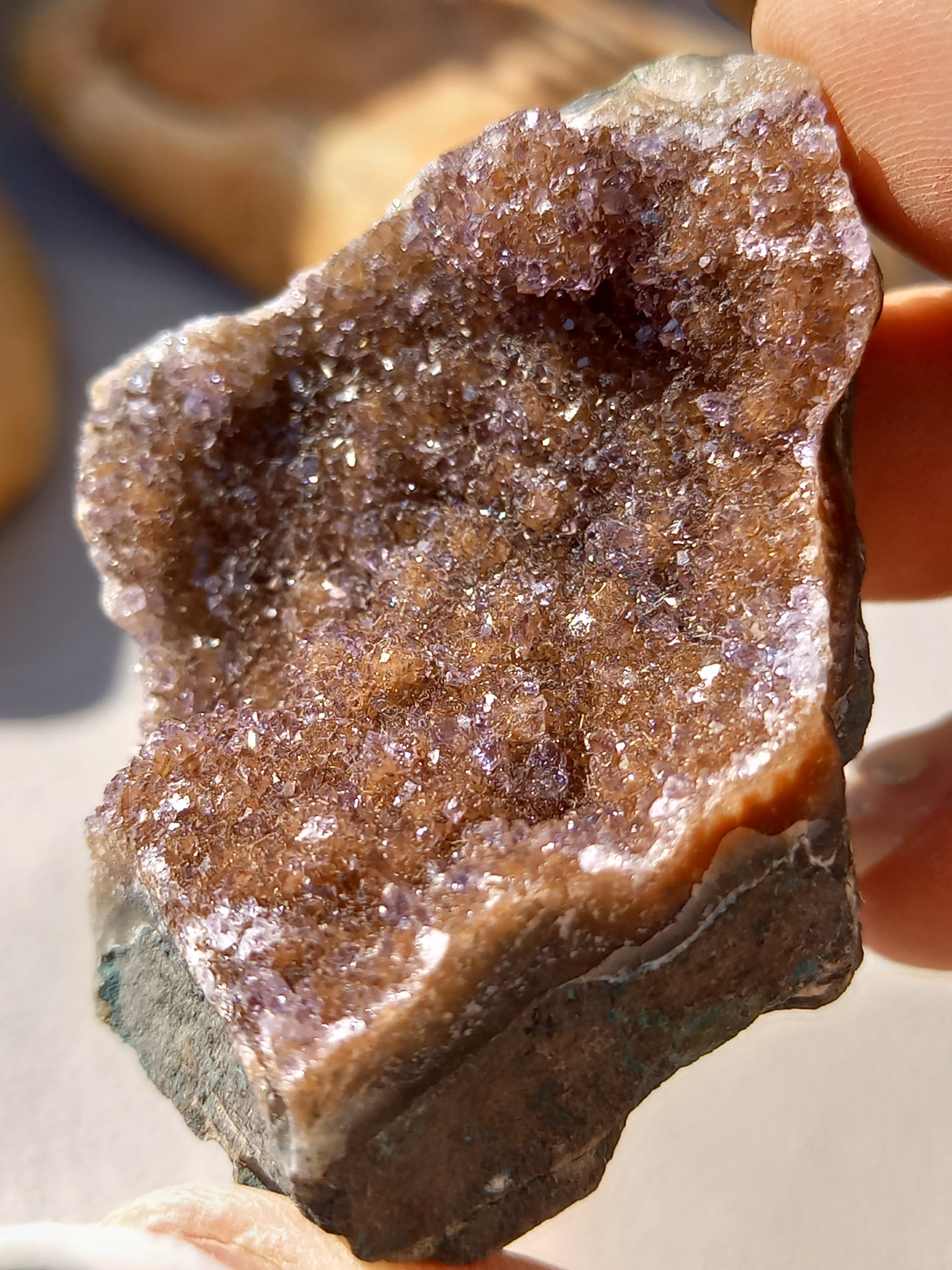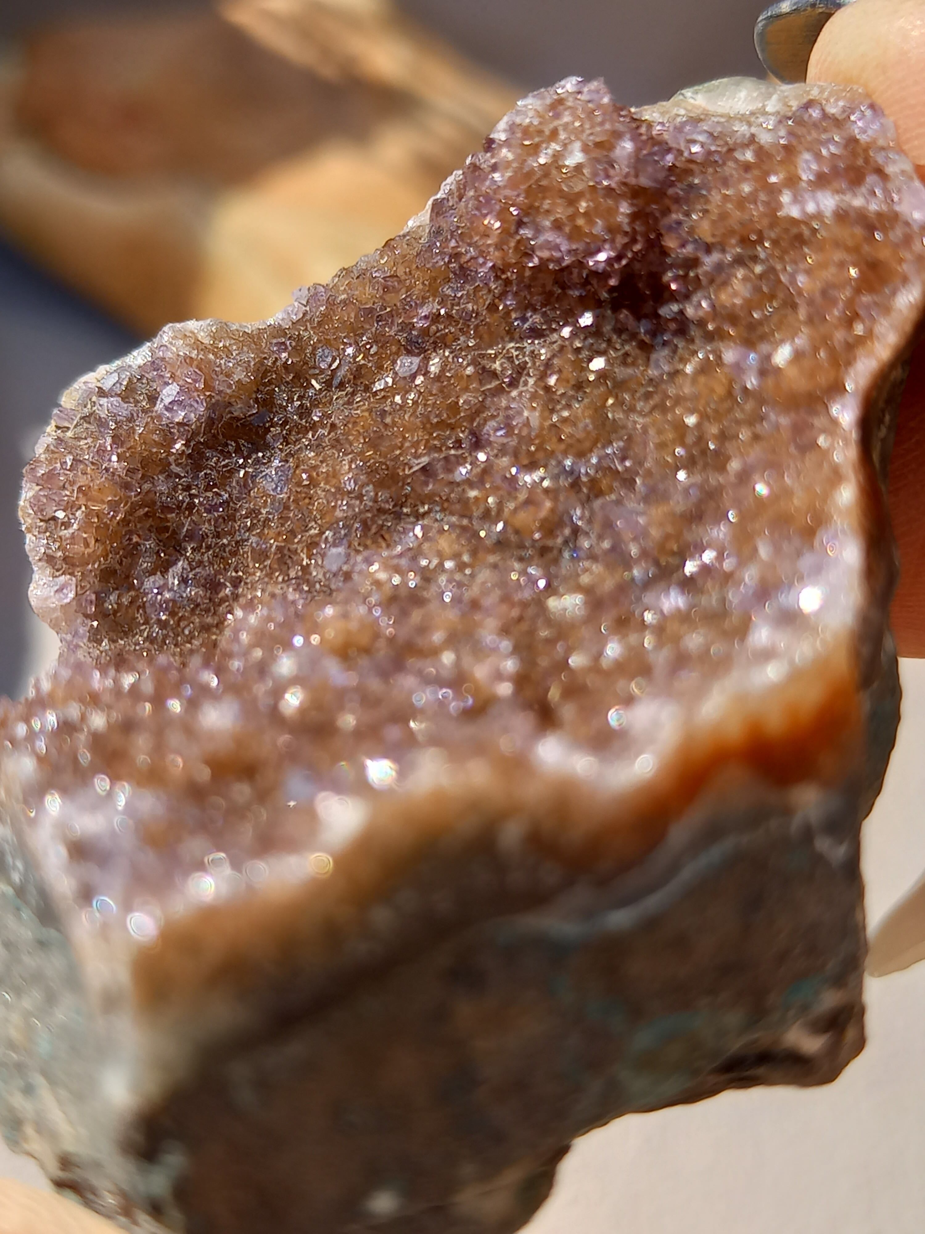 アメジスト原石の表面に水晶のドゥルージーが結晶しています。 これは若い結晶で、いわゆる赤ちゃんや子供のようなものです。 キラキラ輝く姿が砂糖菓子をまぶしたように見えることからシュガーアメジストと呼ばれます。