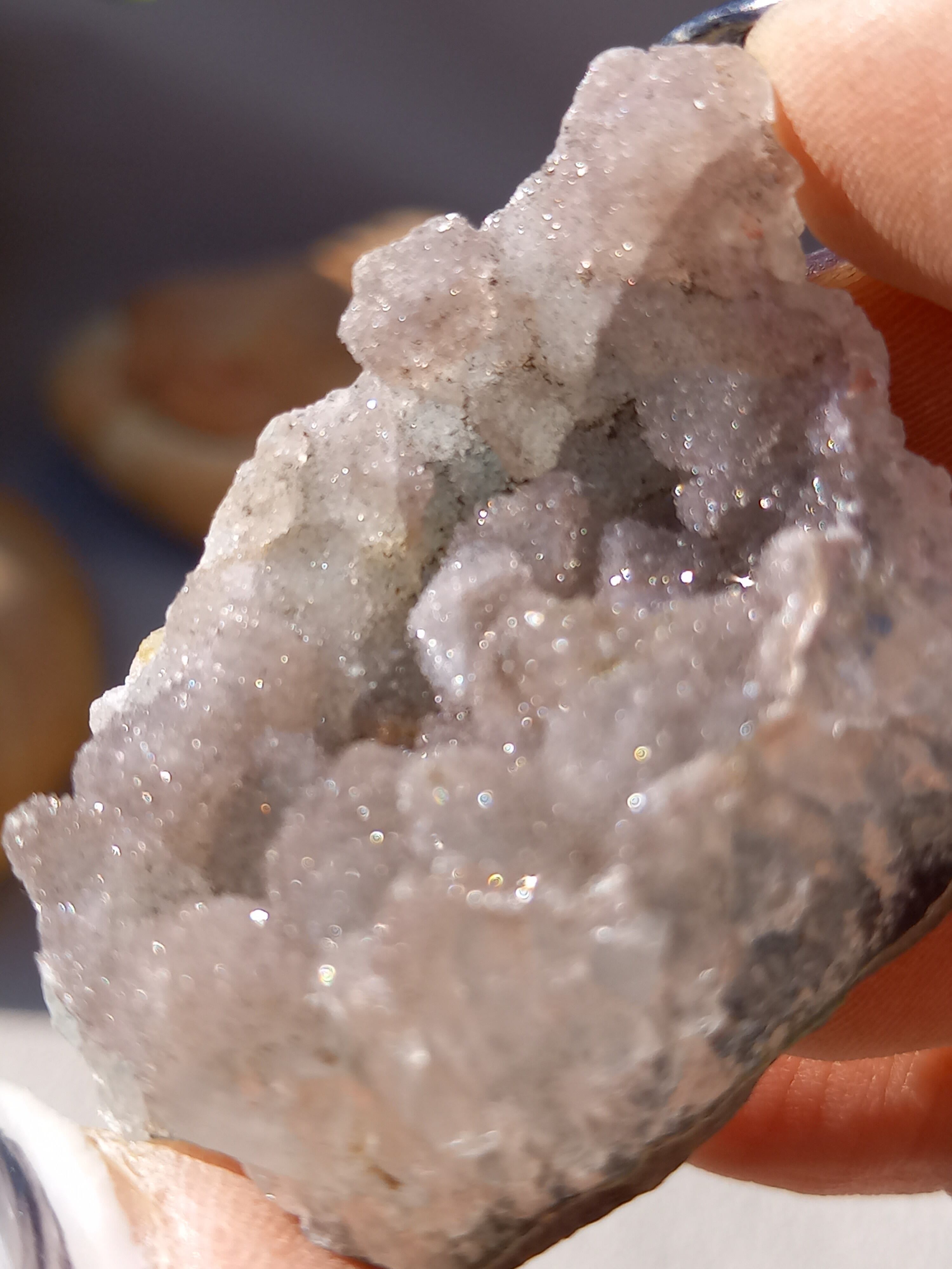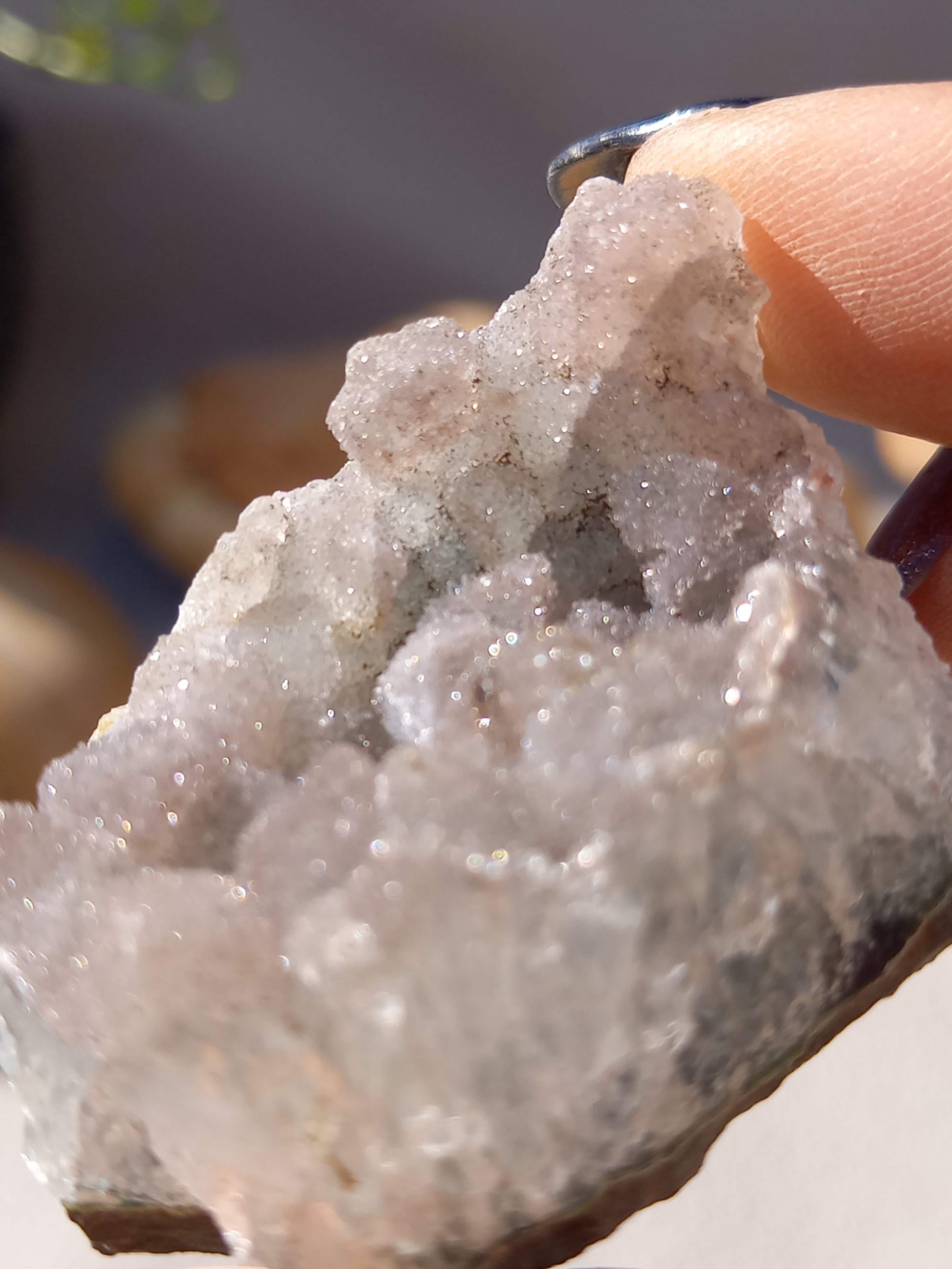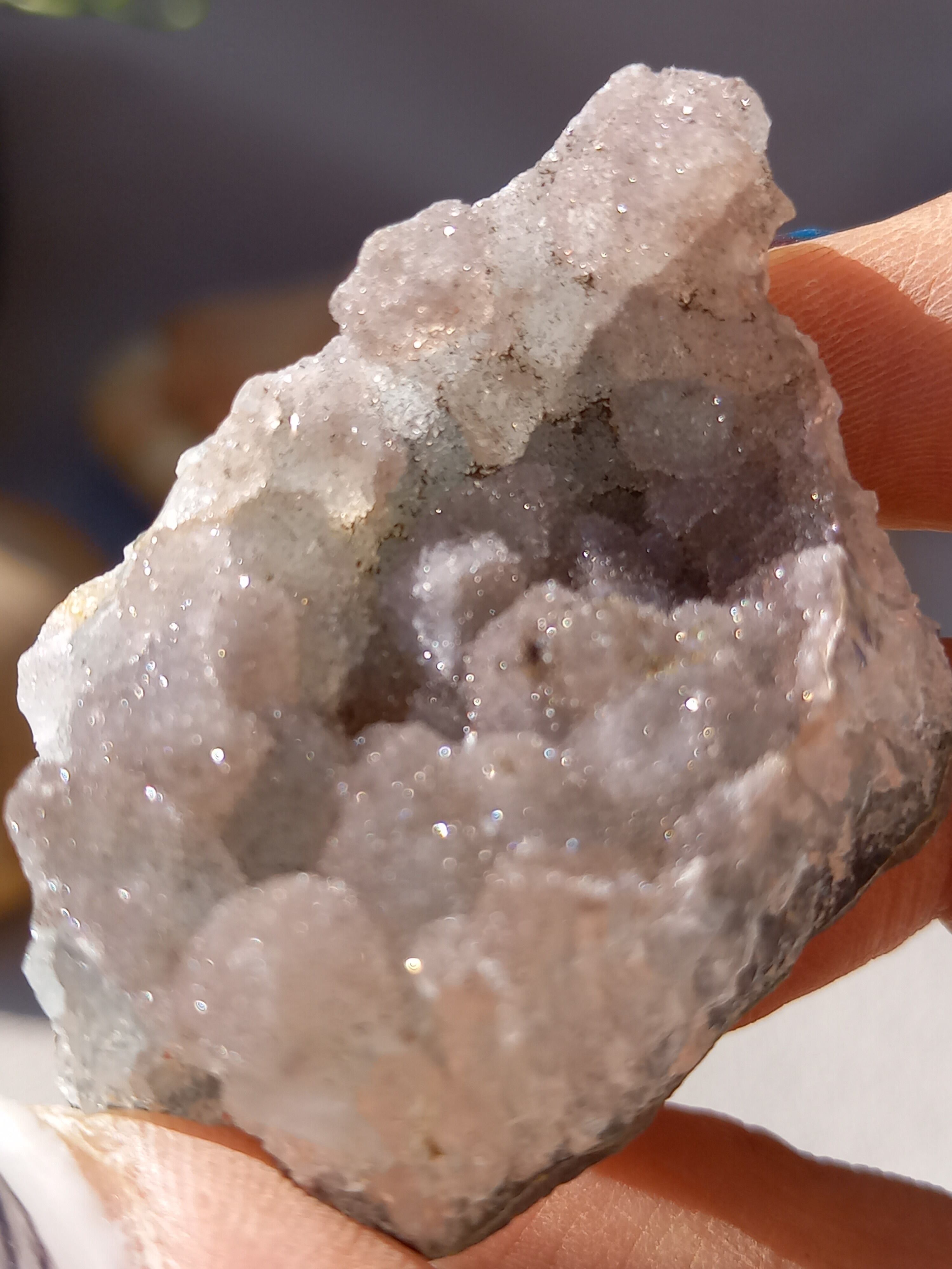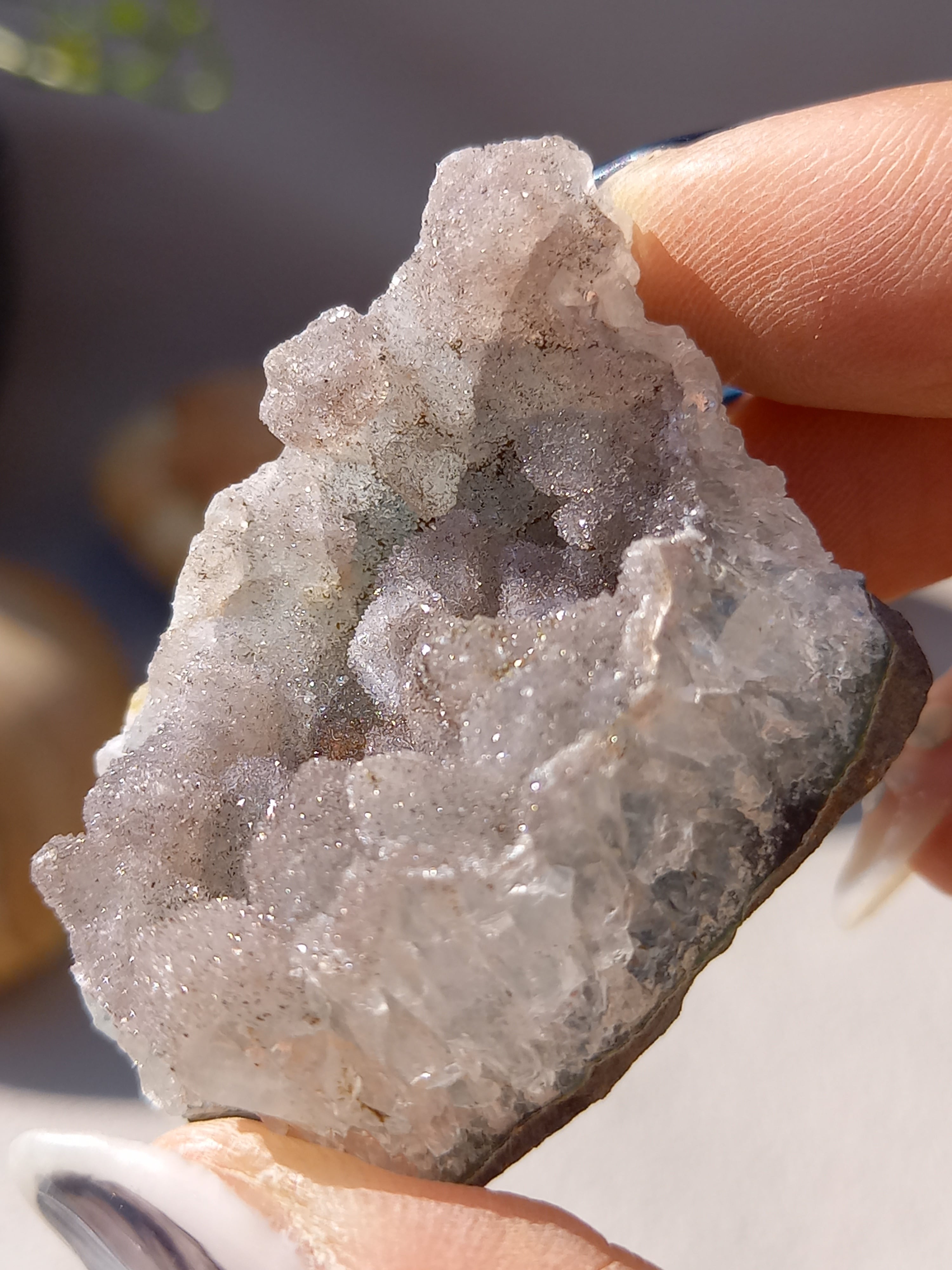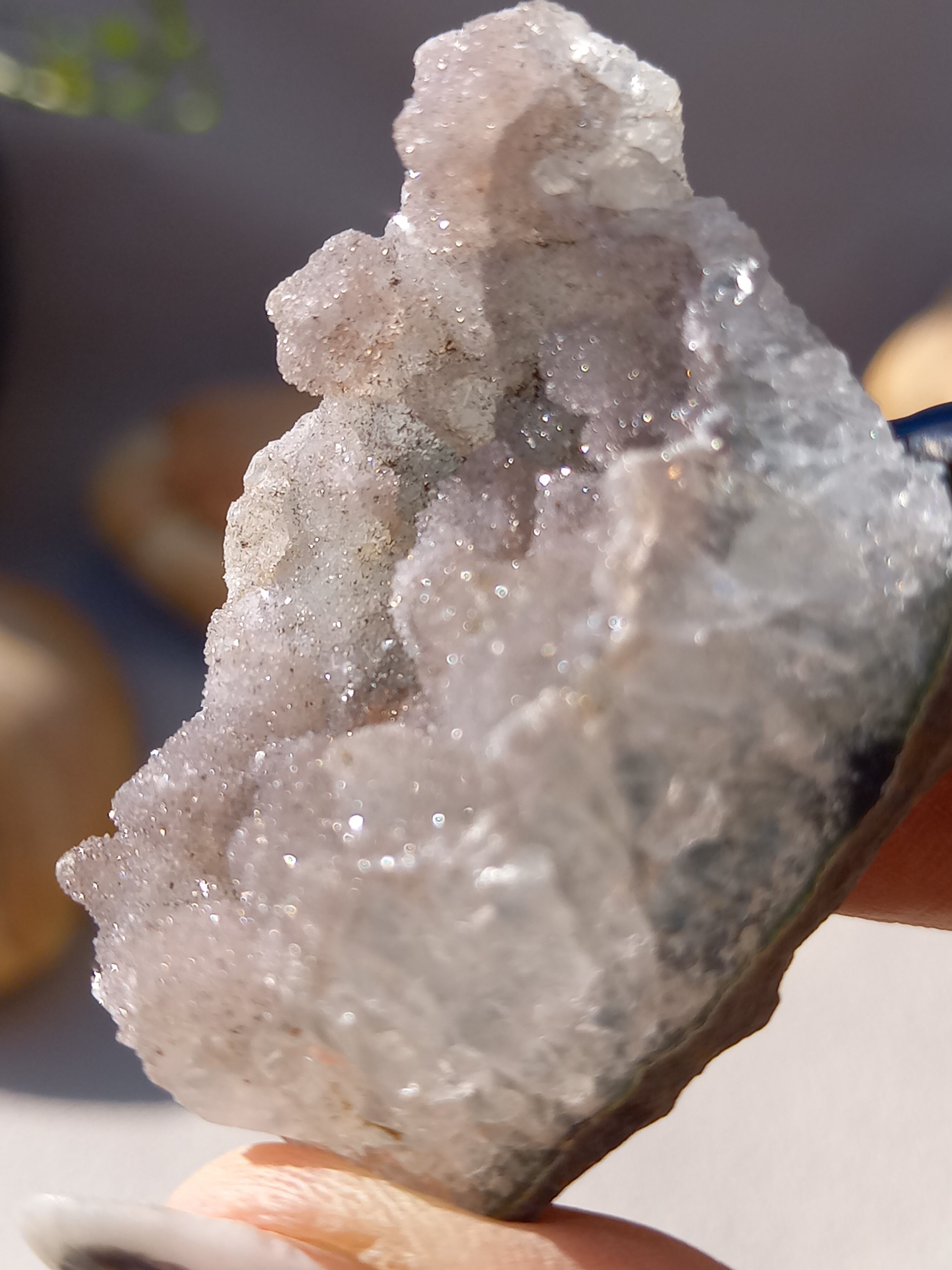 アメジスト原石の表面に水晶のドゥルージーが結晶しています。 これは若い結晶で、いわゆる赤ちゃんや子供のようなものです。 キラキラ輝く姿が砂糖菓子をまぶしたように見えることからシュガーアメジストと呼ばれます。