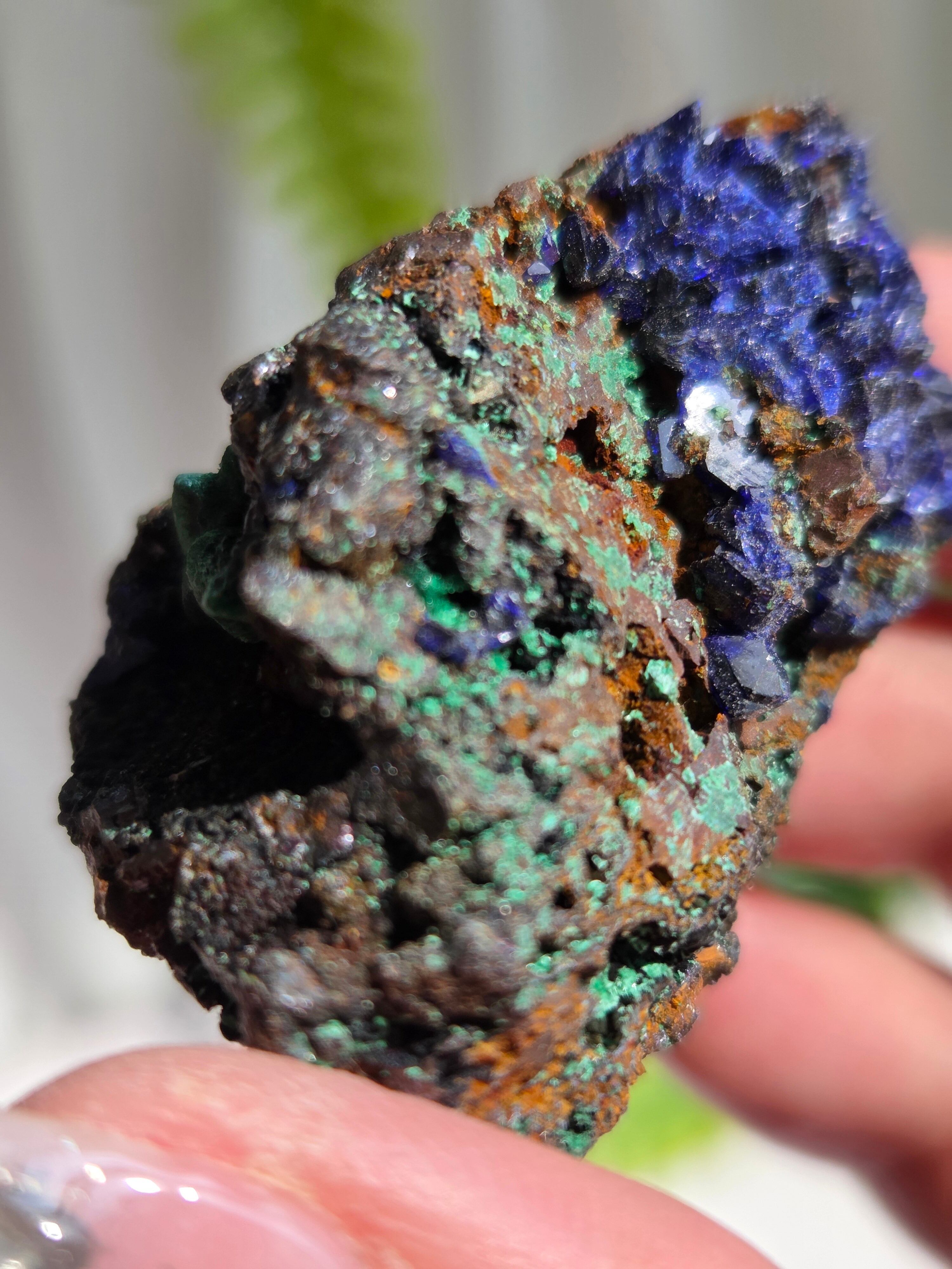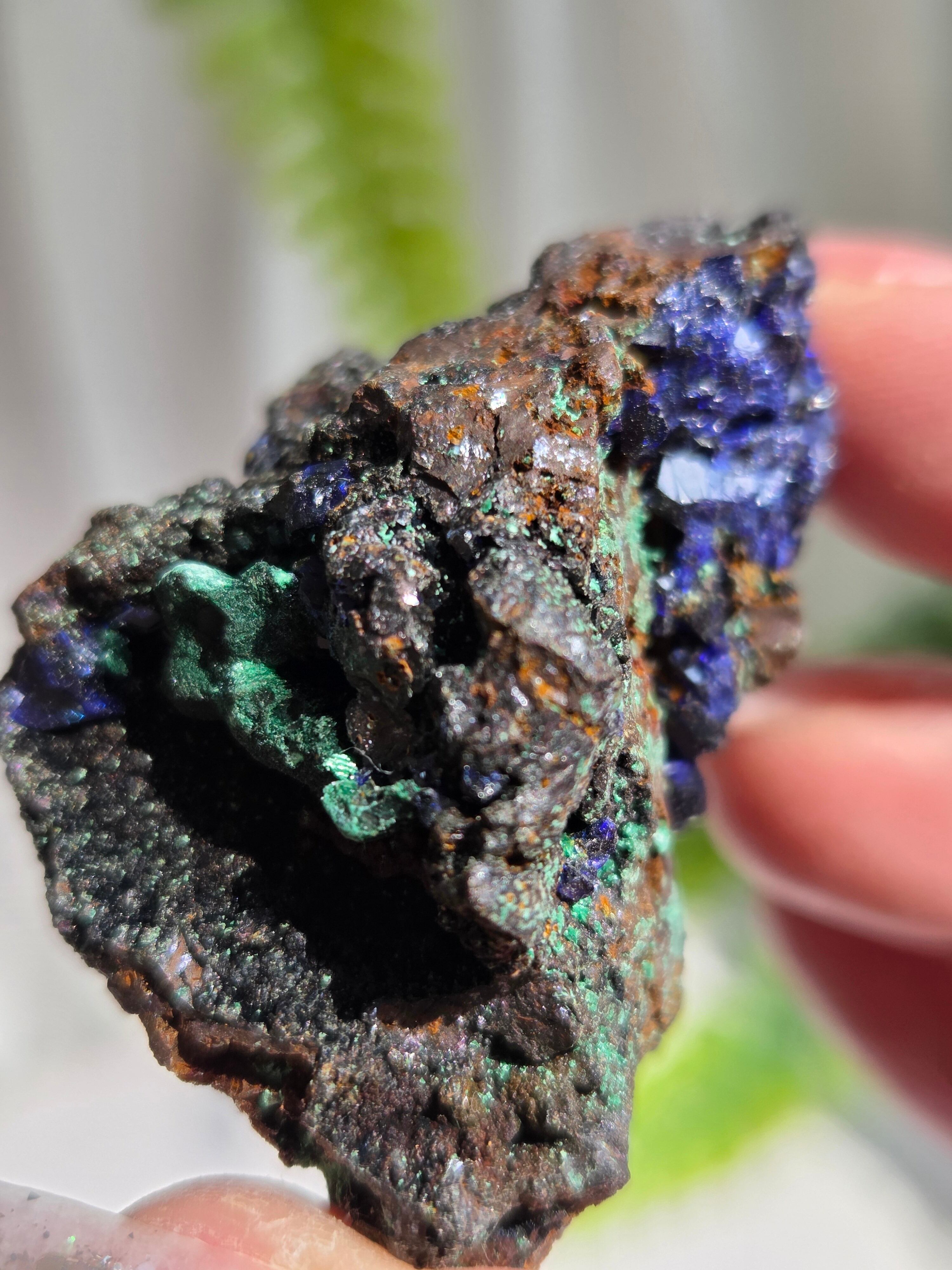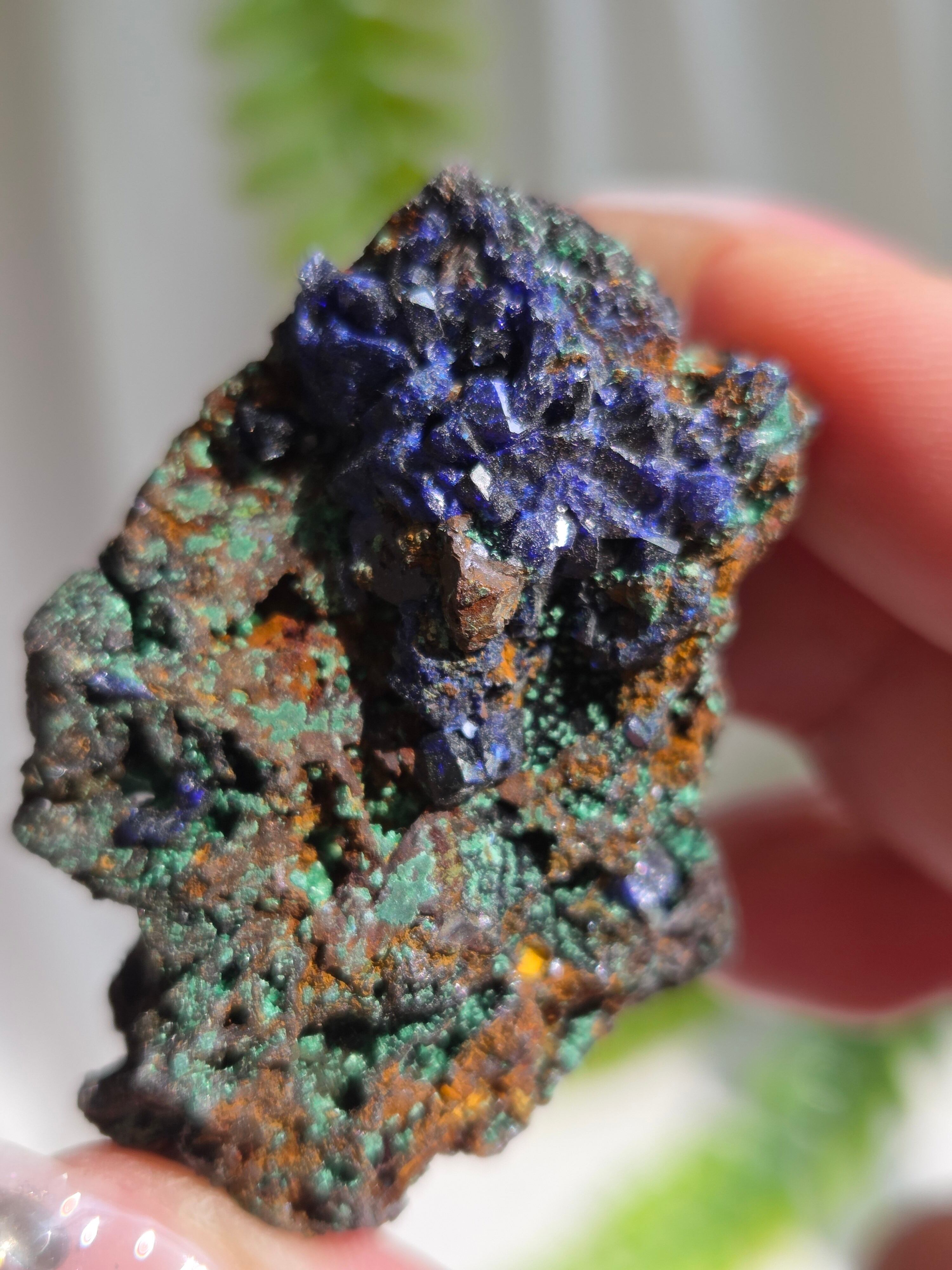 アズロマラカイトは、藍色をしたアズライトと緑色のマラカイトが混ざり合った芸術的な美しさが特徴の石です。 アズライトとマラカイトはよく似た鉱物で、アズライトは空気中の水分を吸収して、マラカイトへ変化する性質を持っています。