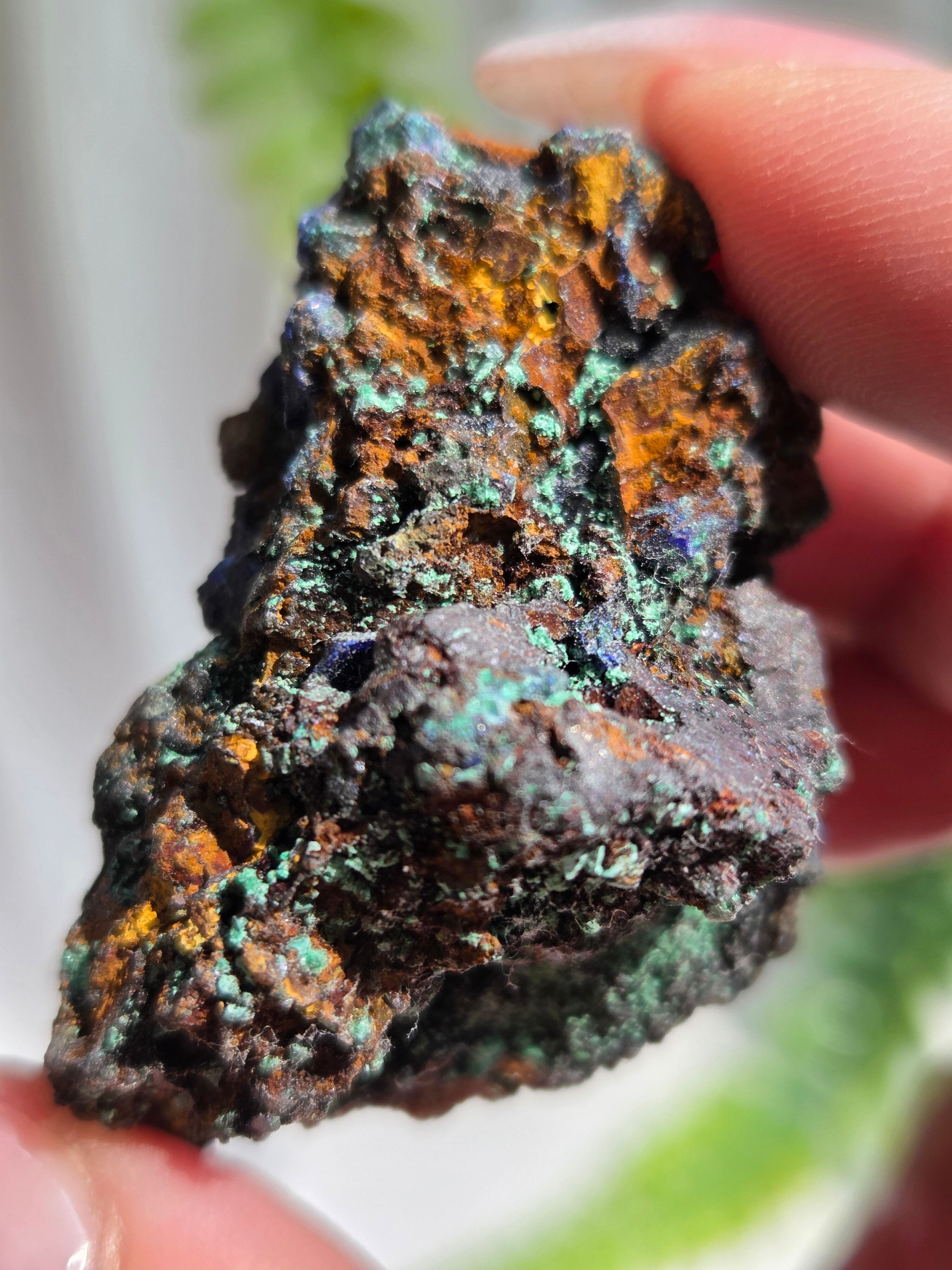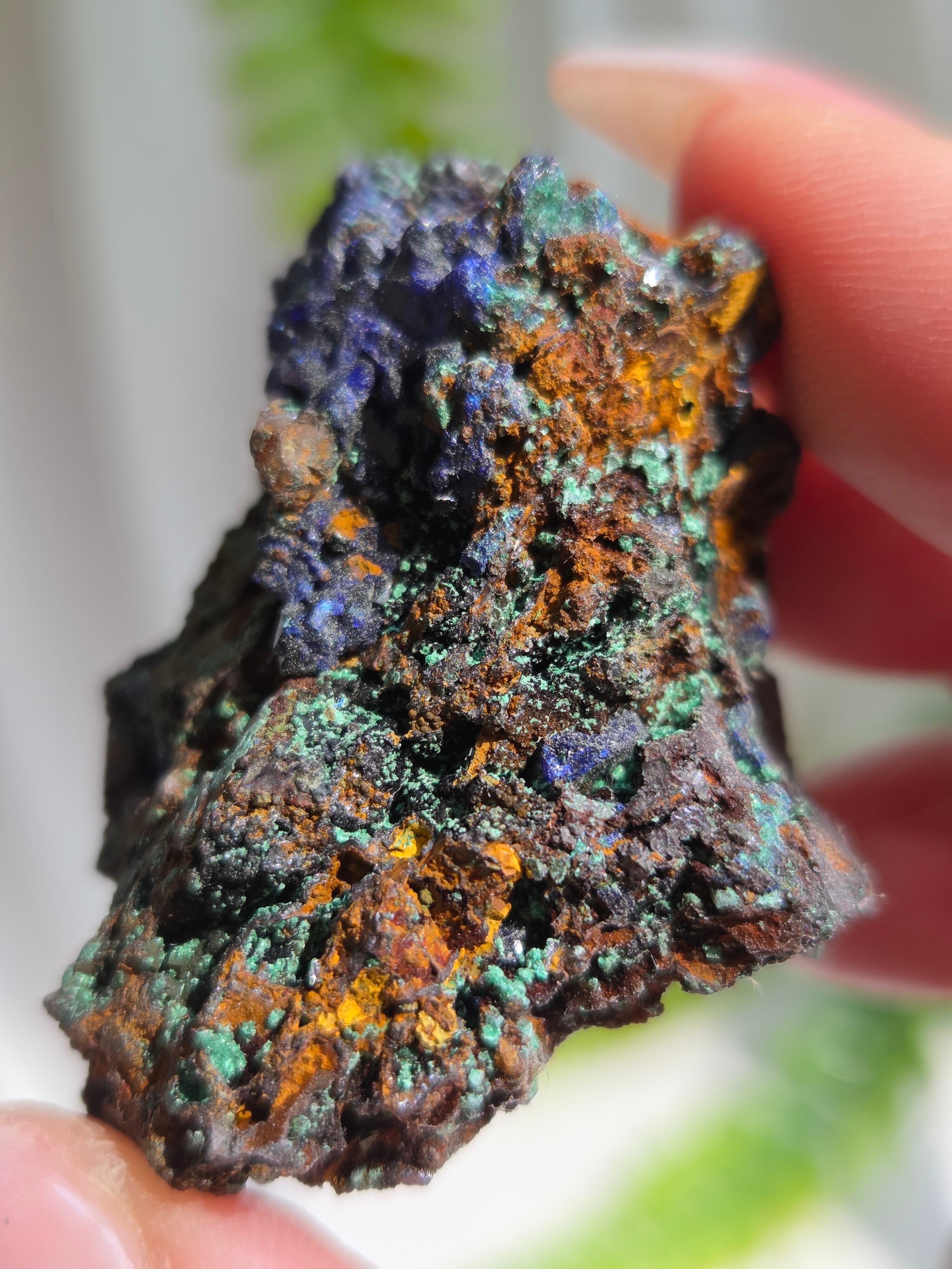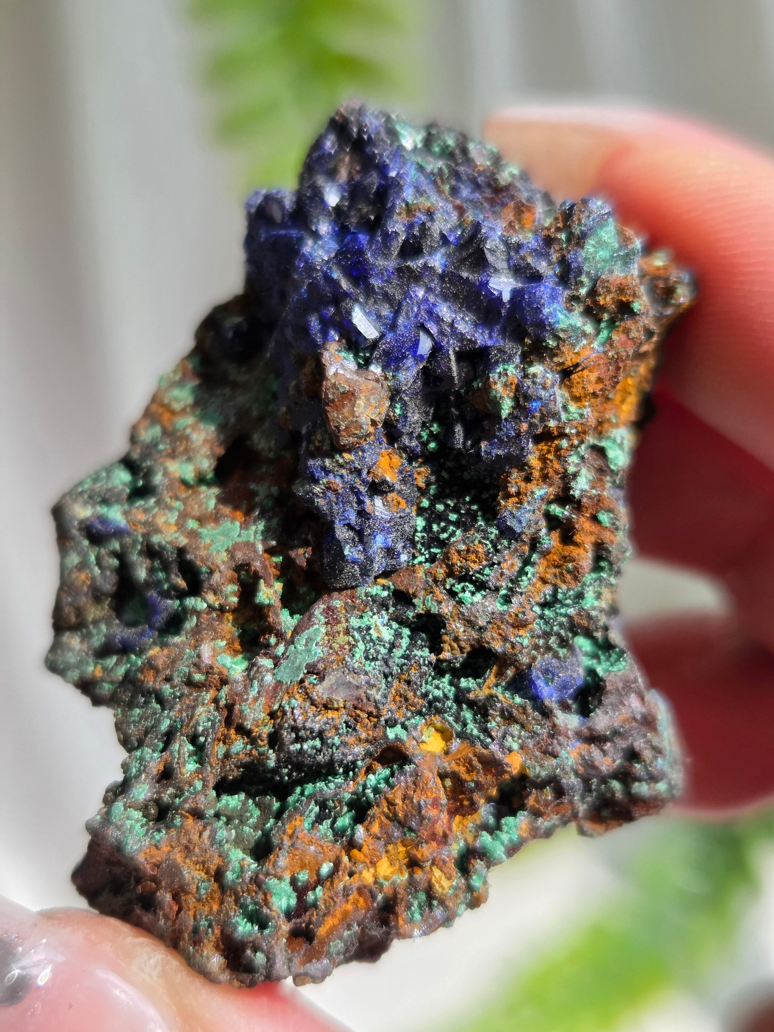 アズロマラカイトは、藍色をしたアズライトと緑色のマラカイトが混ざり合った芸術的な美しさが特徴の石です。 アズライトとマラカイトはよく似た鉱物で、アズライトは空気中の水分を吸収して、マラカイトへ変化する性質を持っています。
