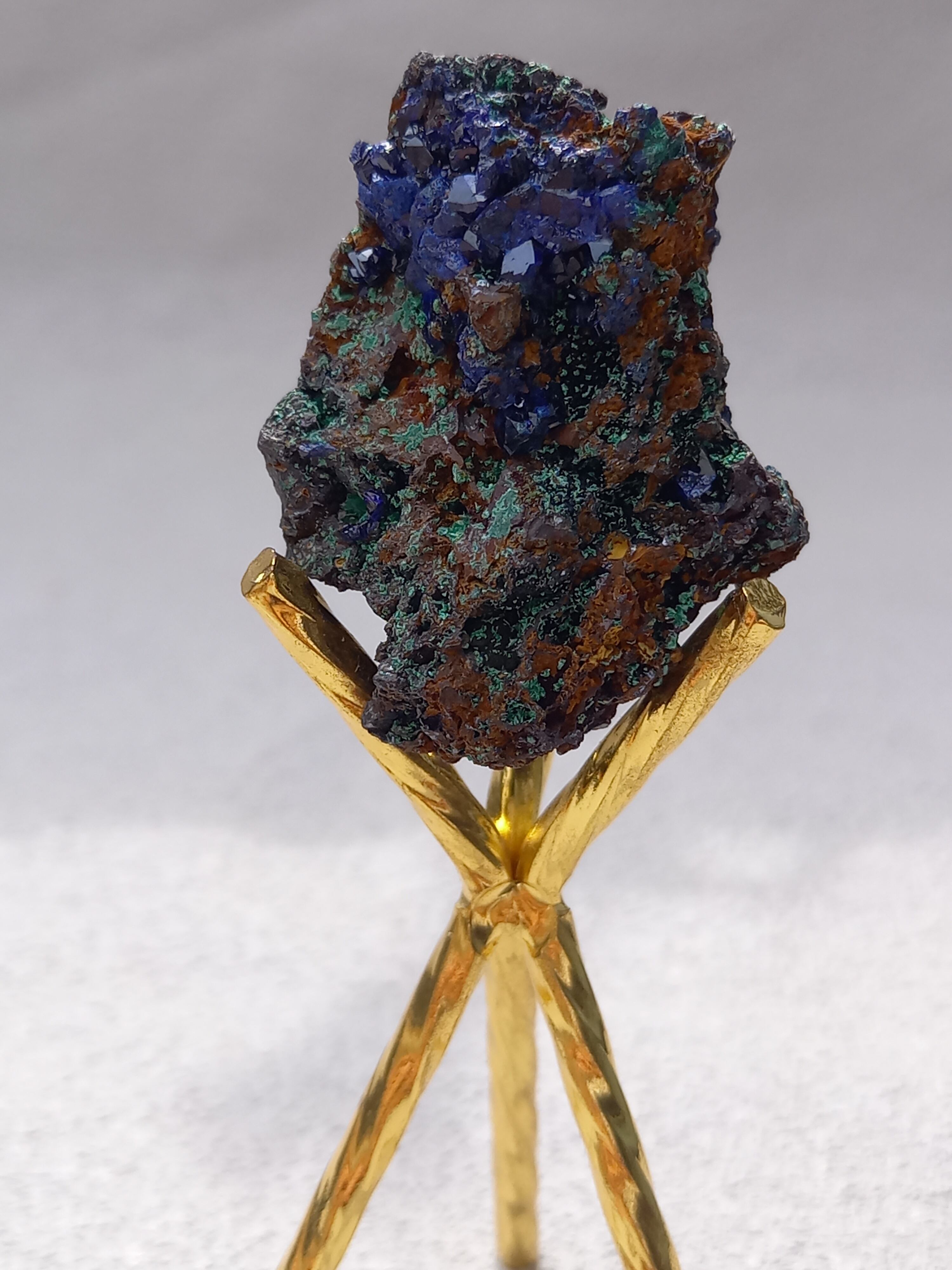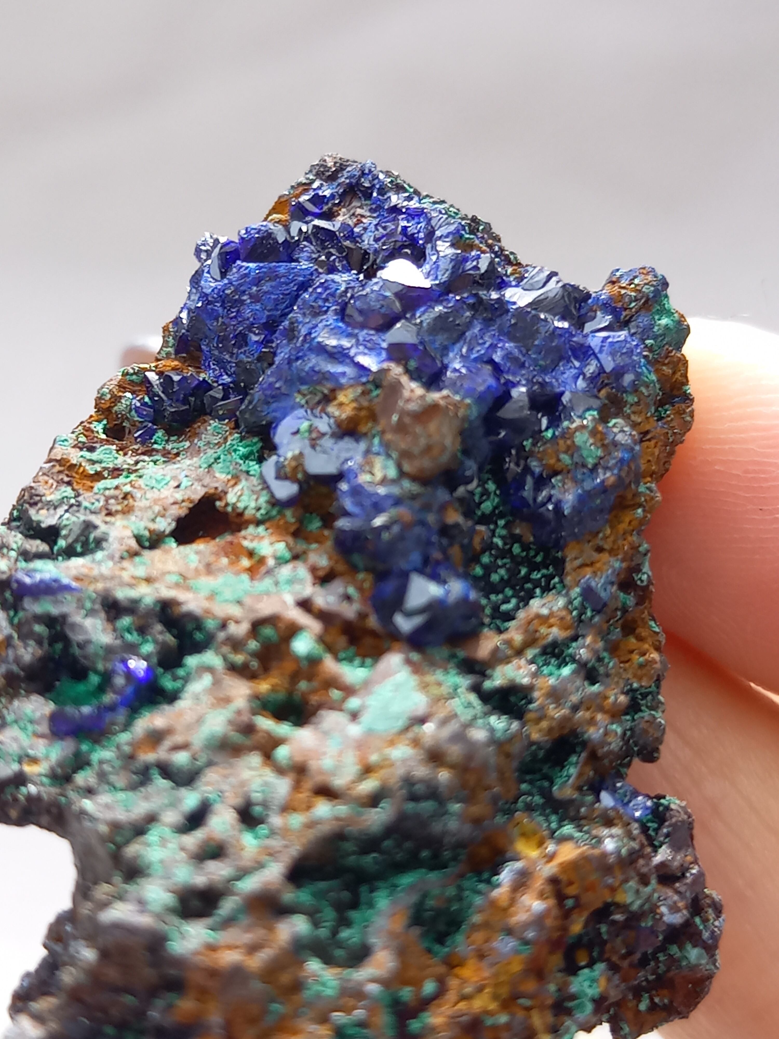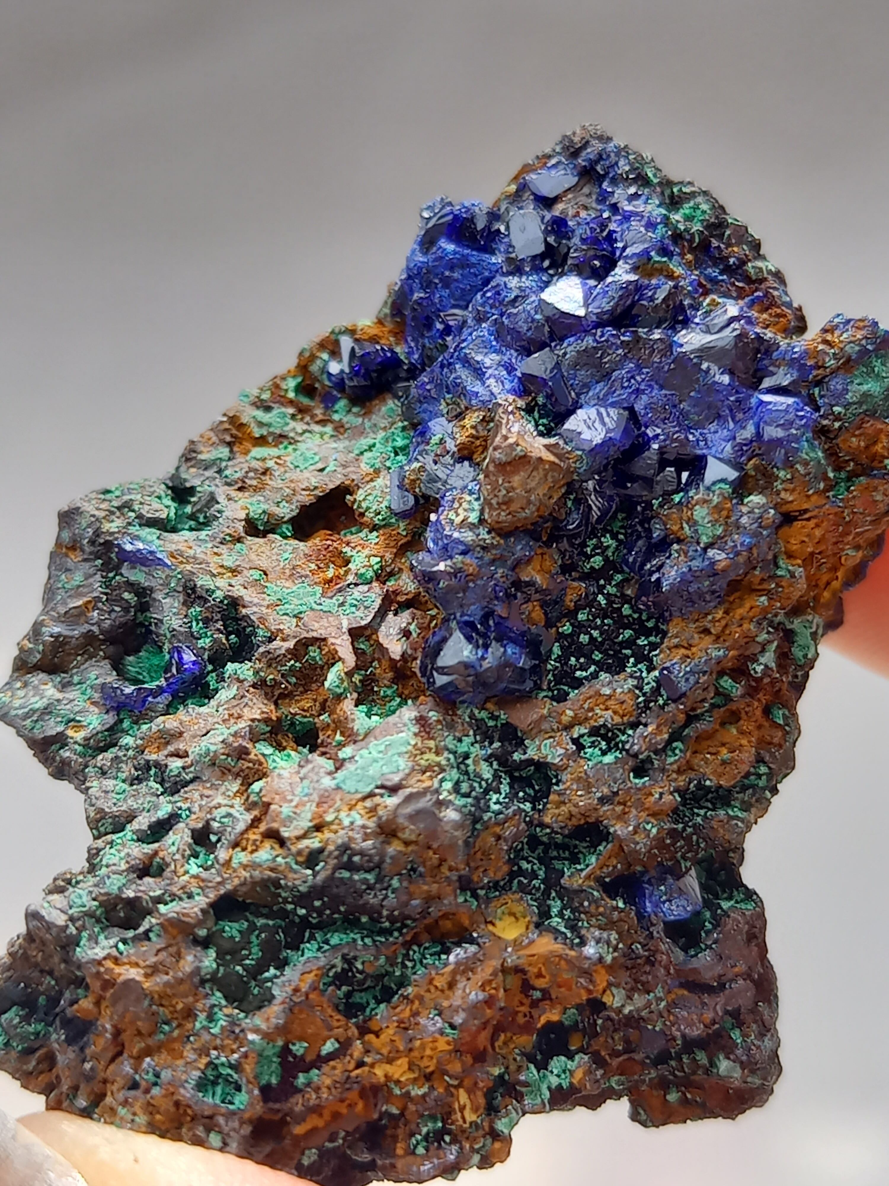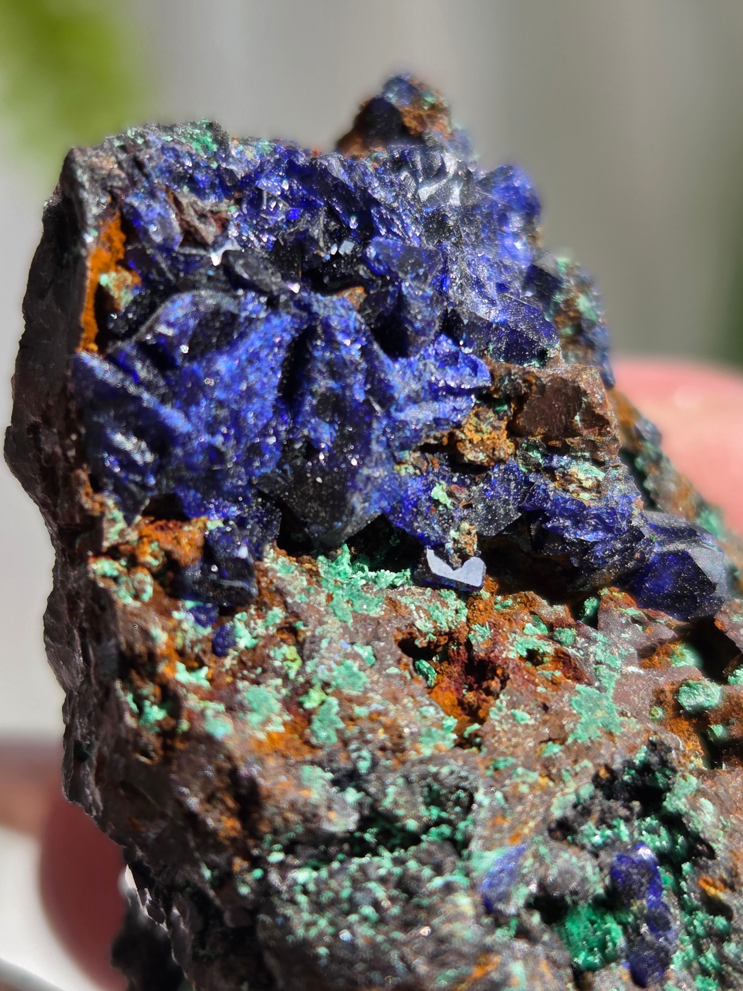 アズライトの鮮やかなブルーの結晶がキラキラと煌めき、結晶も、しっかりした結晶で見応えあります。