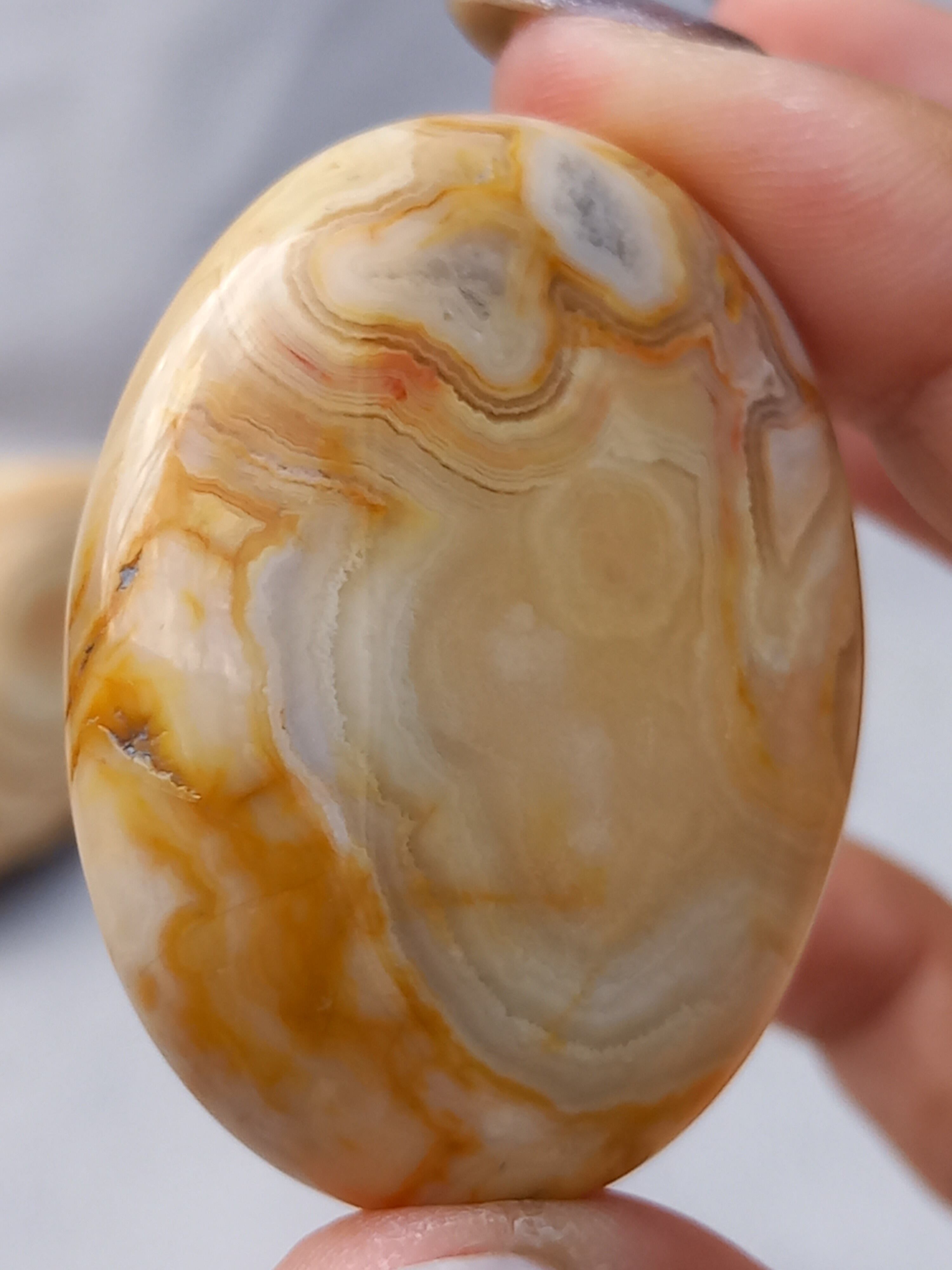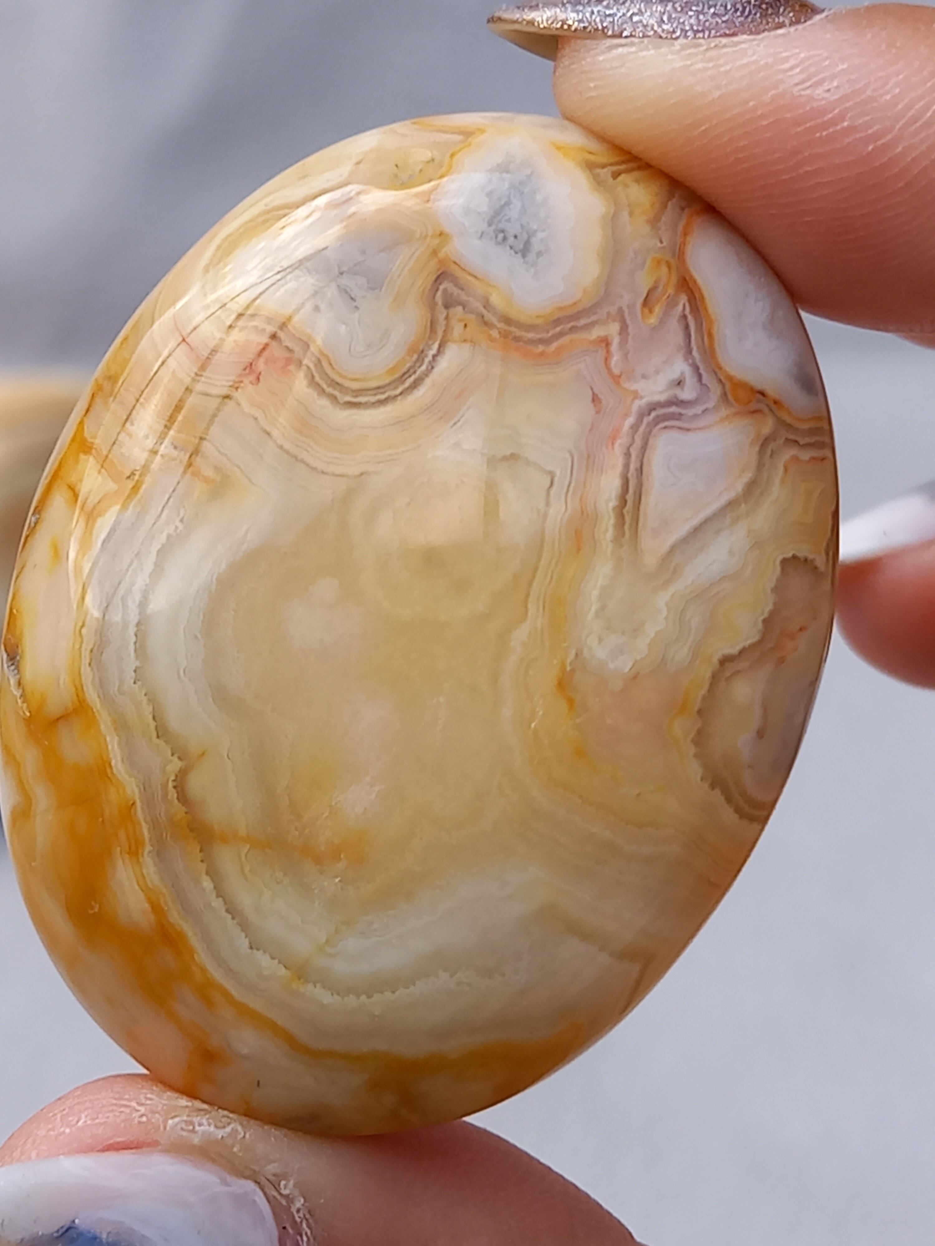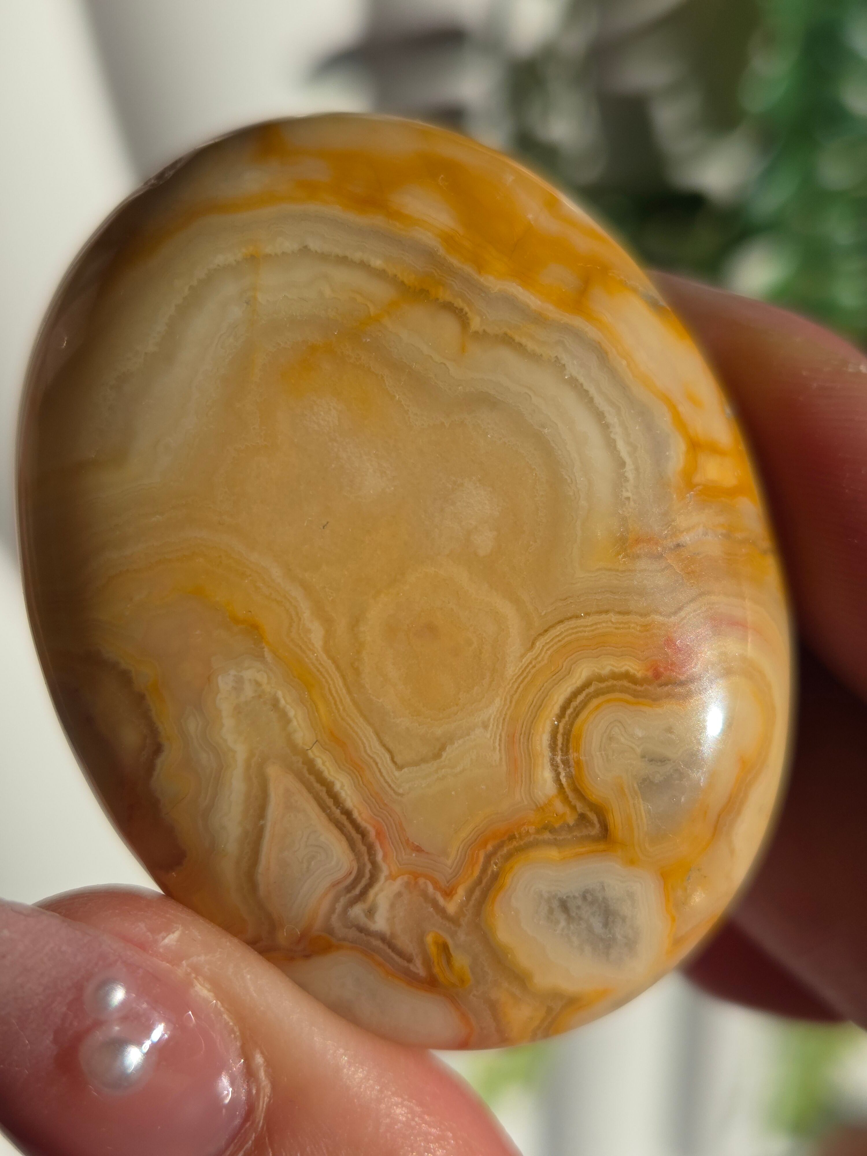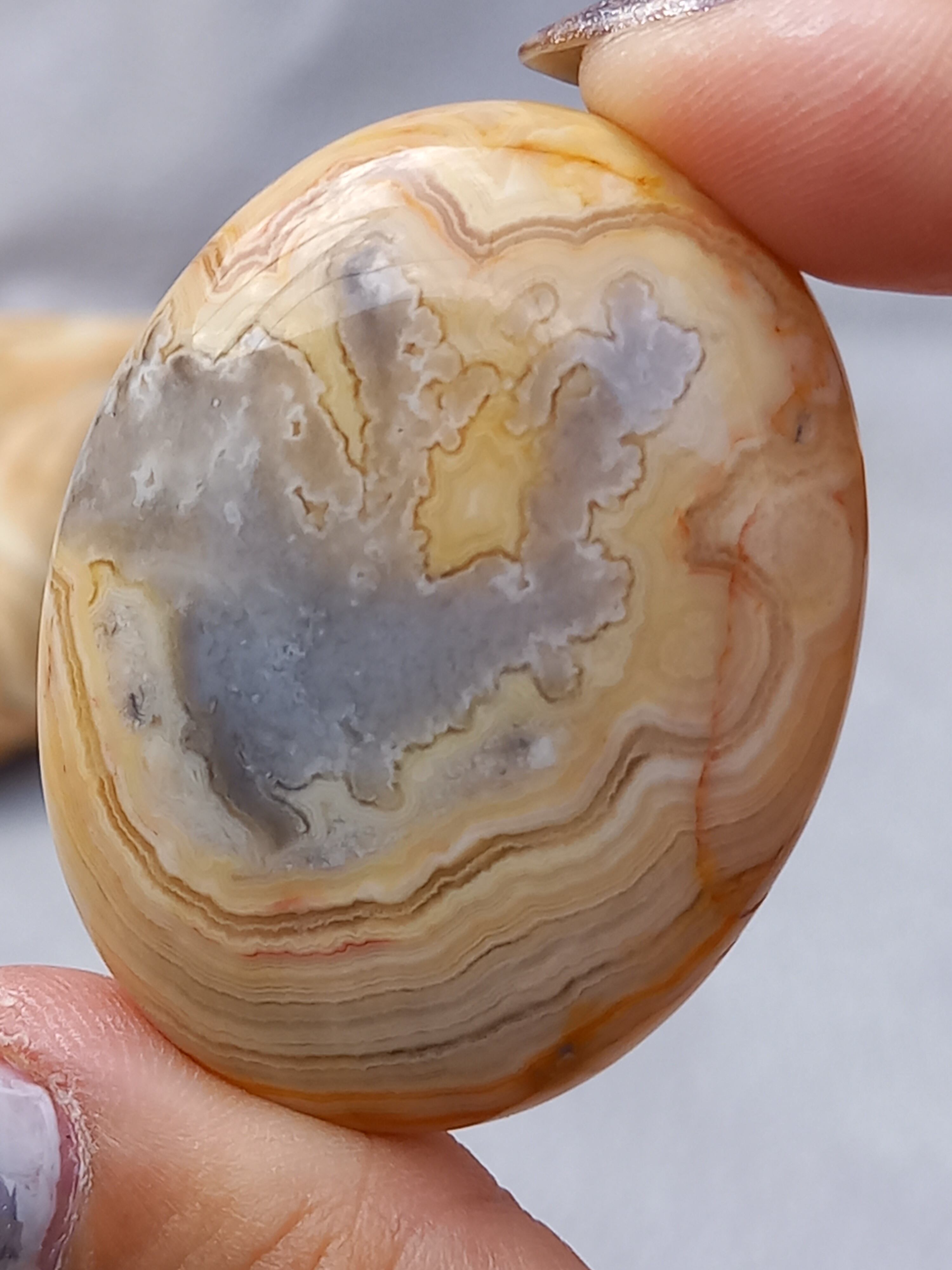 クレイジーレースアゲートは、ヒーリングストーンの一つで、幾層にも重なった模様から発せられる些細な波動が心身にやさしく働きかけ、持ち主の精神的な痛みを和らげ、感情的な負担を解放してくれるといわれています。 クレイジーレースアゲートは、強力な守護力があり、旅の守護石とも呼ばれています。