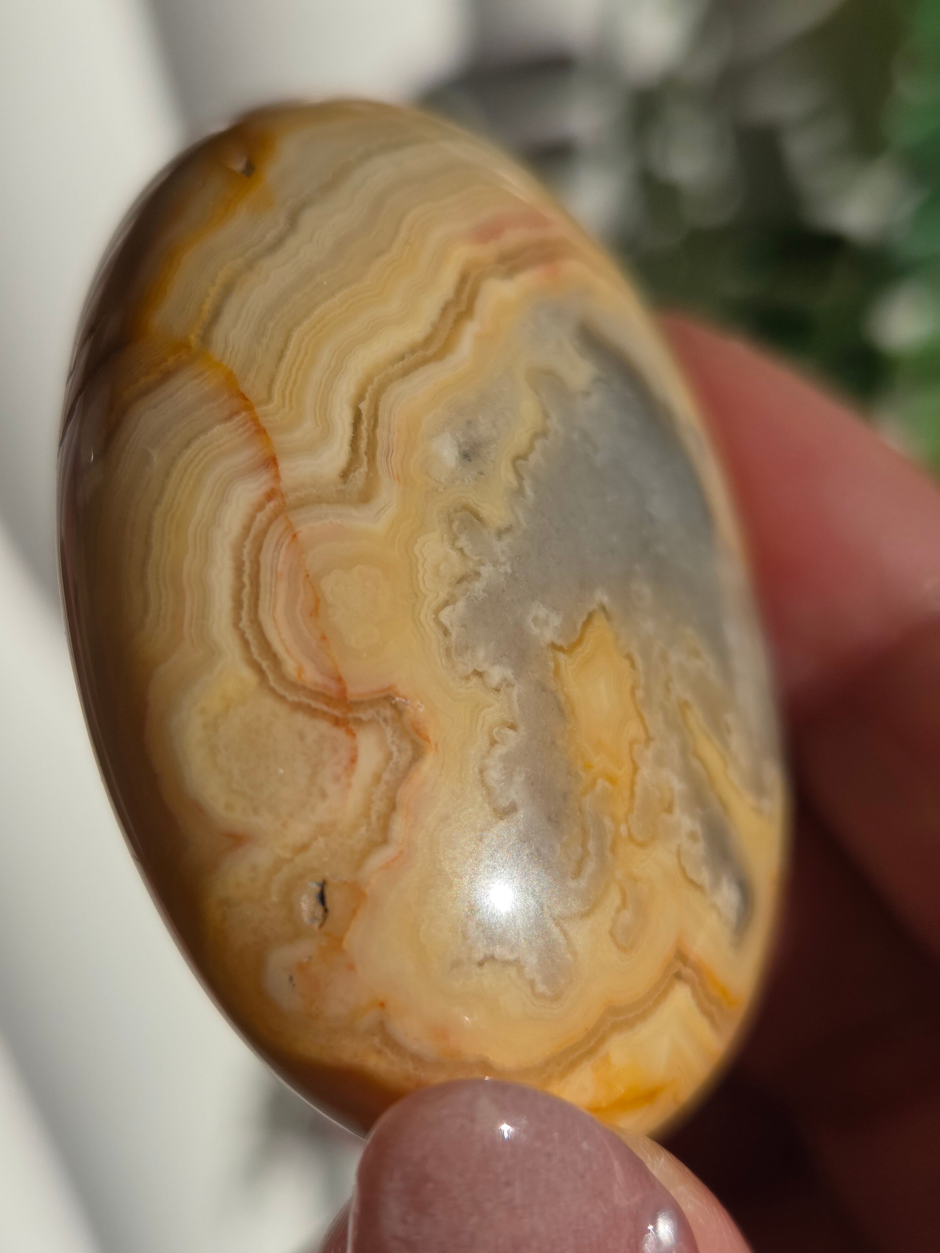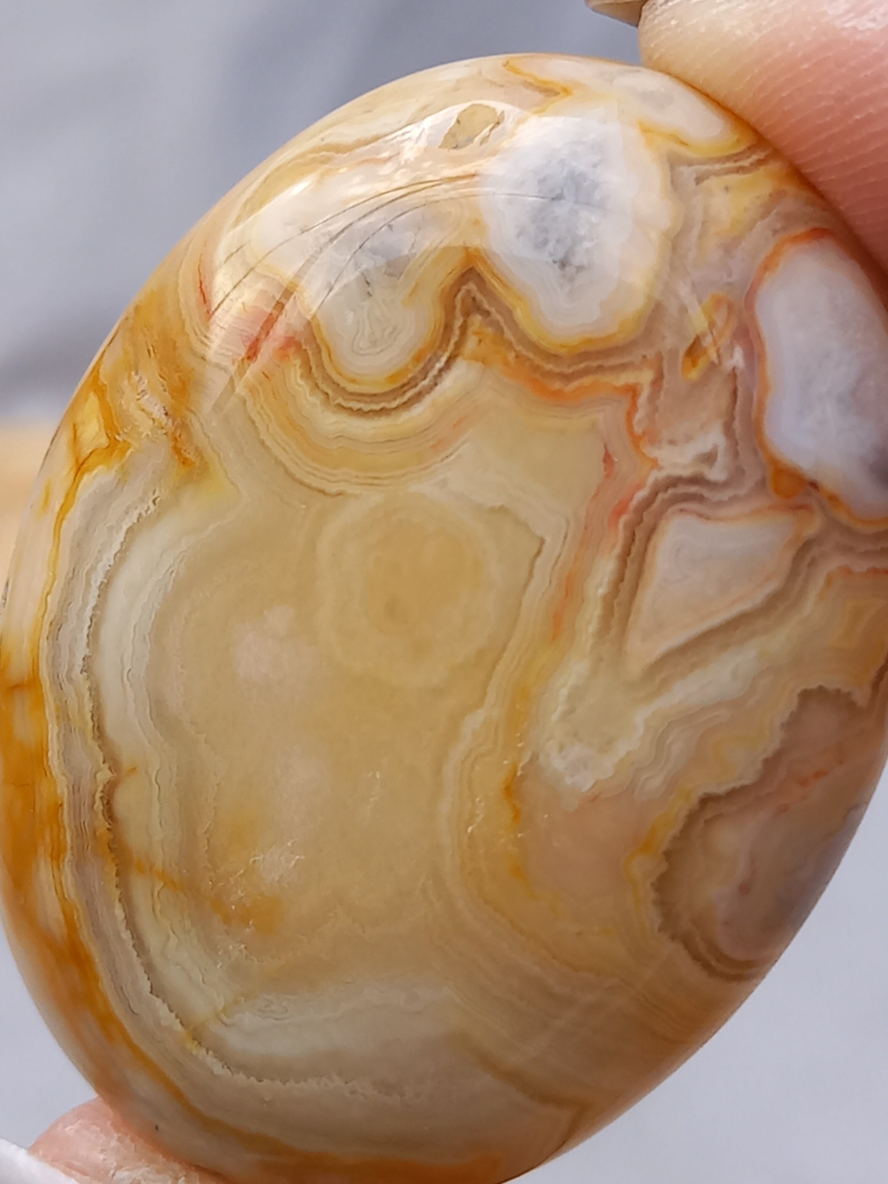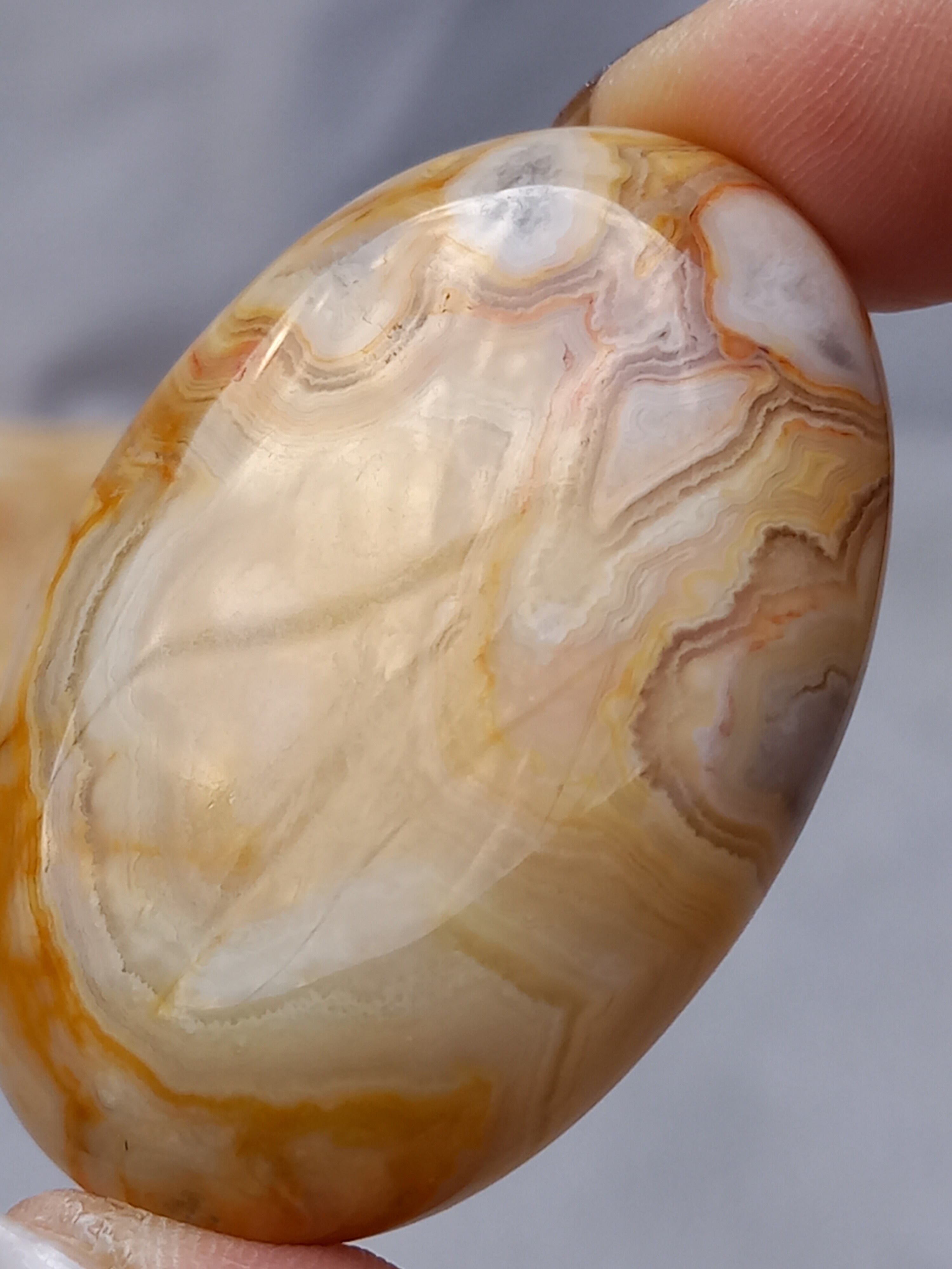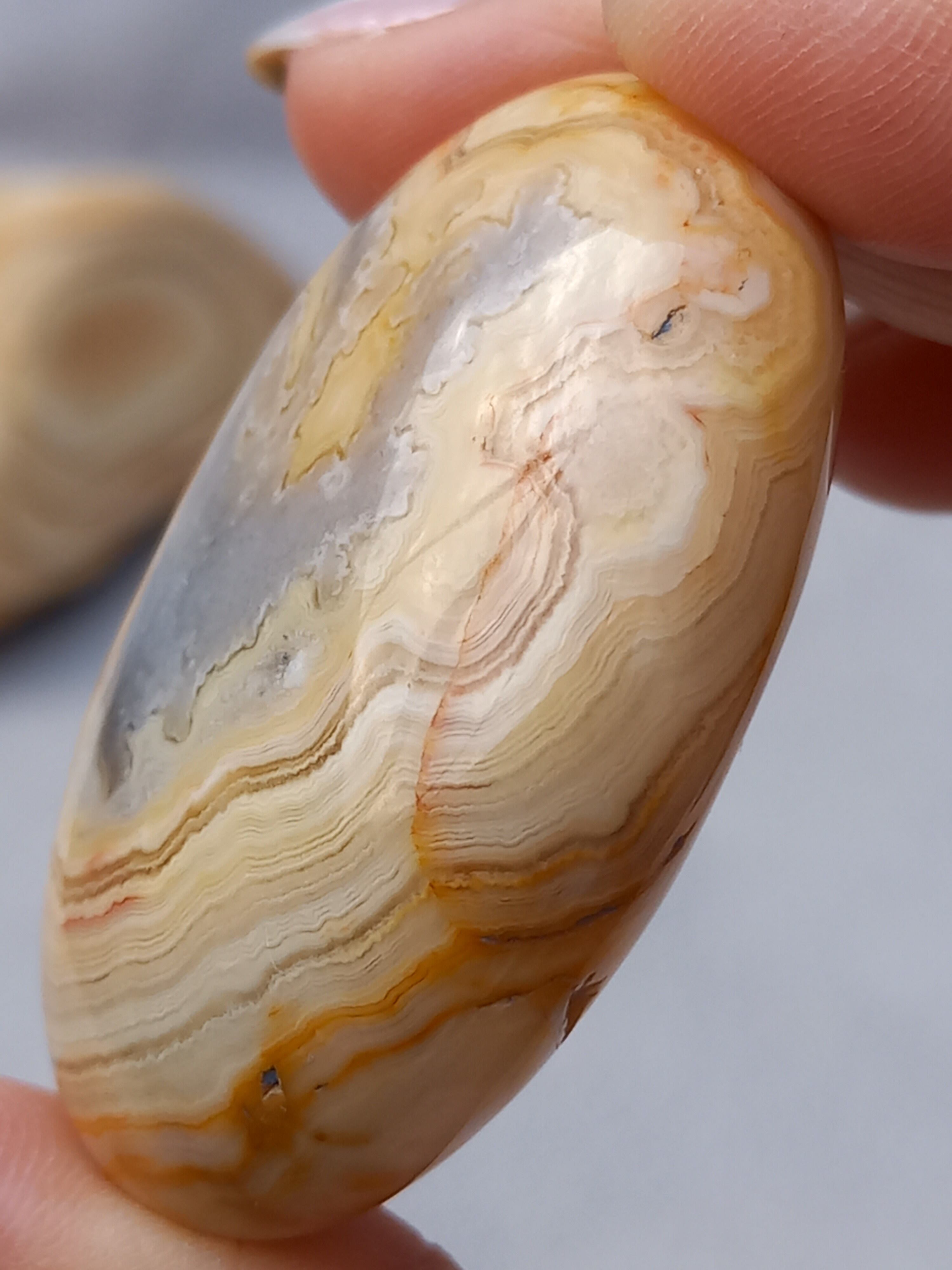 クレイジーレースアゲートは、ヒーリングストーンの一つで、幾層にも重なった模様から発せられる些細な波動が心身にやさしく働きかけ、持ち主の精神的な痛みを和らげ、感情的な負担を解放してくれるといわれています。 クレイジーレースアゲートは、強力な守護力があり、旅の守護石とも呼ばれています。