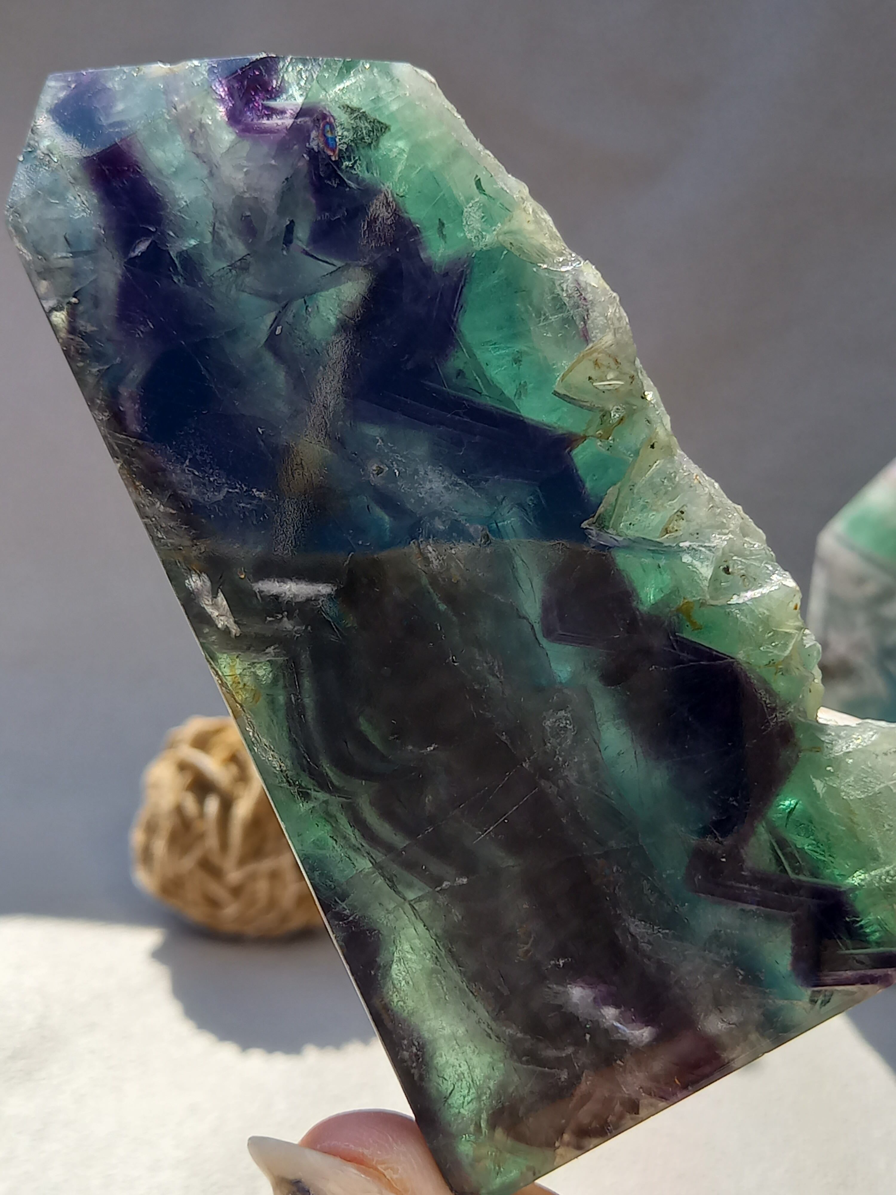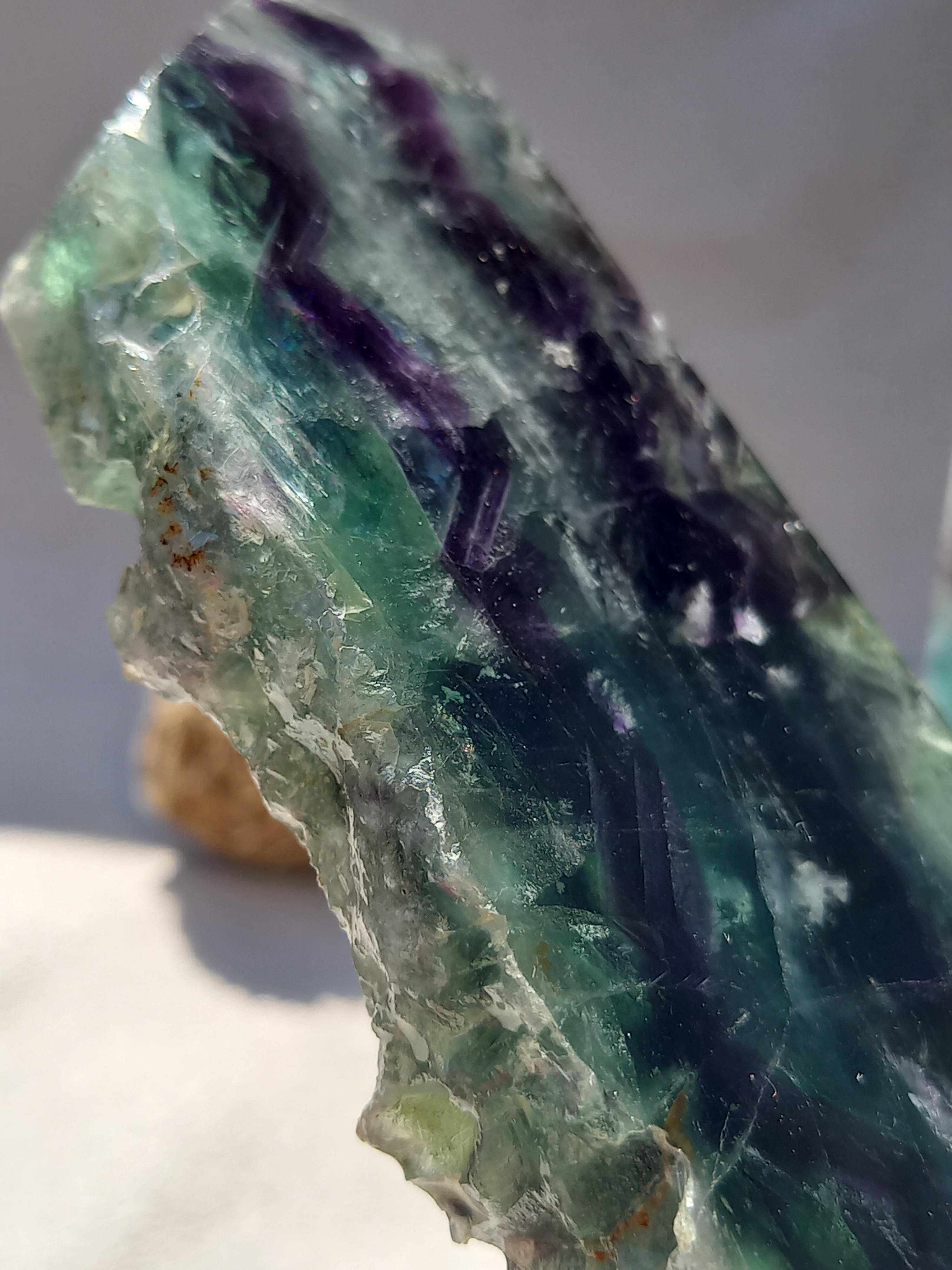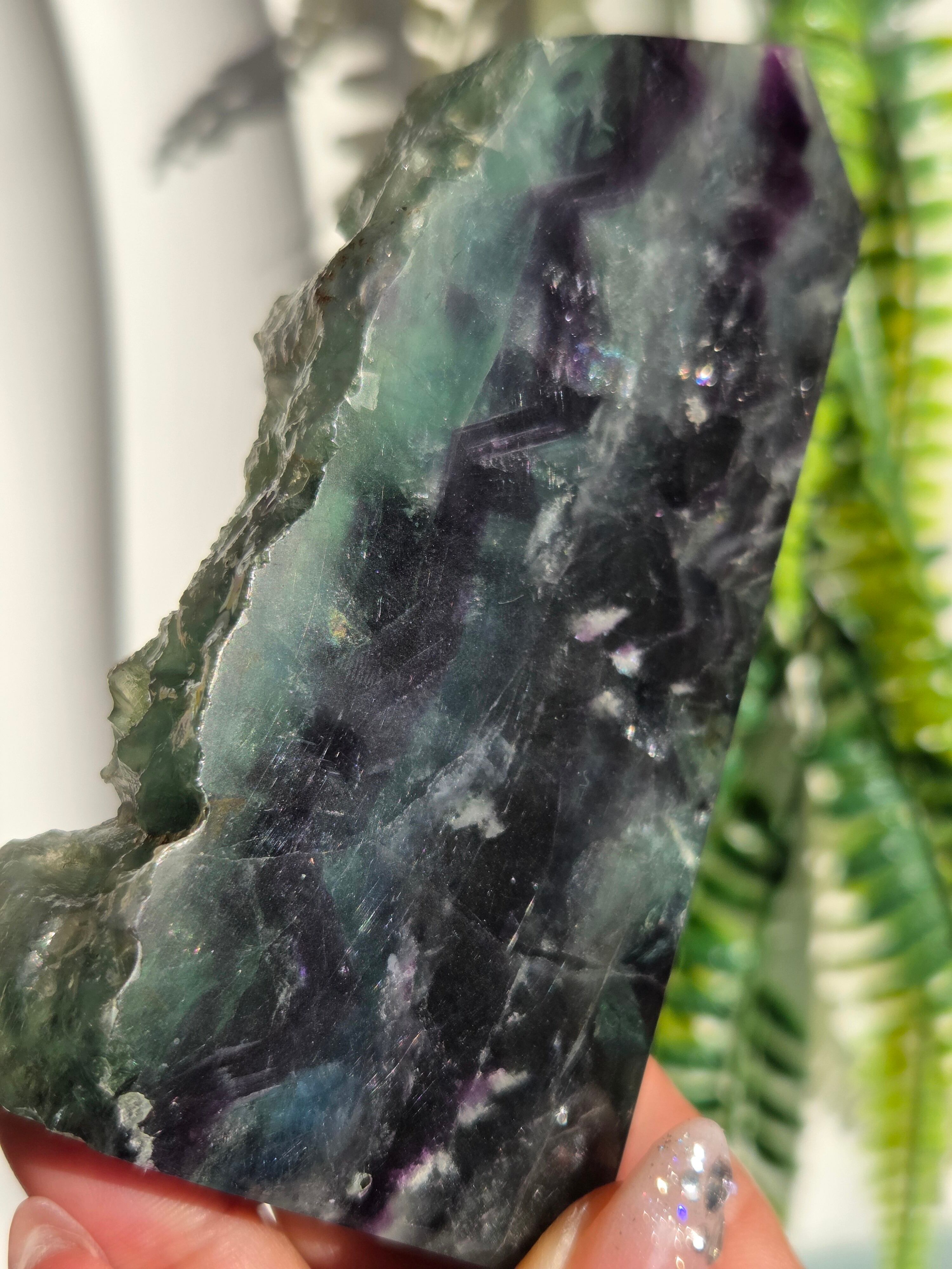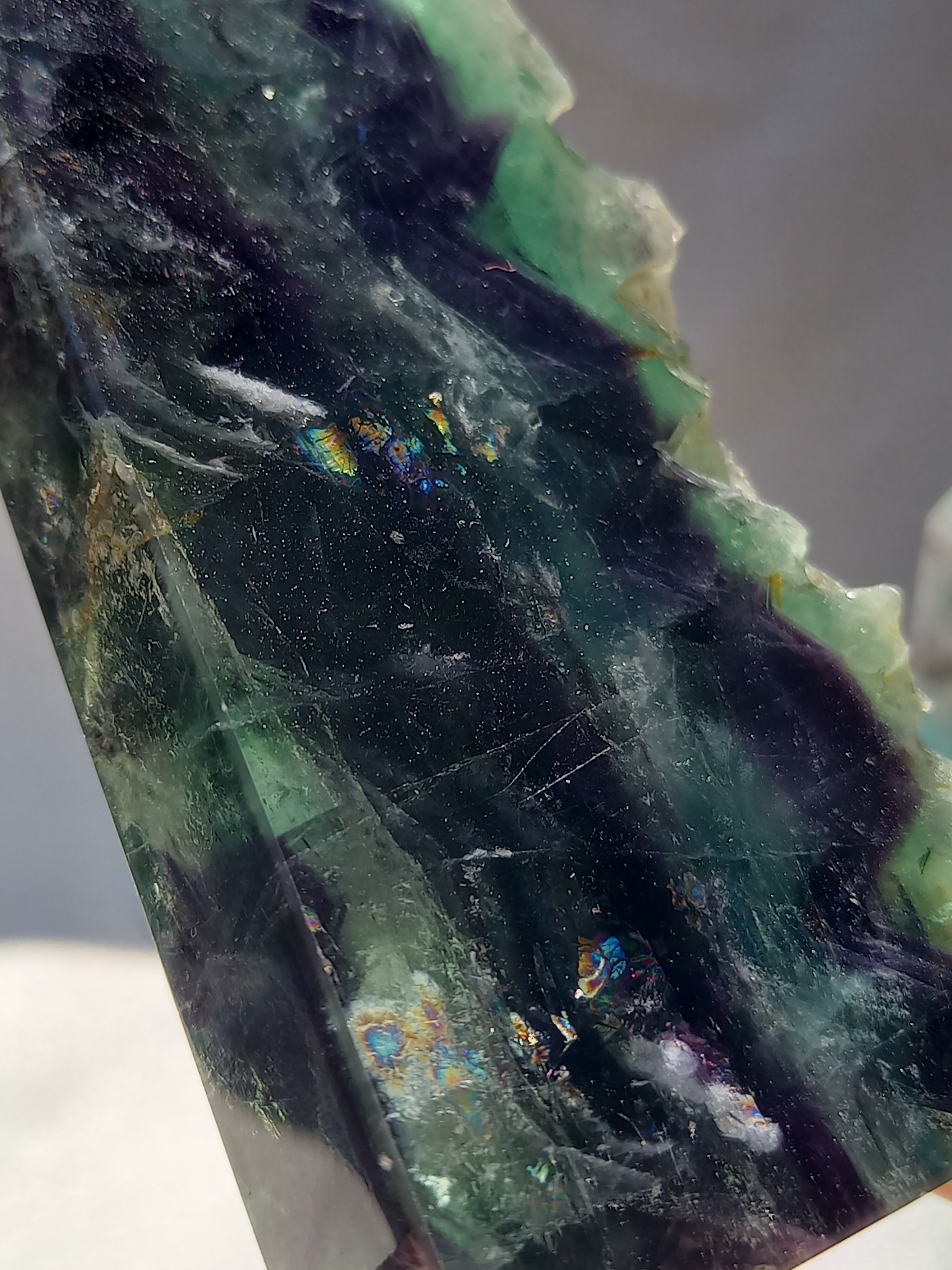 原石面も残しつつポリッシュされたタワーですので、原石面と、フローライトのカラフル感と同時に楽しめる子です。