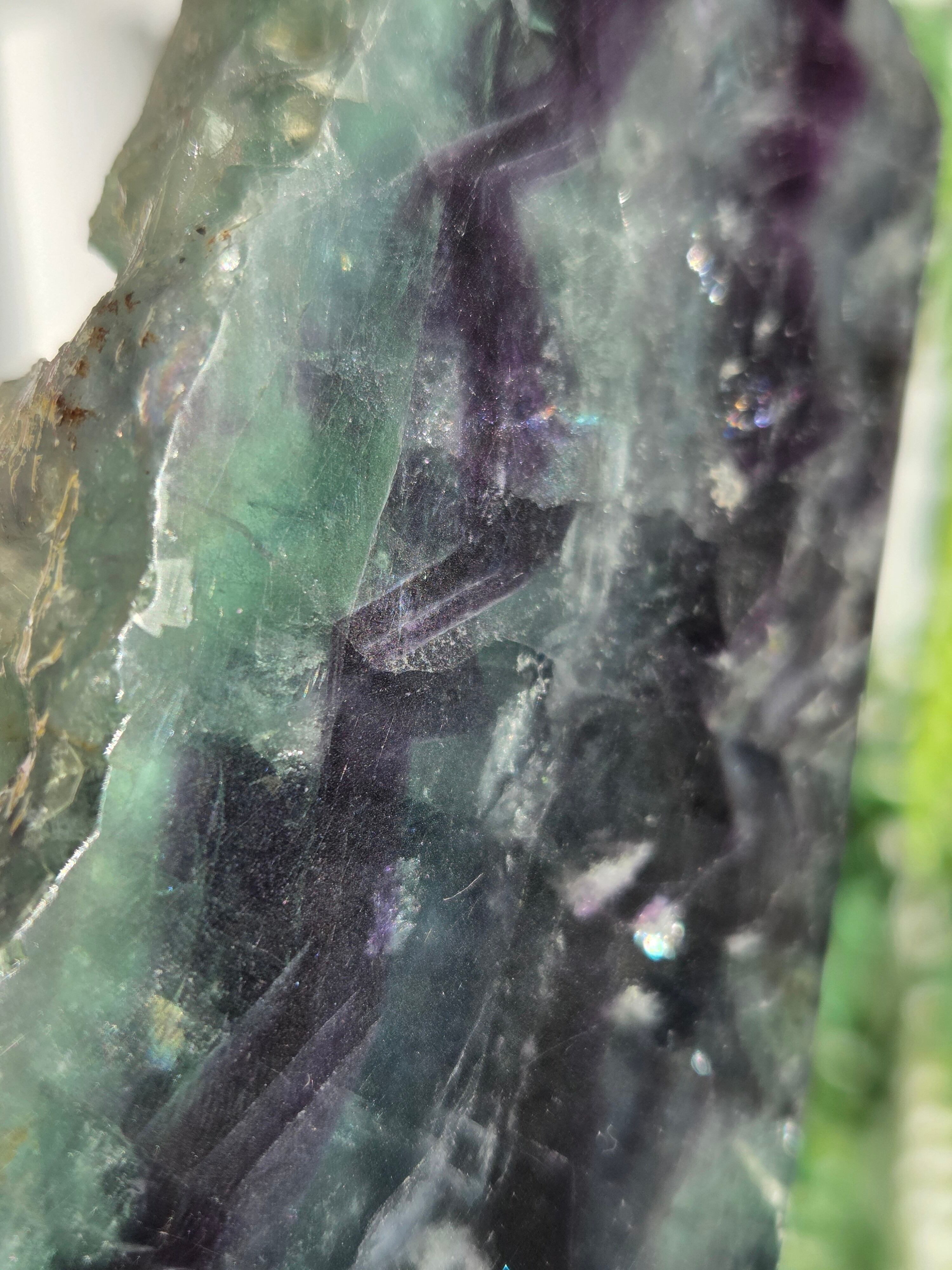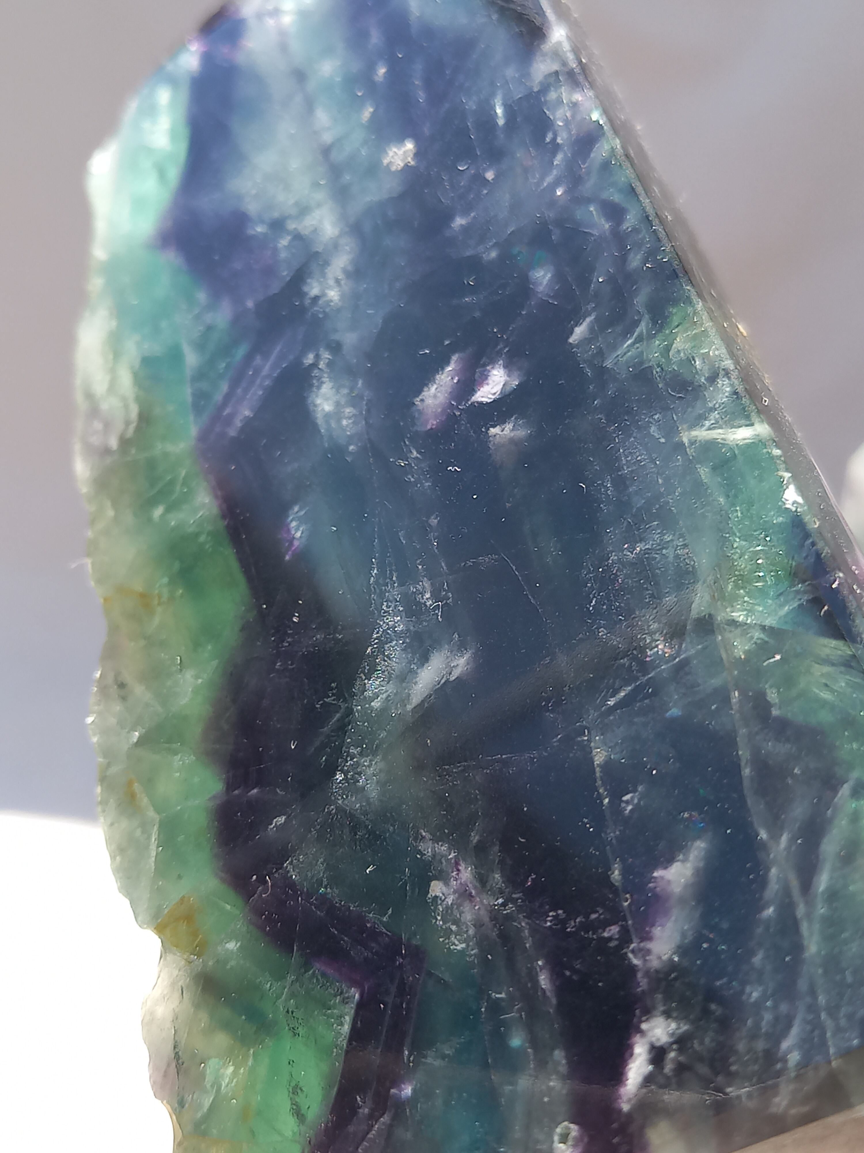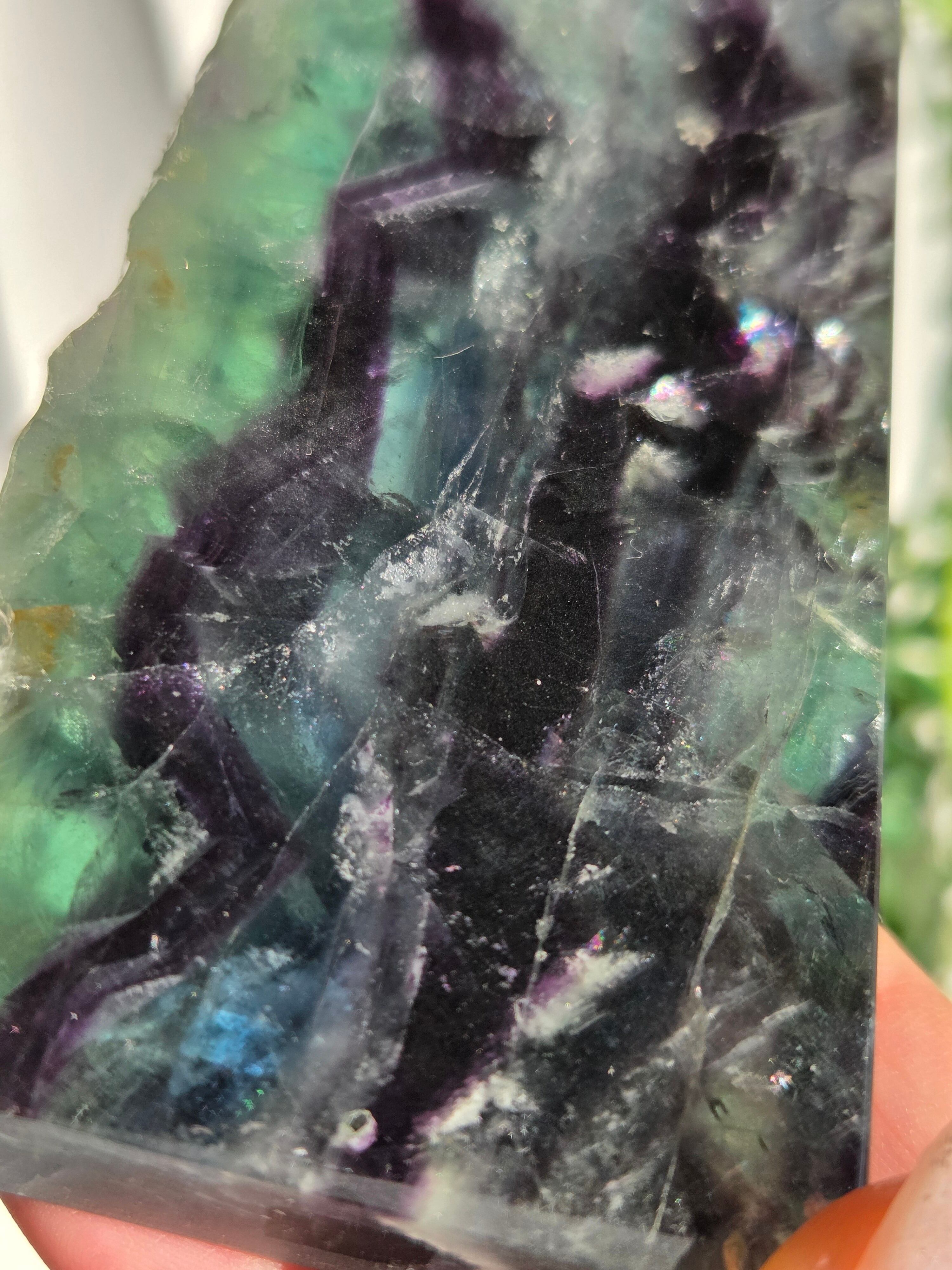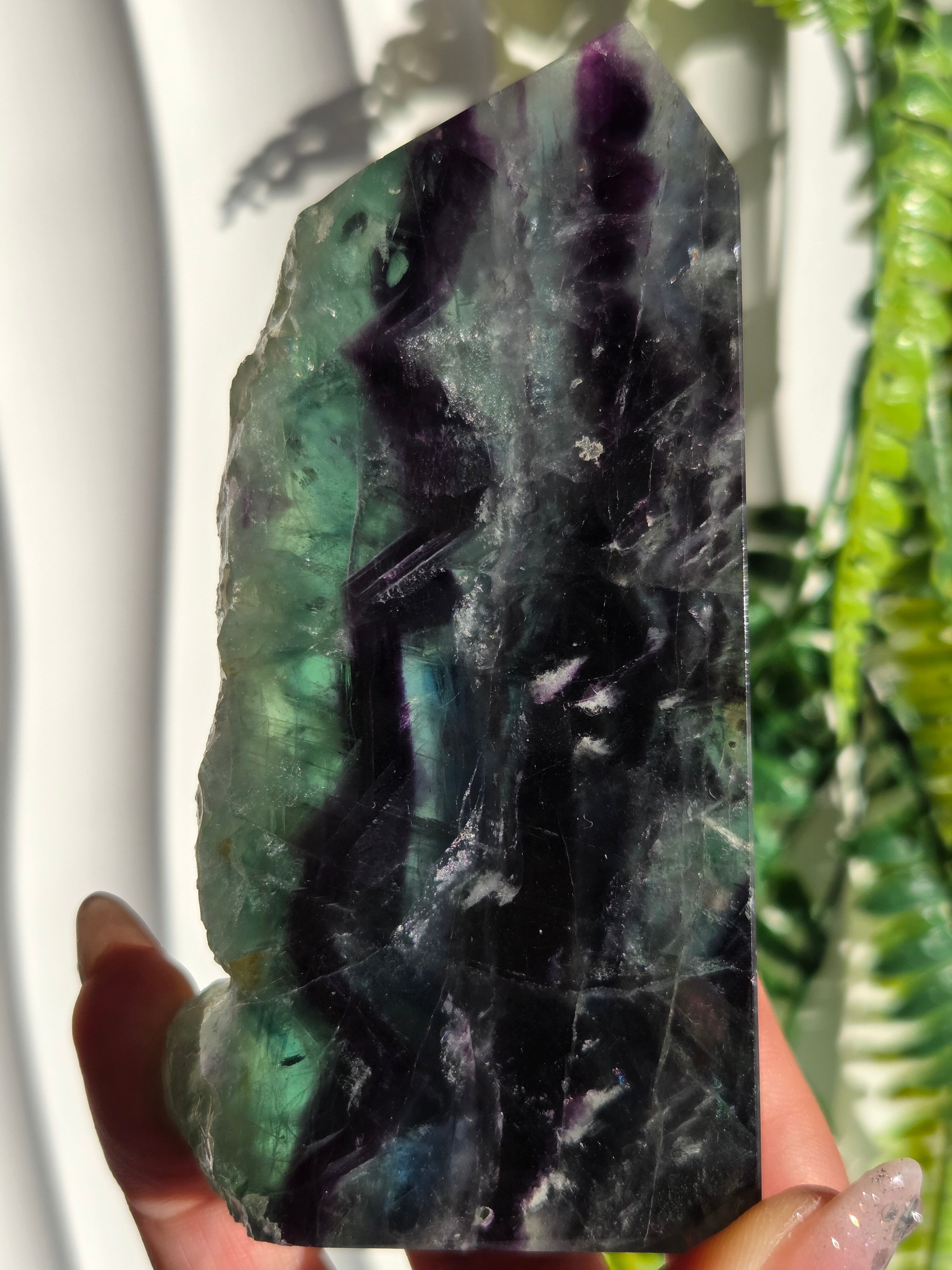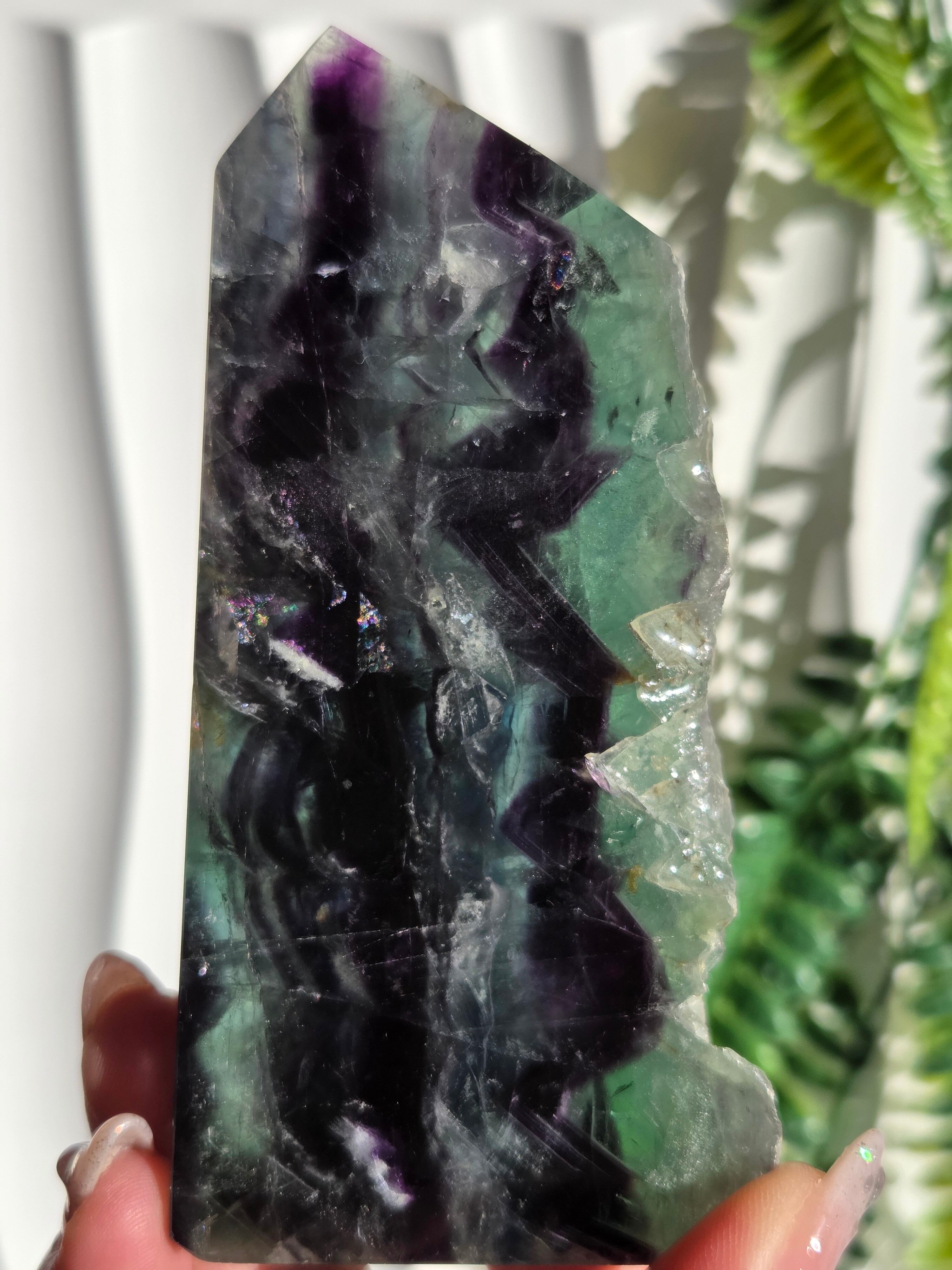 原石面も残しつつポリッシュされたタワーですので、原石面と、フローライトのカラフル感と同時に楽しめる子です。