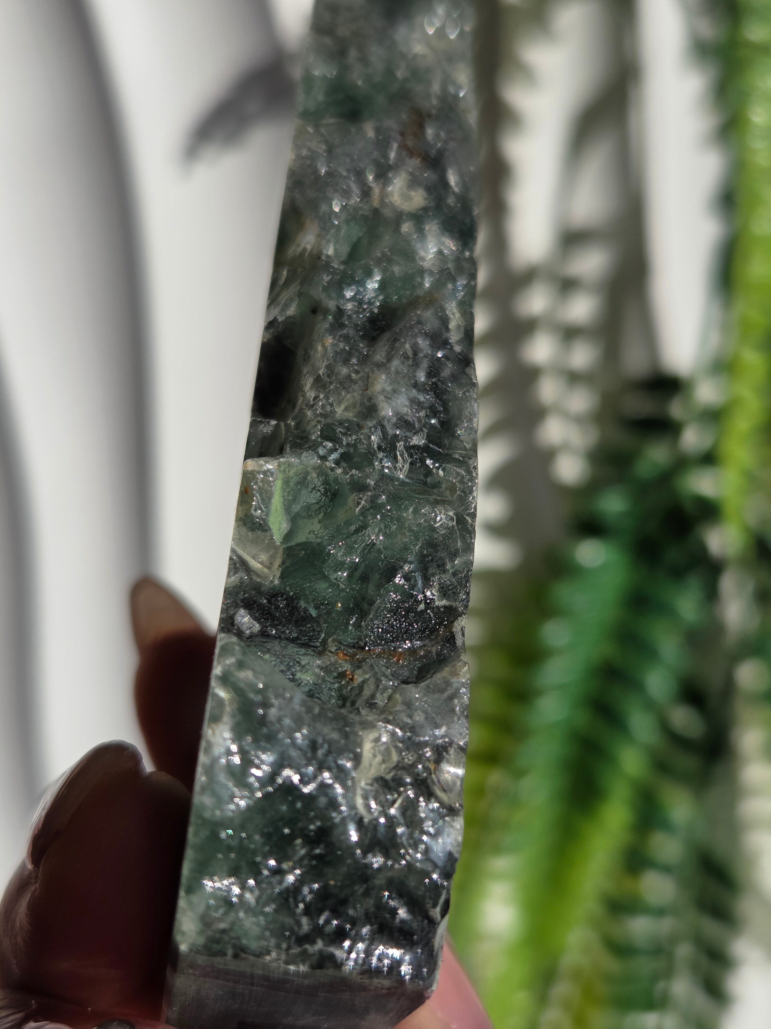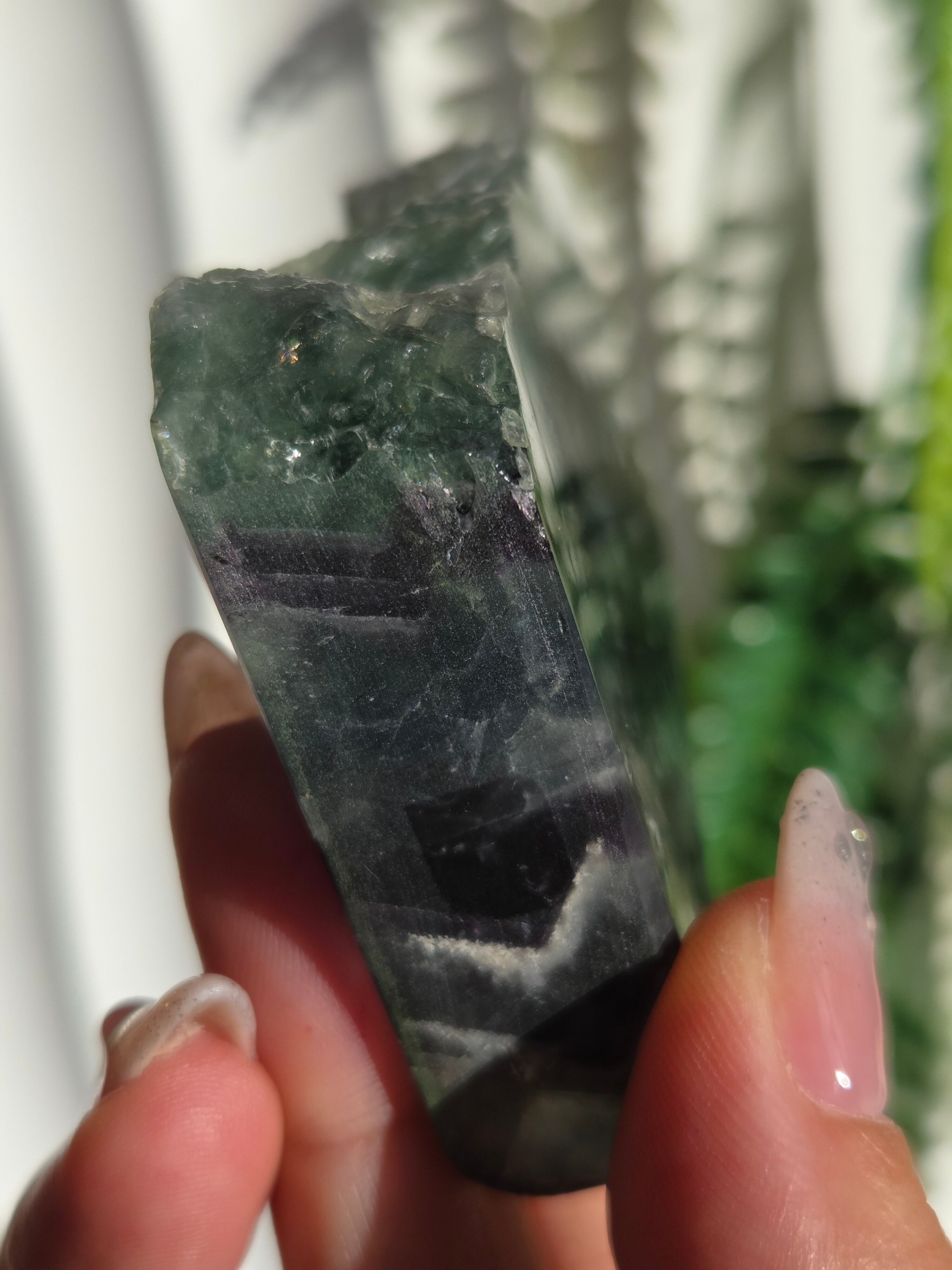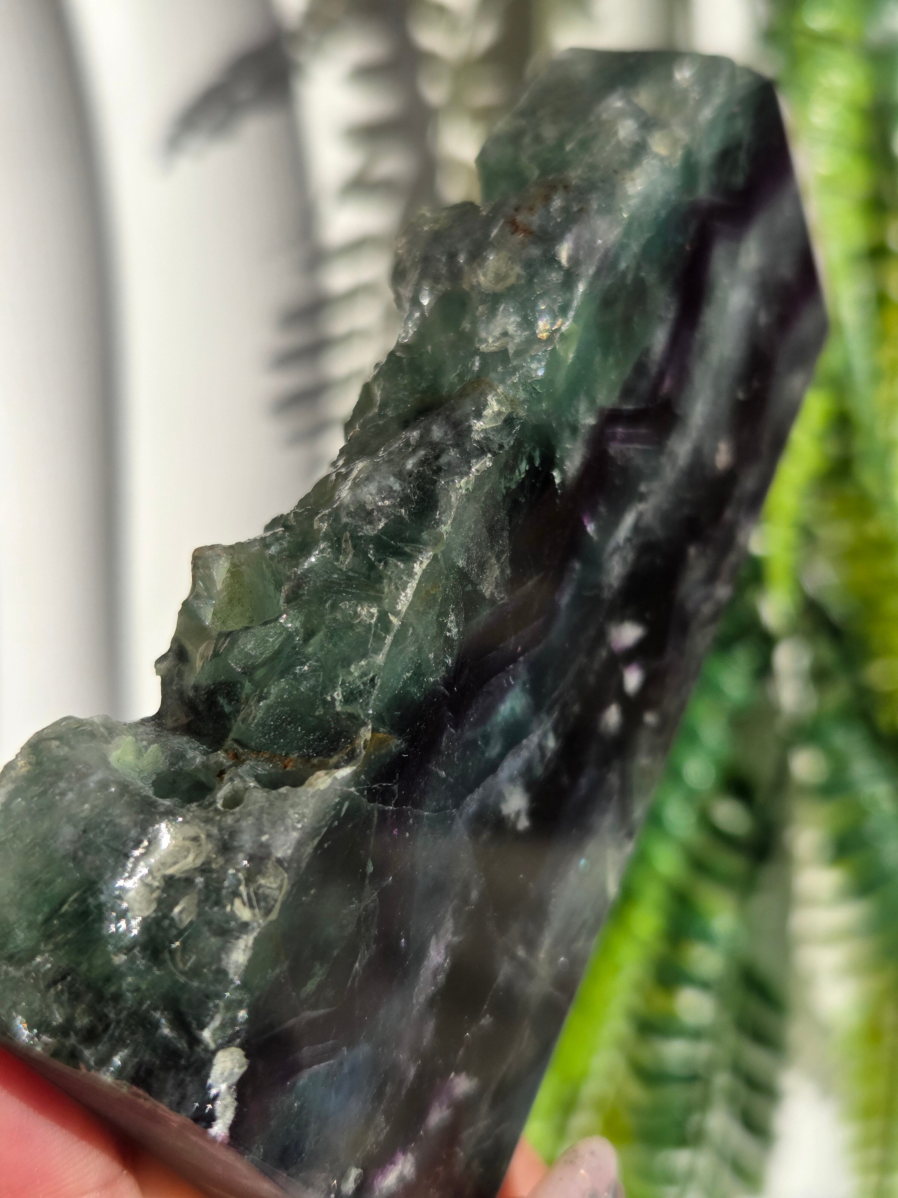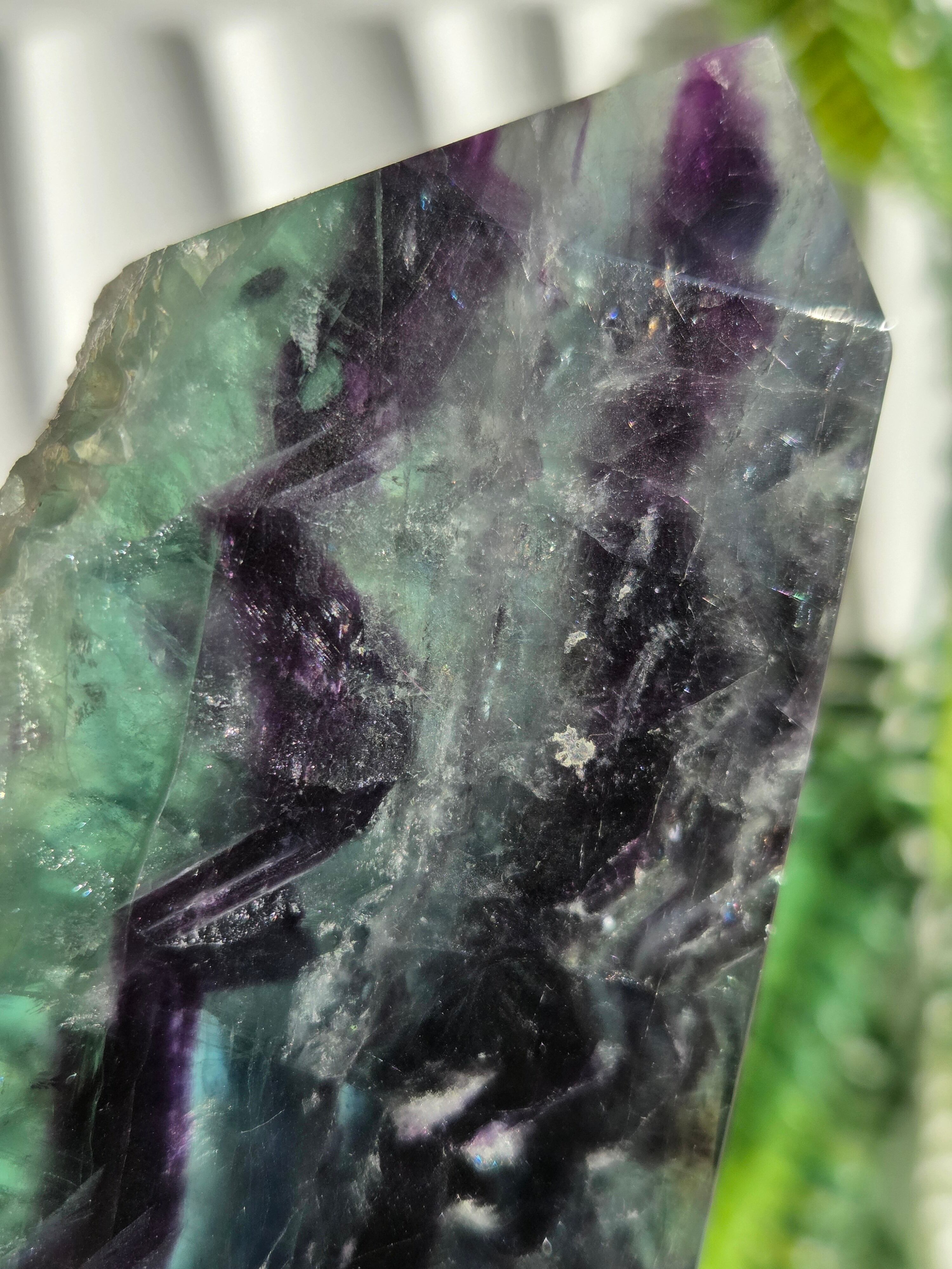 原石面も残しつつポリッシュされたタワーですので、原石面と、フローライトのカラフル感と同時に楽しめる子です。