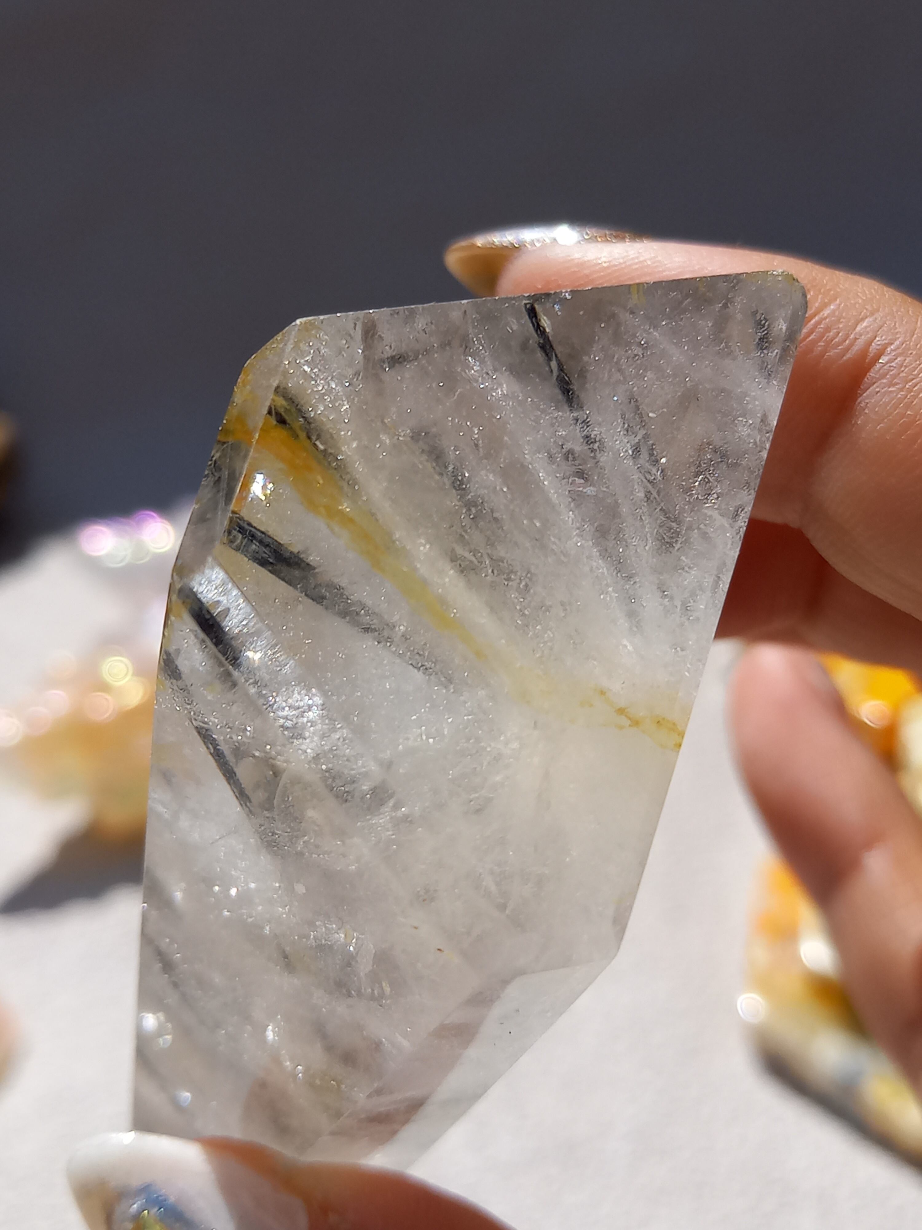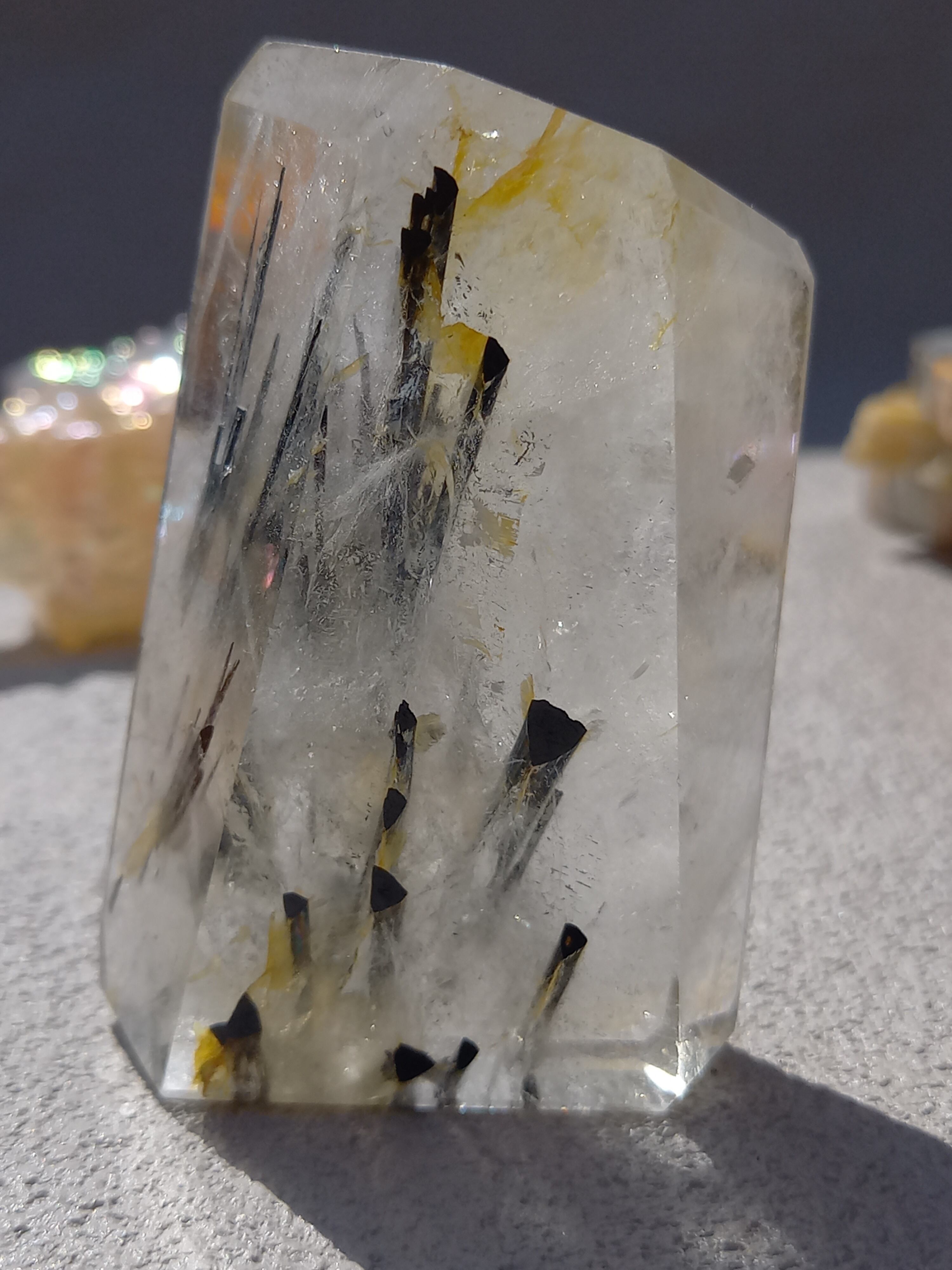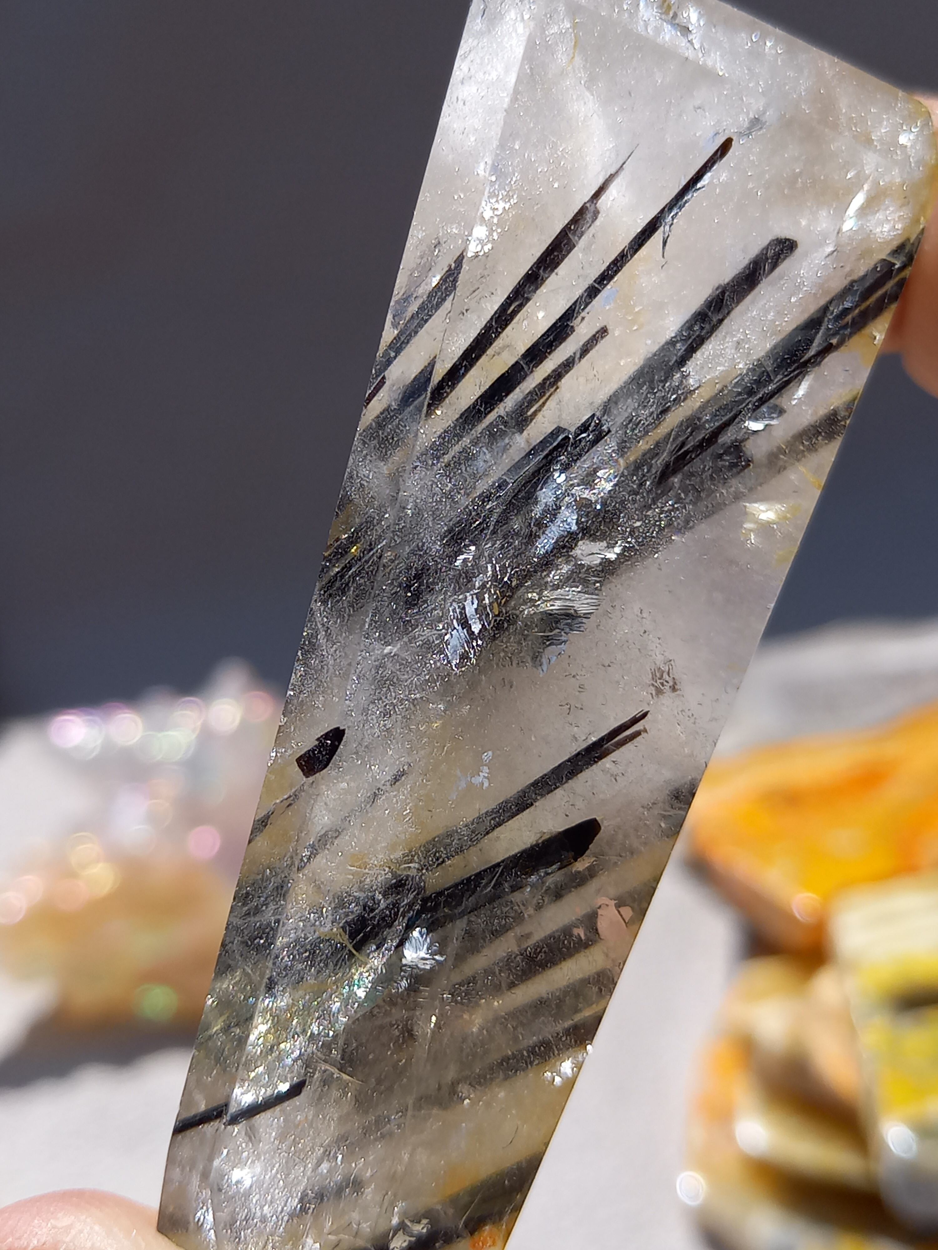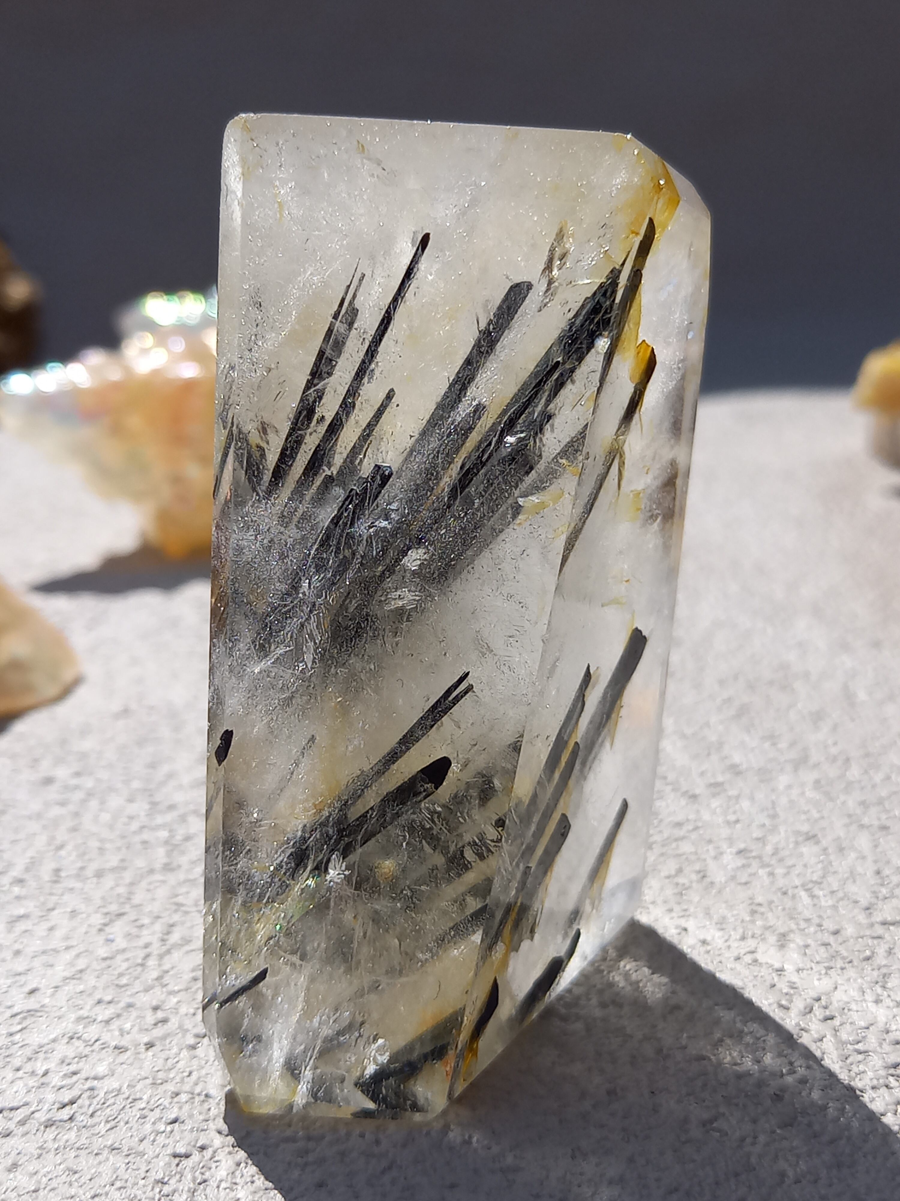 透明感ある水晶に、力強く入り込んだブラックトルマリンがかっこいいです。トルマリンの周りにはシラーや煌めきも出ていて、素敵なフリーフォームになります。