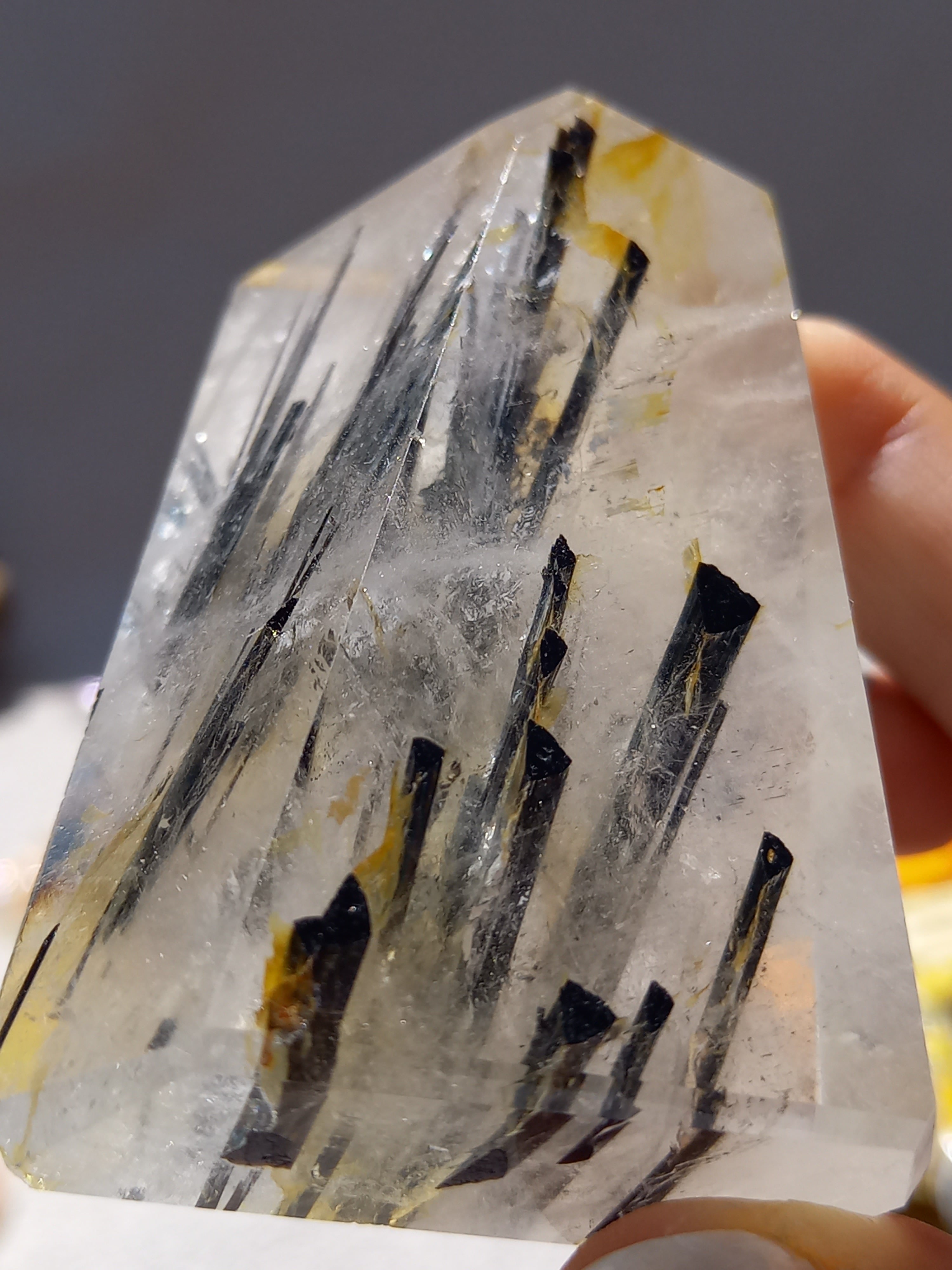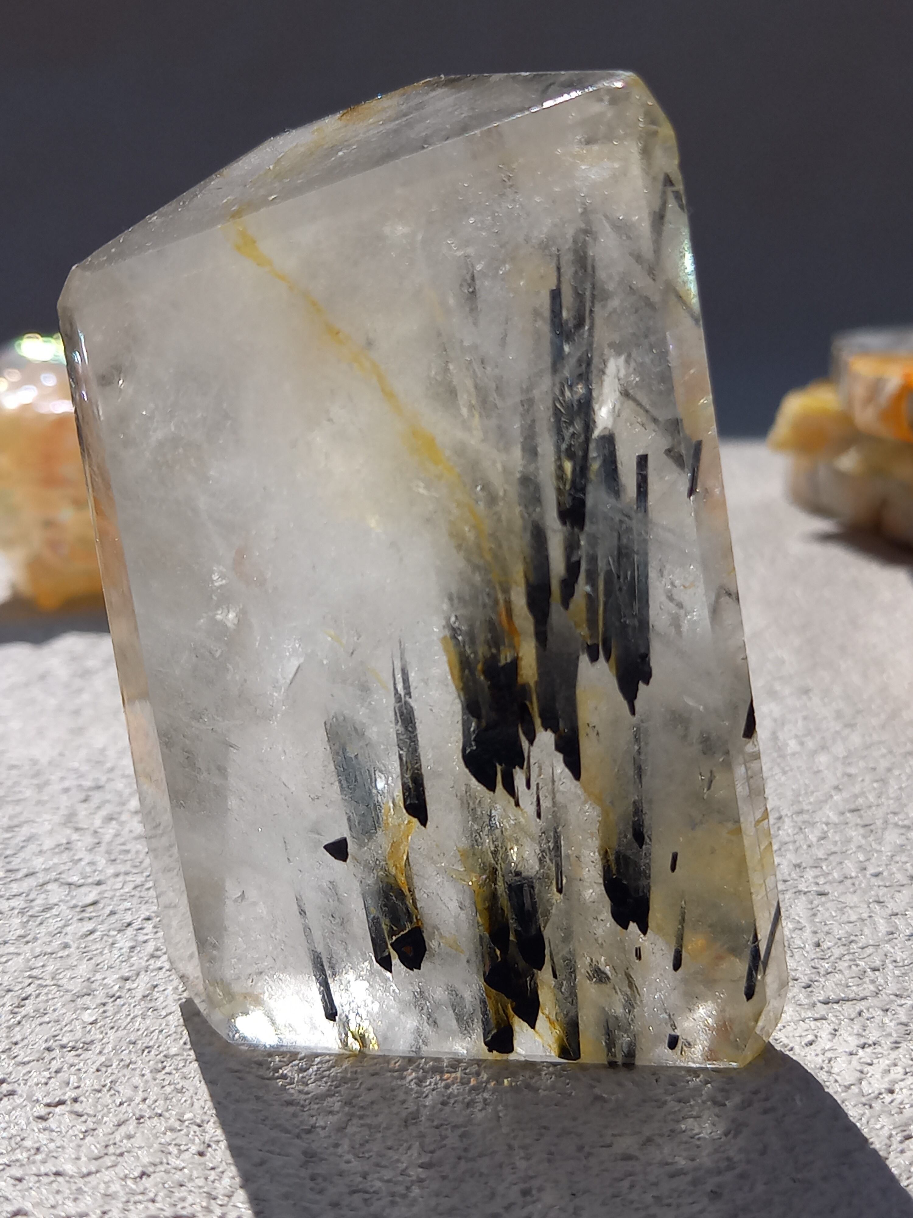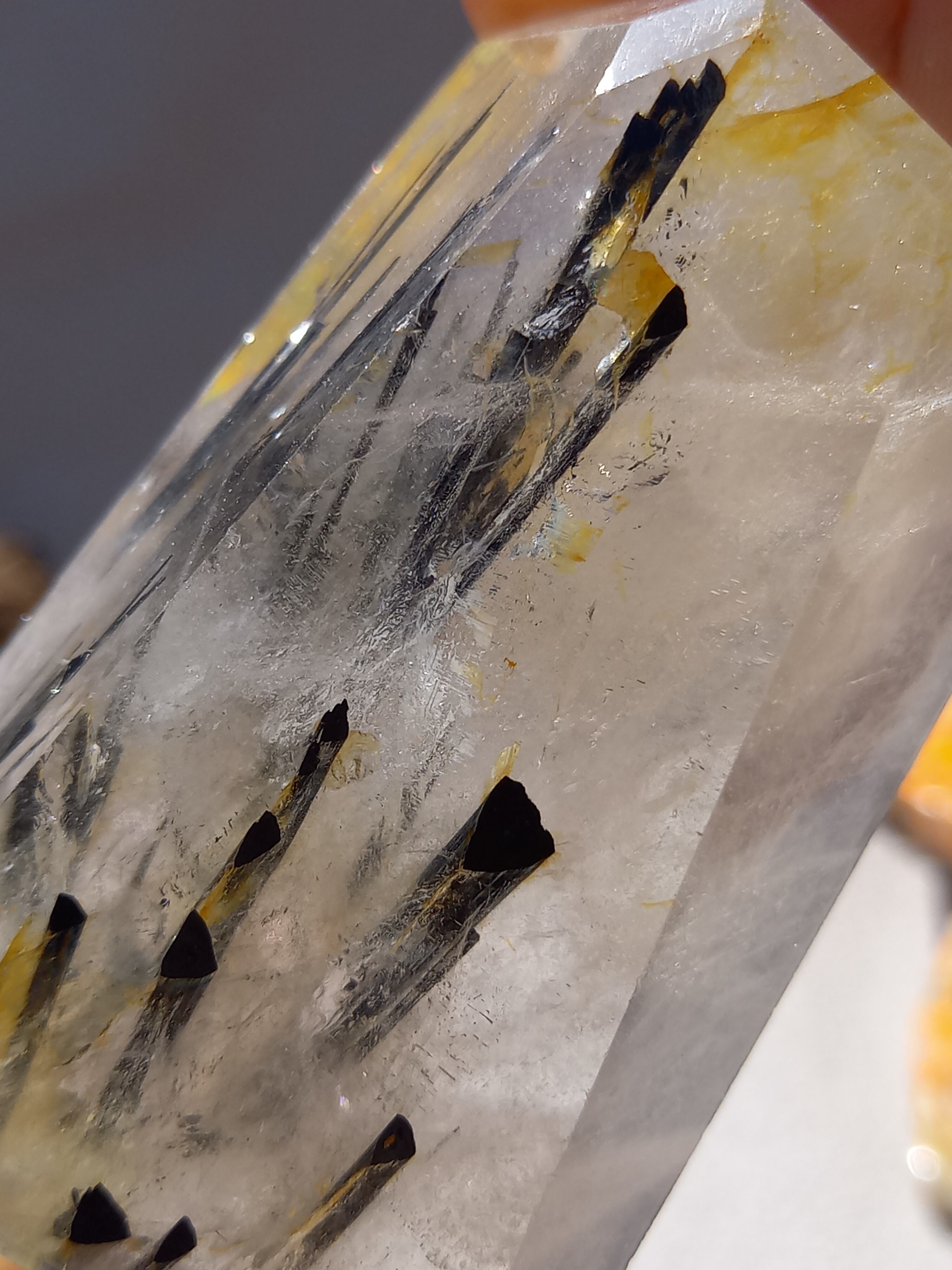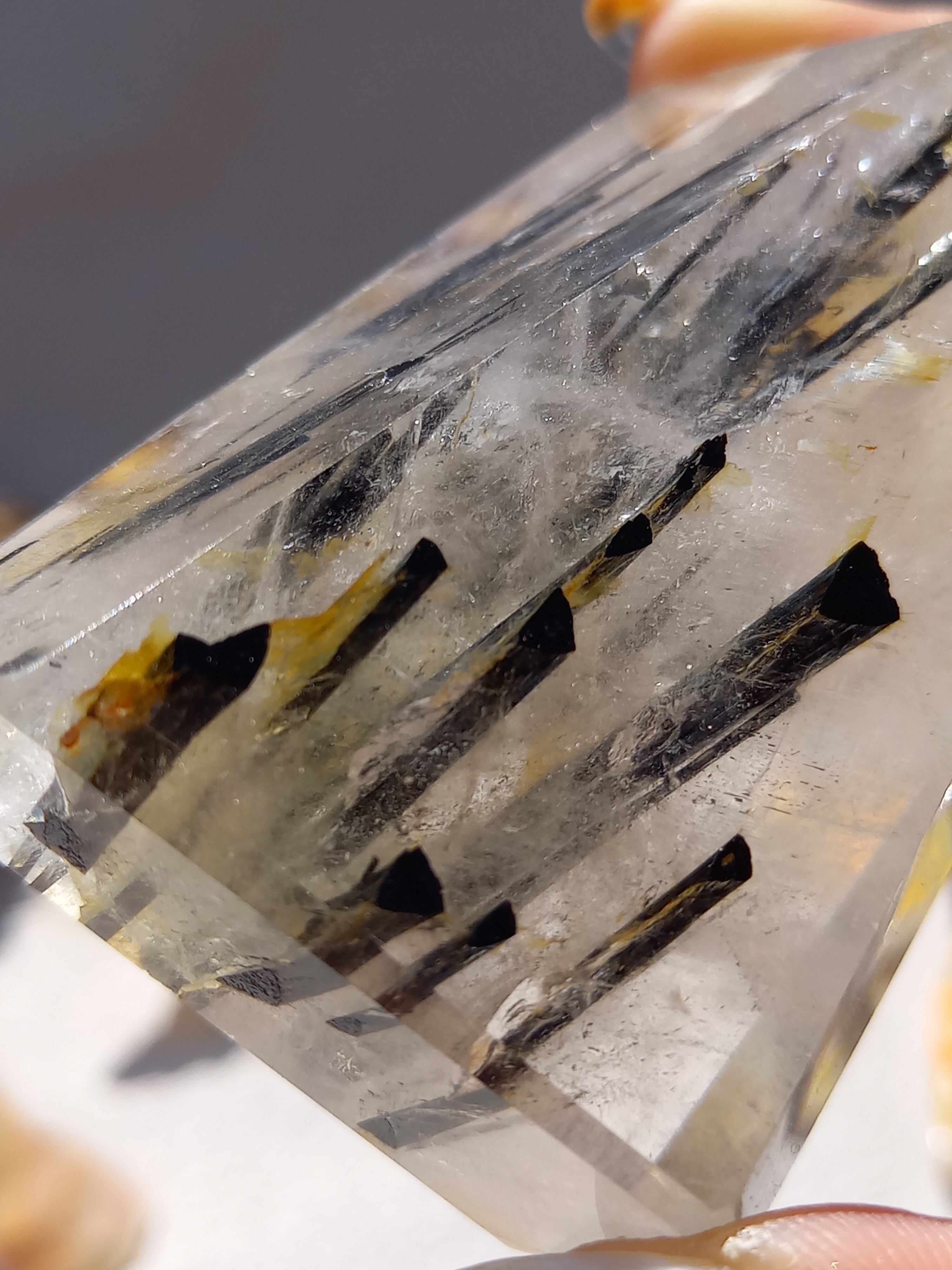 透明感ある水晶に、力強く入り込んだブラックトルマリンがかっこいいです。トルマリンの周りにはシラーや煌めきも出ていて、素敵なフリーフォームになります。